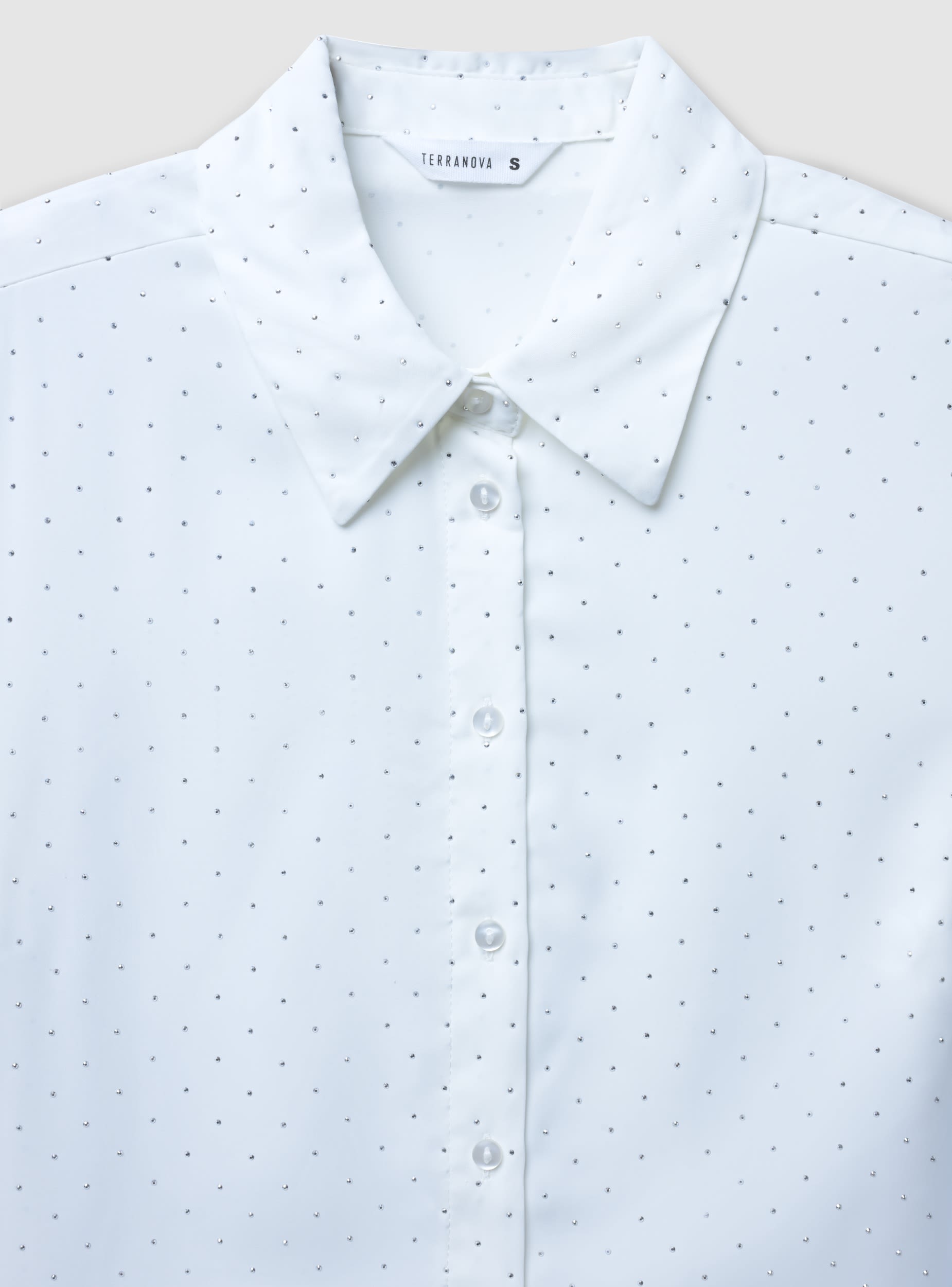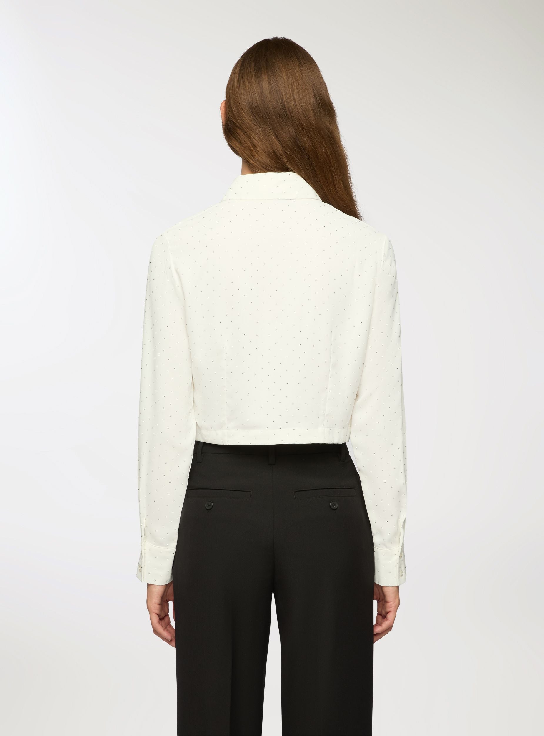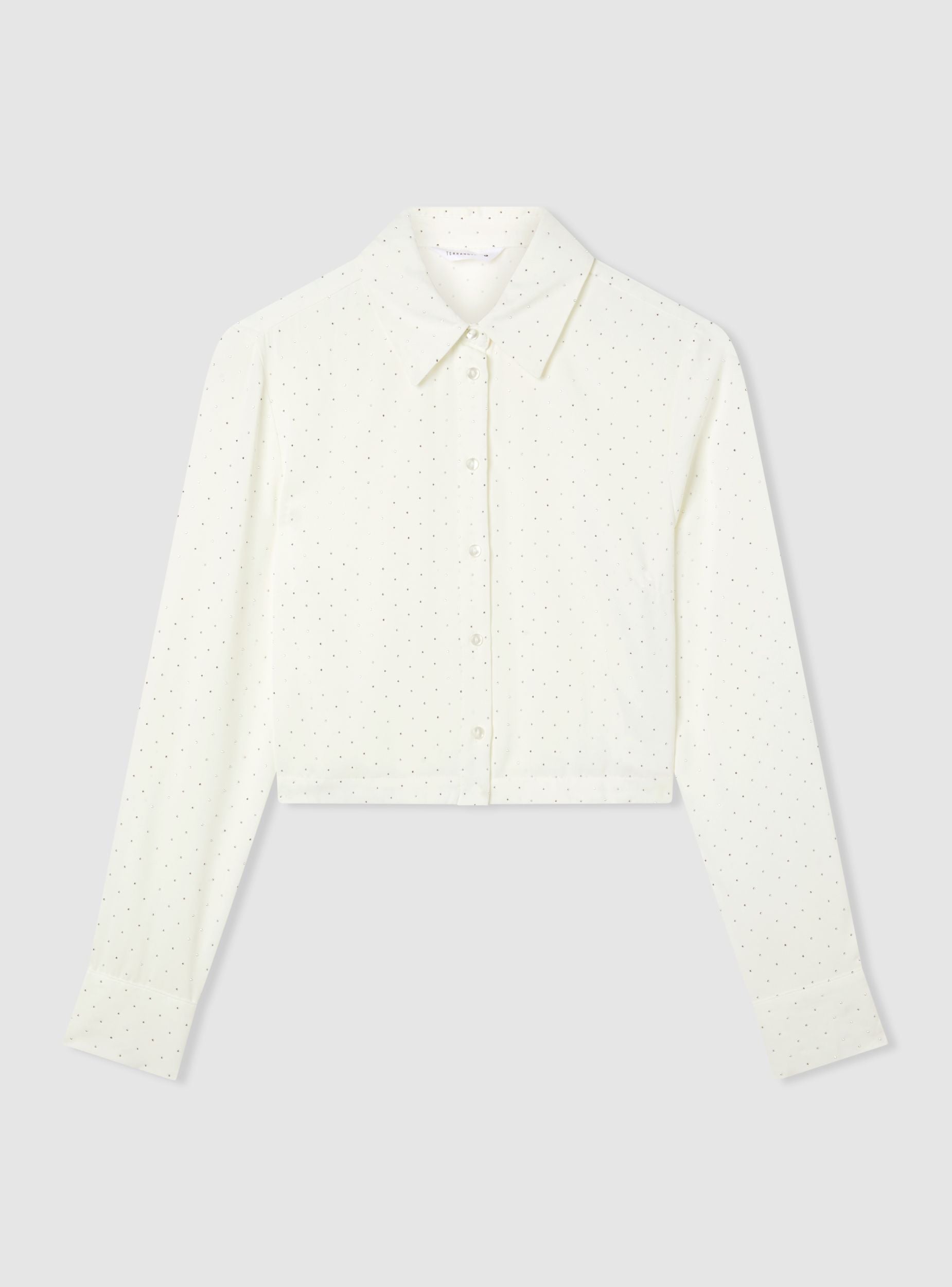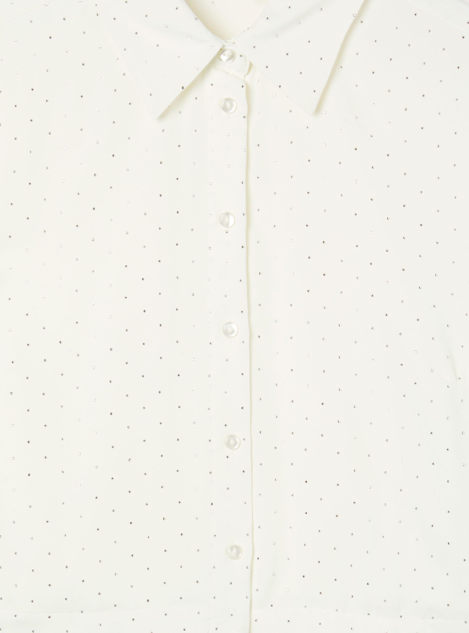 Женская рубашка с укороченным кроем, отличающаяся современным дизайном и изящными деталями. Имеет воротник и длинные рукава с застегивающимися манжетами. Передняя застежка на пуговицы обеспечивает удобство и стиль. Однотонная ткань, украшенная стразами, делает её идеальной как для повседневных, так и для изысканных мероприятий. Отлично сочетается с брюками с высокой талией или юбками миди для создания элегантного и универсального образа.Детали