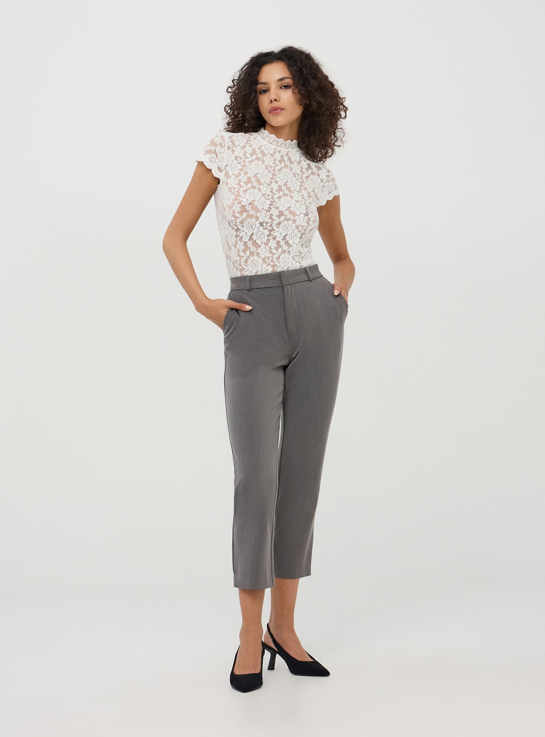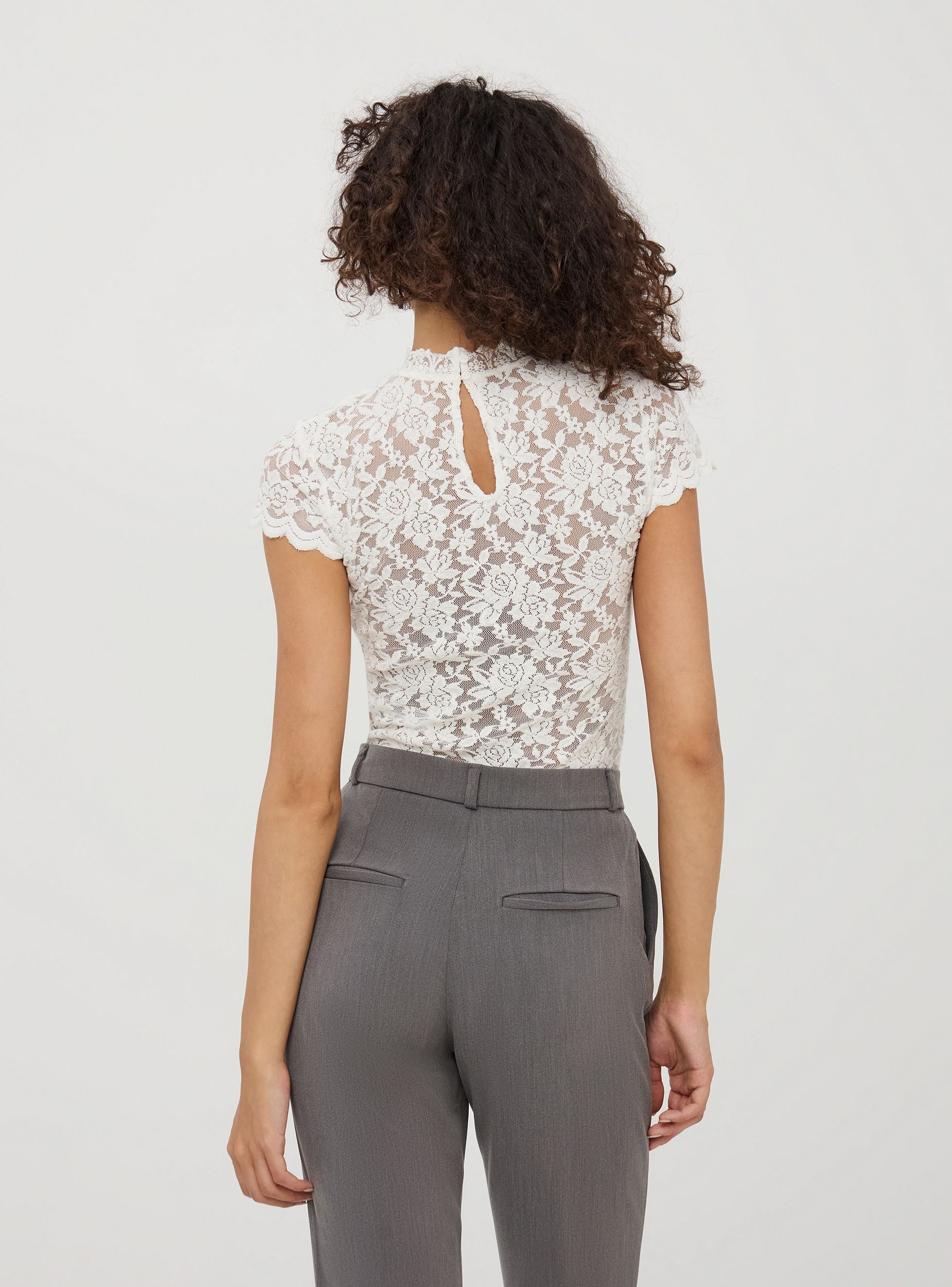 Женская футболка из белого кружева. Модель с короткими рукавами, воротником-стоечкой и застежкой на пуговицы. Регулярная посадка.Детали