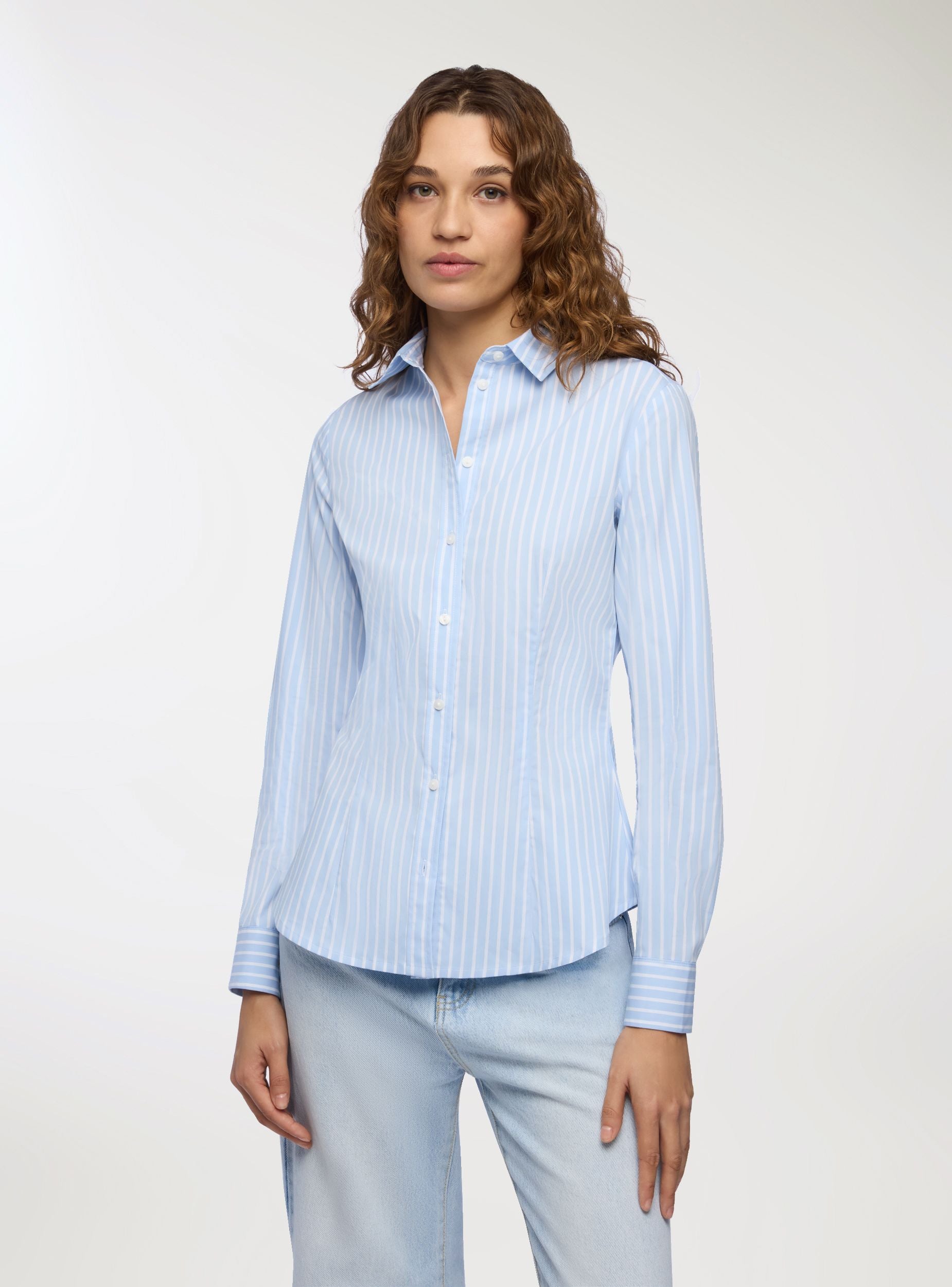 Женская рубашка с приталенным кроем, выполненная в дизайне с вертикальными полосками, что придаёт изделию изысканный и современный вид. Оснащена заострённым воротником и длинными рукавами, эта рубашка идеально подходит для профессиональной обстановки или для повседневного стиля casual chic. Отлично сочетается с элегантными брюками или джинсами, обеспечивая универсальность и стиль для разных случаев.