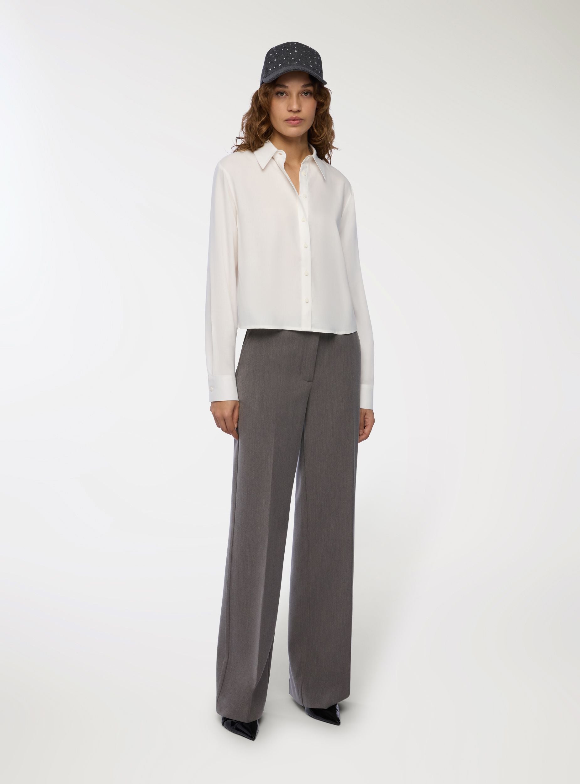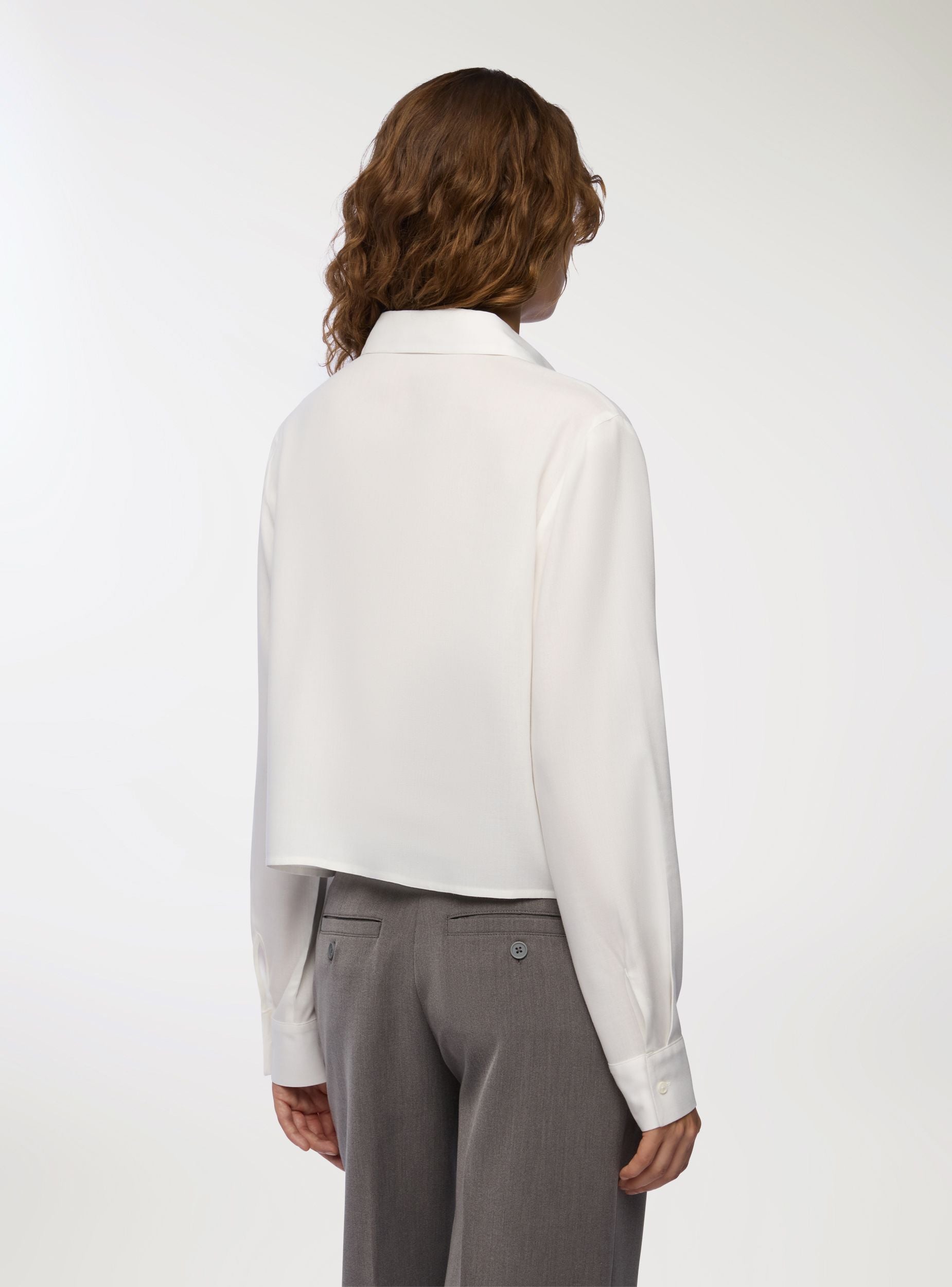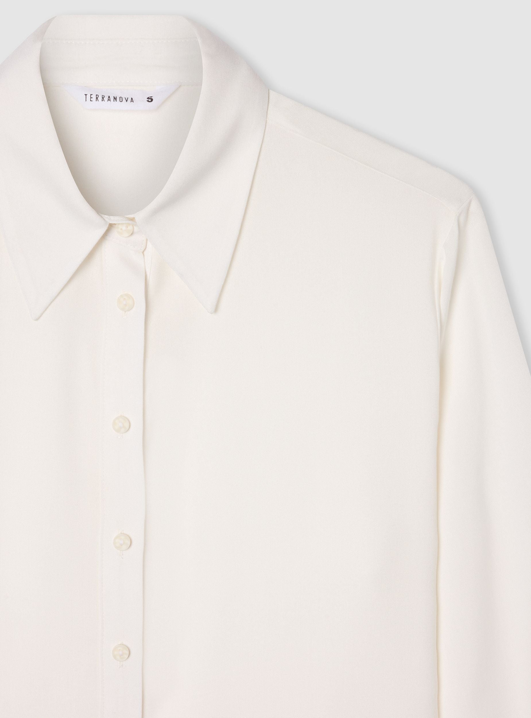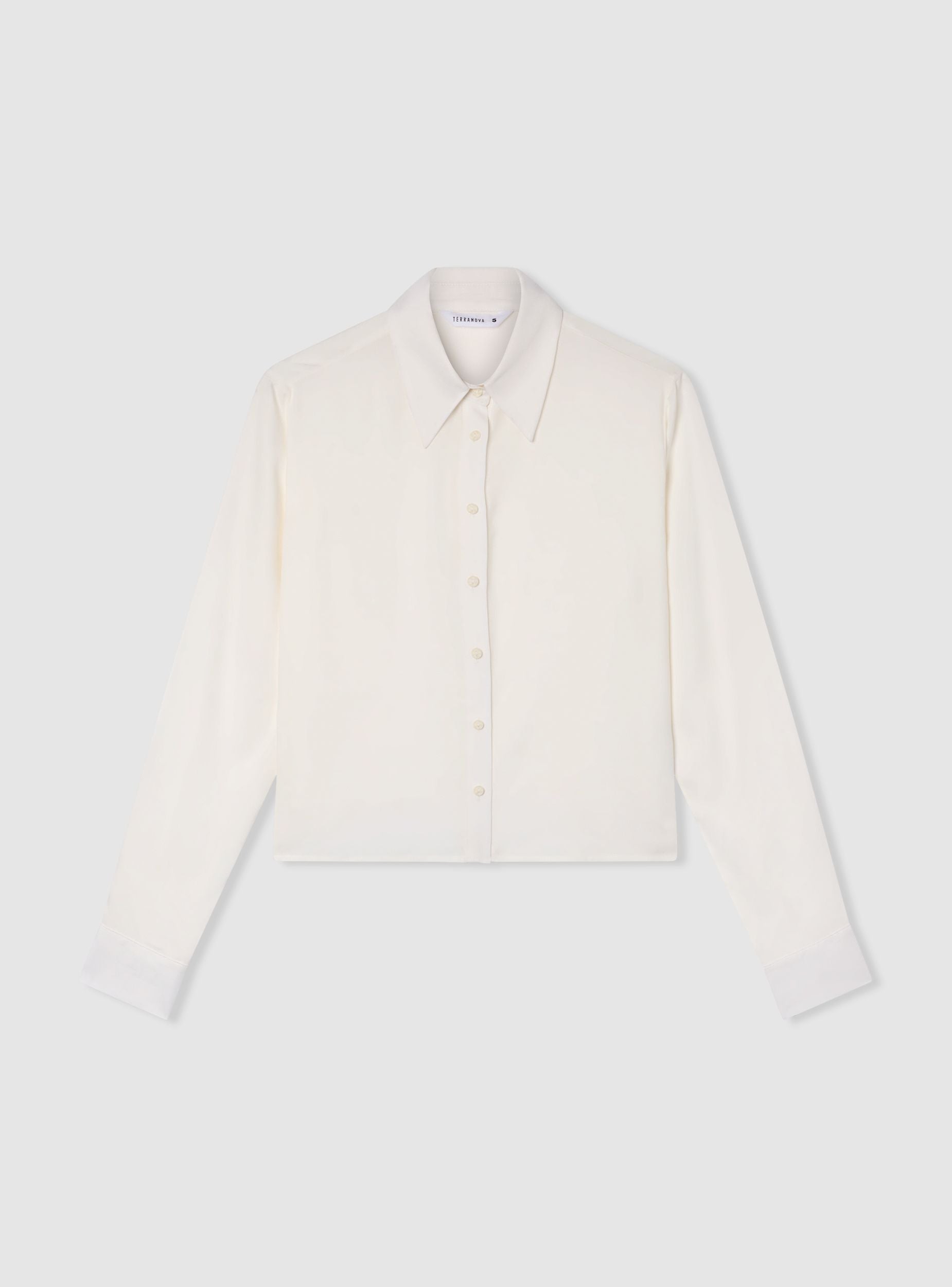 Женская рубашка из вискозы с укороченным кроем, идеально подходит как для формального, так и для повседневного образа. Модель выполнена в однотонном дизайне с длинными рукавами и манжетами на пуговицах. Классический воротник придаёт элегантность, а застёжка на пуговицы спереди обеспечивает удобство. Отлично сочетается с брюками с высокой талией или юбками для создания изысканного и современного образа.Детали