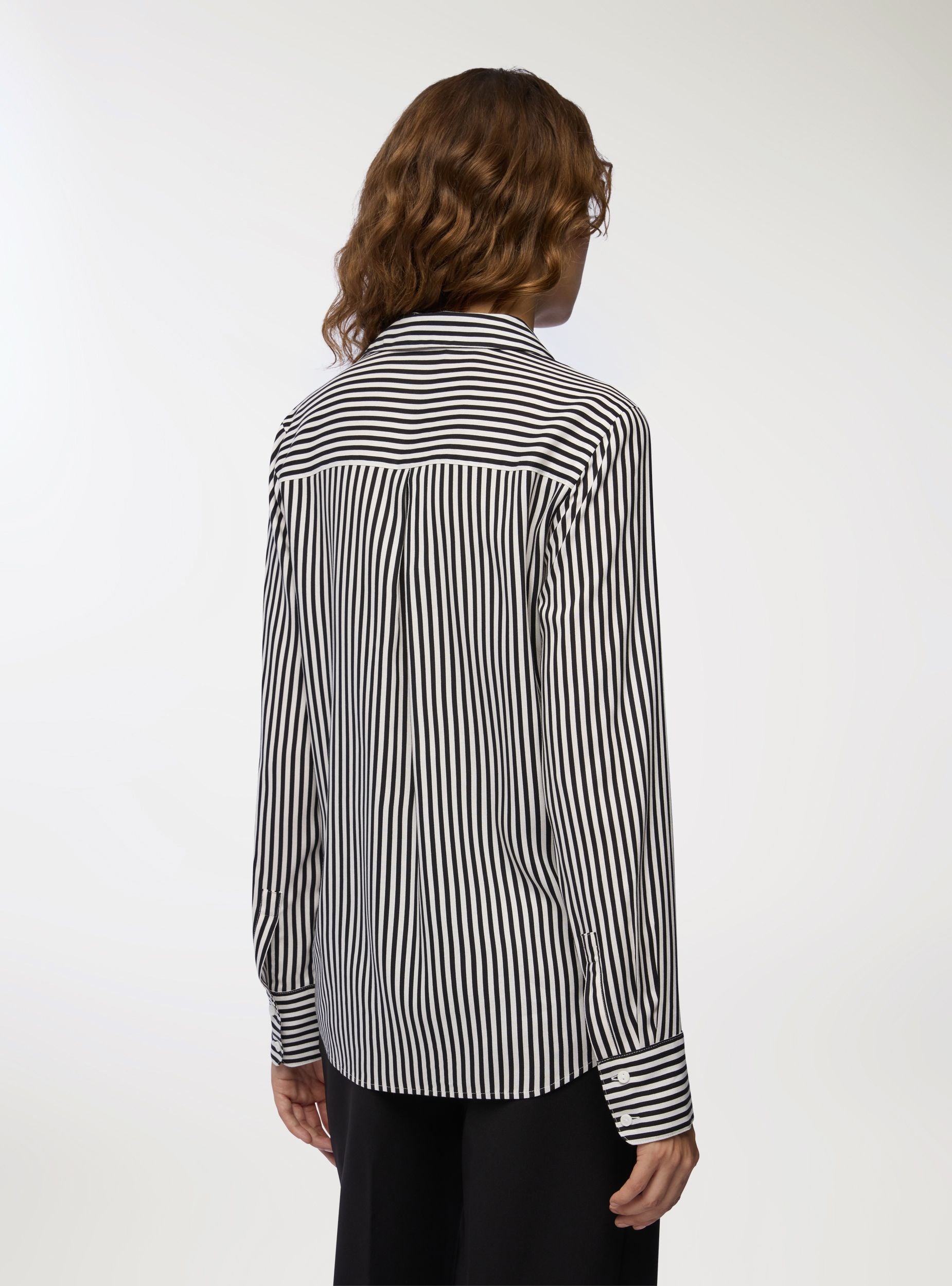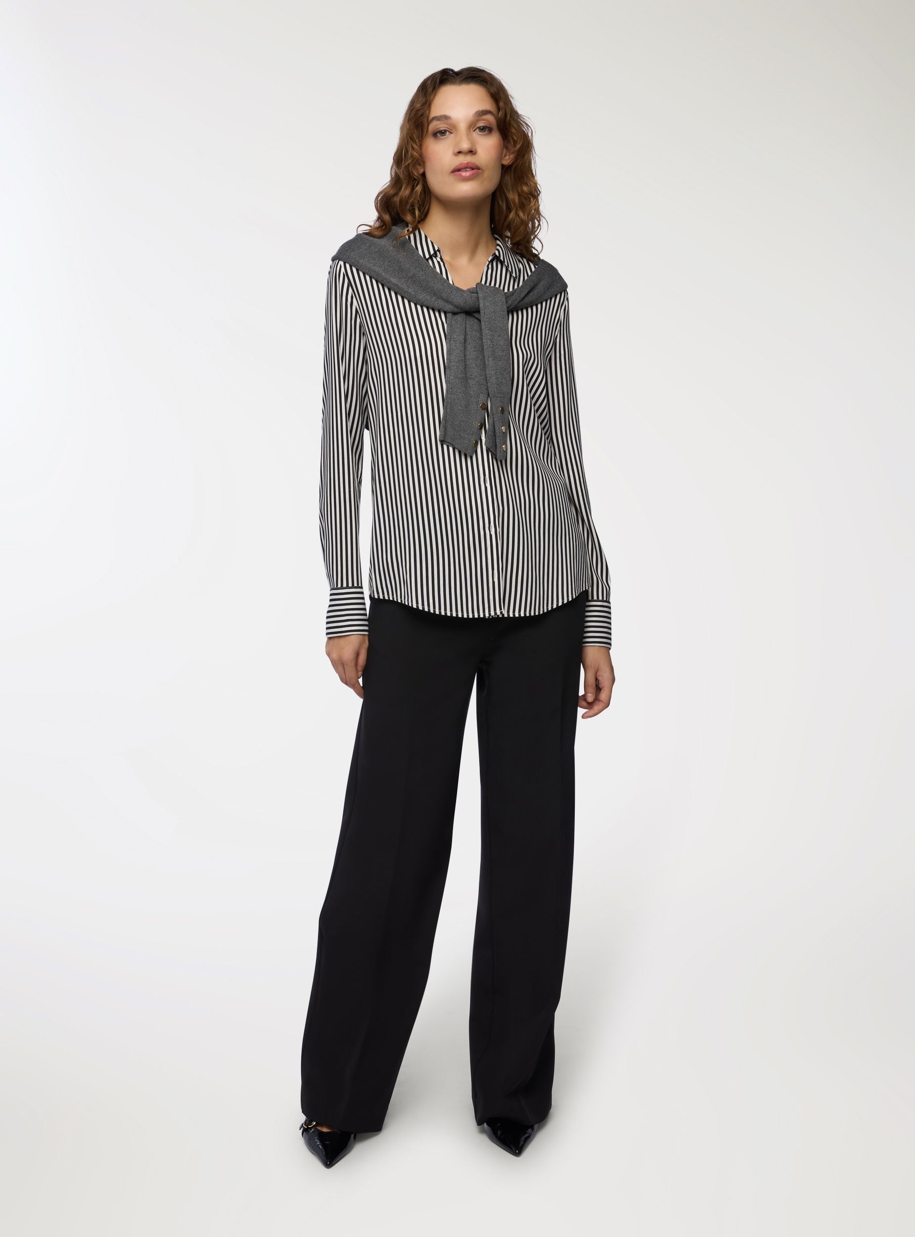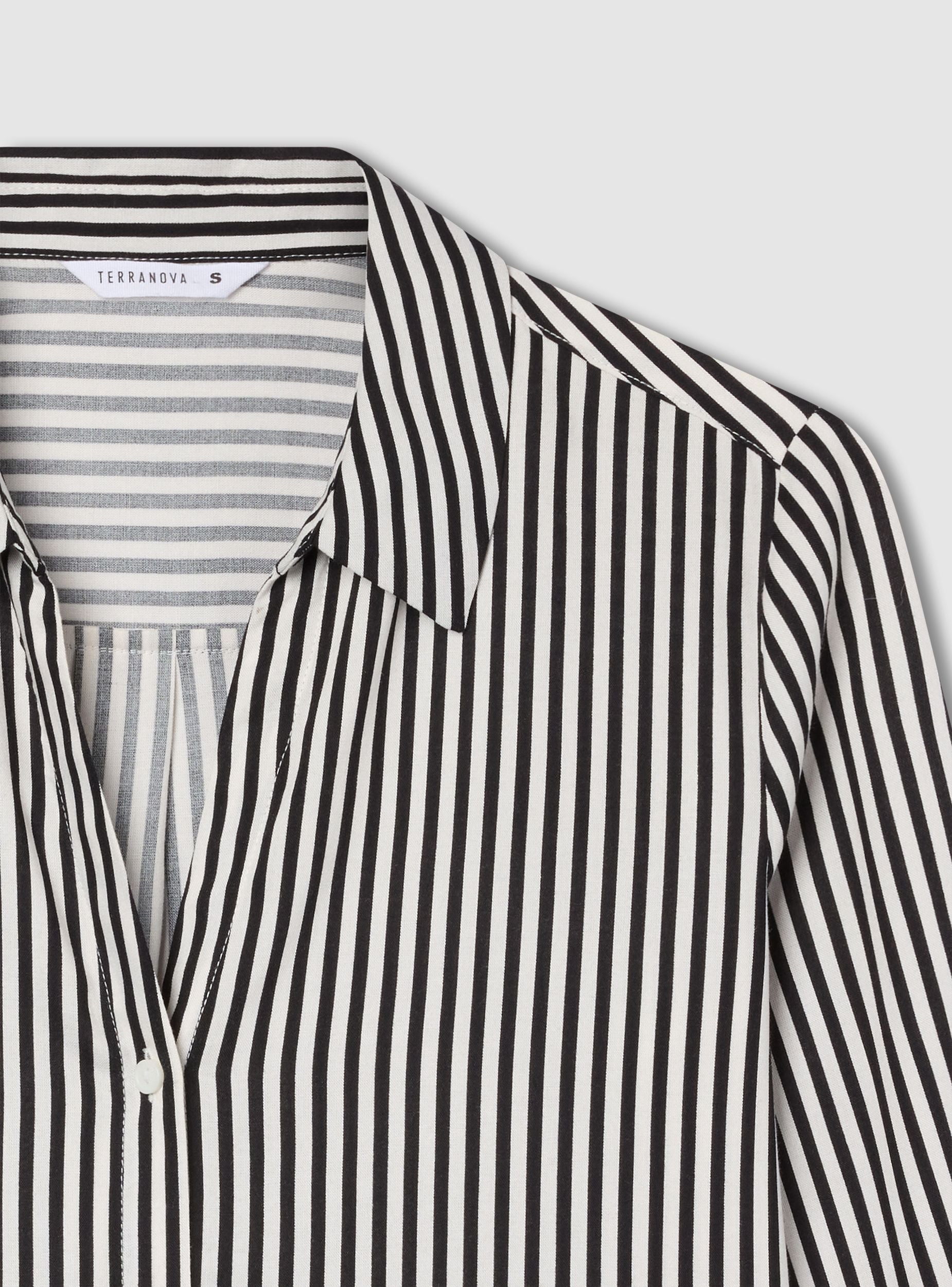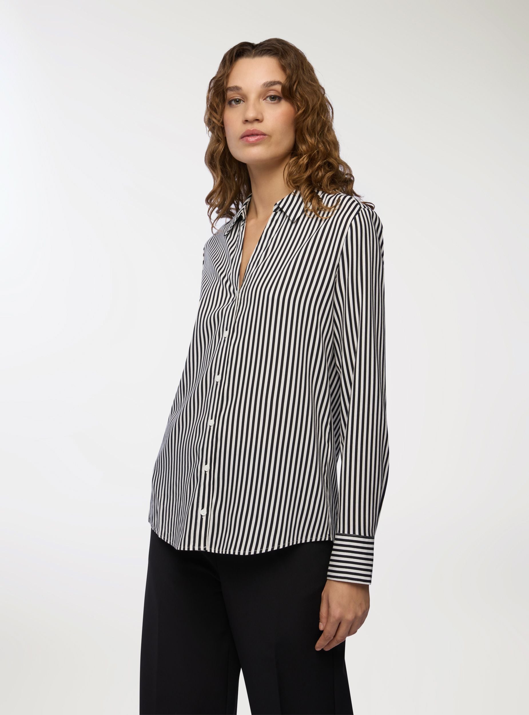 Женская рубашка в полоску, идеально подходит для формального или повседневного шикарного образа. Имеет классический воротник и застежку спереди на пуговицы. Длинные рукава с застегивающимися манжетами добавляют элегантности. Отлично сочетается с элегантными брюками или джинсами для универсального и изысканного наряда.Детали