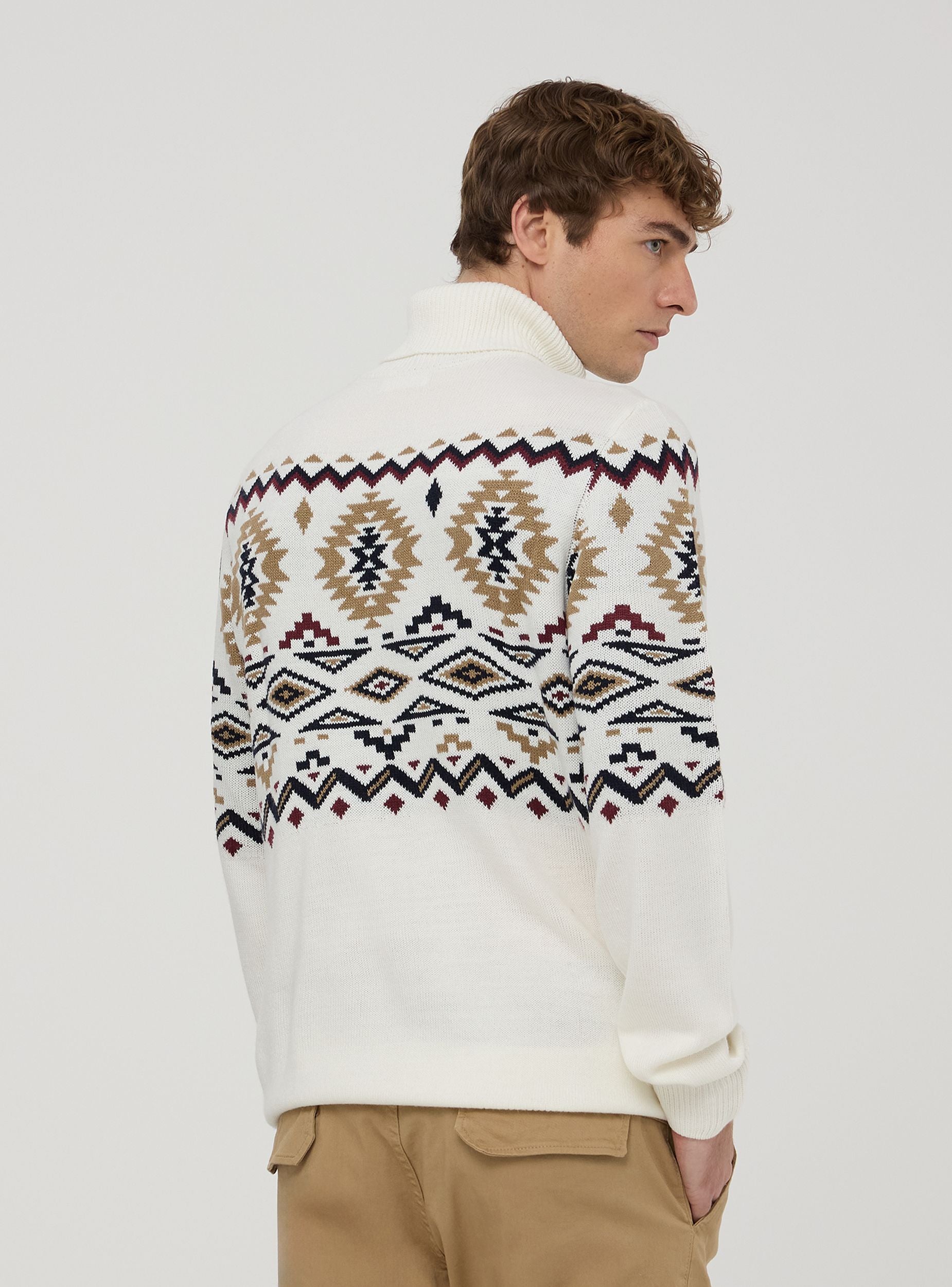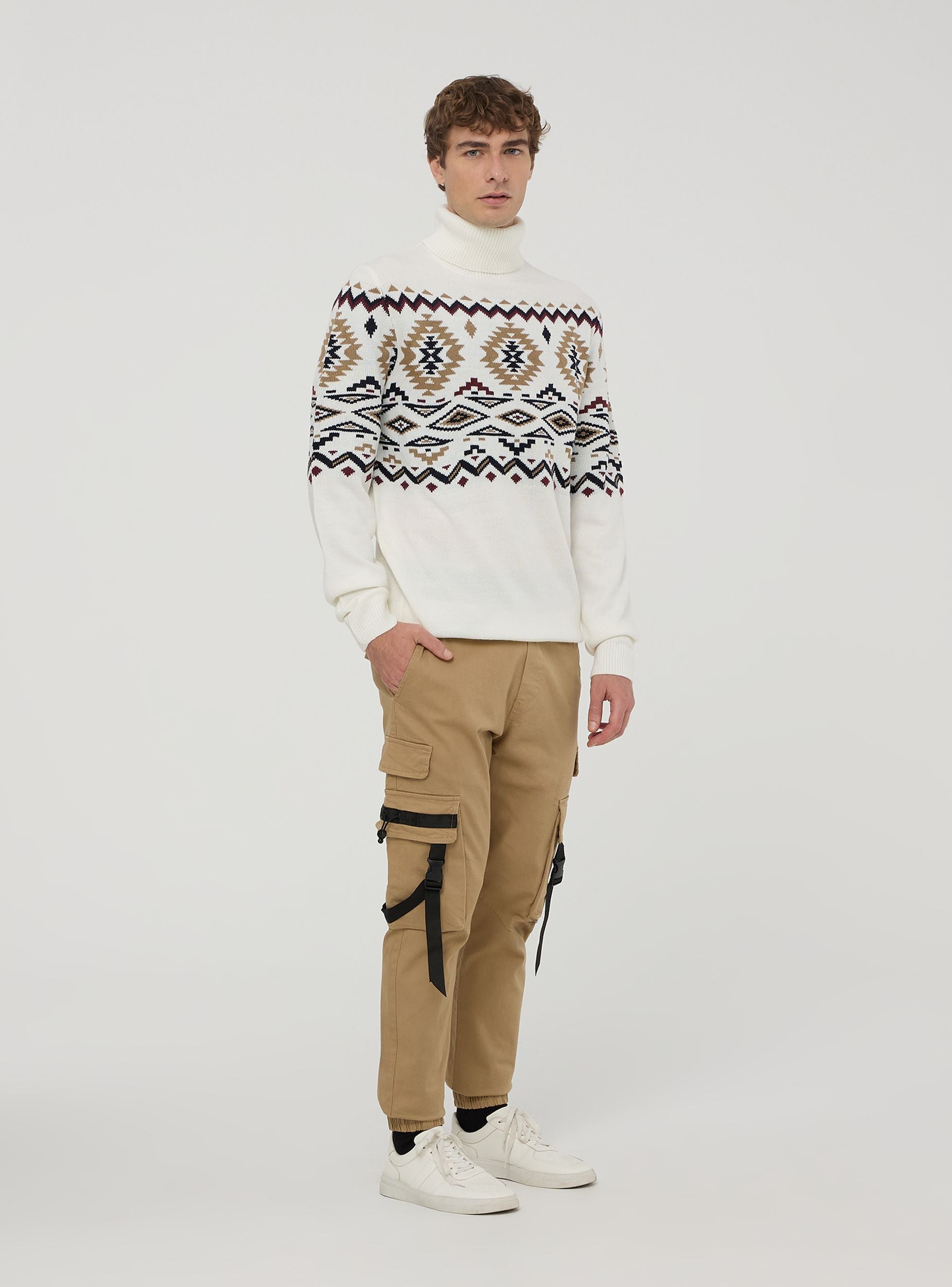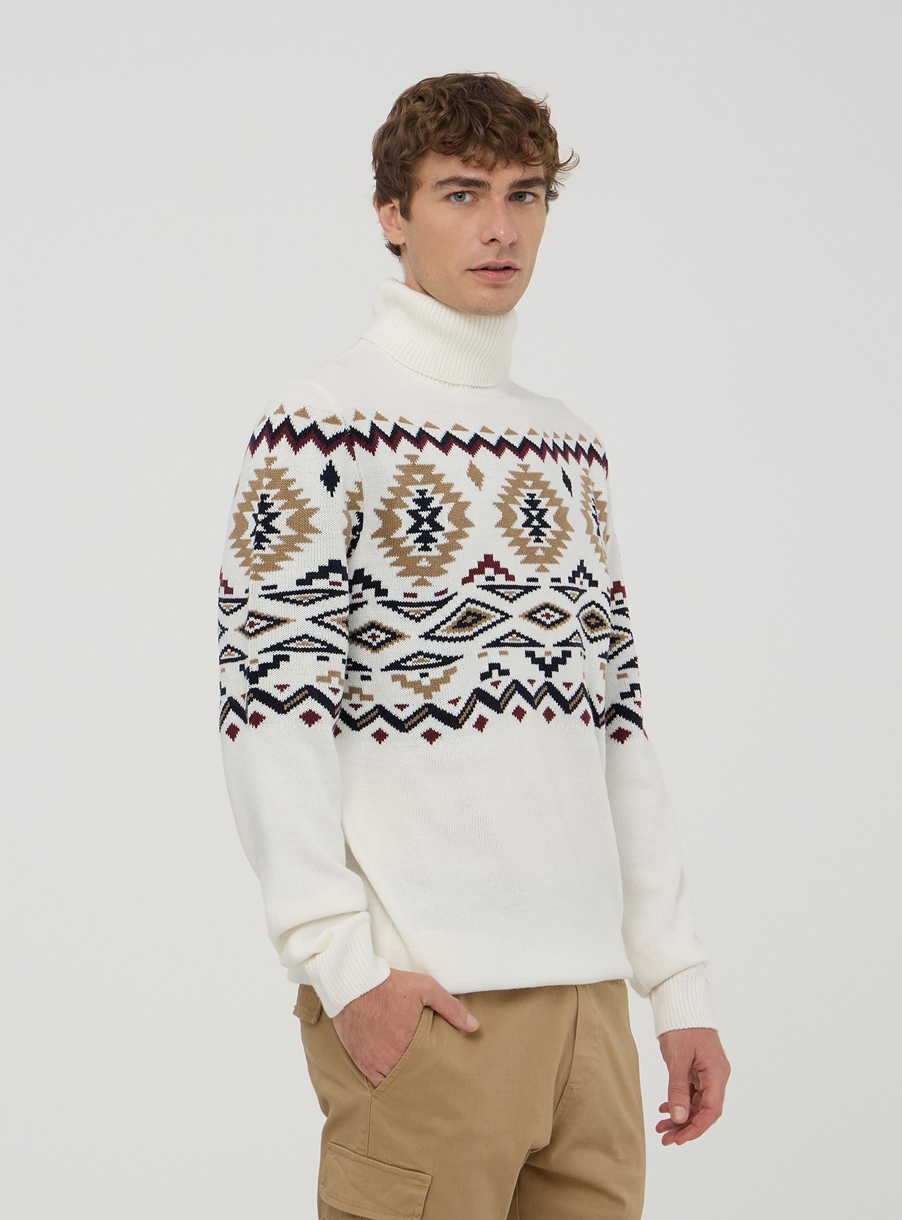 Мужская футболка с геометрическим узором, вдохновленным горами. Она имеет высокий воротник, идеально подходящий для холодных дней. Симметричный дизайн горизонтально простирается по груди, рукавам и спине, предлагая гармоничный и привлекательный вид. Длинные рукава и высокий воротник обеспечивают дополнительную защиту от холода. Манжеты, воротник и нижний край отделаны резинкой для лучшей посадки и долговечности. Идеально подходит для зимнего сезона, сочетая стиль и функциональность.Детали