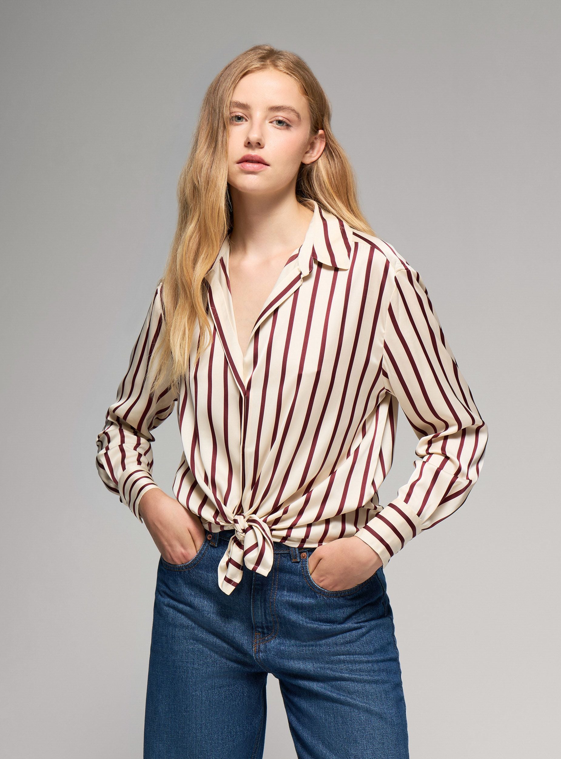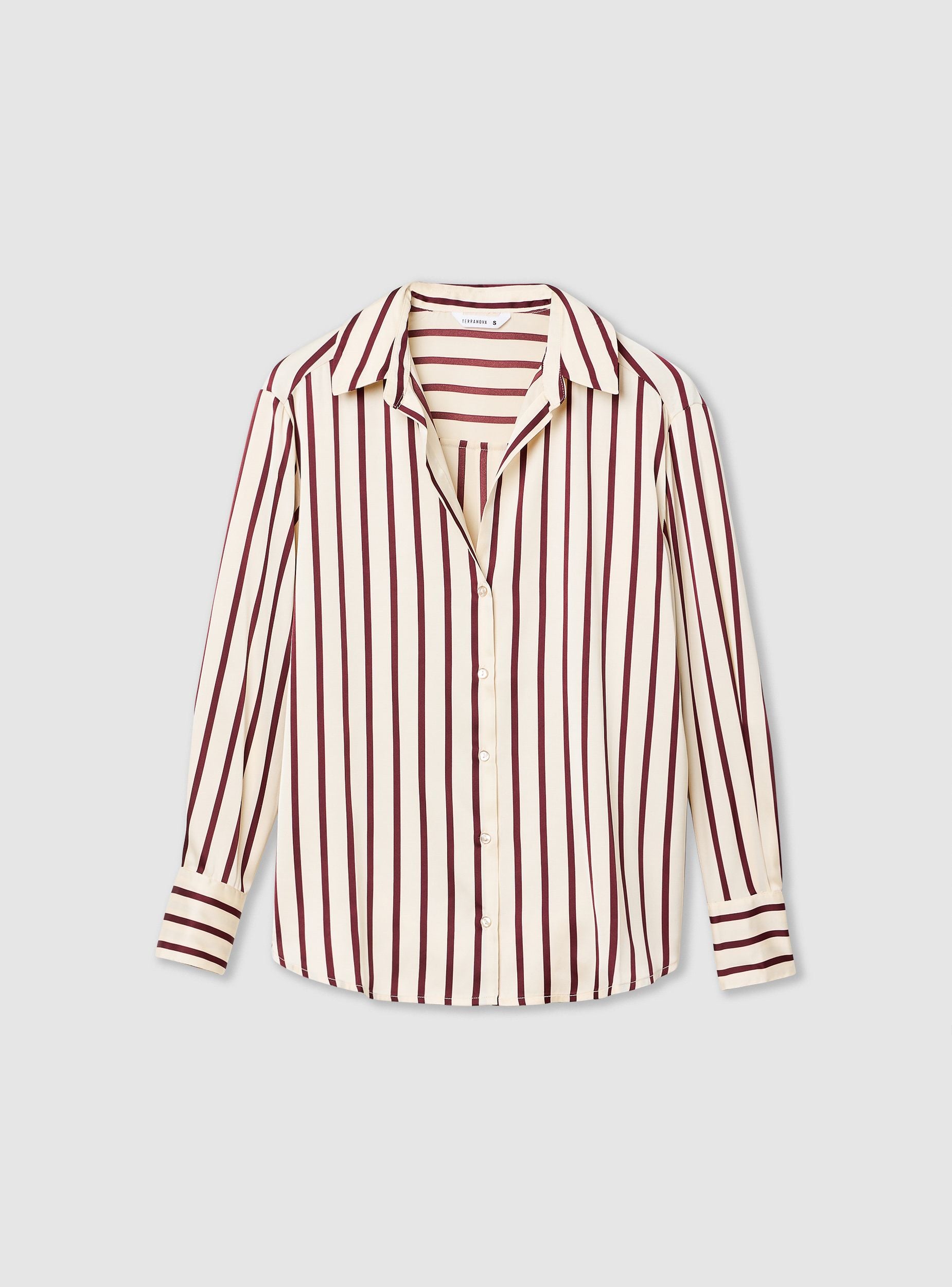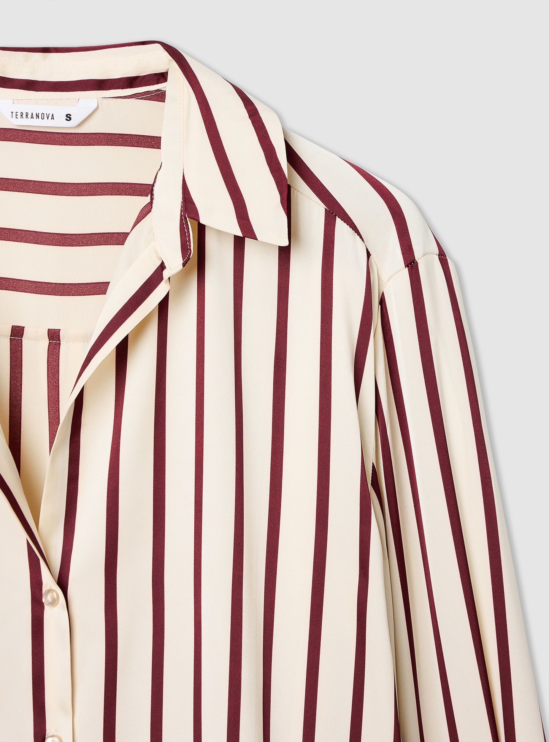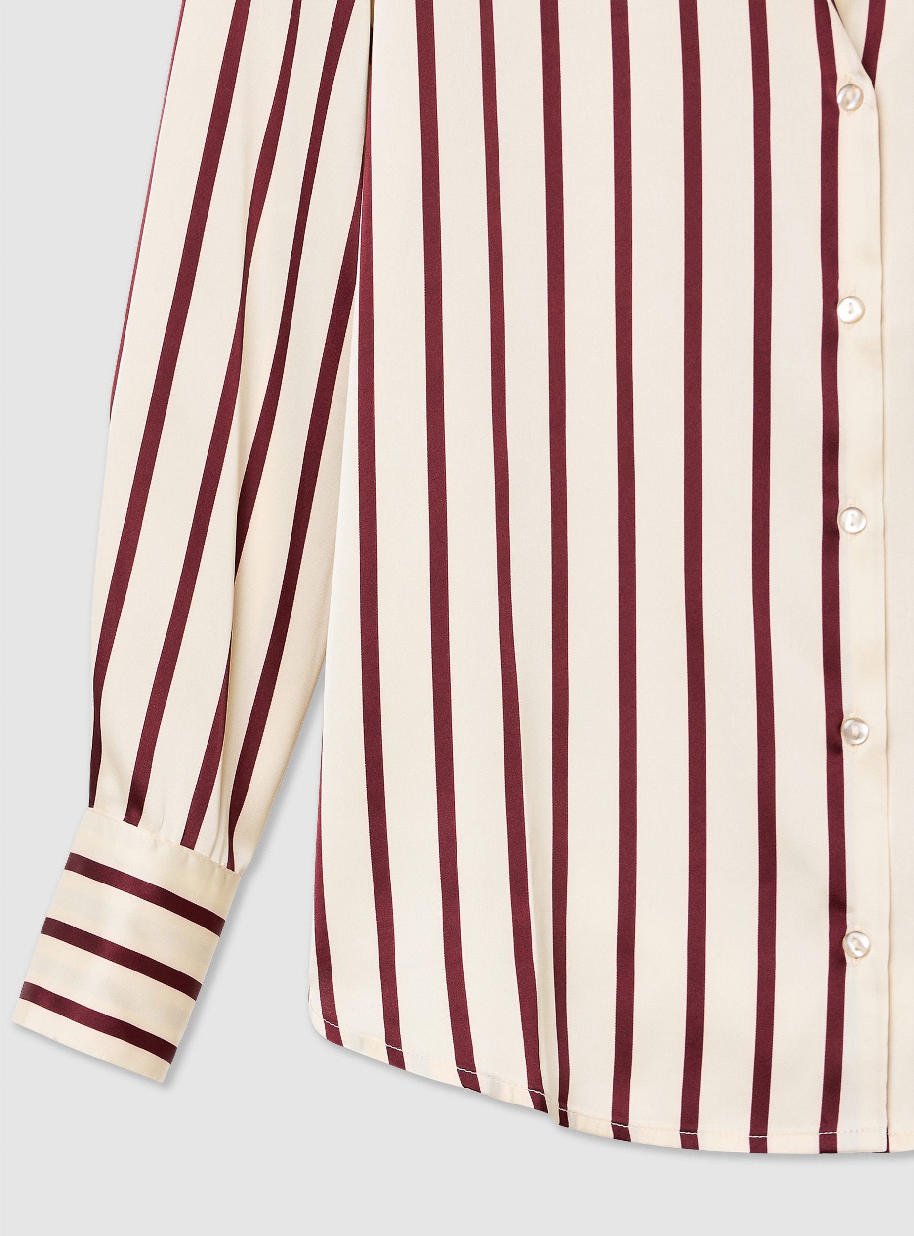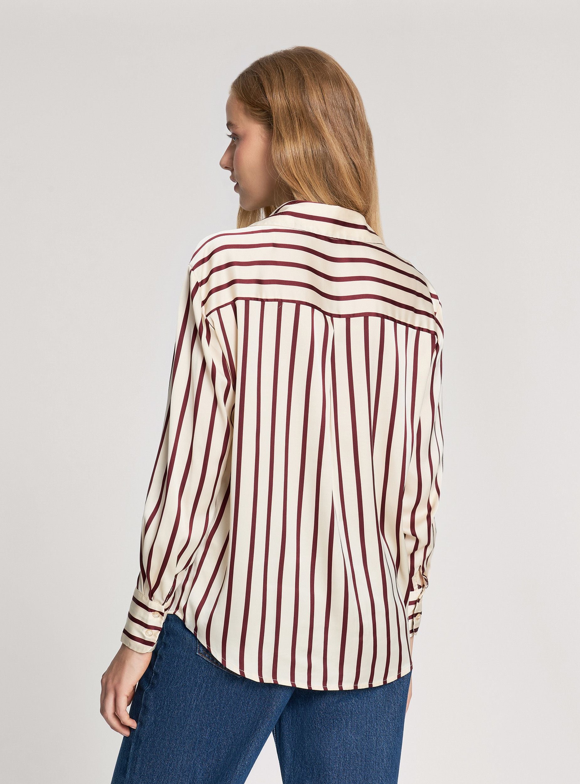 Женская рубашка свободного кроя с вертикальным полосатым рисунком, который придаёт изделию изысканный и современный вид. Оснащена воротником и длинными рукавами, имеет застёжку спереди на пуговицы. Идеально подходит для создания элегантных и универсальных образов, прекрасно сочетается с брюками или юбками для безупречного стиля, подходящего для разных случаев.Детали