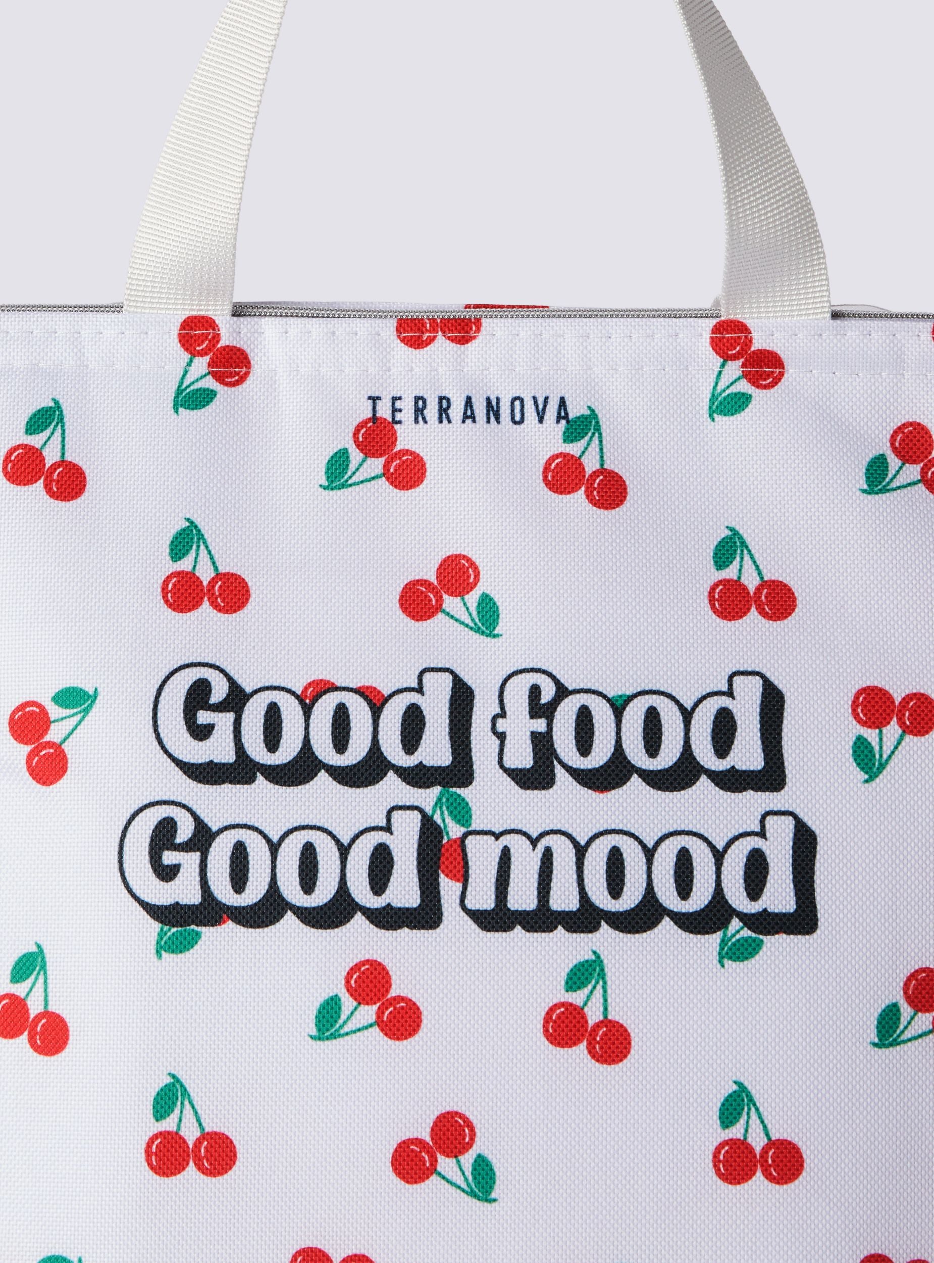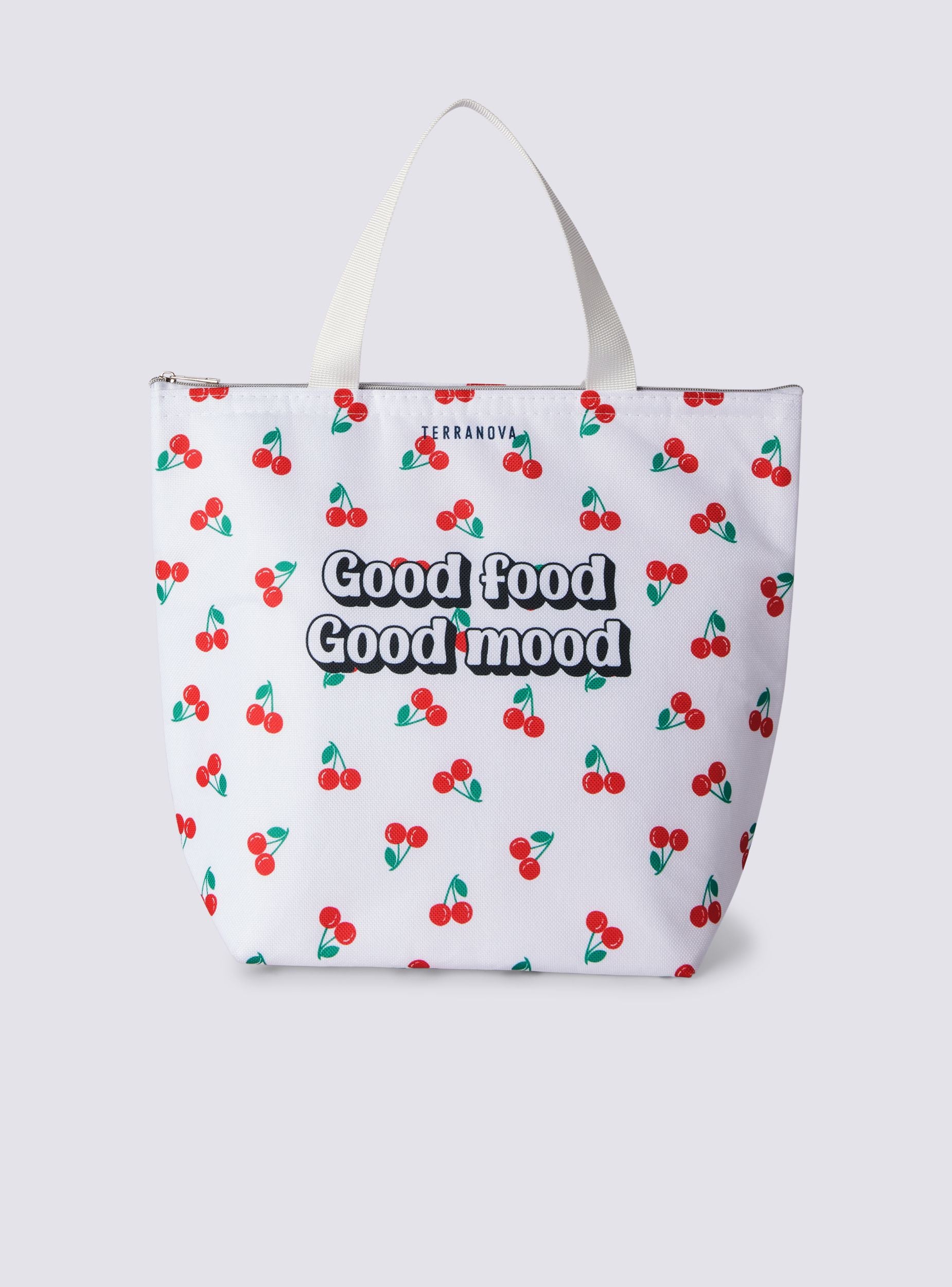 Женская холодильная сумка с ярким и функциональным дизайном, идеально подходящая для пикников, дней на пляже или обедов вне дома. Принт с вишнями придает свежий и яркий вид, а забавная надпись добавляет оригинальности. Оснащена застежкой на молнии, поддерживает продукты и напитки при нужной температуре. Идеально сочетается с повседневными и яркими образами для стильного и практичного лета. Размеры: высота 26 см, длина 19 см, глубина 12,5 см.Детали