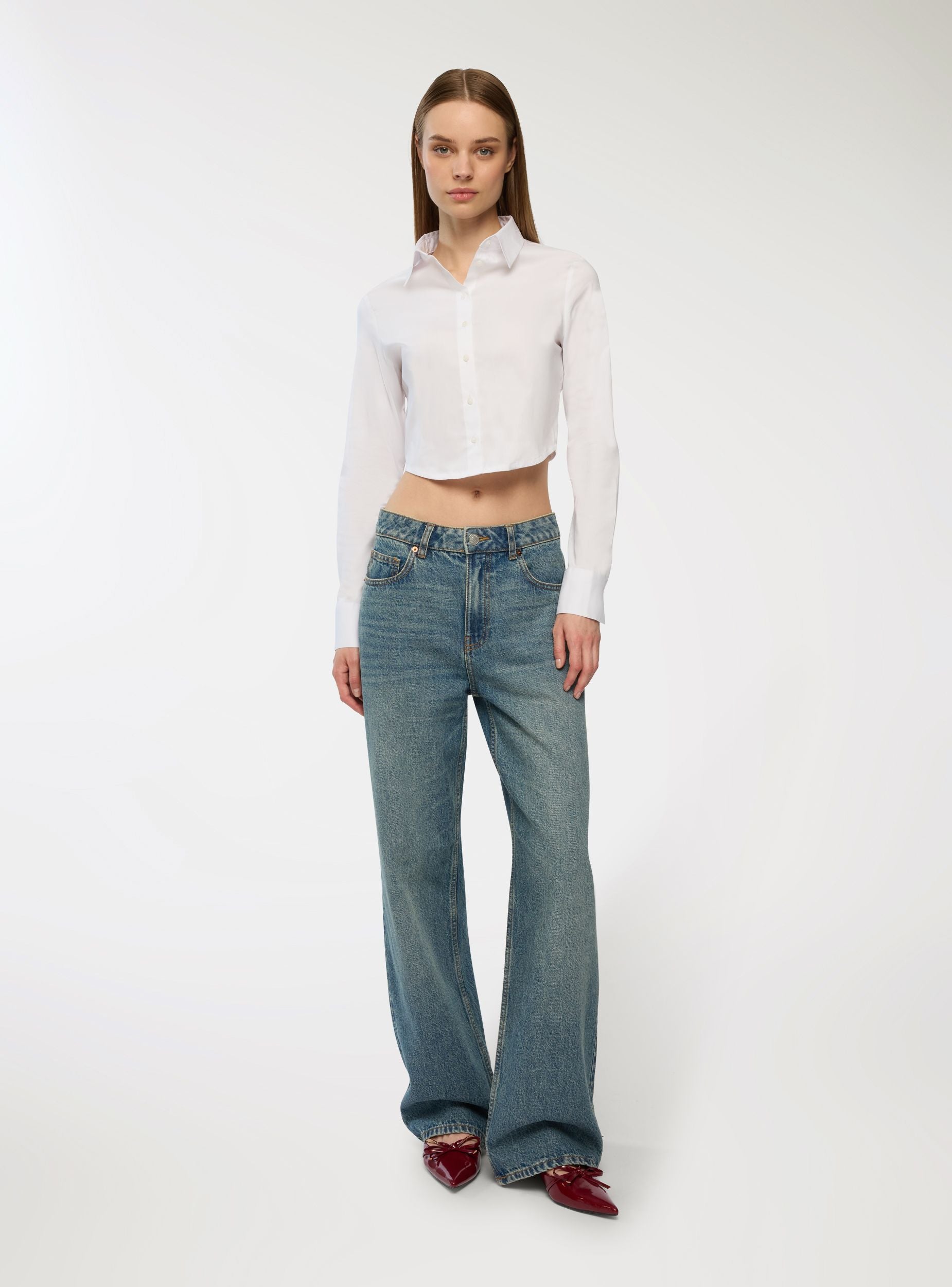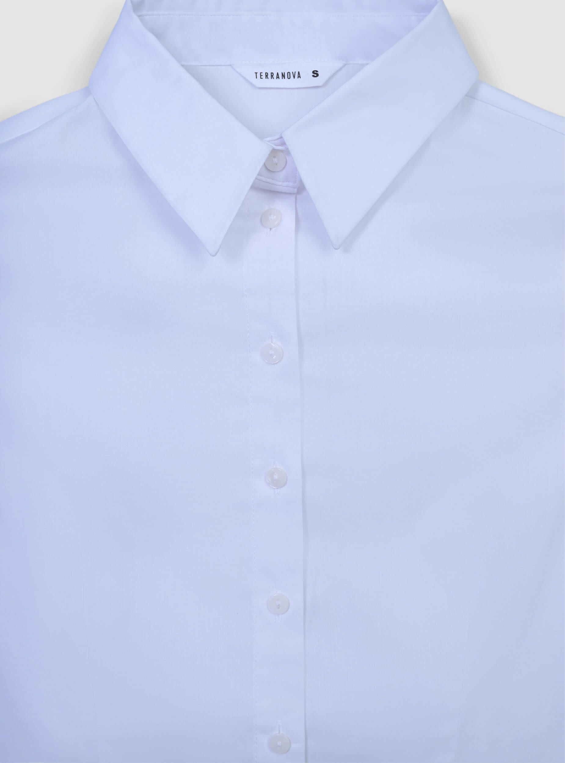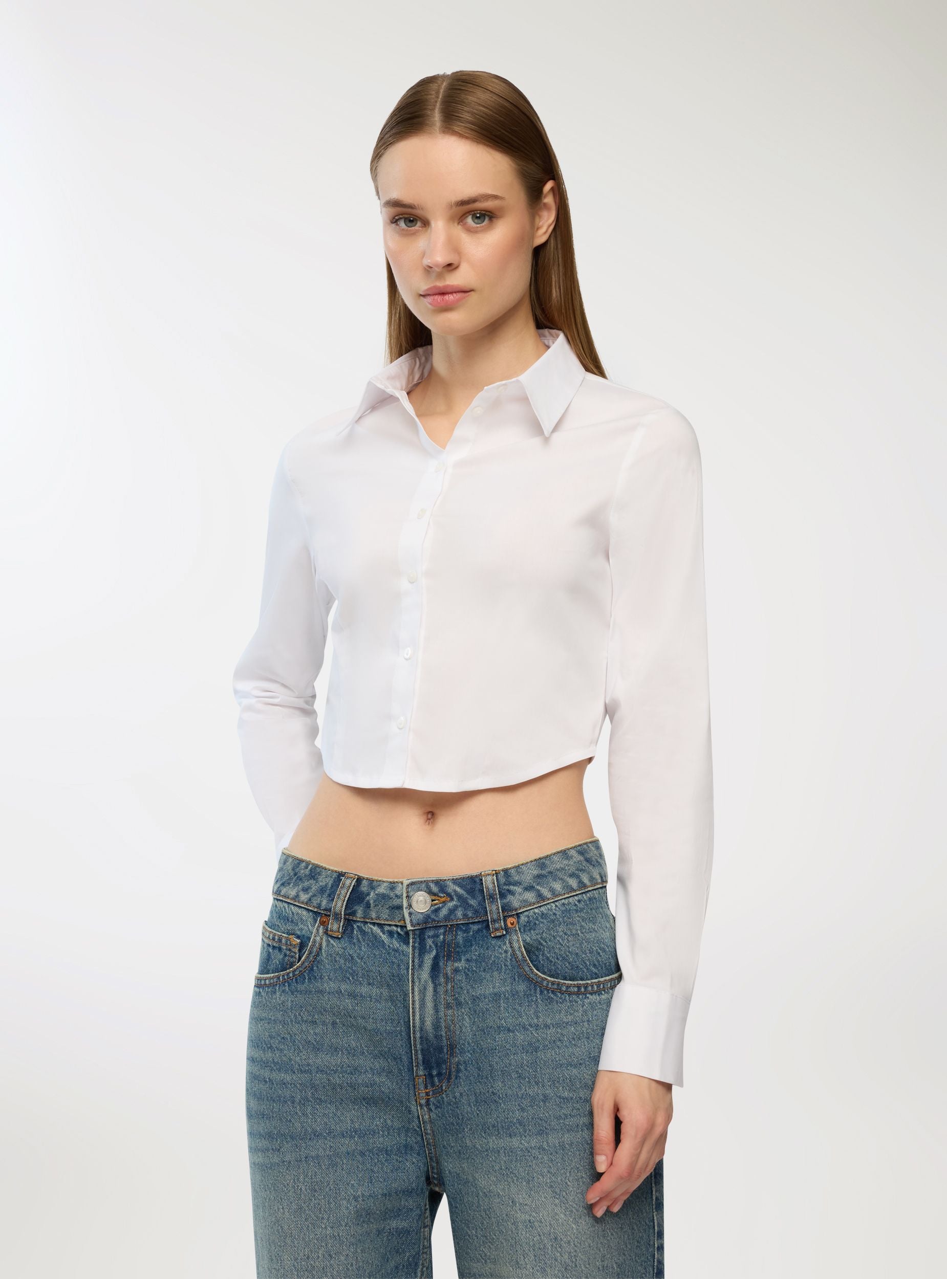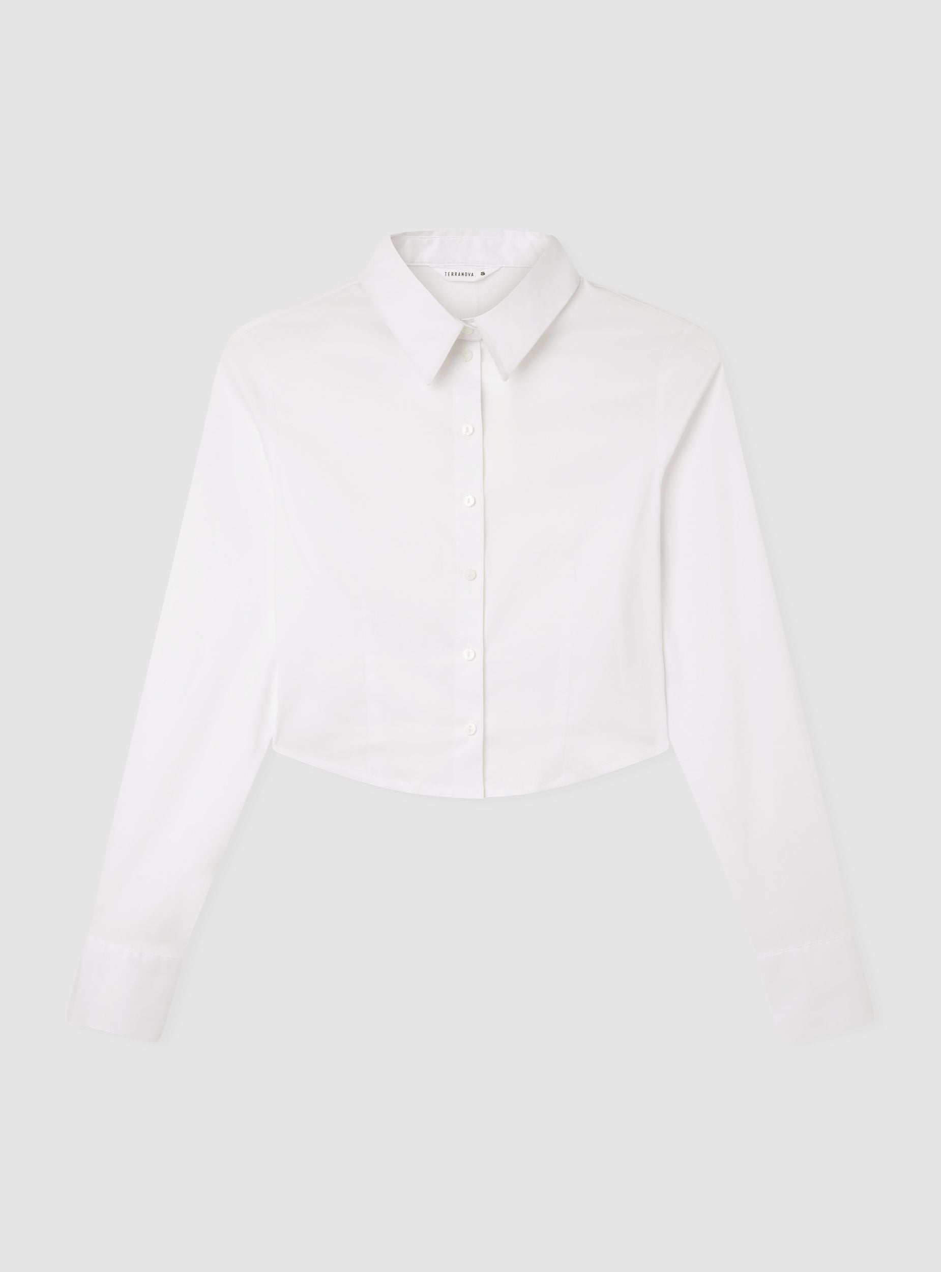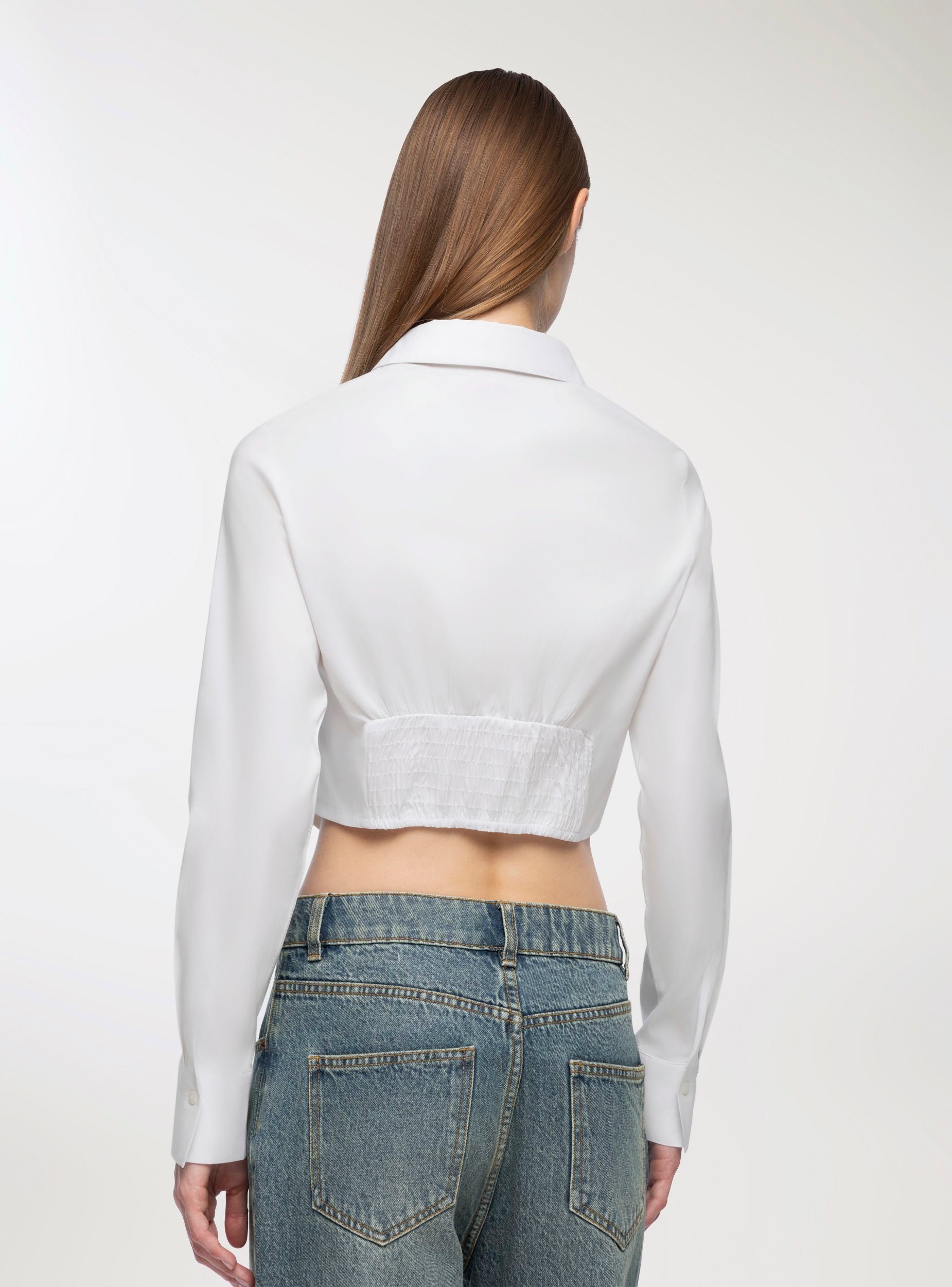 Женская укороченная рубашка однотонного цвета, идеальна для городских и современных образов. Модель имеет классический воротник, длинные рукава и застежку спереди на пуговицы. Спинка украшена вставкой в стиле смок, что придает современный вид и подчеркивает посадку. Идеально сочетается с брюками с высокой талией или юбками для универсальных нарядов, подходит как для офиса, так и для свободного времени.Детали