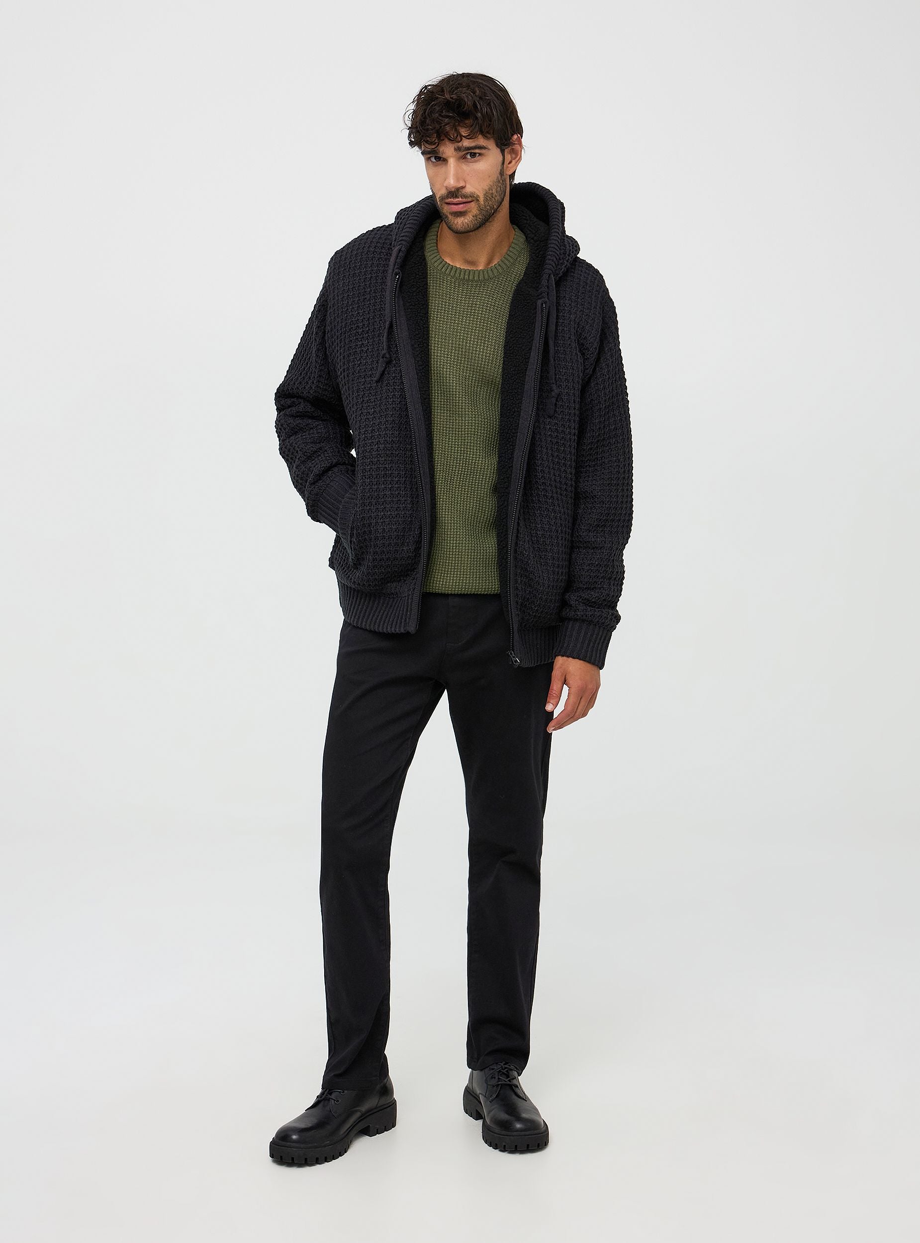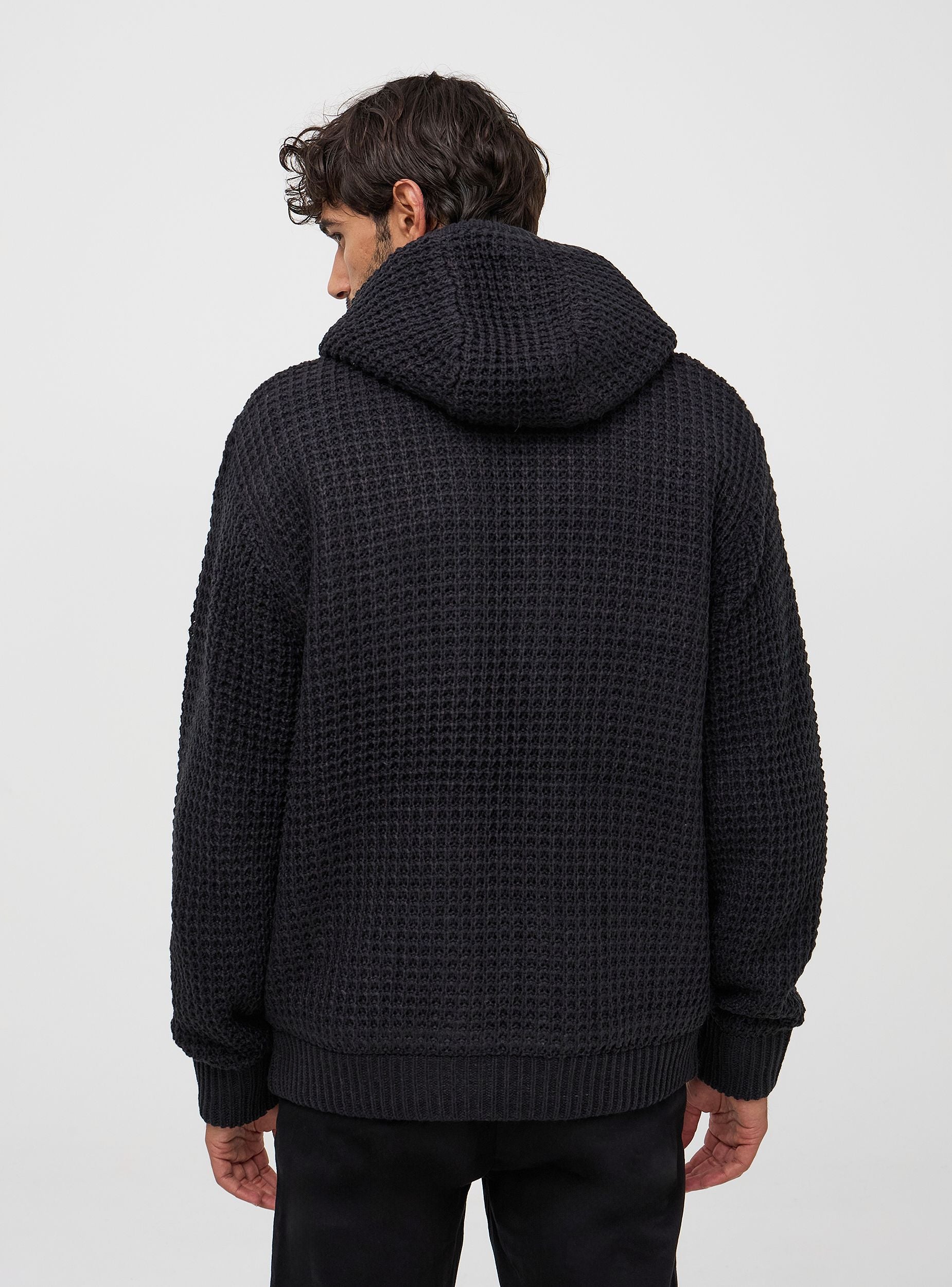 Мужской кардиган с капюшоном. Имеет крупную текстурную отделку, добавляющую оригинальности. Оснащен удобной фронтальной молнией, дополнен двумя практичными боковыми карманами. Длинные рукава включают манжеты для большего комфорта. Посадка обычная, идеальна для повседневного стиля. Отлично подходит для неформальных выходов, осенних прогулок и досуга.Детали