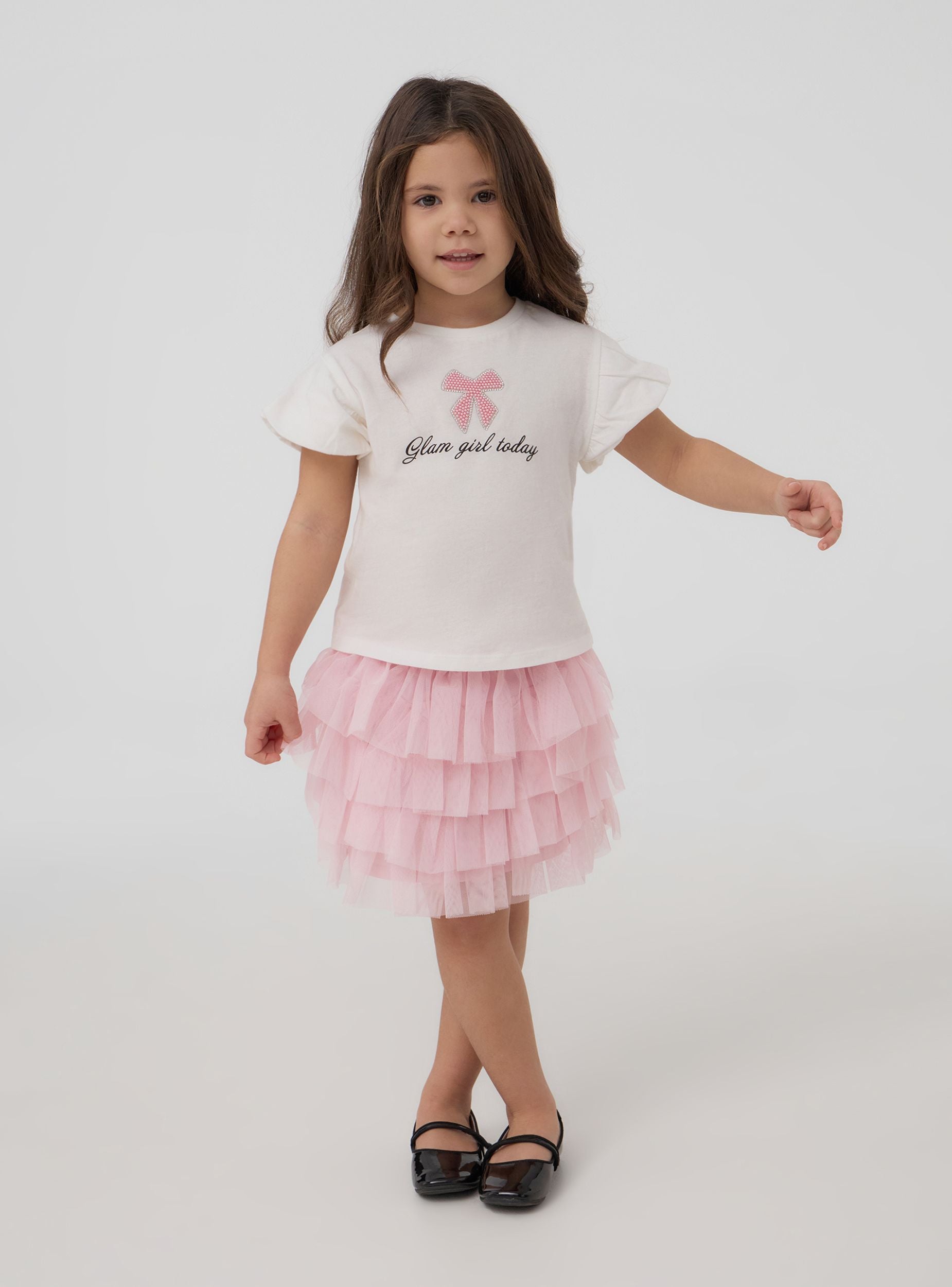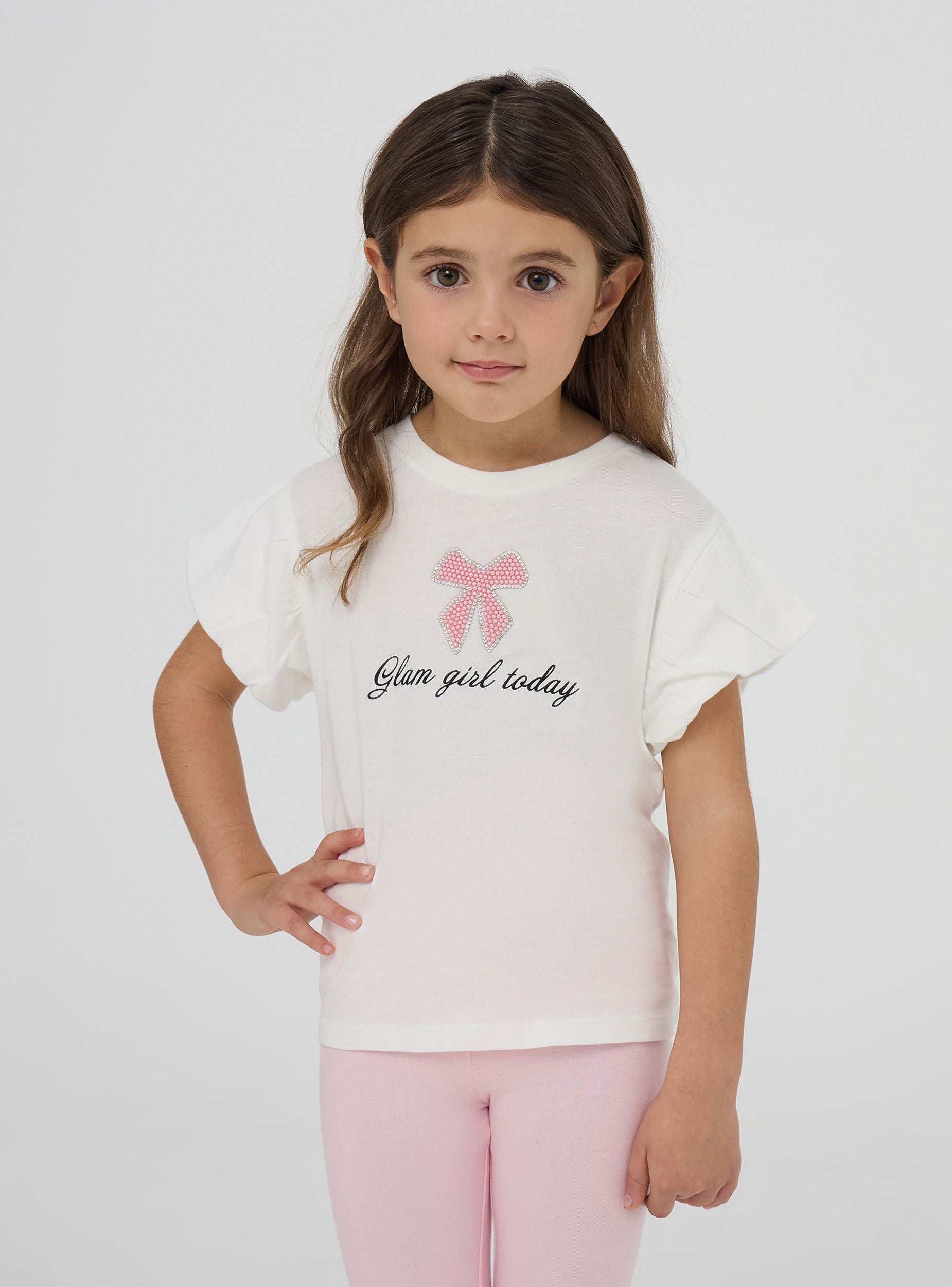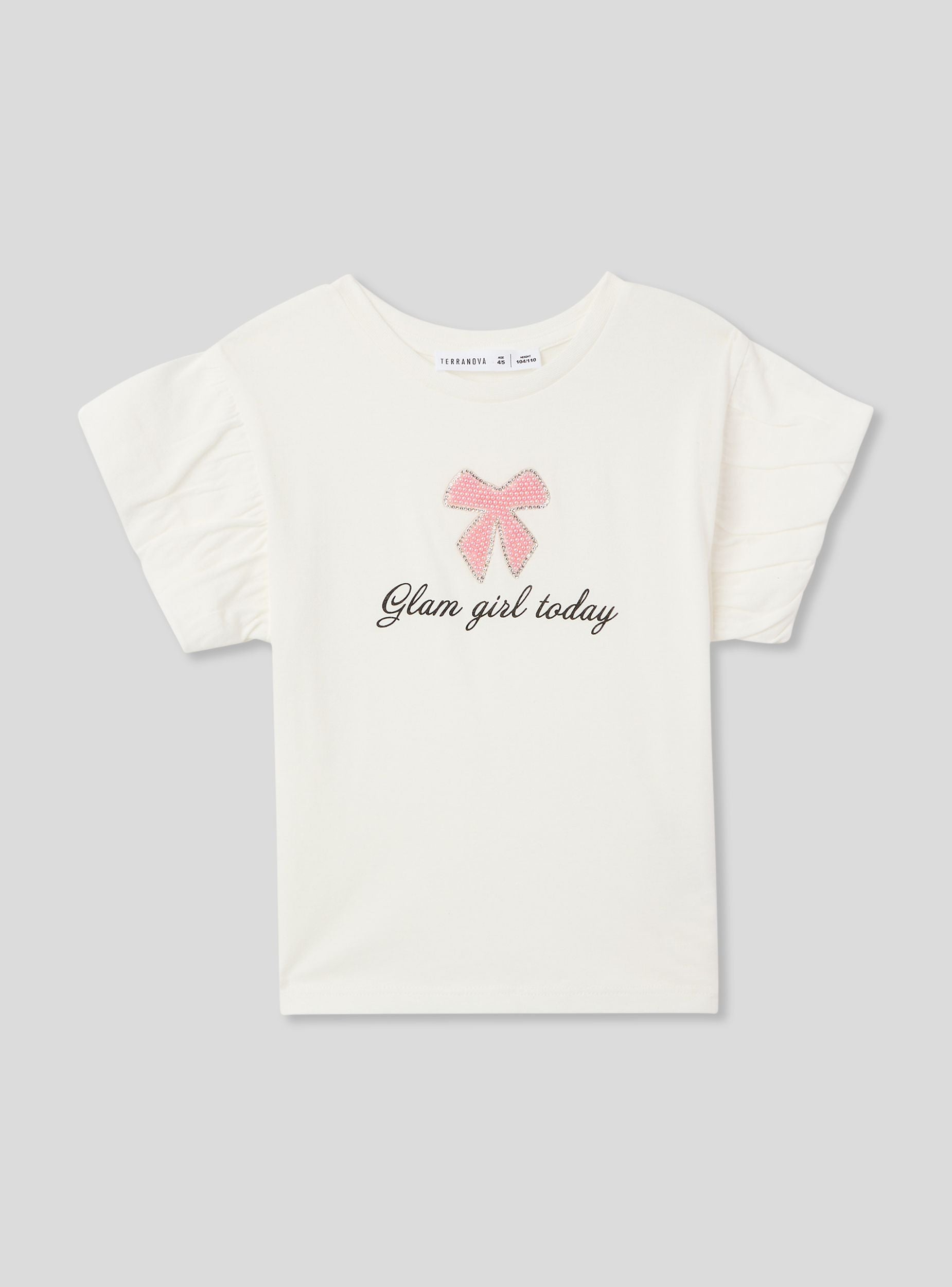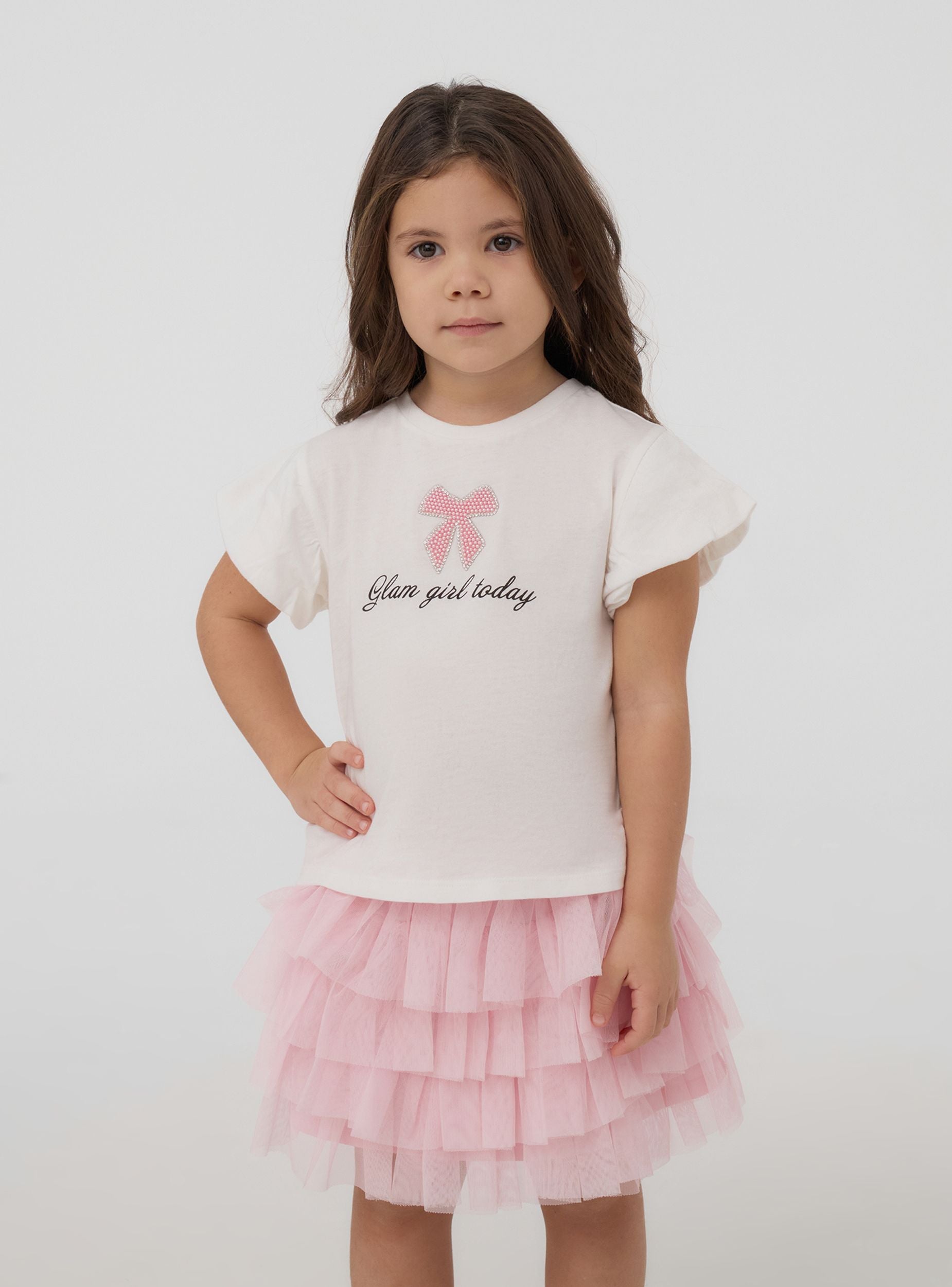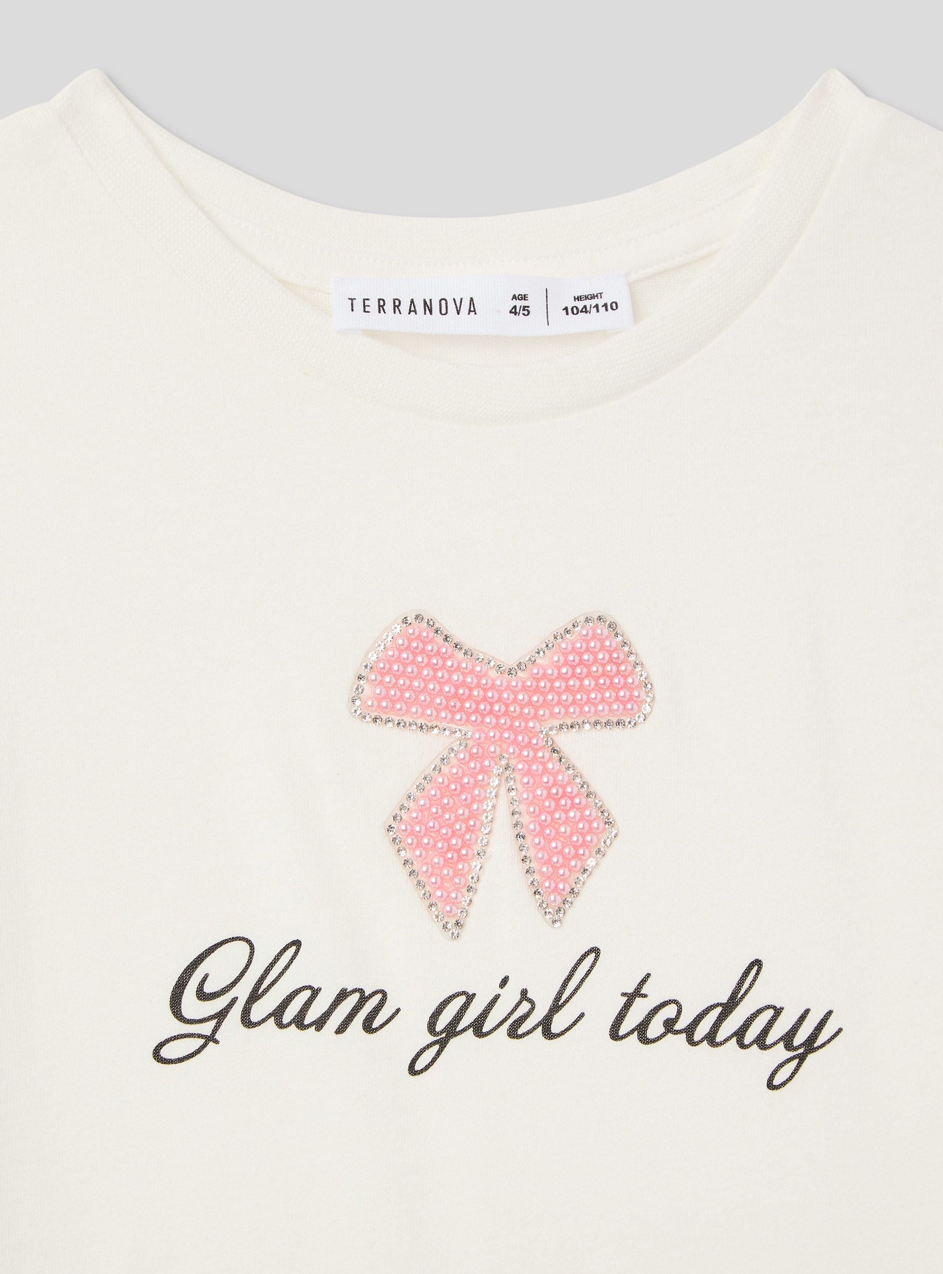 Футболка для девочки, идеально подходящая для повседневного и модного образа, идеально подходит для школы или встреч с друзьями. С короткими рукавами и круглым вырезом, она сочетает в себе комфорт и стиль. Принт украшен бантиком с блестящими аппликациями и надписью "Glam girl today", что добавляет нотку оригинальности.