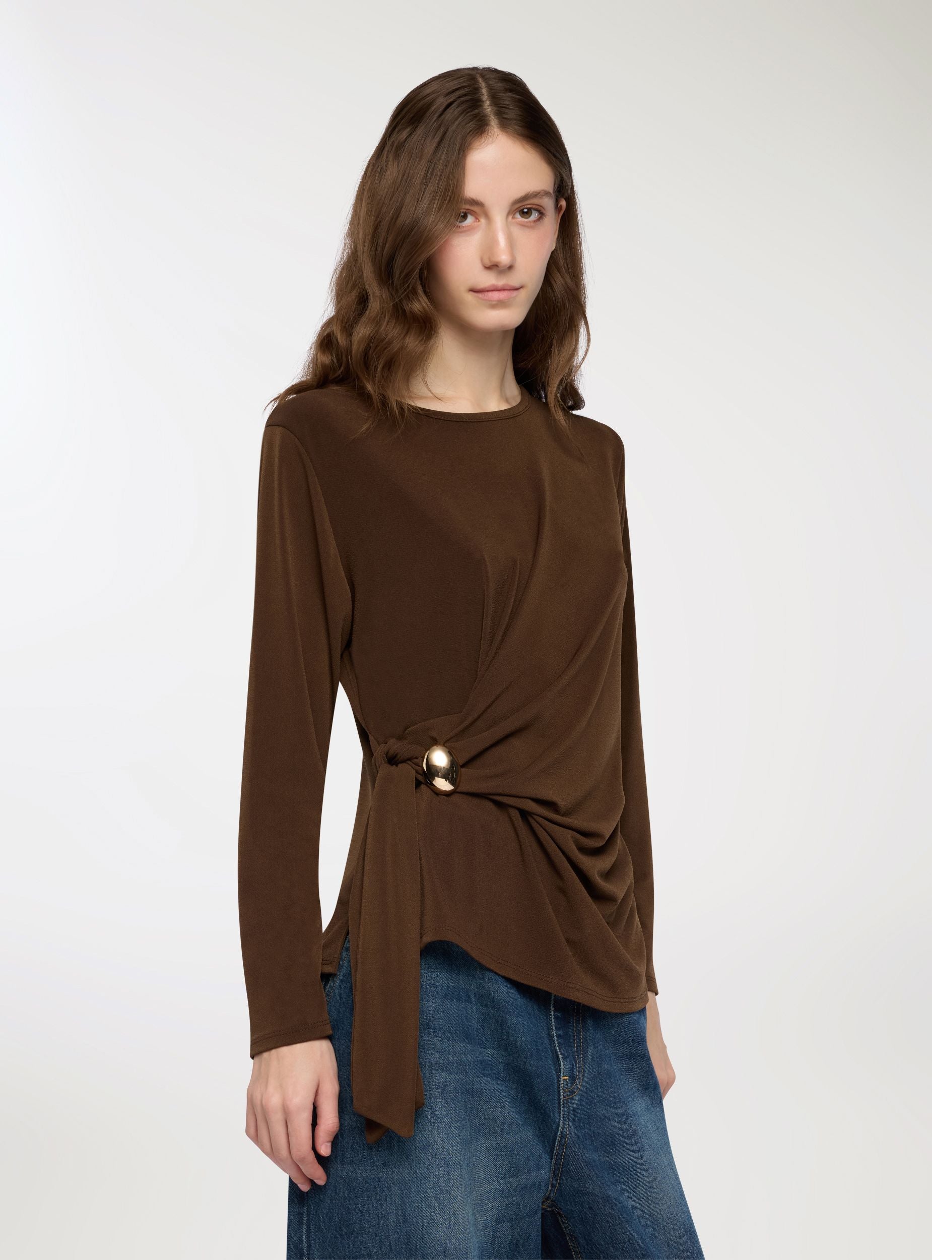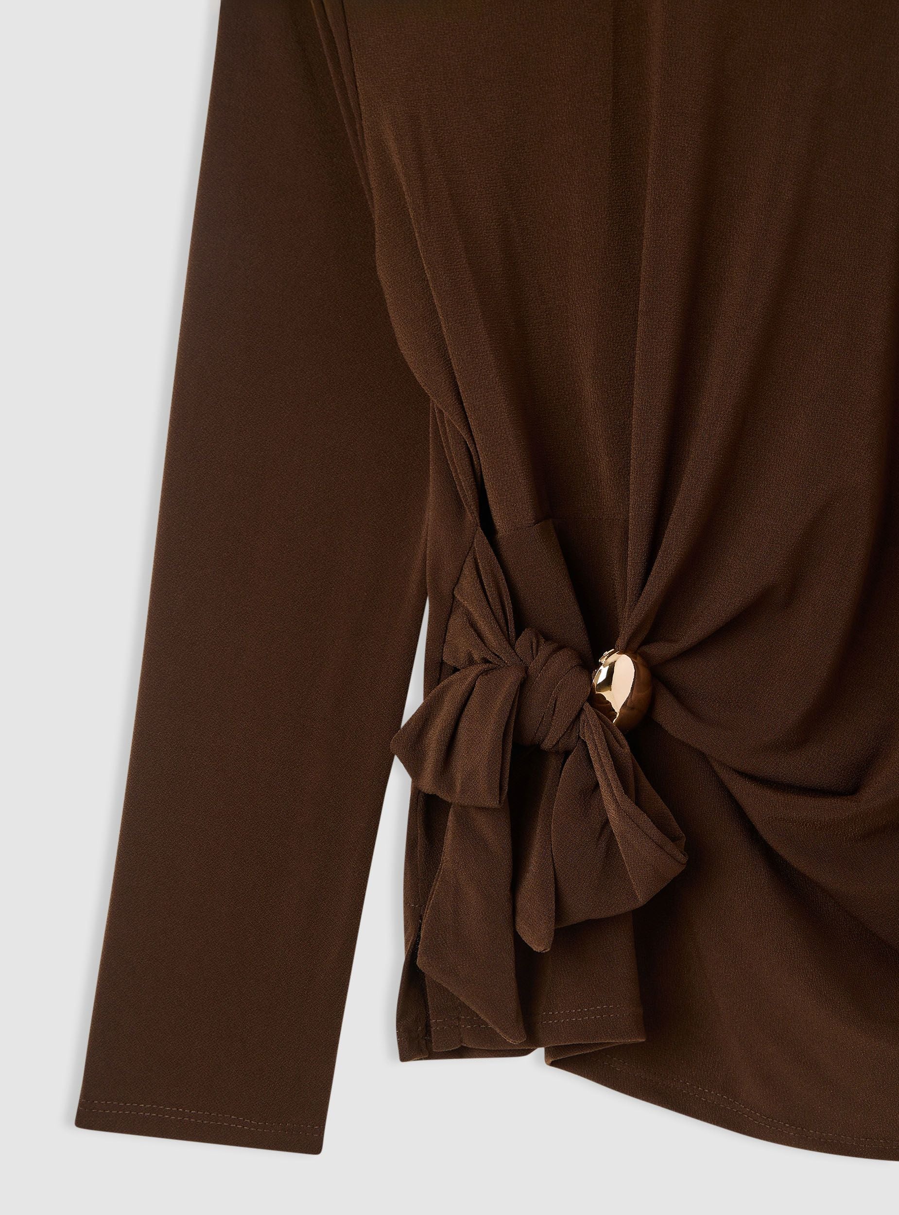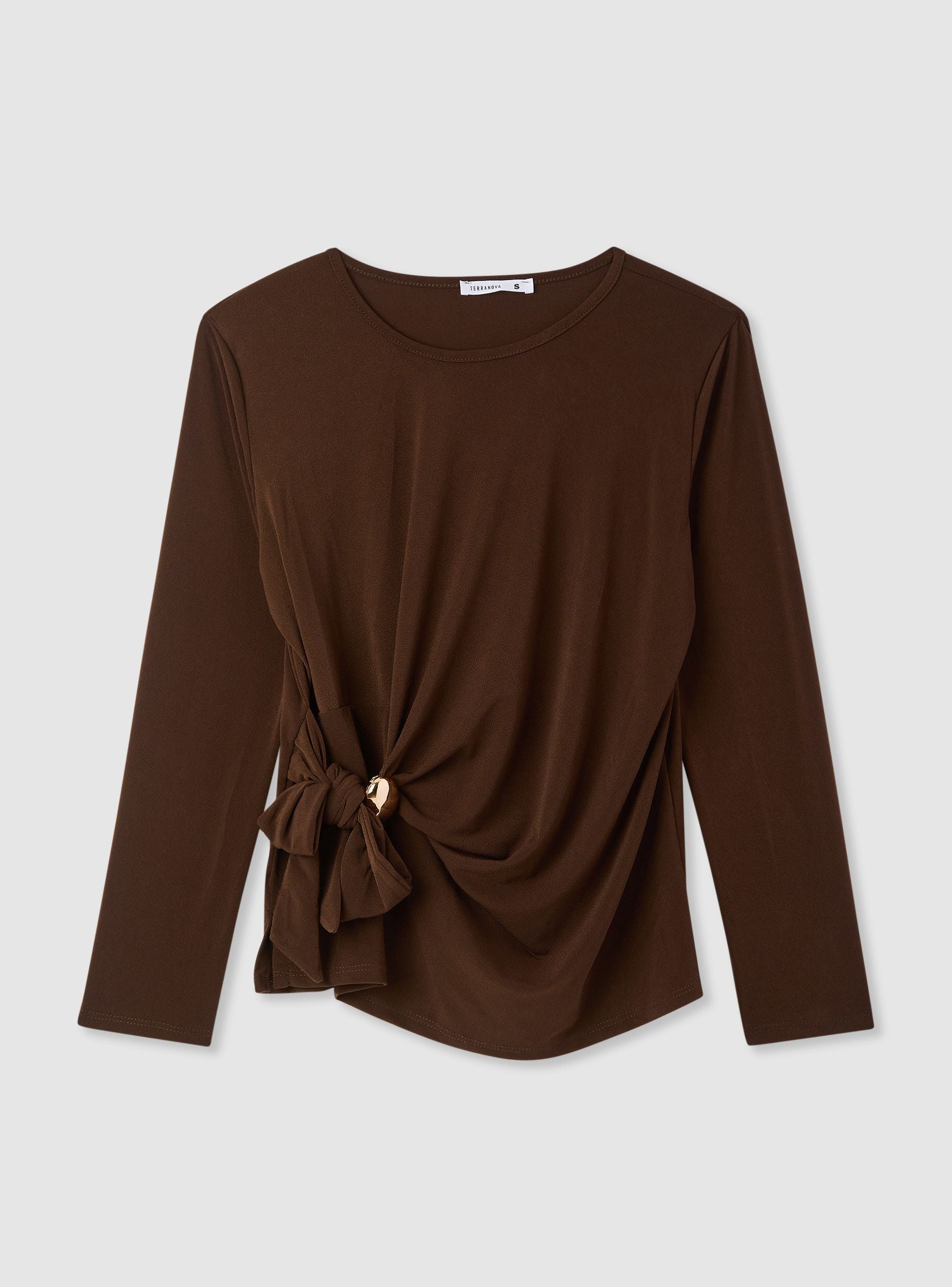 Женская футболка с длинными рукавами, круглым вырезом и боковым узлом, закреплённым металлическим элементом. Драпированный дизайн создаёт обволакивающий эффект и подчёркивает силуэт, идеально подходит для офисного образа с брюками с высокой талией или для вечера с юбкой миди. Прямой крой, ровный низ и однотонный стиль, идеально подходит для ношения под пиджак или кардиган для аккуратного образа без усилий.Детали