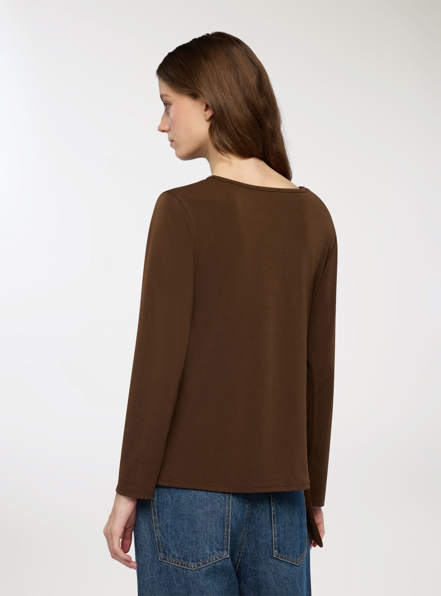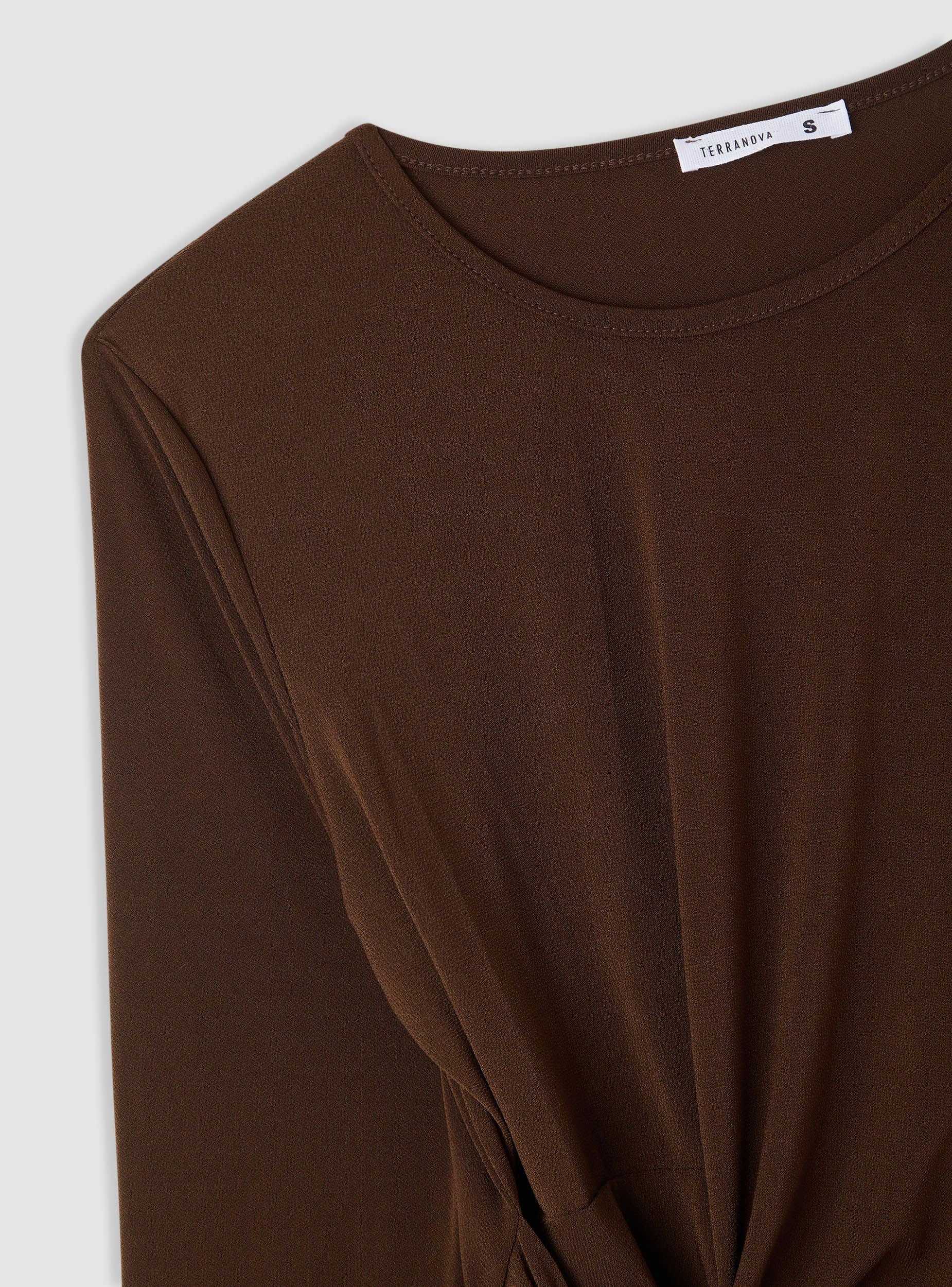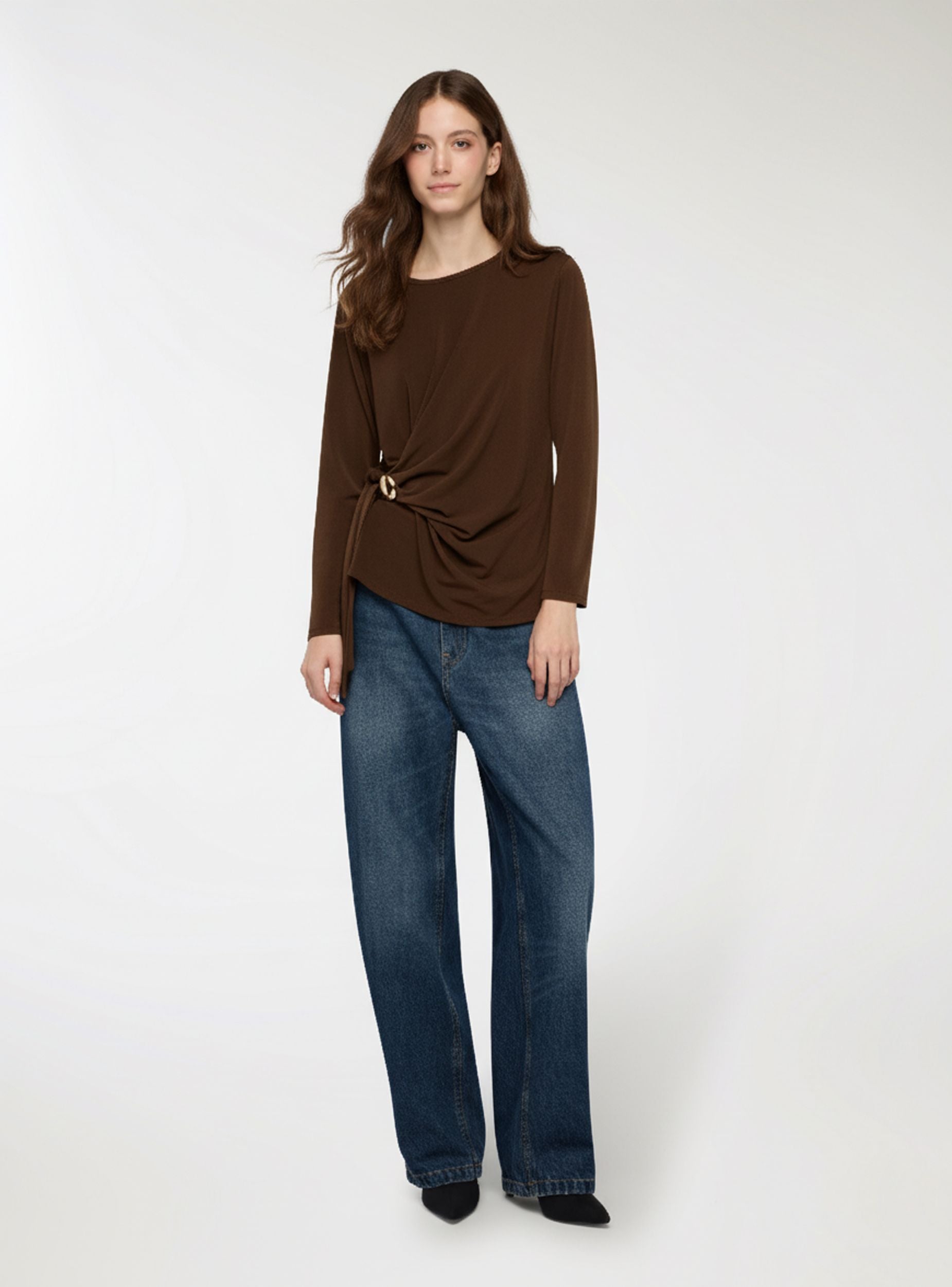 Женская футболка с длинными рукавами, круглым вырезом и боковым узлом, закреплённым металлическим элементом. Драпированный дизайн создаёт обволакивающий эффект и подчёркивает силуэт, идеально подходит для офисного образа с брюками с высокой талией или для вечера с юбкой миди. Прямой крой, ровный низ и однотонный стиль, идеально подходит для ношения под пиджак или кардиган для аккуратного образа без усилий.Детали