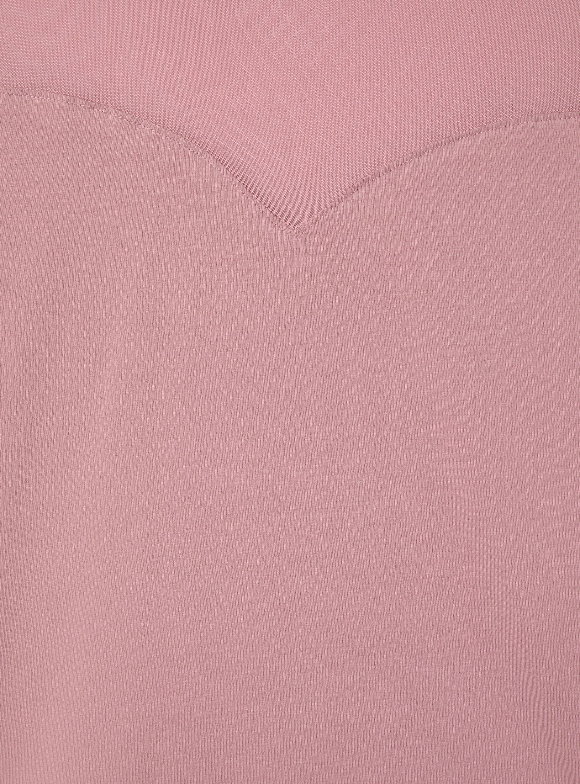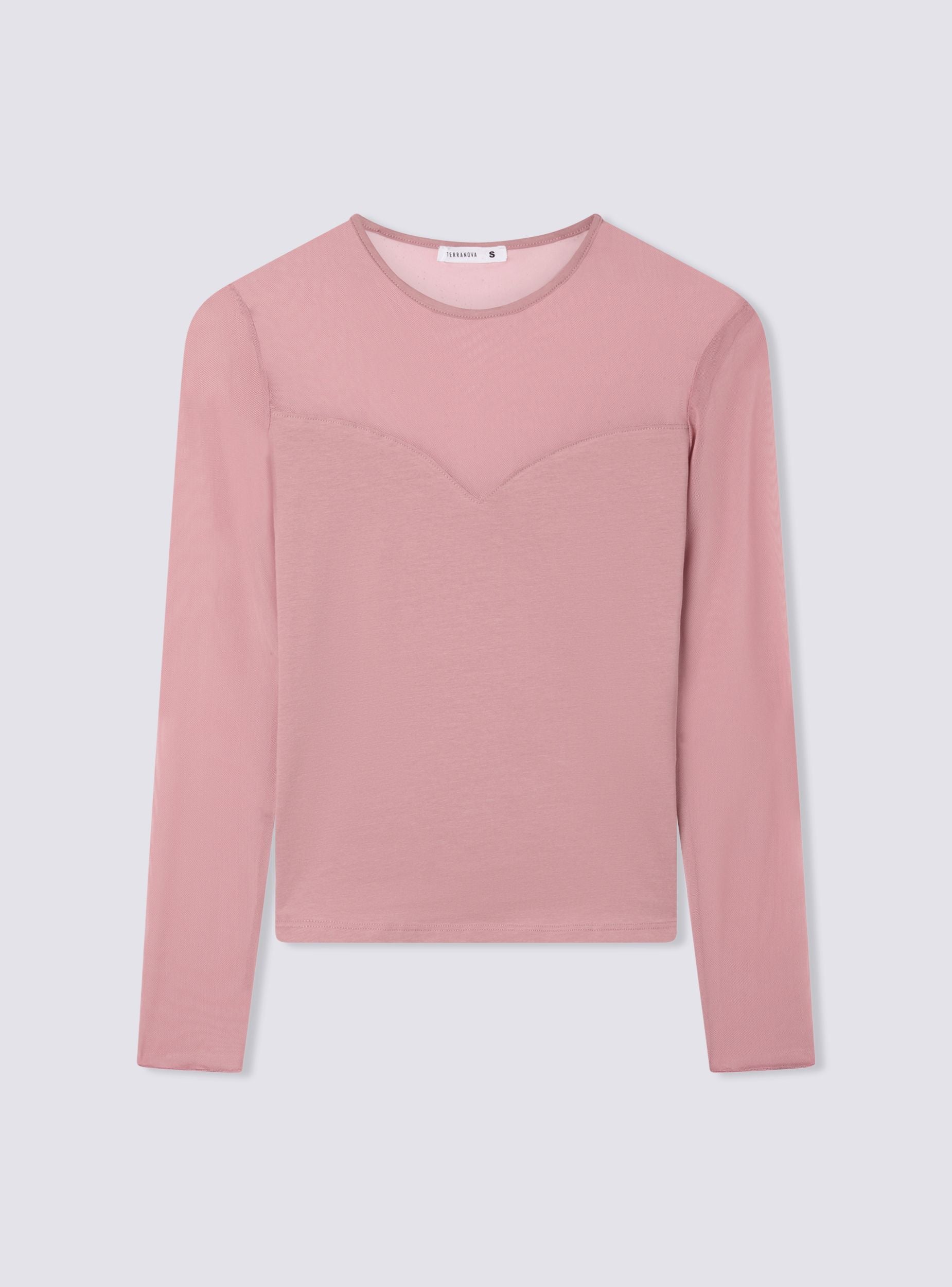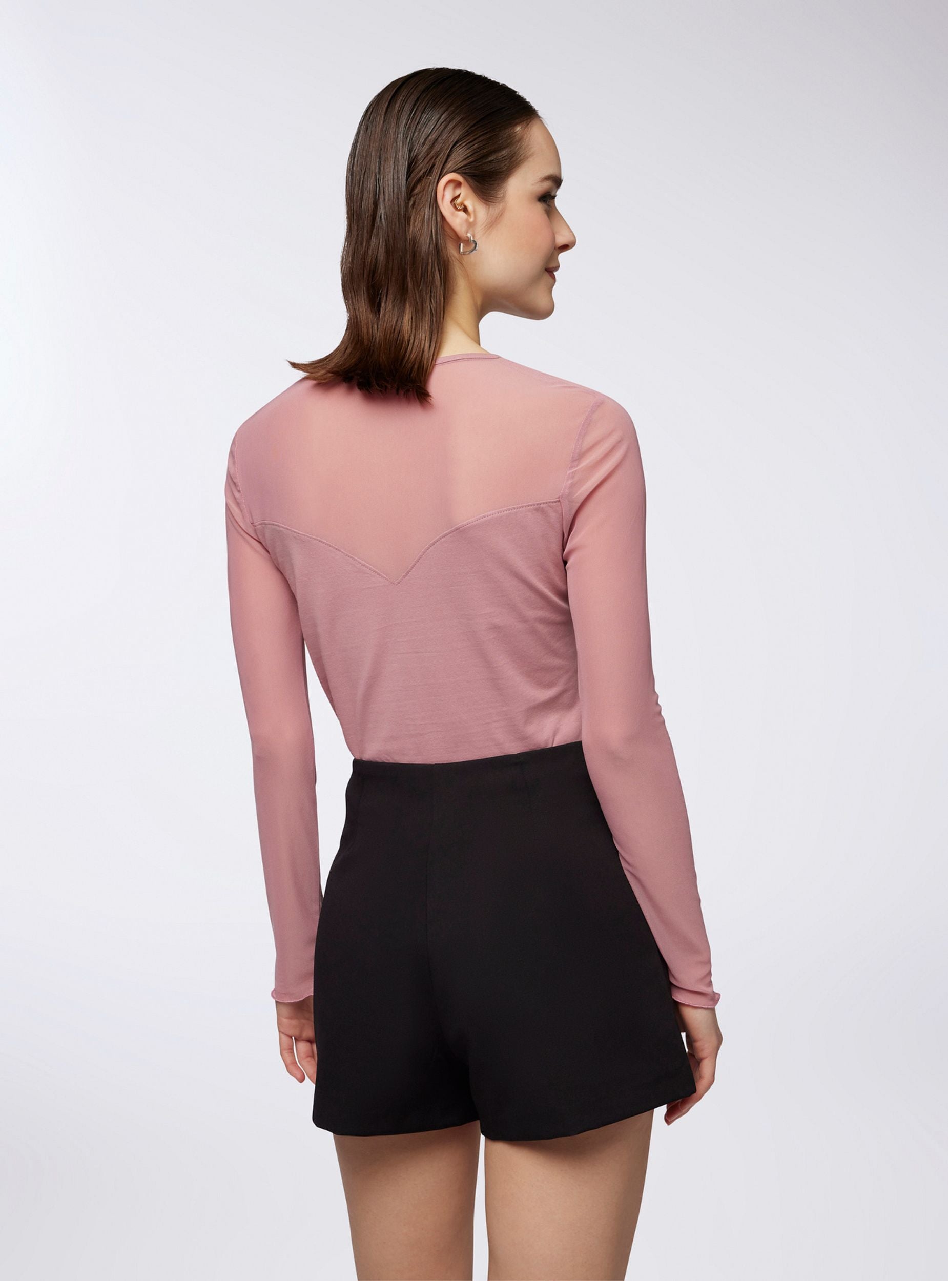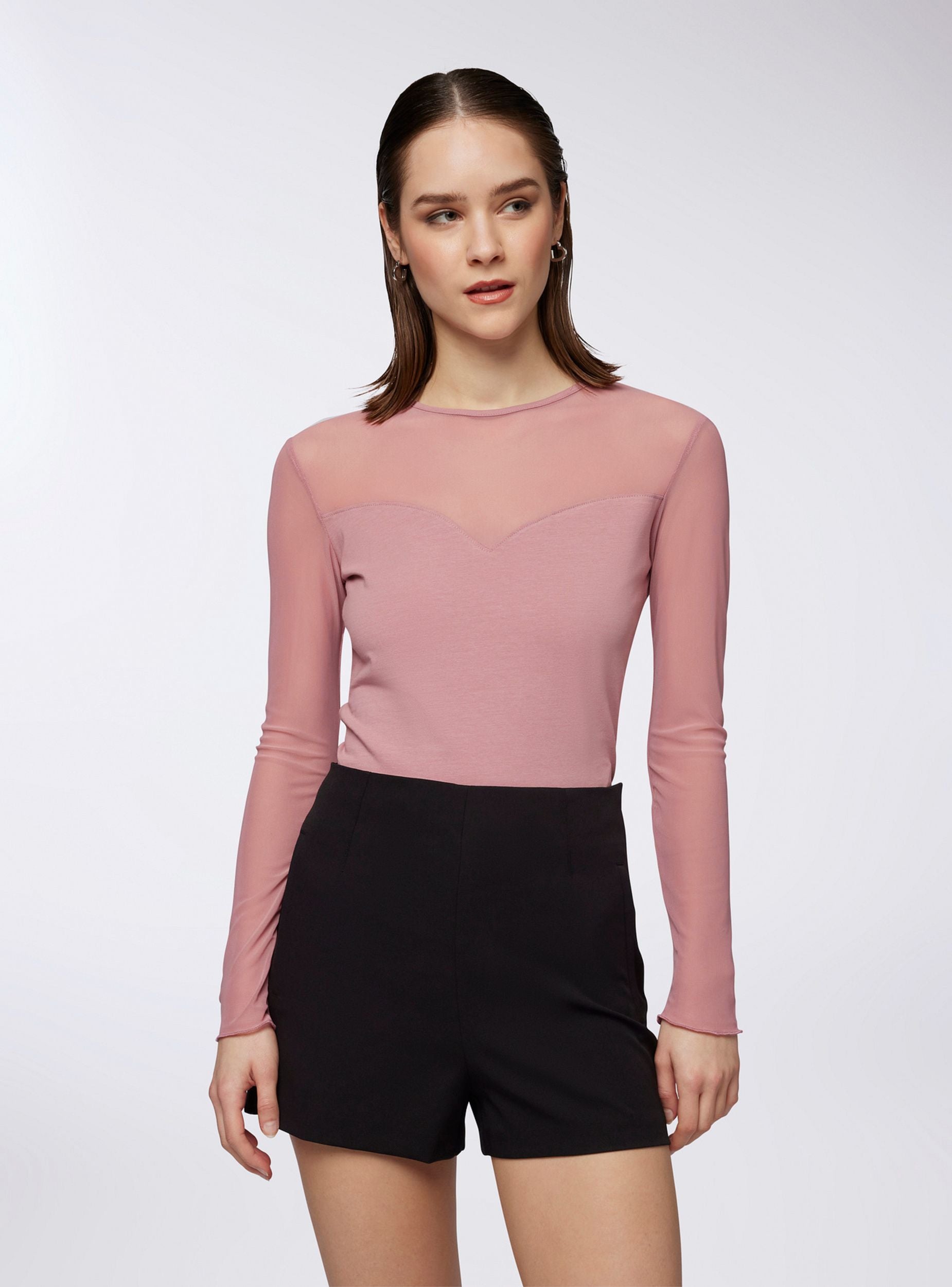 Женская однотонная футболка с круглым вырезом и длинными рукавами, украшенная изысканными вставками из тюля, которые добавляют нотку сексуальности и женственности. Идеально подходит для создания элегантных и современных образов, сочетается с узкими брюками или обтягивающими юбками для утонченного вида. Отлично подходит для особых вечеров, мероприятий или аперитивов, придавая изысканность каждому случаю.Детали