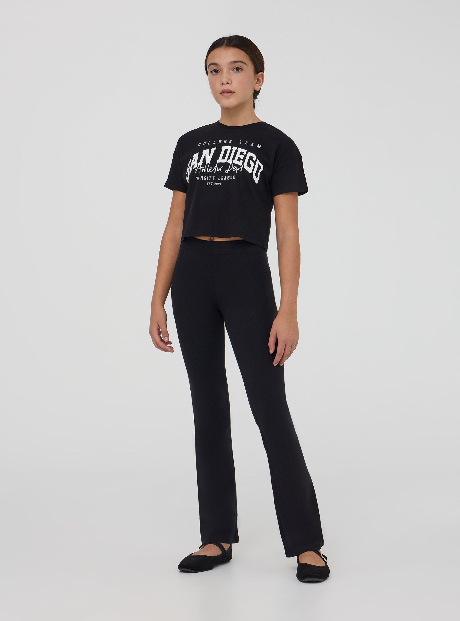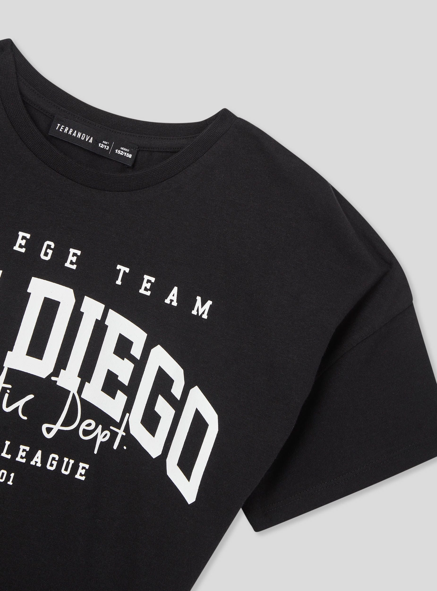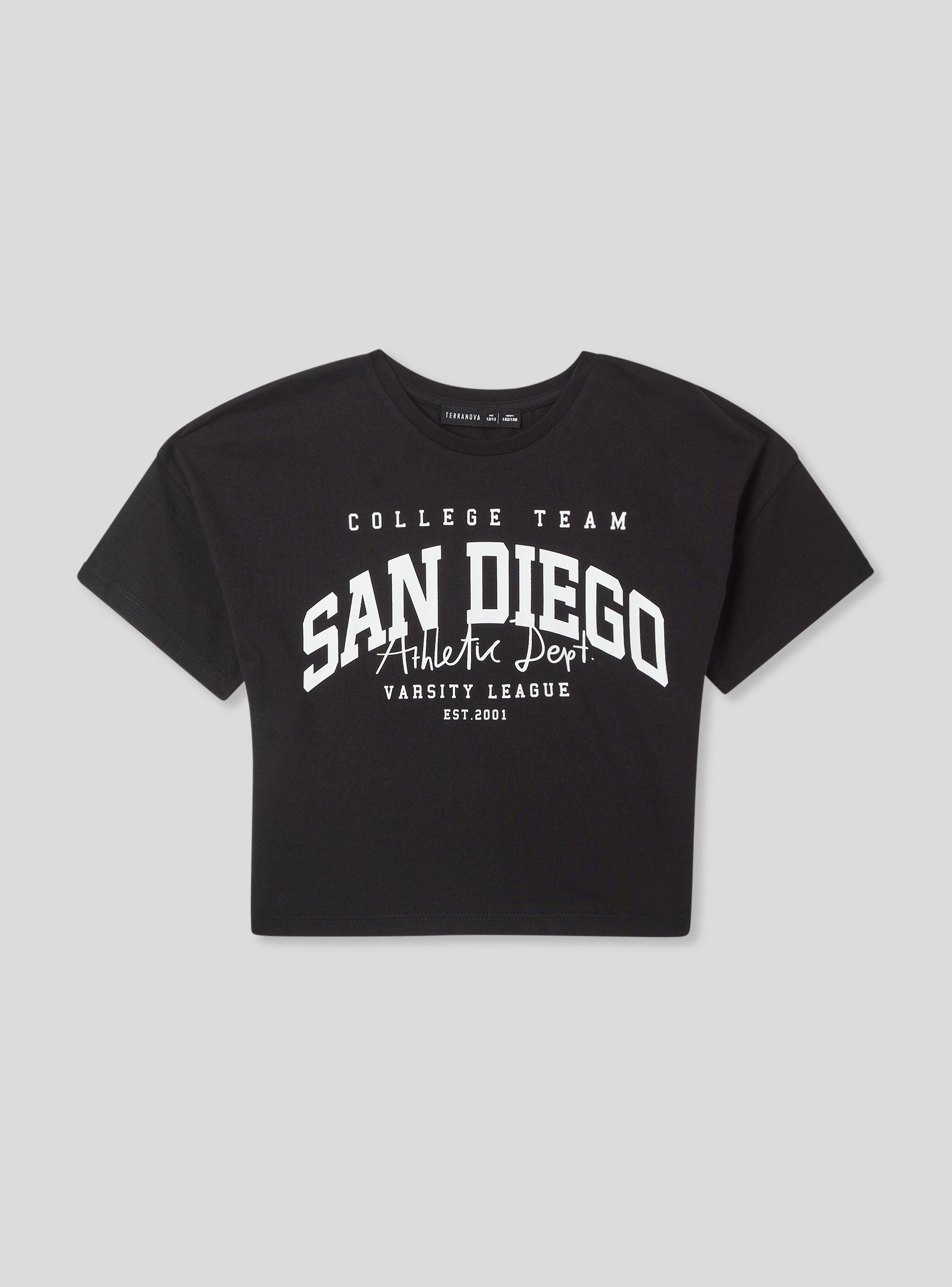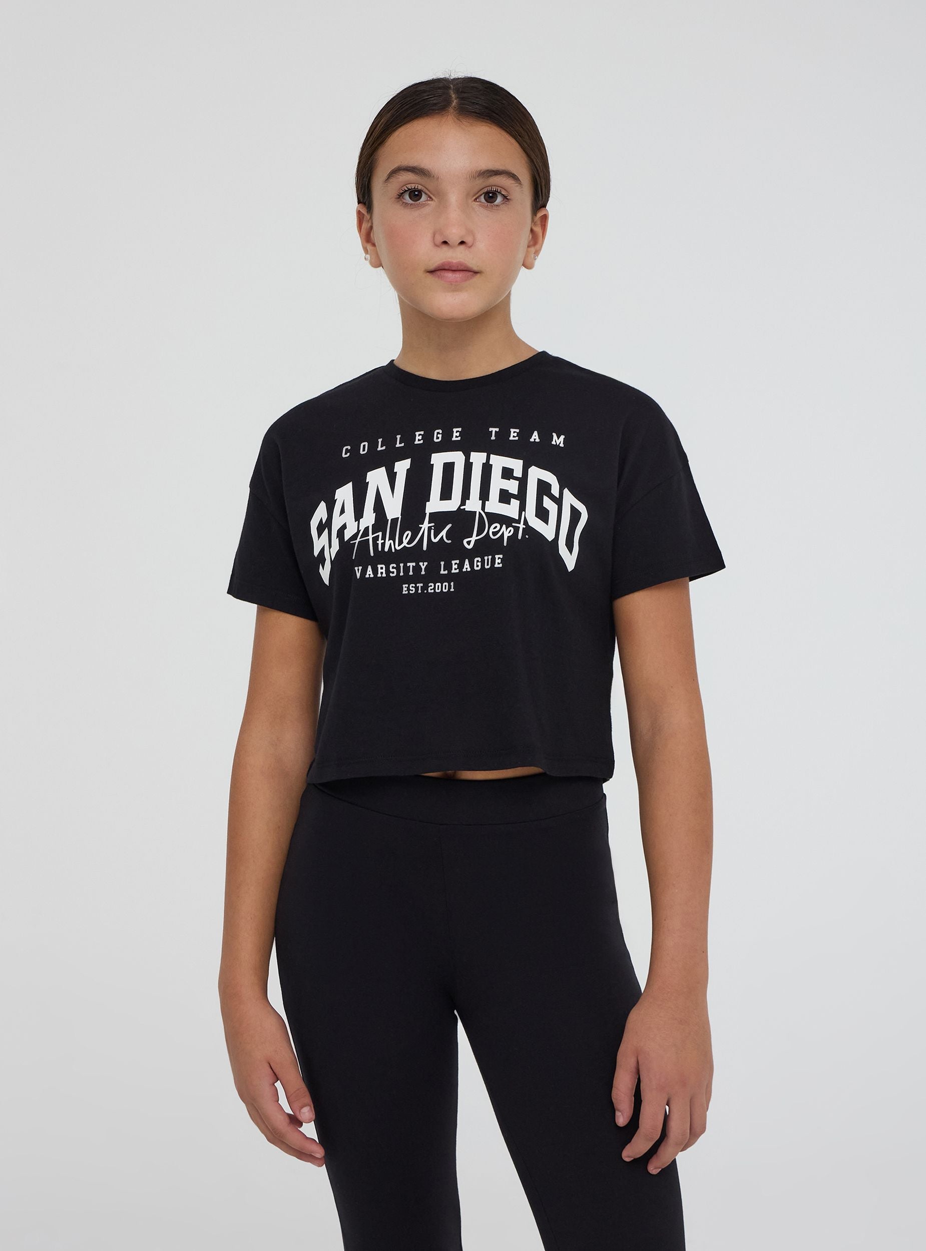 Футболка для девочек с принтом в американском колледжском стиле. Футболка имеет круглый вырез и короткие рукава, идеально подходит для весенних или летних дней. Дизайн позволяет легко сочетать её как с шортами, так и с легкими длинными брюками для повседневных или спортивных образов.Детали