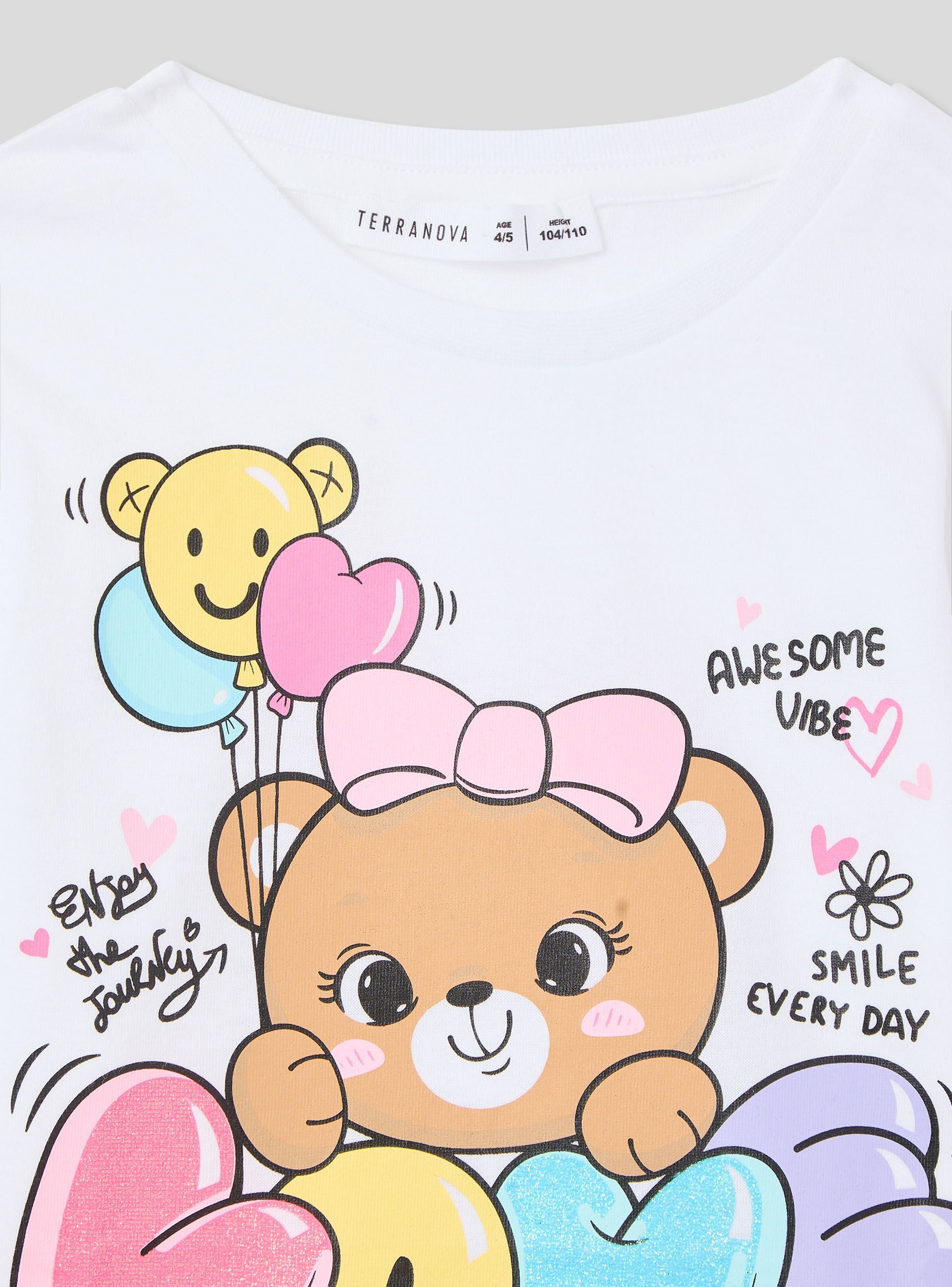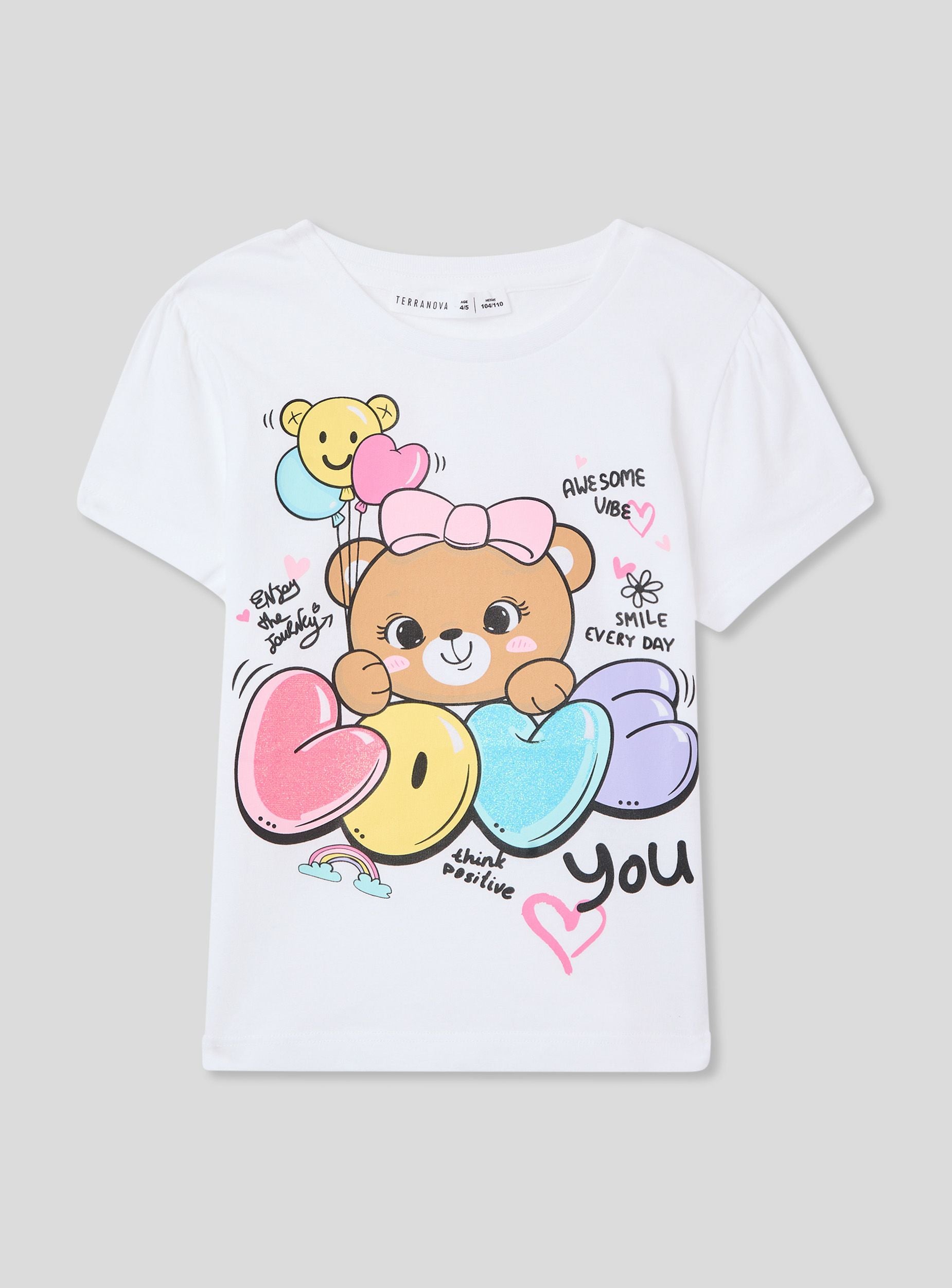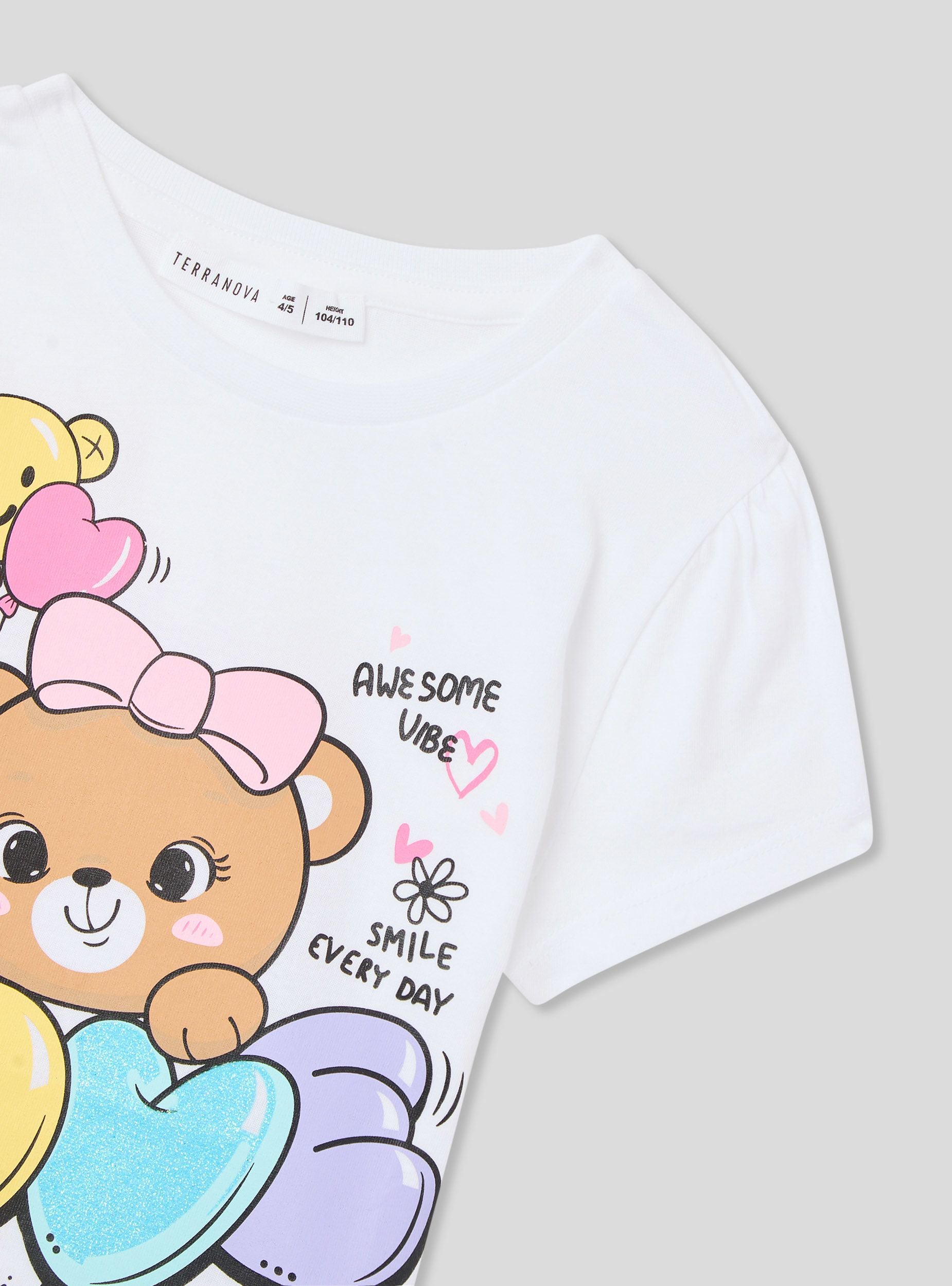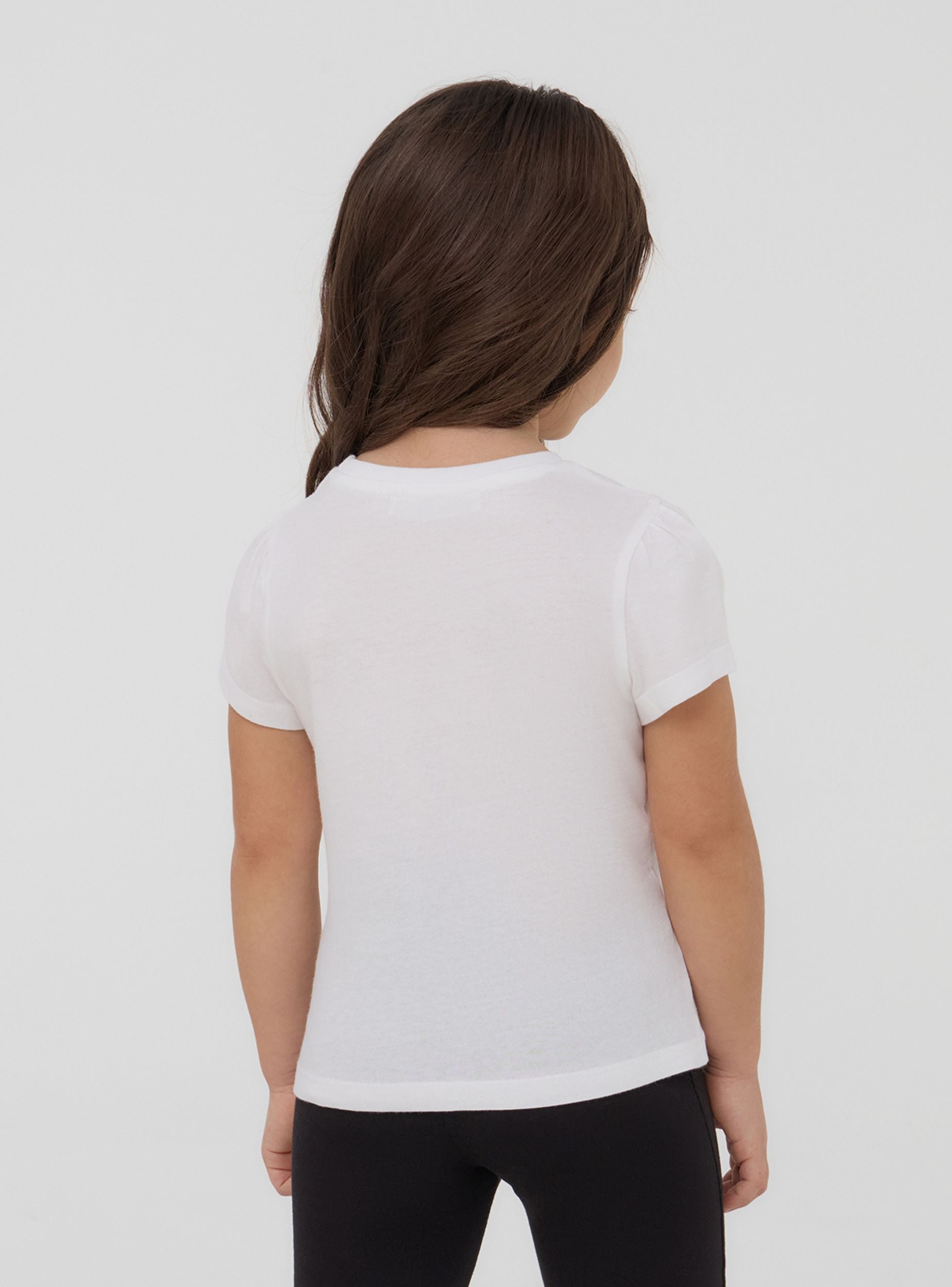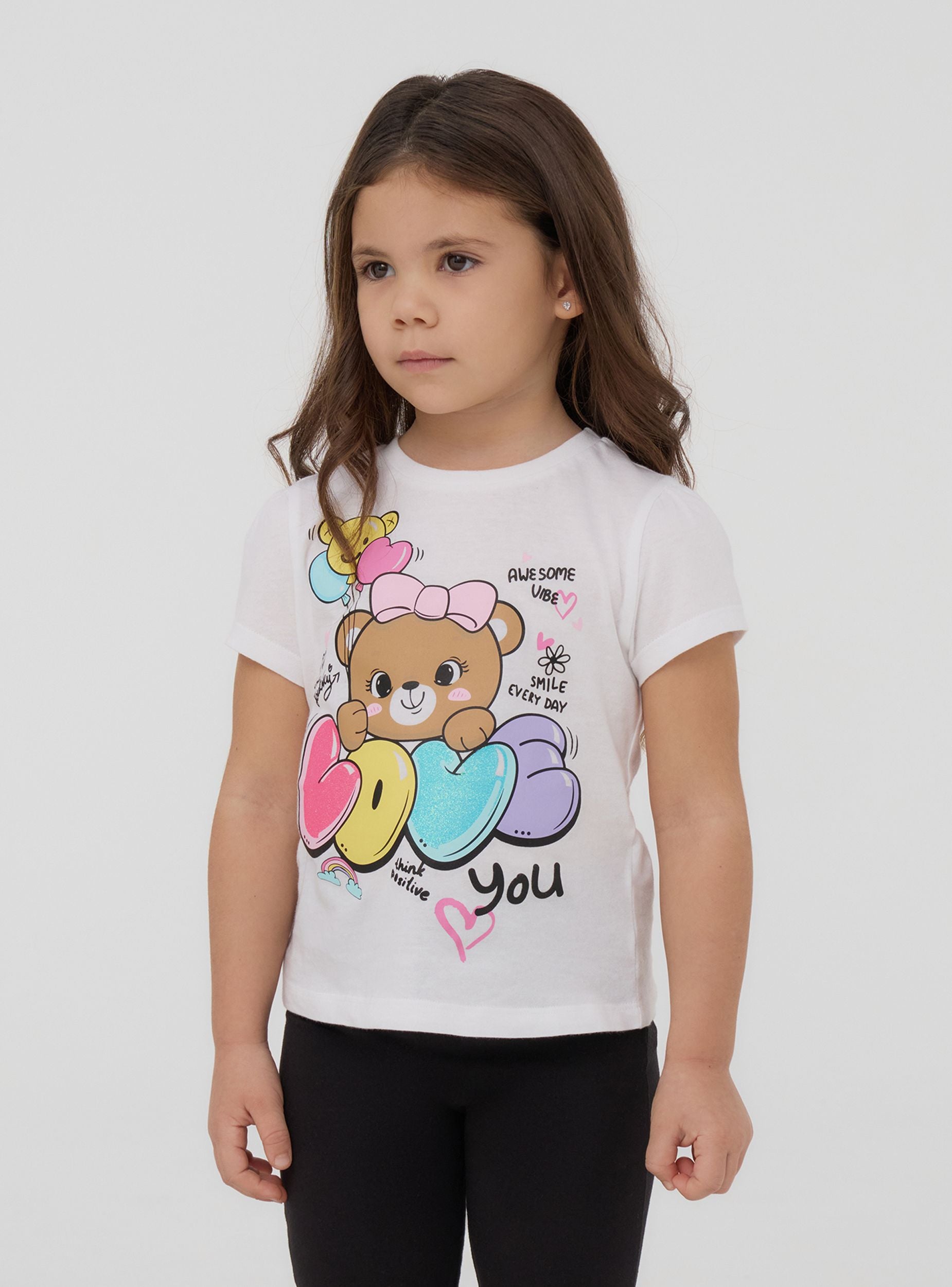 Футболка для девочки с классическим круглым вырезом и короткими рукавами, украшенная ярким центральным принтом, который придает нотку радости и оригинальности. Идеальна для повседневного и игривого образа, подходит для ношения в свободное время или для создания удобных и веселых сочетаний.Детали