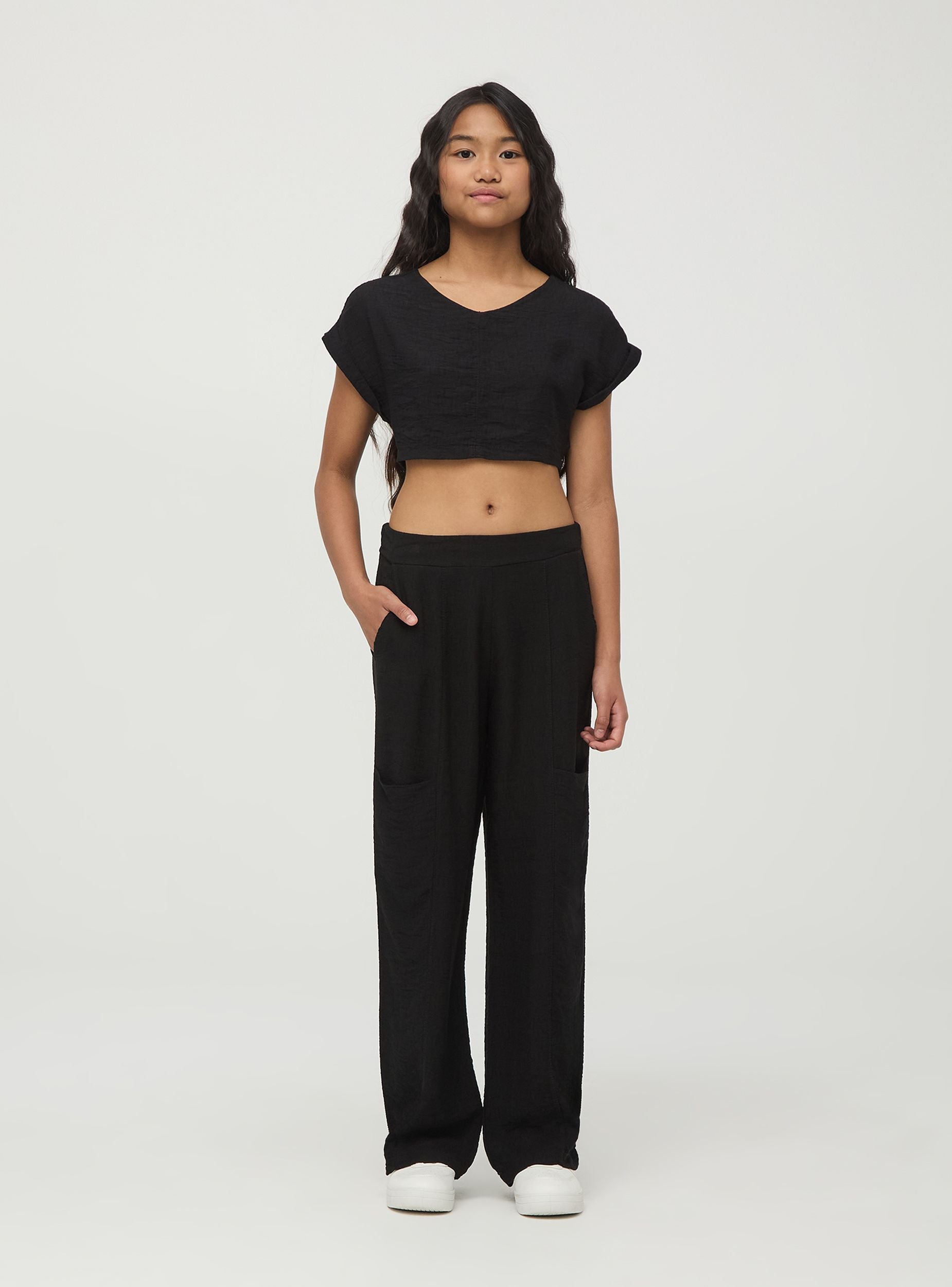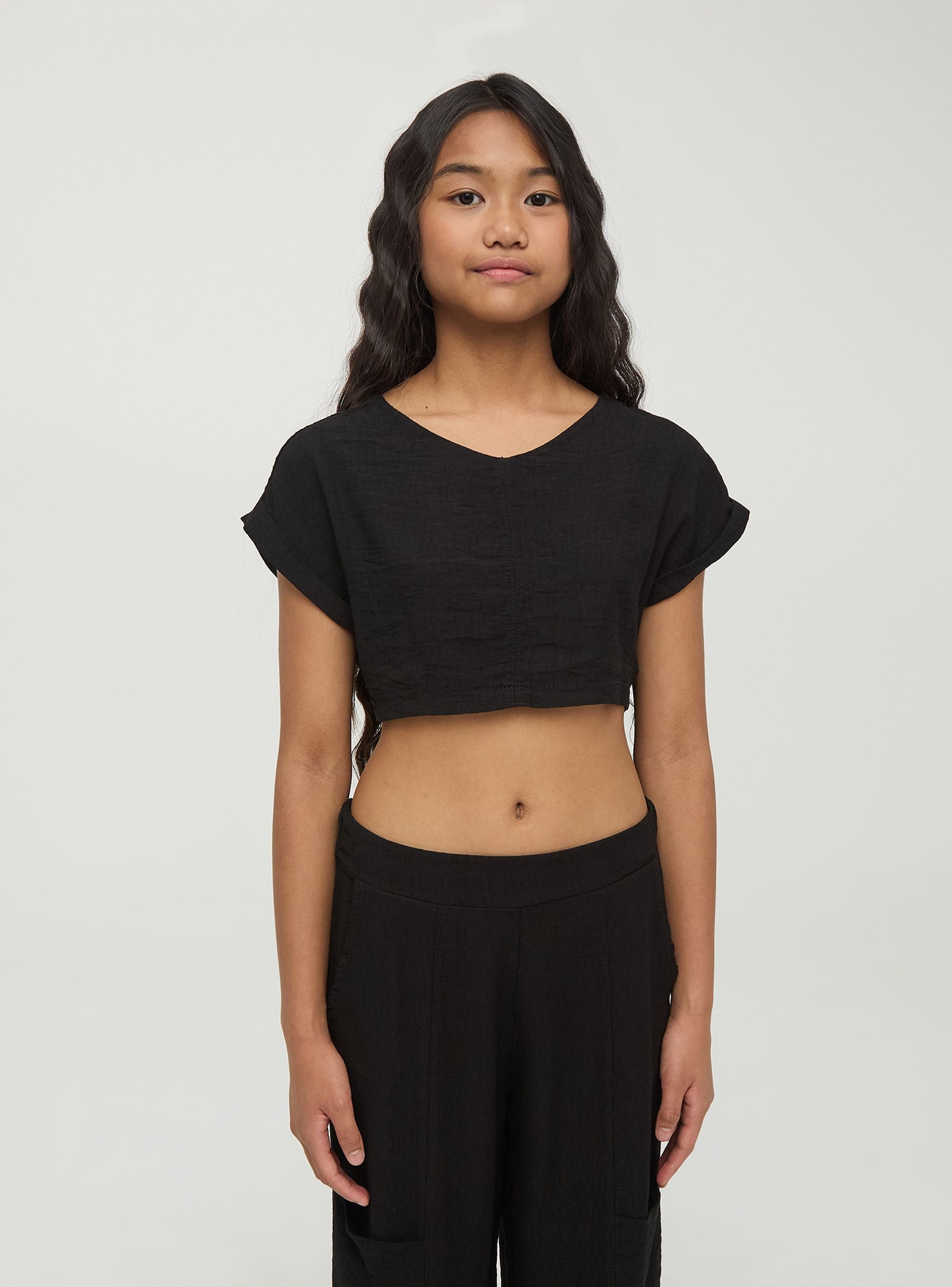 Блуза для девочки, выполненная из мягкой однотонной вискозы. Укороченный крой делает эту вещь идеальной для сочетания с юбками или брюками с высокой талией для свежего и модного образа. Вискоза - это мягкий и дышащий материал, идеальный для самых теплых дней, в то время как широкие рукава добавляют штрихи элегантности и оригинальности, позволяя девочкам свободно и стильно двигаться.