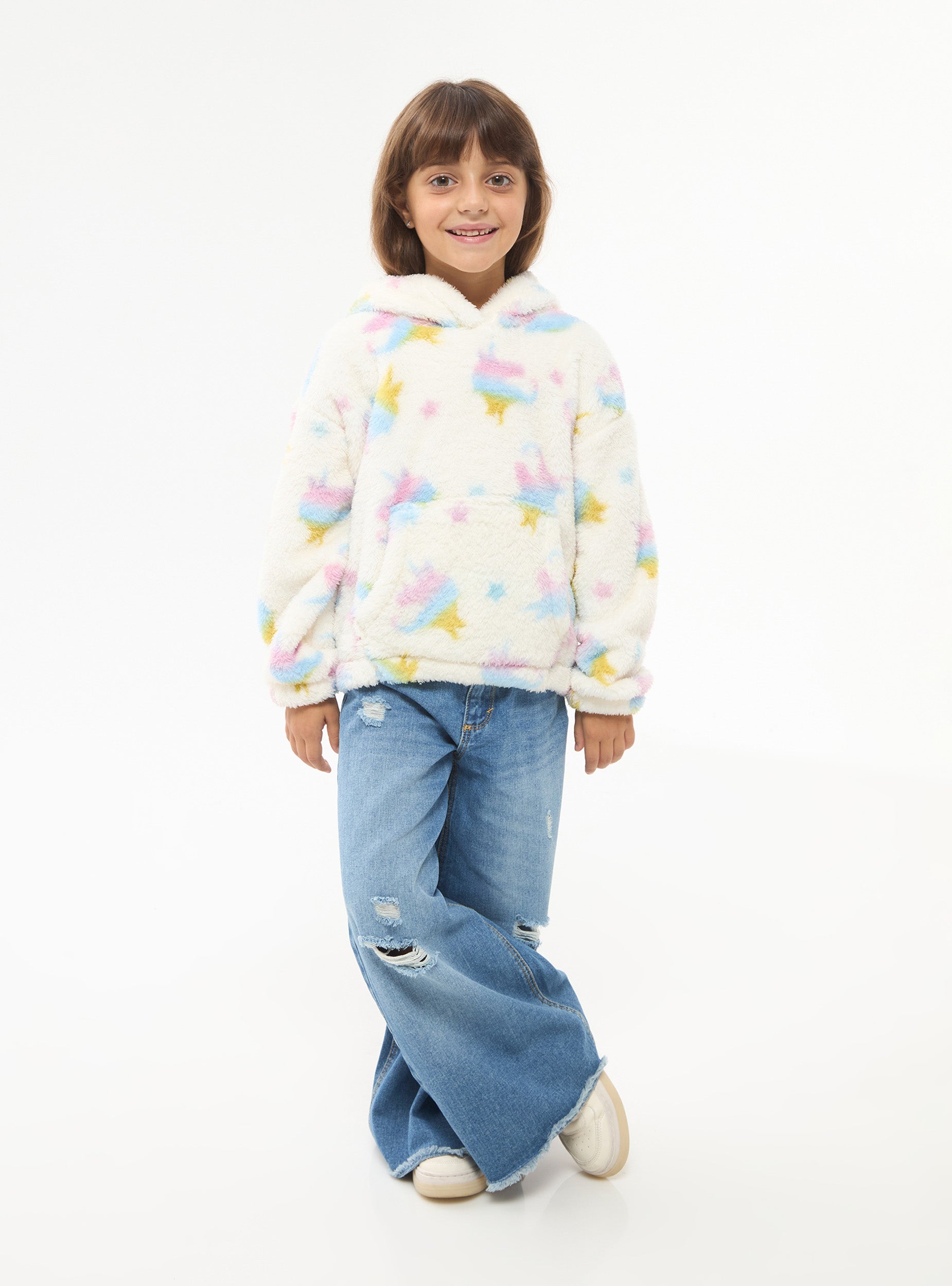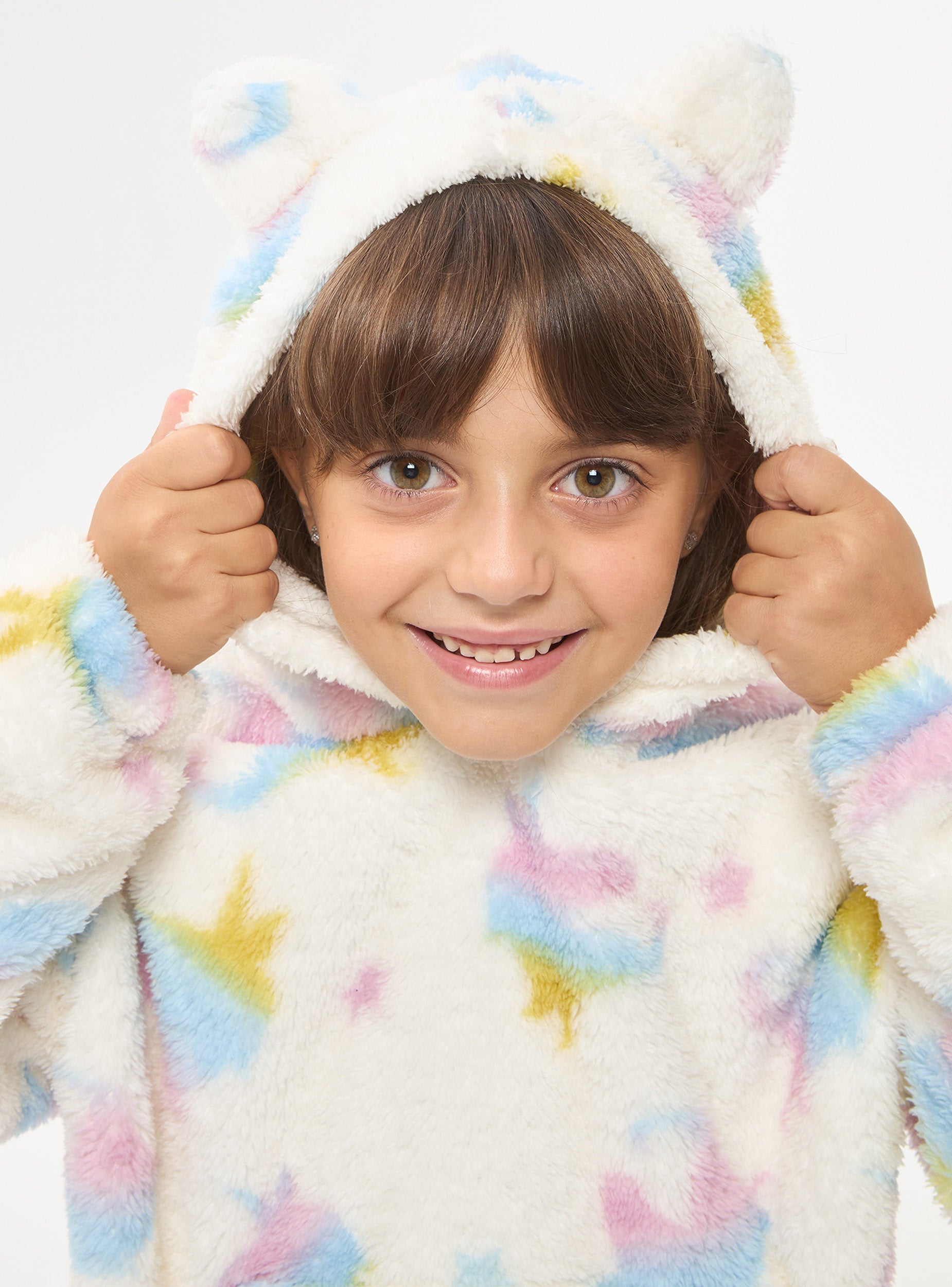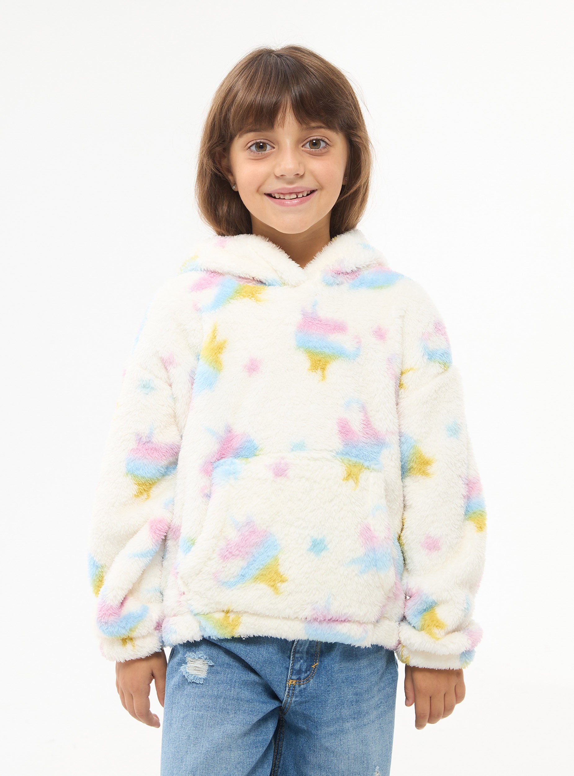Felpa da bambina in sherpa. Modello con cappuccio e stampa unicorni frontale.Детали