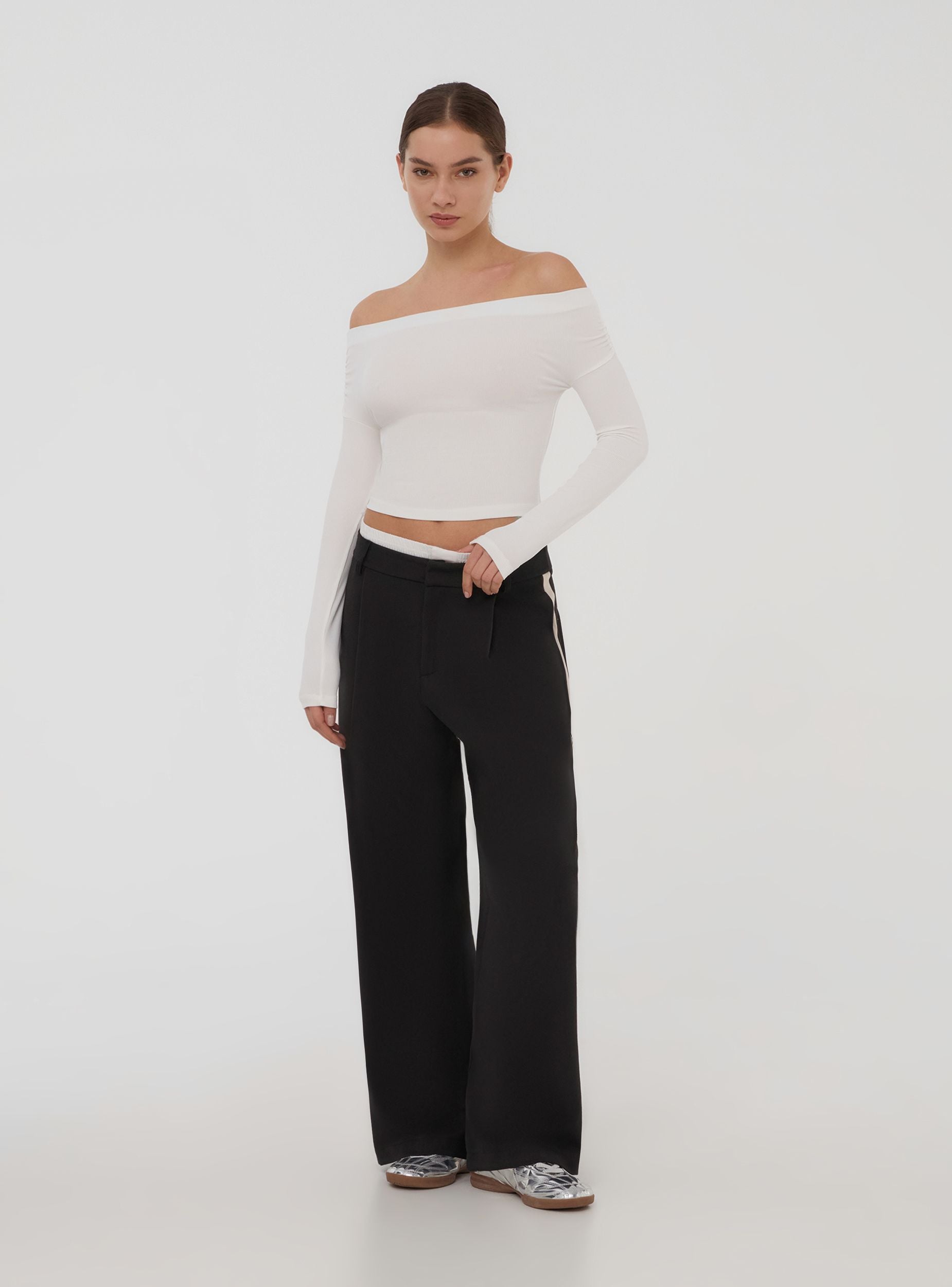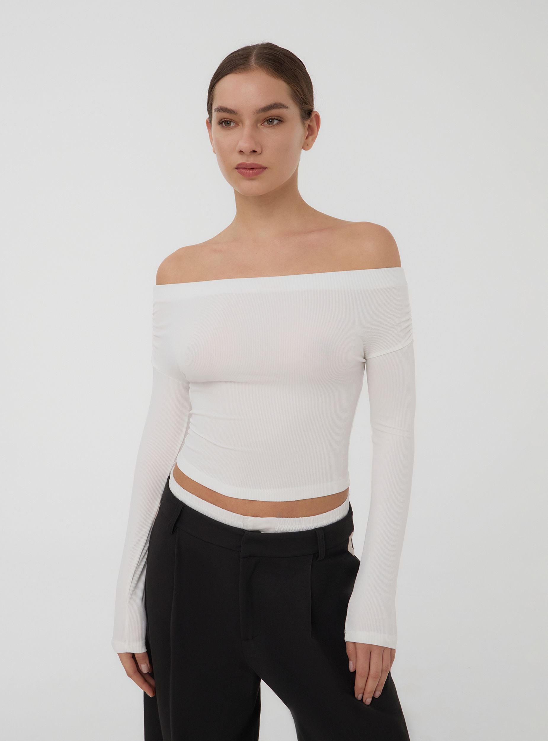 Женская футболка минималистичного дизайна однотонного цвета с широким вырезом. Легкие сборки на плечах добавляют нотку женственности и движения, делая эту вещь идеальной для тех, кто ищет простой, но изысканный образ. Длинные рукава и облегающий силуэт делают её отличным выбором как для ношения отдельно, так и под жакетом. Эта футболка предназначена для завершения любого наряда с сдержанной элегантностью, идеально подходящей как для особого вечера, так и для утонченного повседневного стиля.Детали