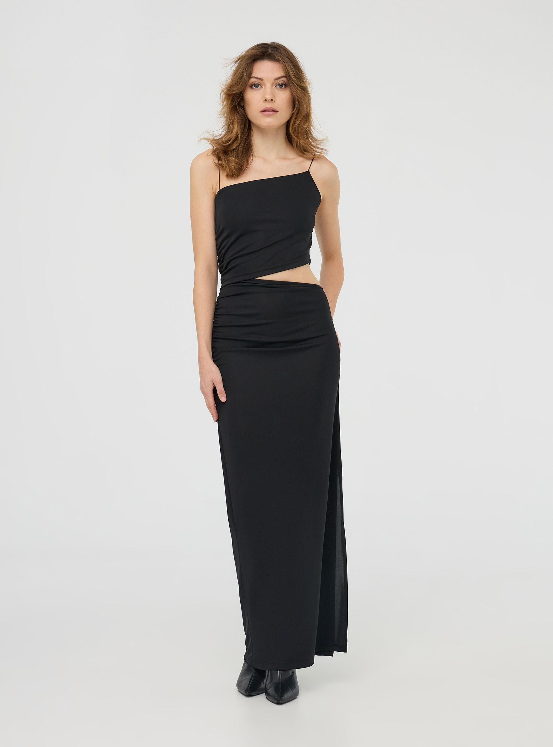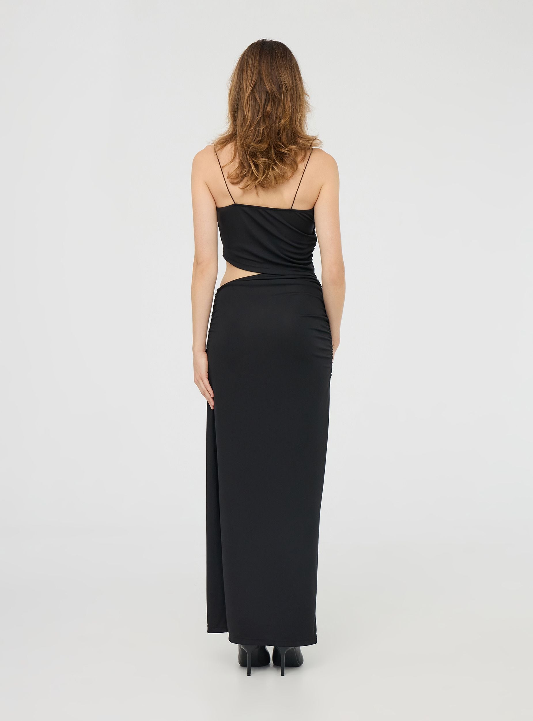 Dlhé a sofistikované dámske šaty, charakterizované jednofarebným prevedením, ktoré zvýrazňuje ich minimalistickú eleganciu. S tenkými ramienkami, ktoré pridávajú jemnosť a ženský nádych, tento kúsok obsahuje odvážny detail s výrezom, ktorý zvýrazňuje siluetu a pridáva nádych sensuality. Bočný rozparok dodáva pohyb a glamour, čo ich robí ideálnymi na špeciálne večery a príležitosti, kedy sa chcete odlíšiť so štýlom. Dokonalé pre tých, ktorí hľadajú moderný a rafinovaný vzhľad s esenciálnym dizajnom a pútavými detailmi.Detaily