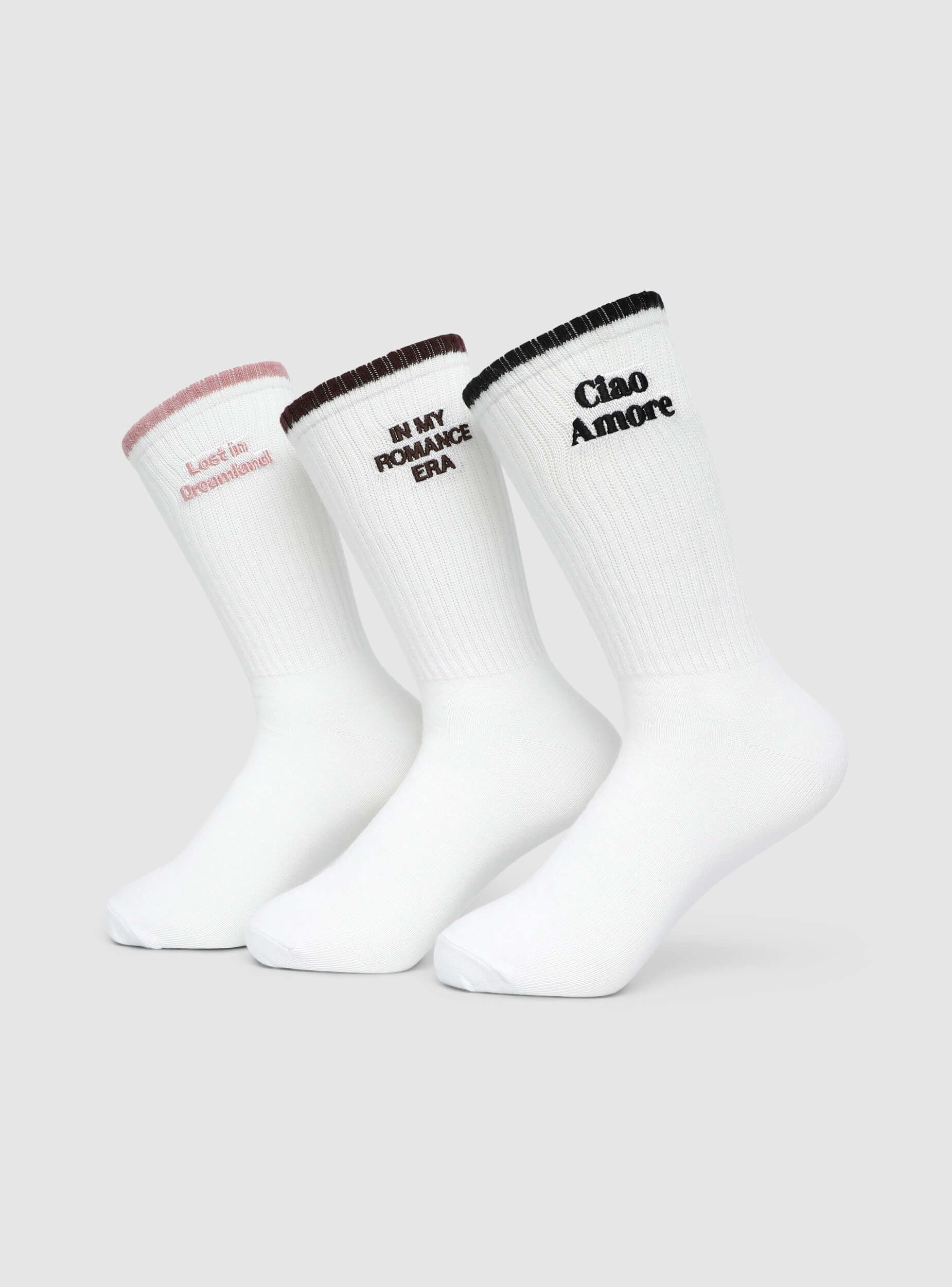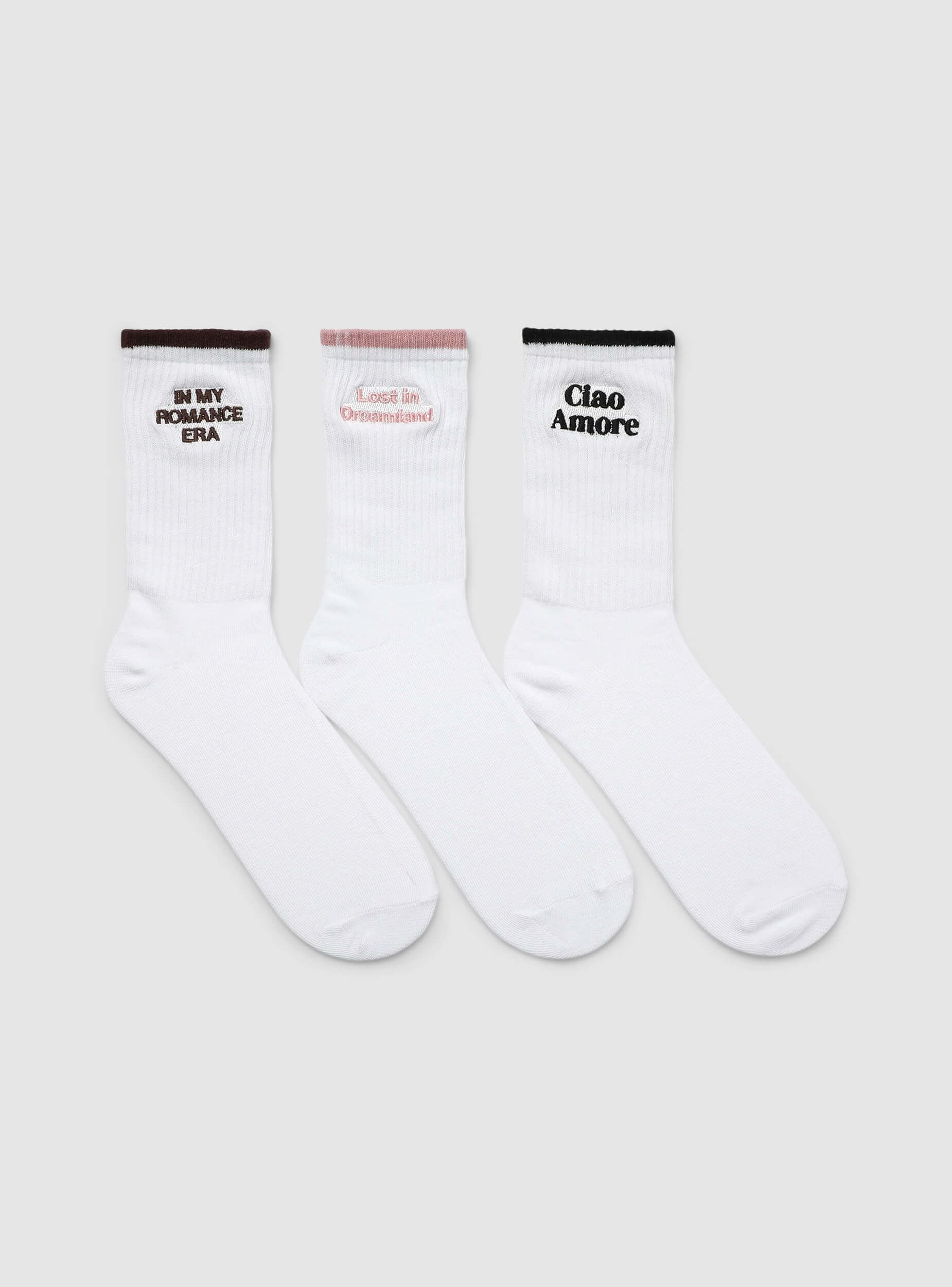 Balenie pozostávajúce z 3 párov dámskych ponožiek, ideálnych na pridanie dotyku osobnosti k každodenným outfitom. Každý s rôznymi nápismi a rebrovaným dizajnom, perfektné na kombinovanie so sneakers alebo nízkymi topánkami. Regulárne strih. Ideálne na voľný čas a pre casual outfity.
