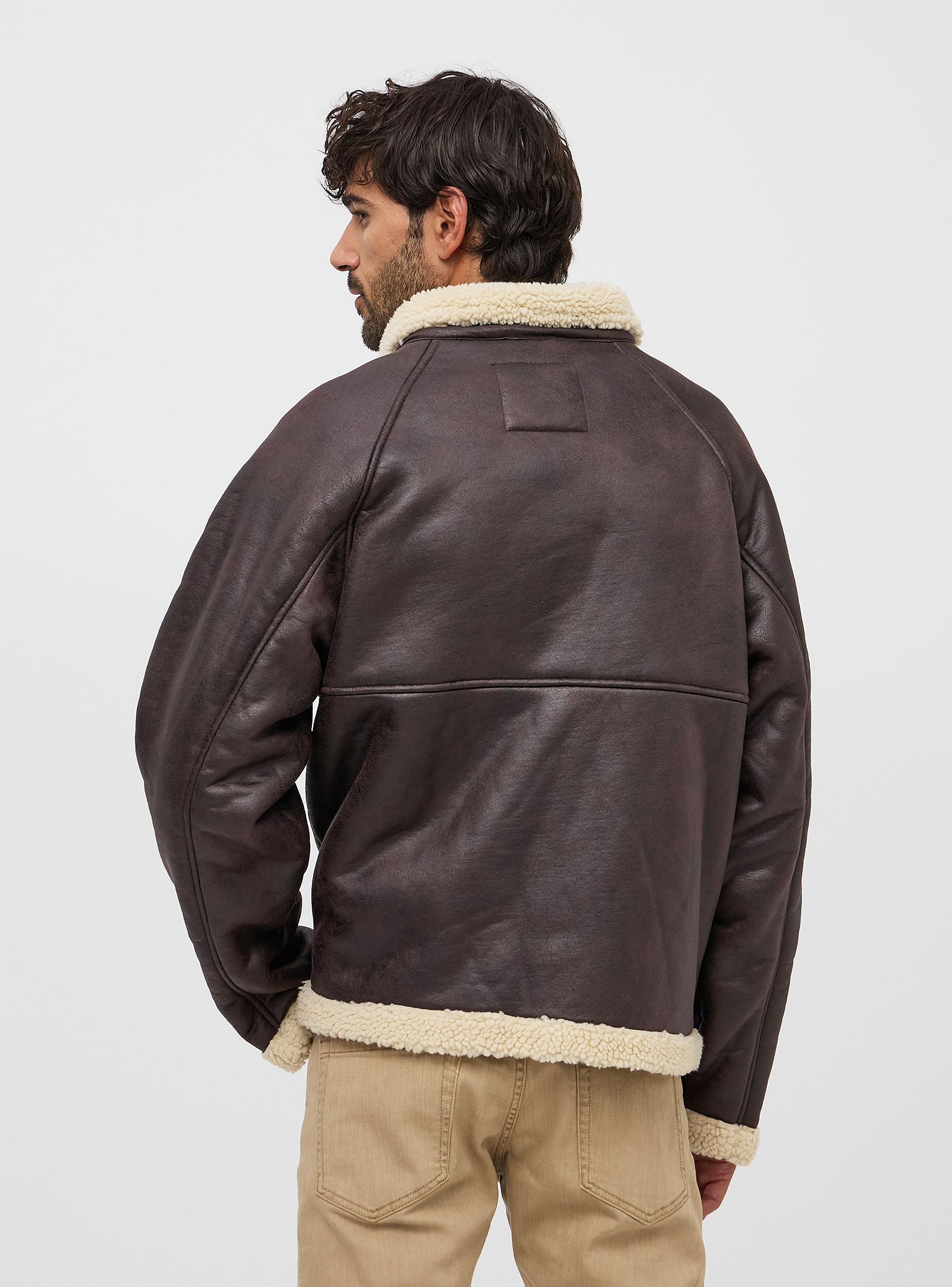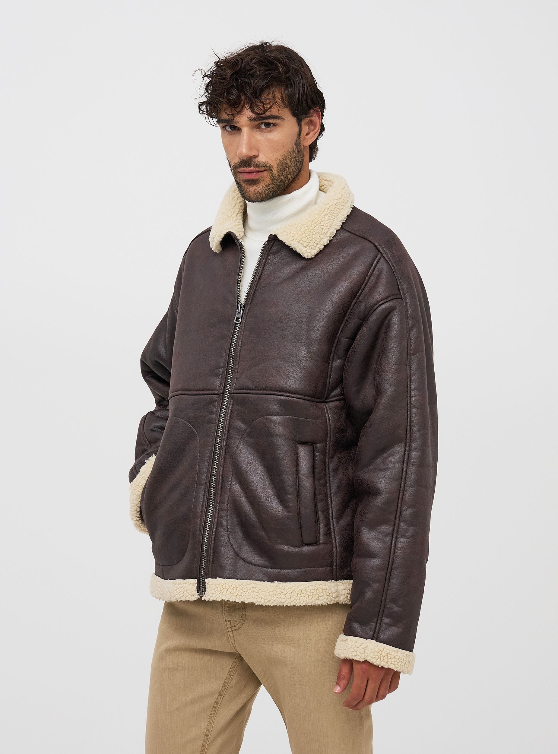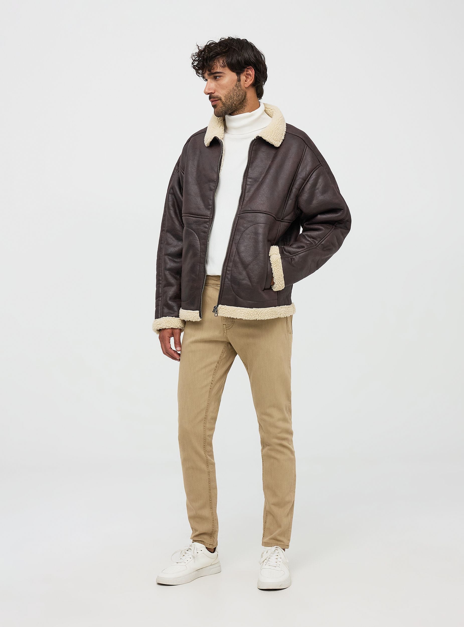Táto hnedá pánska bunda s normálnym strihom je perfektná na chladné dni. Vybavená predným zipsom a teplým béžovým kožúškom, ponúka štýl a pohodlie. Švy sú dobre definované a bočné vrecká pridávajú praktickosť. Ideálna na každodenný casual vzhľad alebo na večerný výlet, zaručuje dotyk elegancie bez obetovania funkčnosti.Detaily