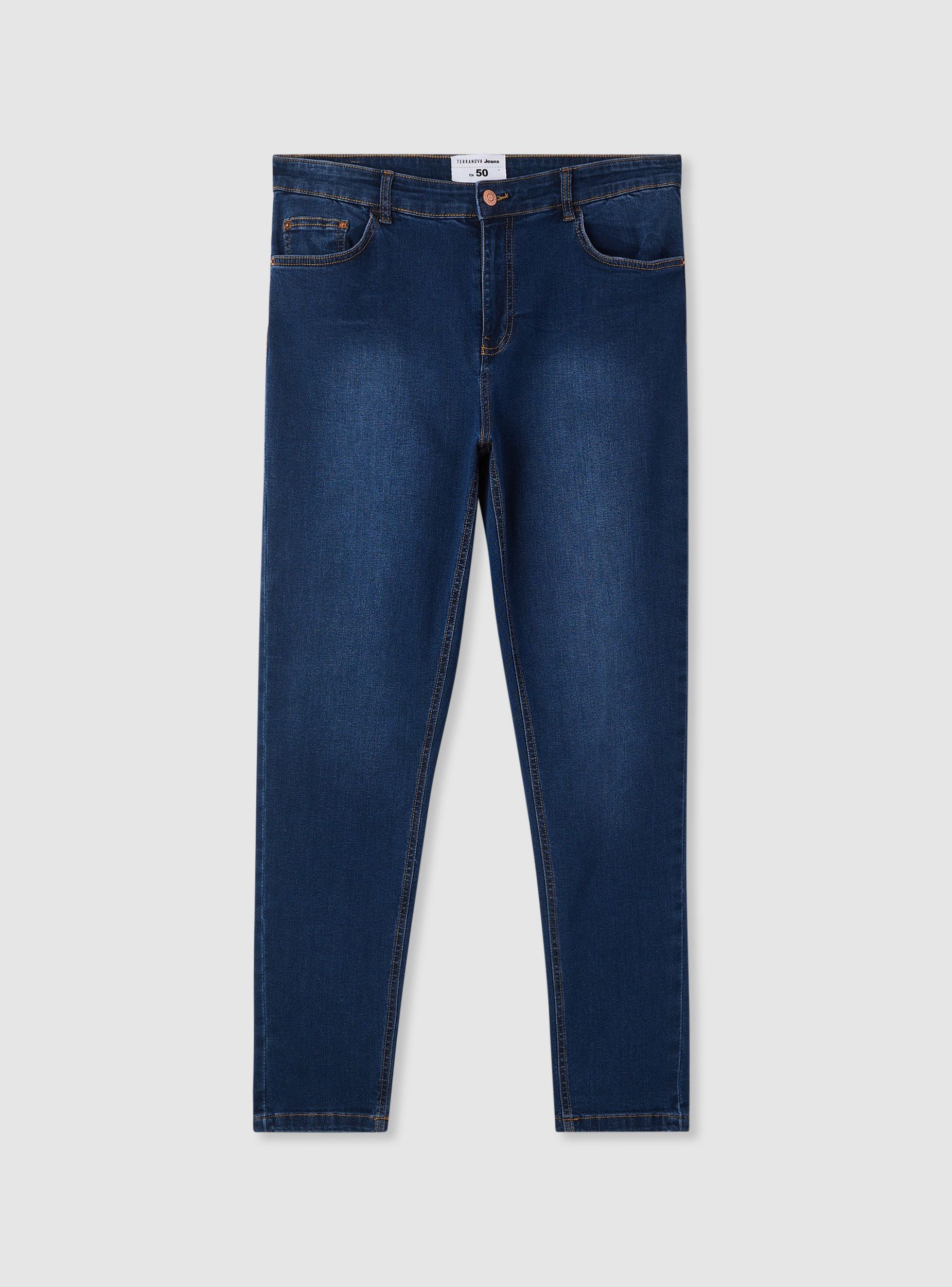 Dámske džínsy v jednofarebnom prevedení so skinny strihom a tmavomodrým denimovým praním. Model s piatimi vreckami, predné vrecká s cvokmi a našité zadné vrecká, púzdra na opasok v páse a predné zapínanie na gombík a zips. Všestranné na voľný čas alebo do kancelárie s blejzrom a členkovými čižmami, ľahko sa kombinujú aj s tričkom a teniskami pre každodenný vzhľad. Dĺžka po členky a kontrastné švy zvýrazňujú líniu.Detaily