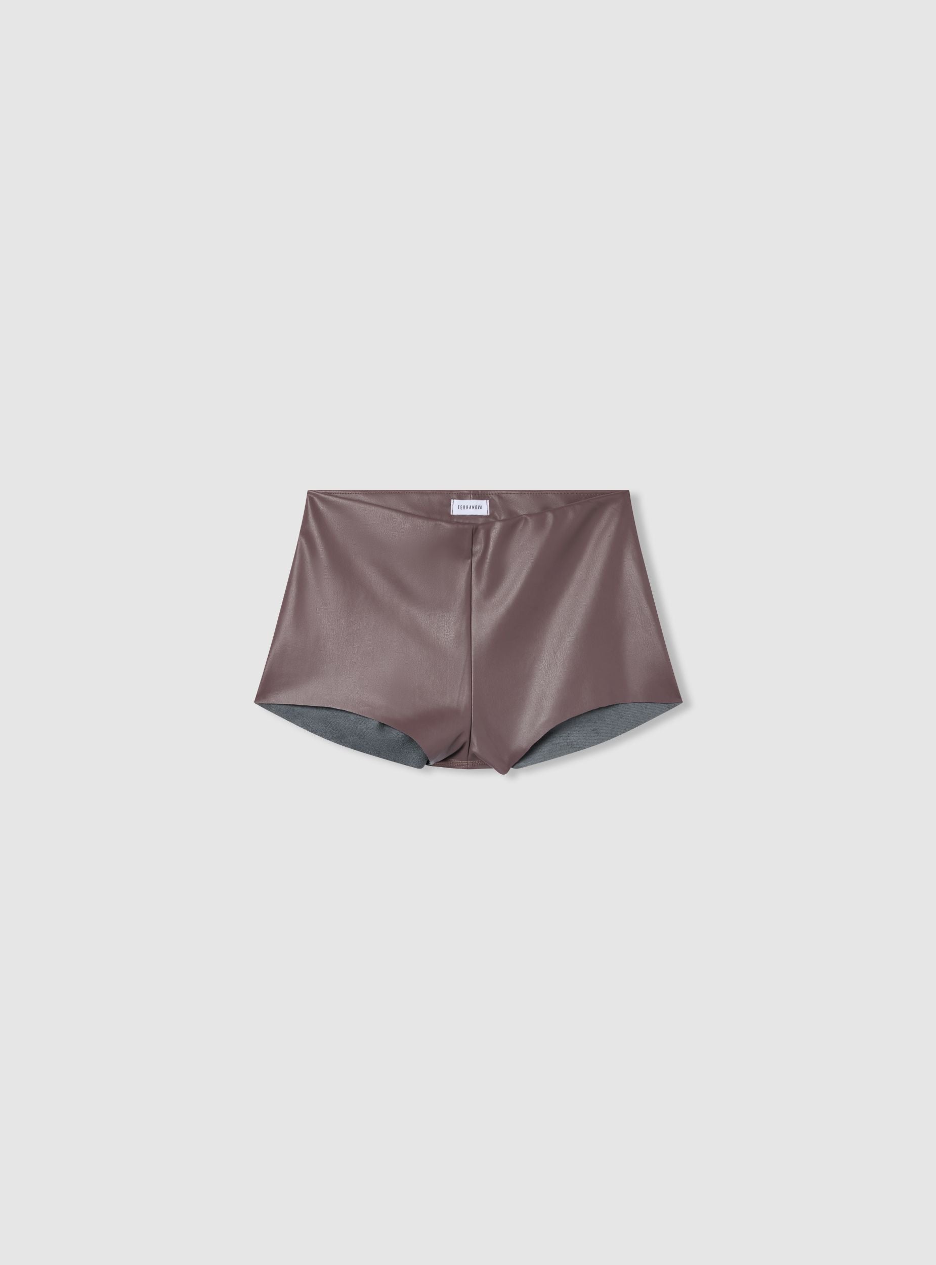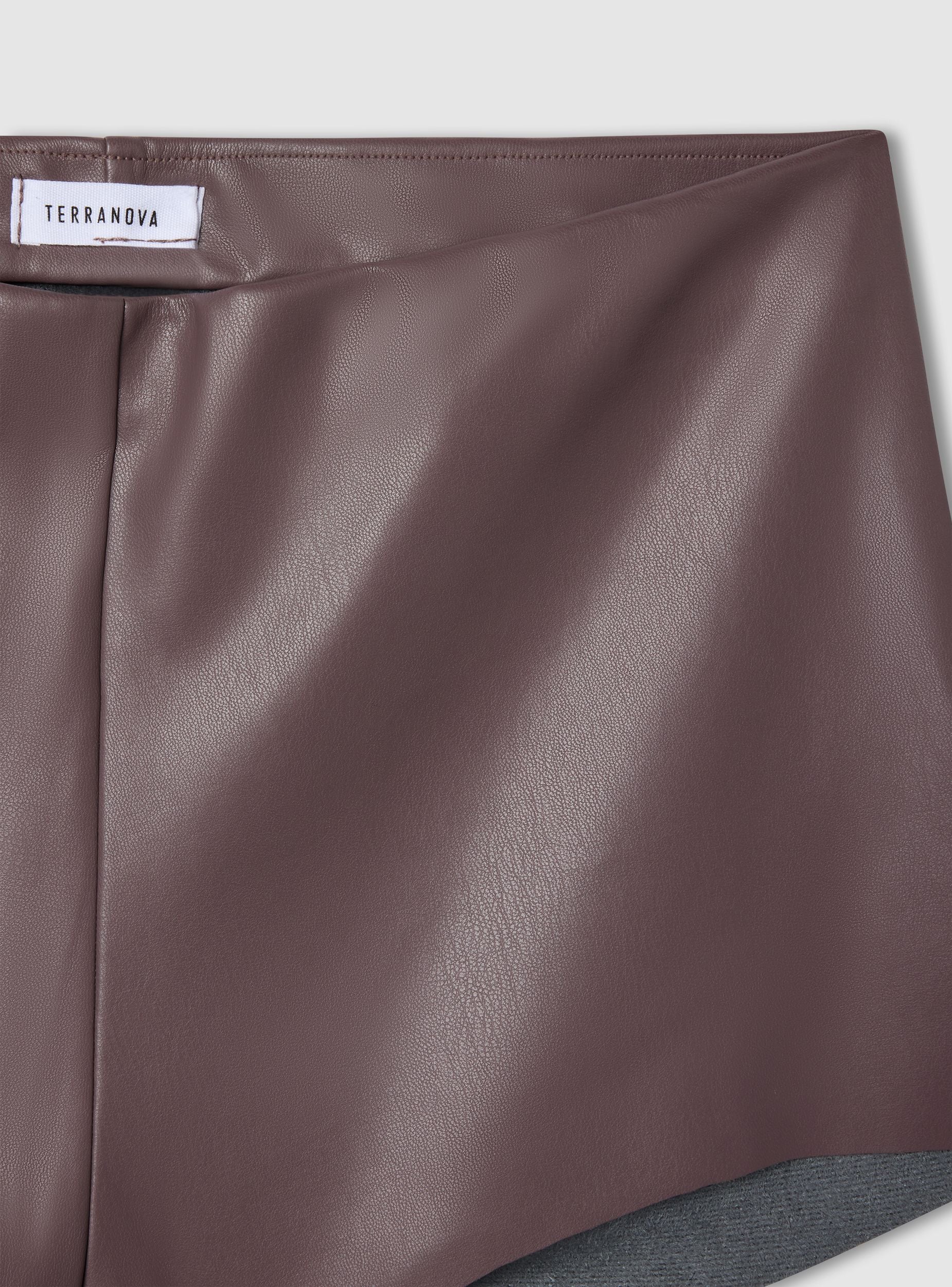 Dámske culotte z imitácie kože, ideálne pre odvážne a moderné vzhľady. Minimalistický a priliehavý dizajn zvýrazňuje siluetu, zatiaľ čo kožený efekt dodáva lesklý finiš s glamour dotykom. Vnútorný elastický pás v páse zabezpečuje pohodlné nosenie. Ideálne na vytvorenie odvážnych večerných alebo koncertných outfitov, skvele sa kombinujú s crop topmi alebo oversized košeľami pre kontrastný štýl.