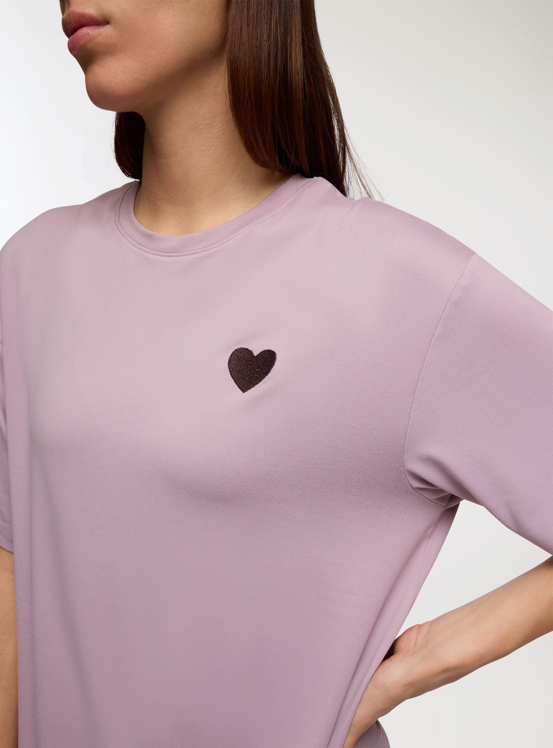 Dámska pyžamová tričko s casual štýlom, charakterizované maxi strihom a bočnými rozparkom, ktoré poskytujú pohodlie a voľnosť pohybu. Minimalistický dizajn je obohatený o trblietavé srdce na hrudi, ideálne na pridanie romantického nádychu. Perfektné na kombinovanie s šortkami alebo na nosenie samostatne. Okrúhly výstrih a krátke rukávy dotvárajú tento kúsok.Detaily