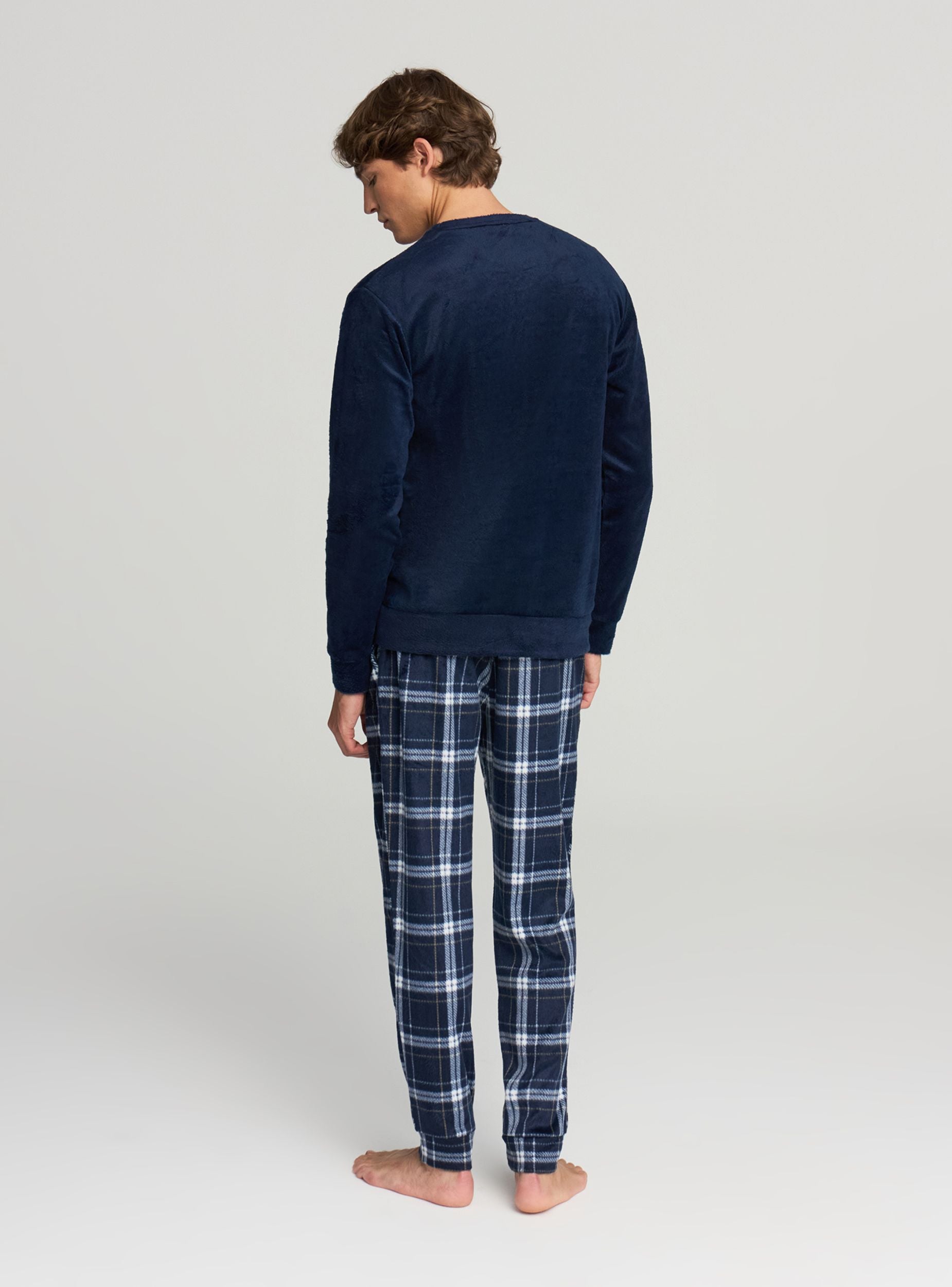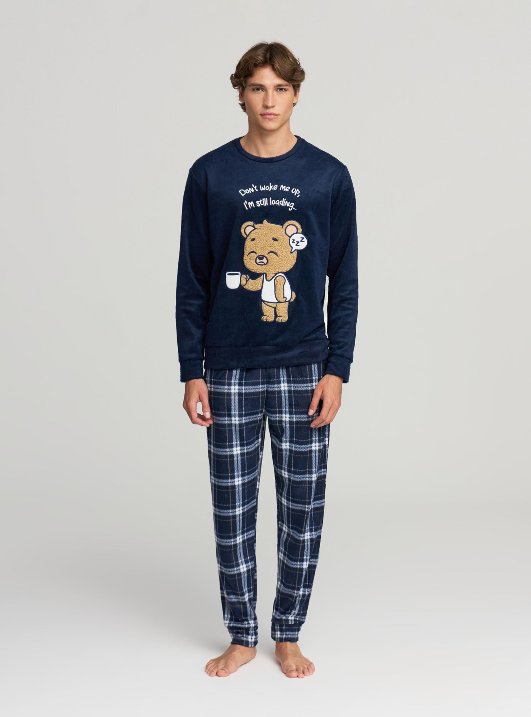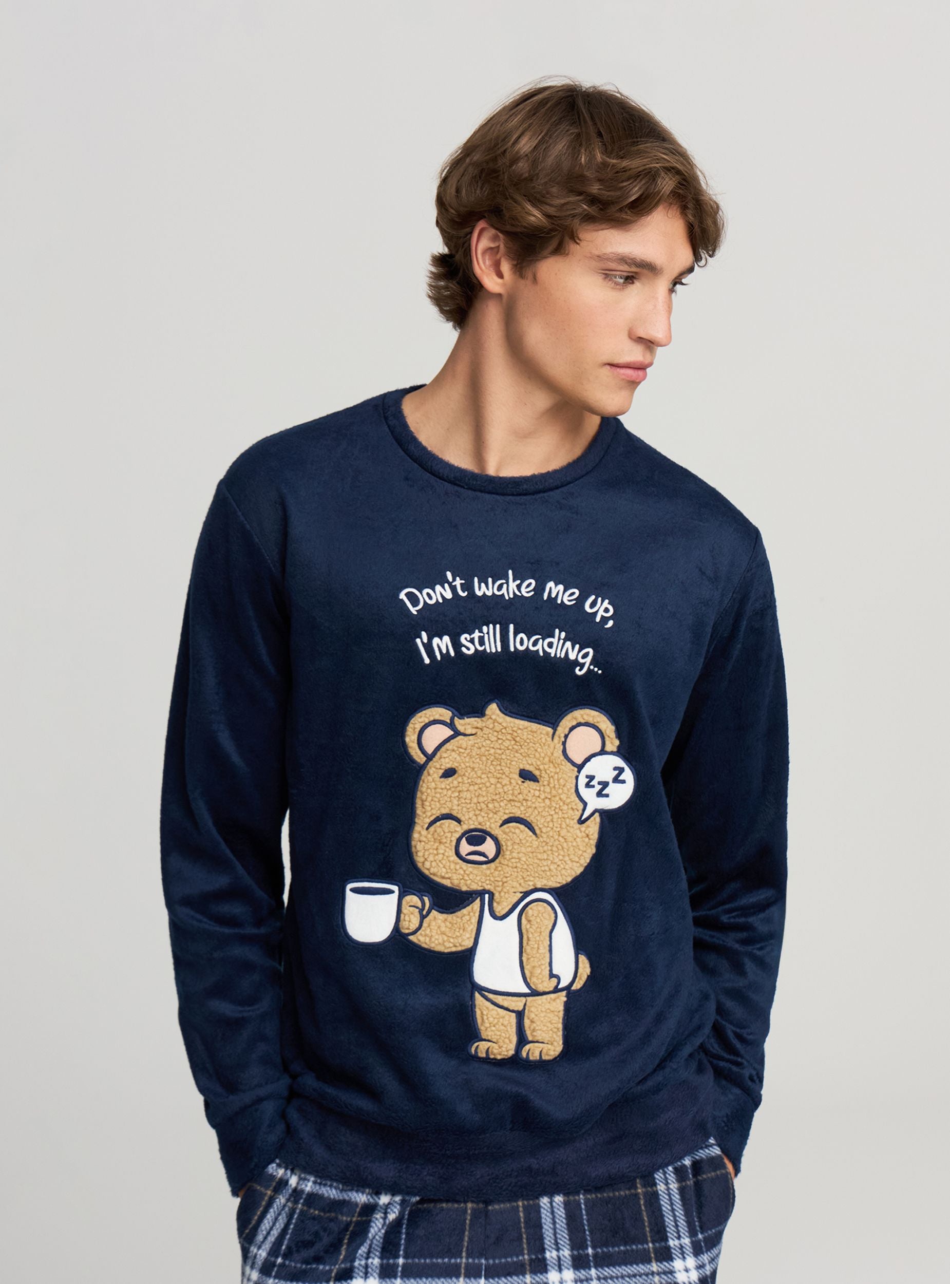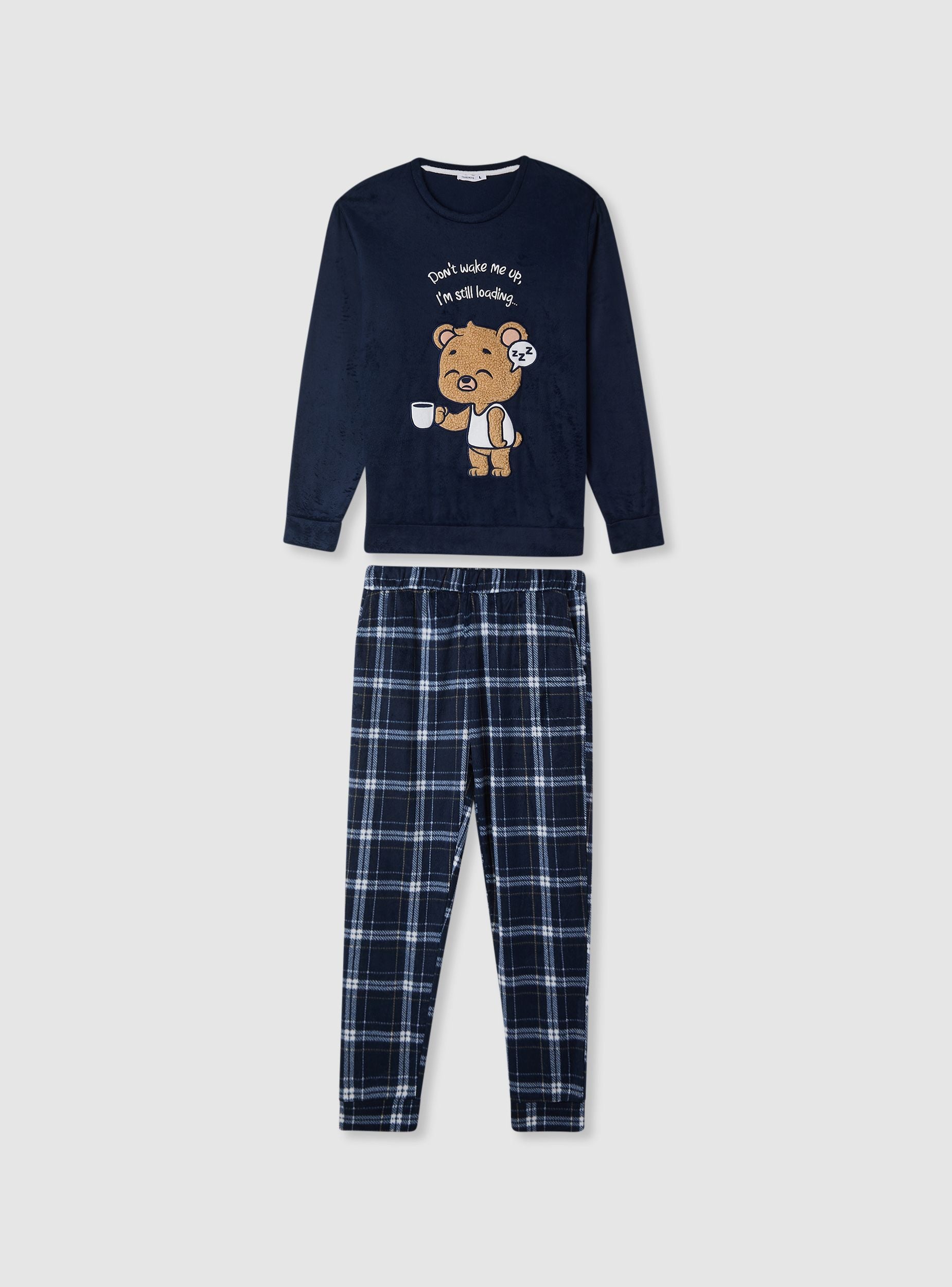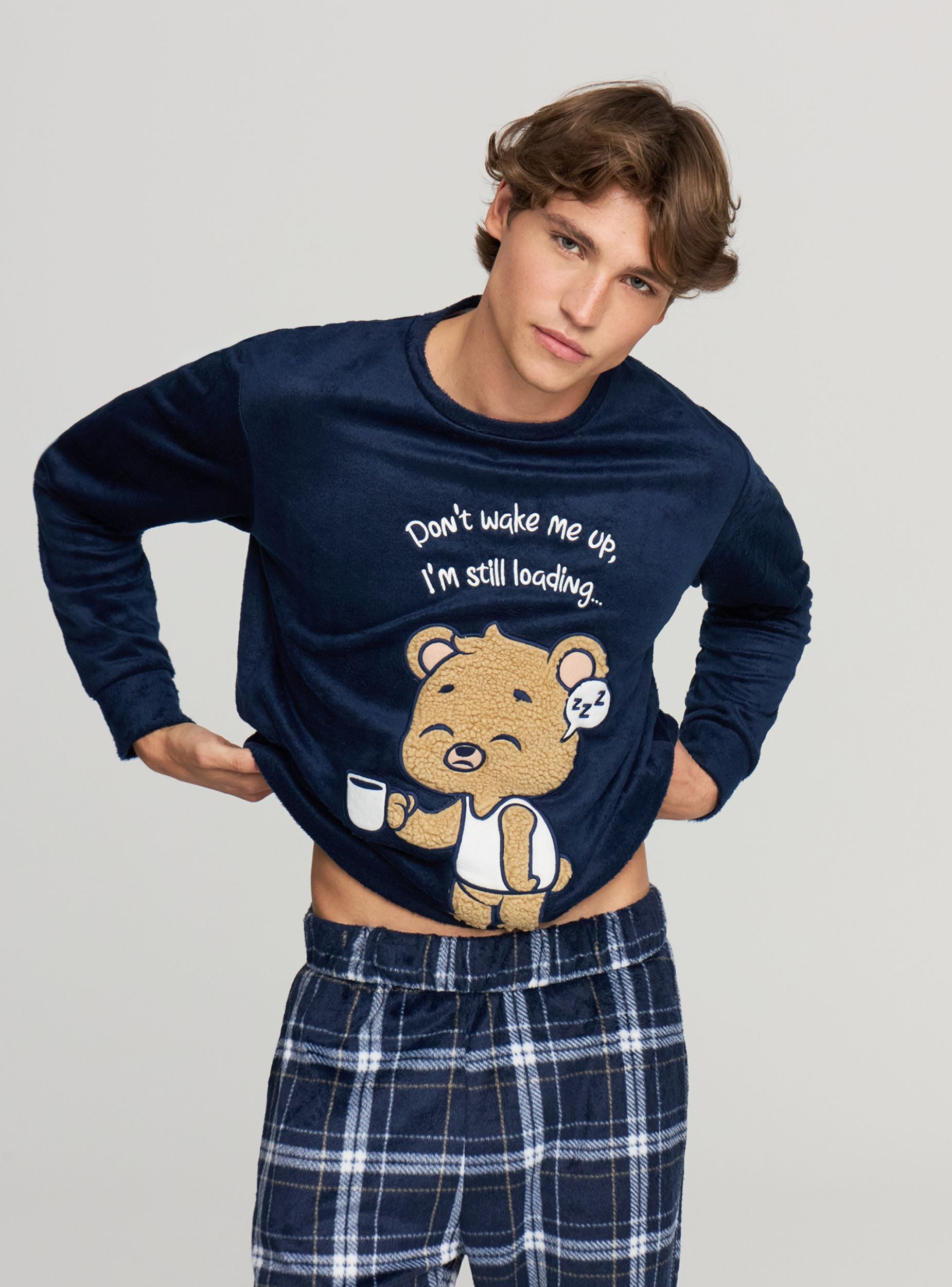 Pánske pyžamo s tričkom s dlhým rukávom a dlhými nohavicami, ideálne na večery oddychu. Horná časť má okrúhly výstrih a veselú potlač s medveďom a nápisom; nohavice majú károvaný vzor, elastický pás a bočné vrecká. Pohodlný strih navrhnutý pre domáci komfort.