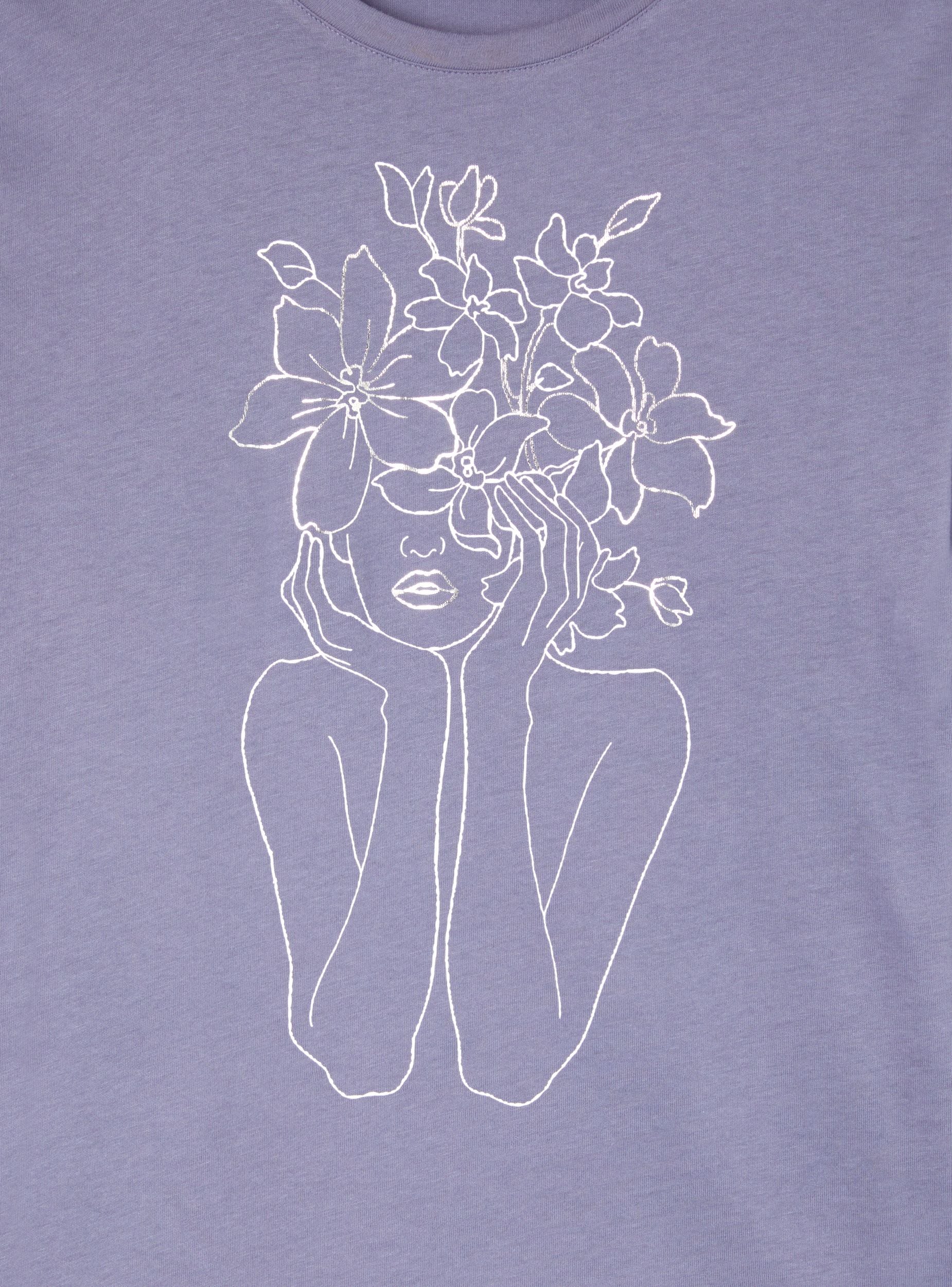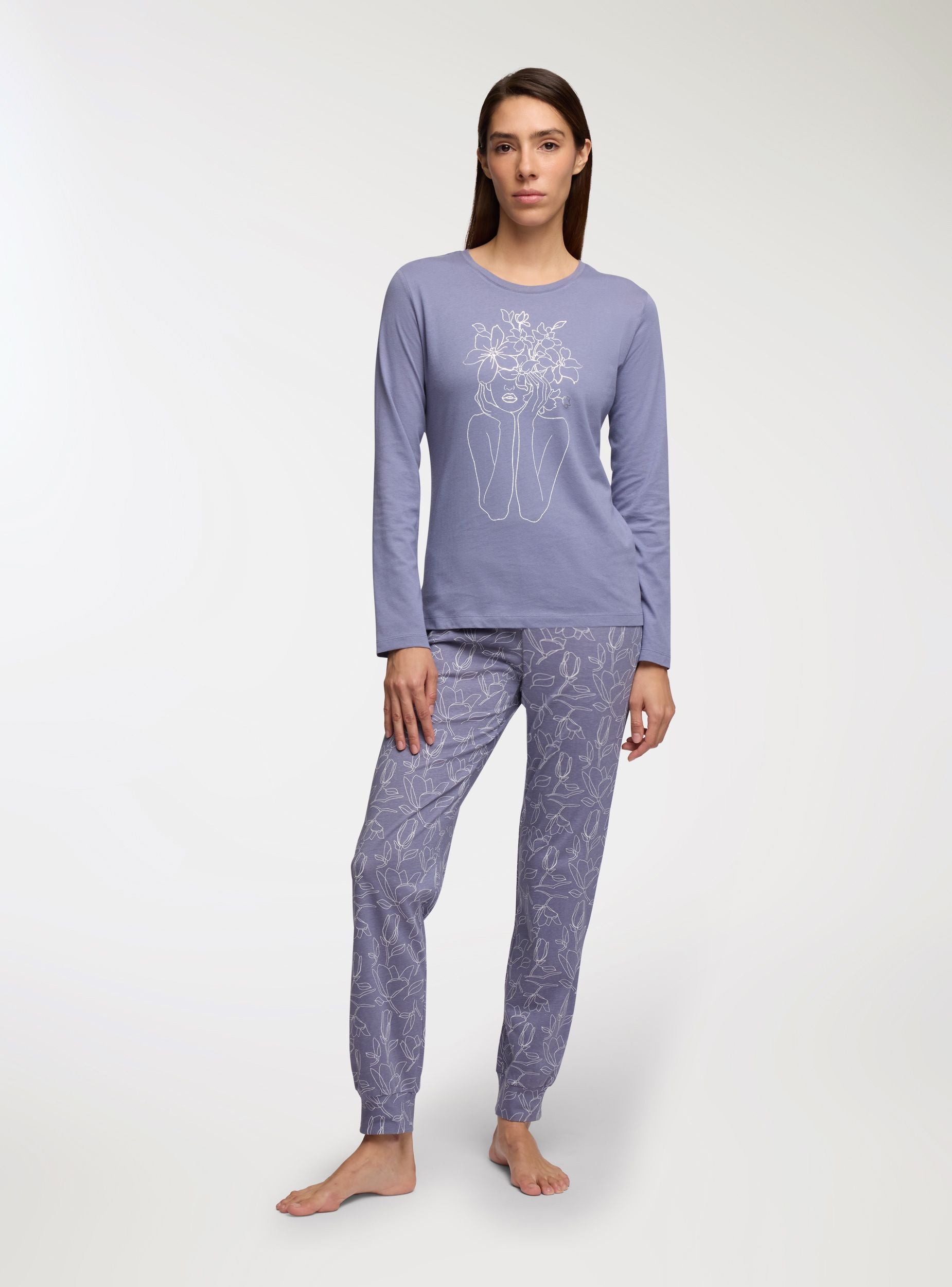 Dámsky pyžamový set pozostávajúci z trička s dlhým rukávom a dlhých nohavíc. Tričko má na prednej strane kvetinovú potlač, zatiaľ čo nohavice sú zdobené kvetinovými vzormi. Ideálne pre pohodlný a uvoľnený vzhľad, perfektné na odpočinok a relaxáciu. Pravidelný strih zaručuje pohodlie a voľnosť pohybu.