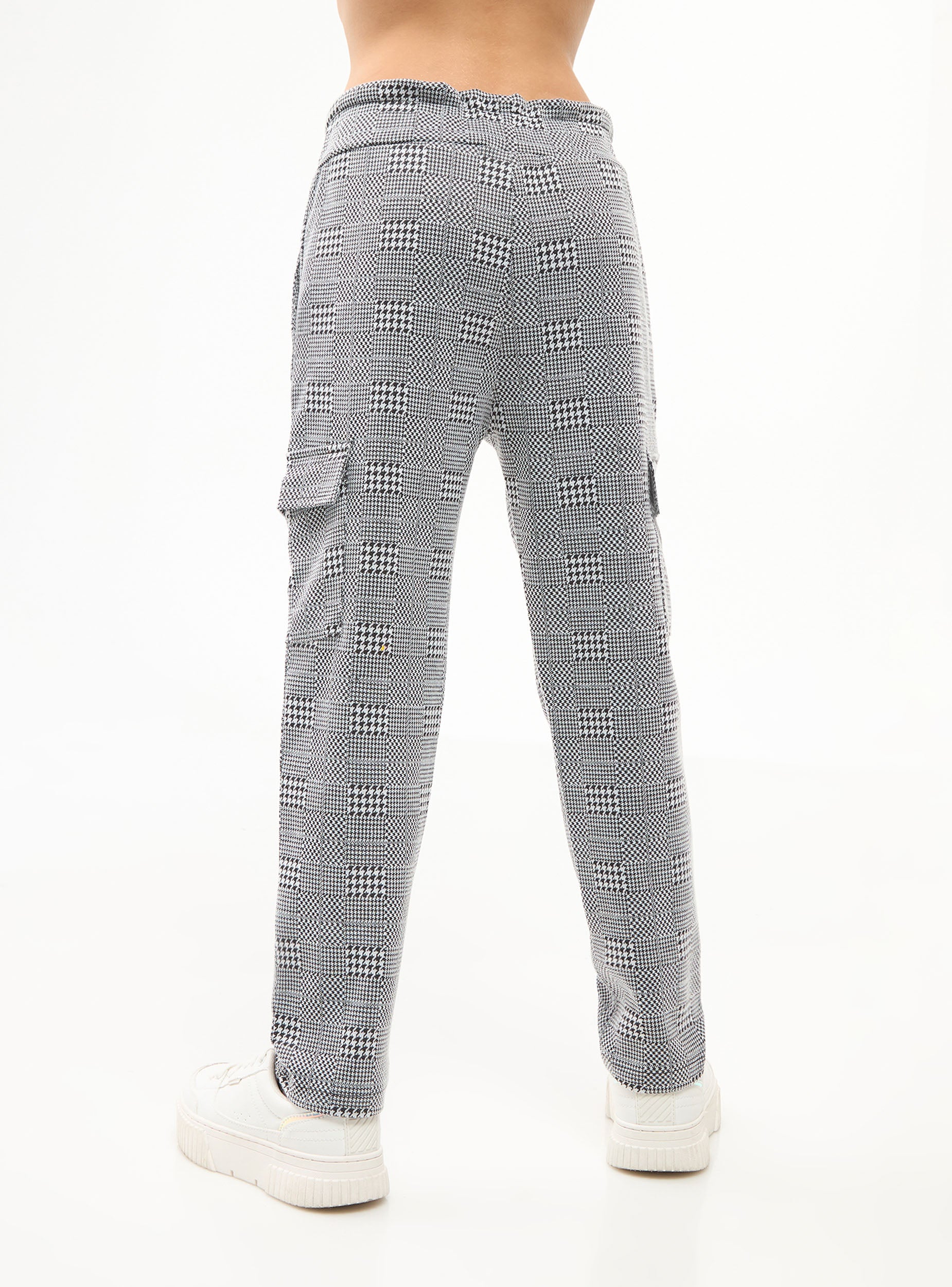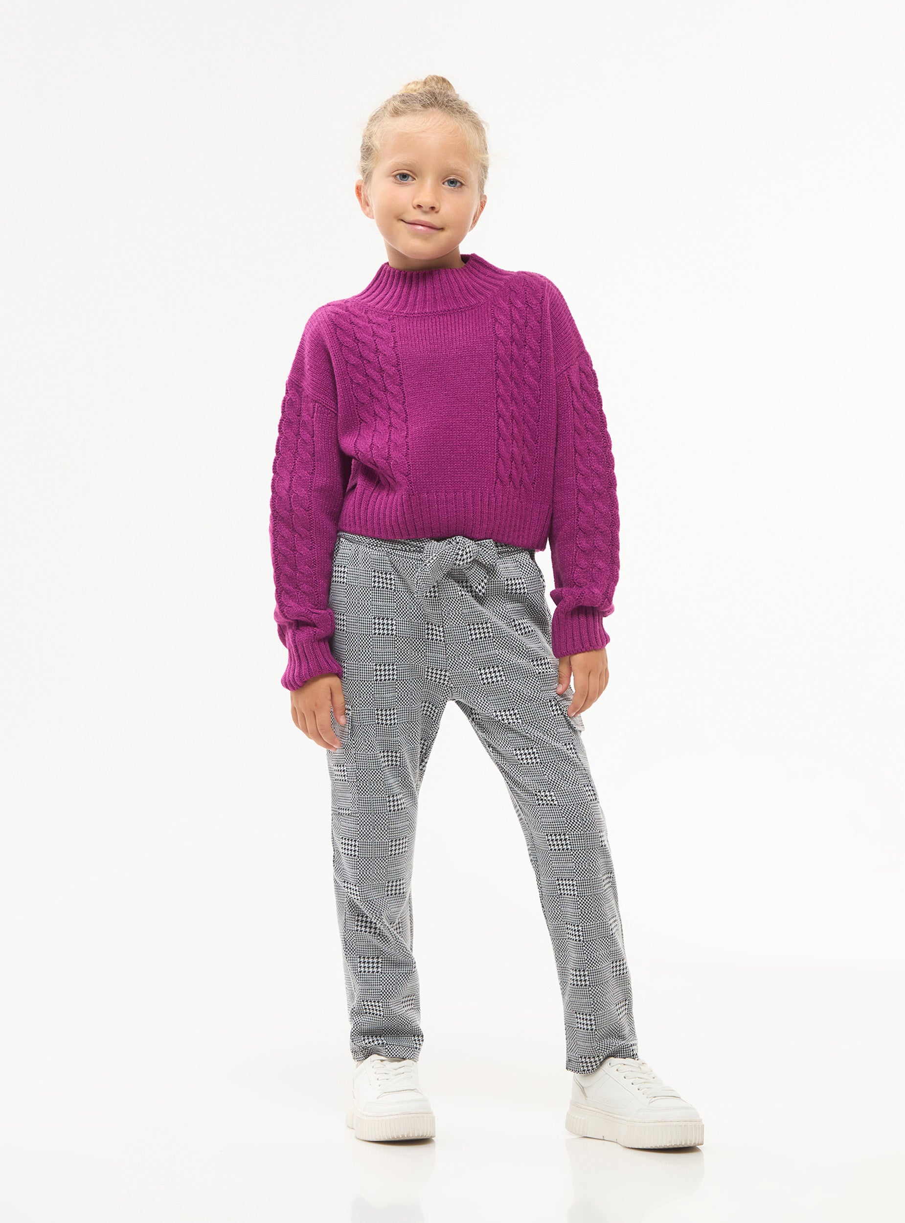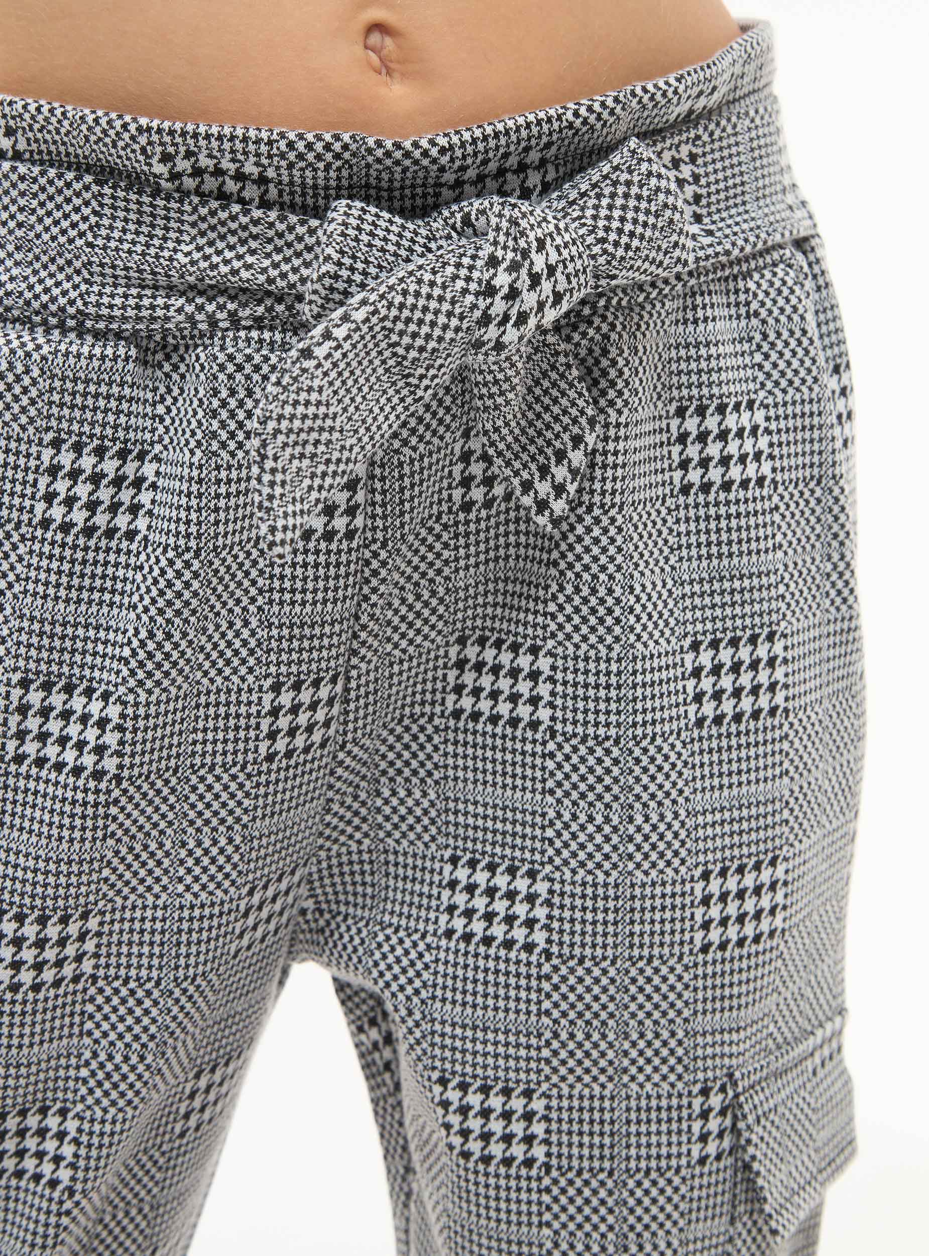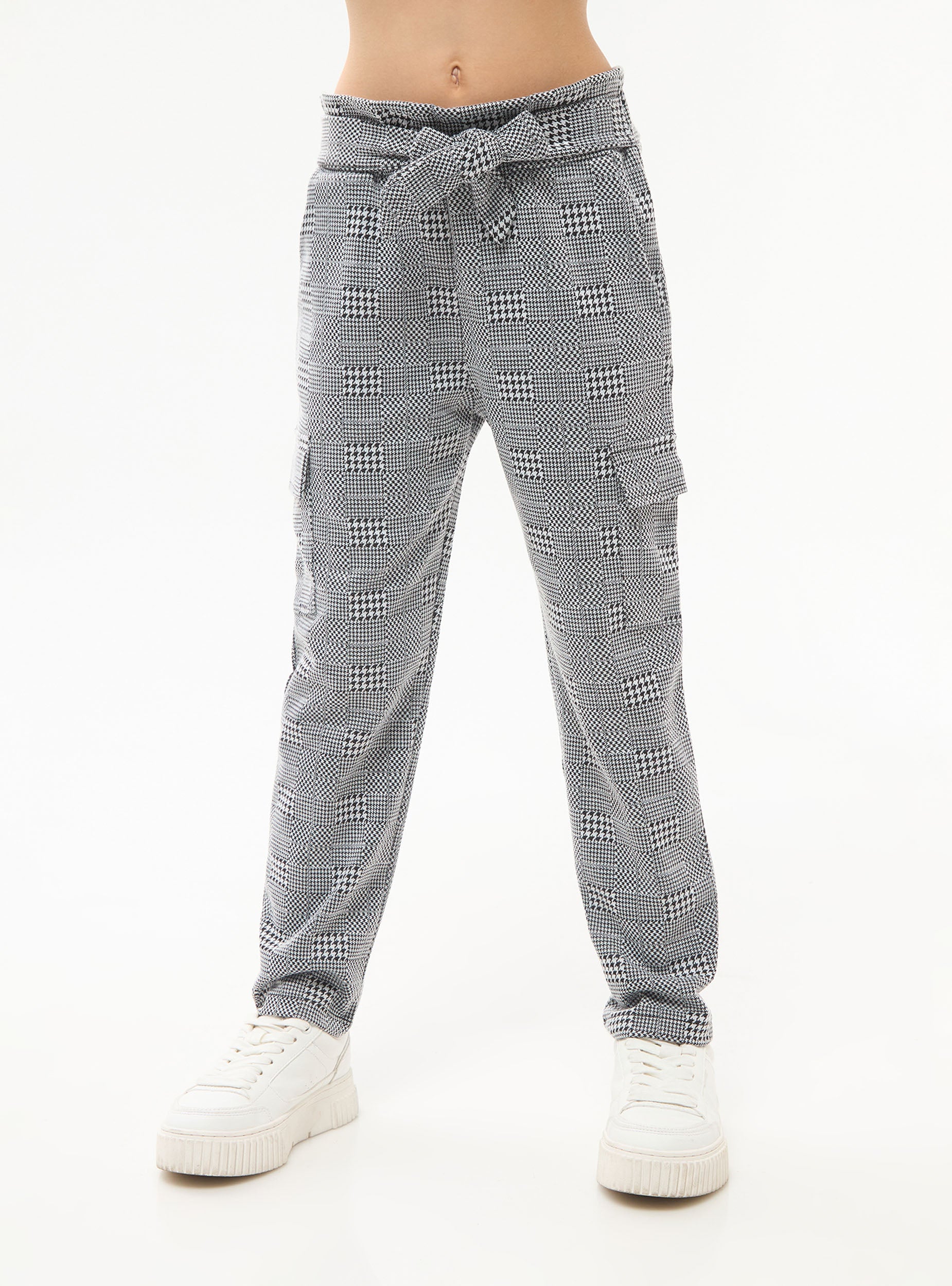 Pantaloni da bambina, modello paperbag con coulisse in vita. Fantasia principe di galles con tasconi laterali e tasche alla francese.Detaily
