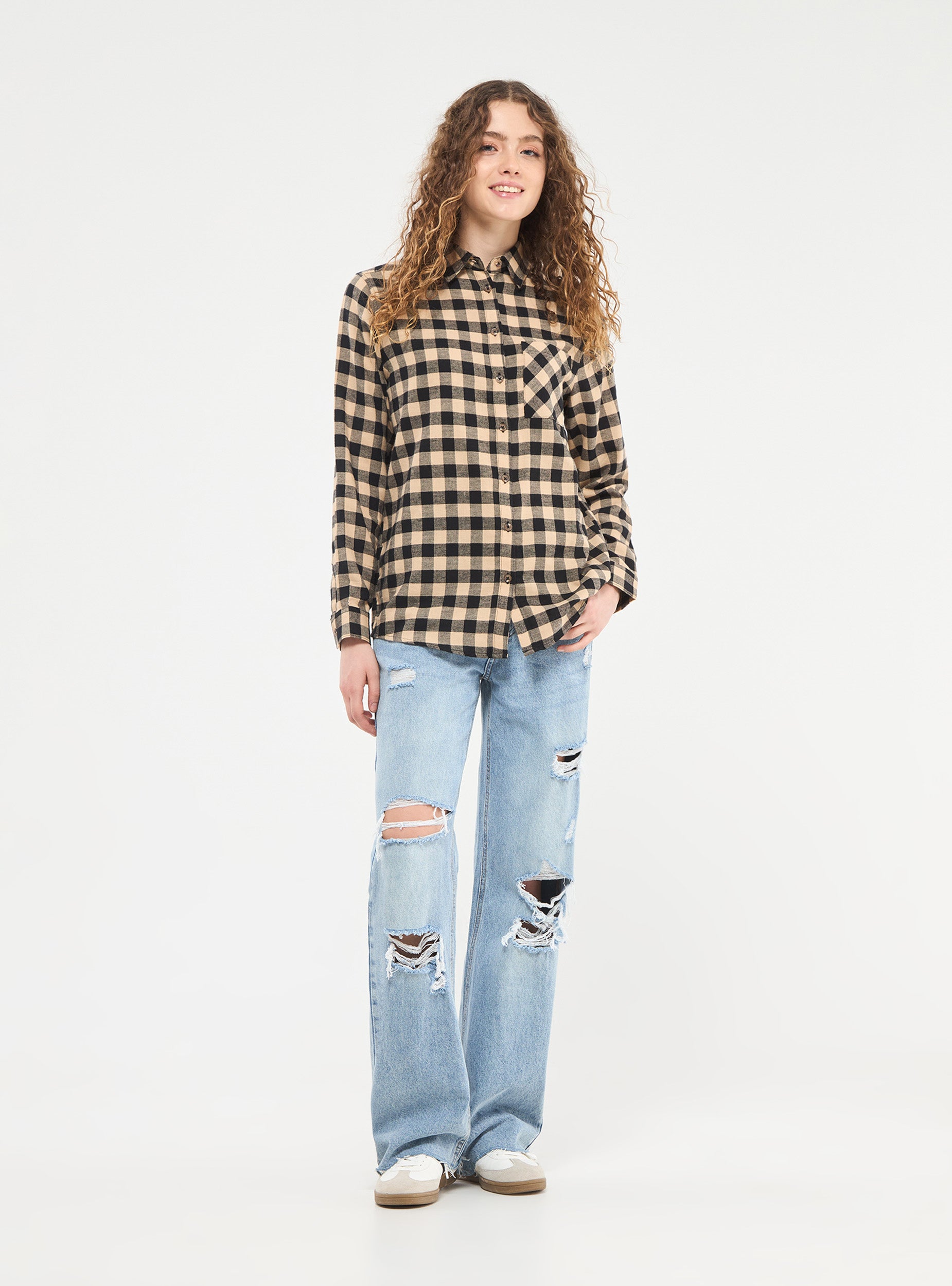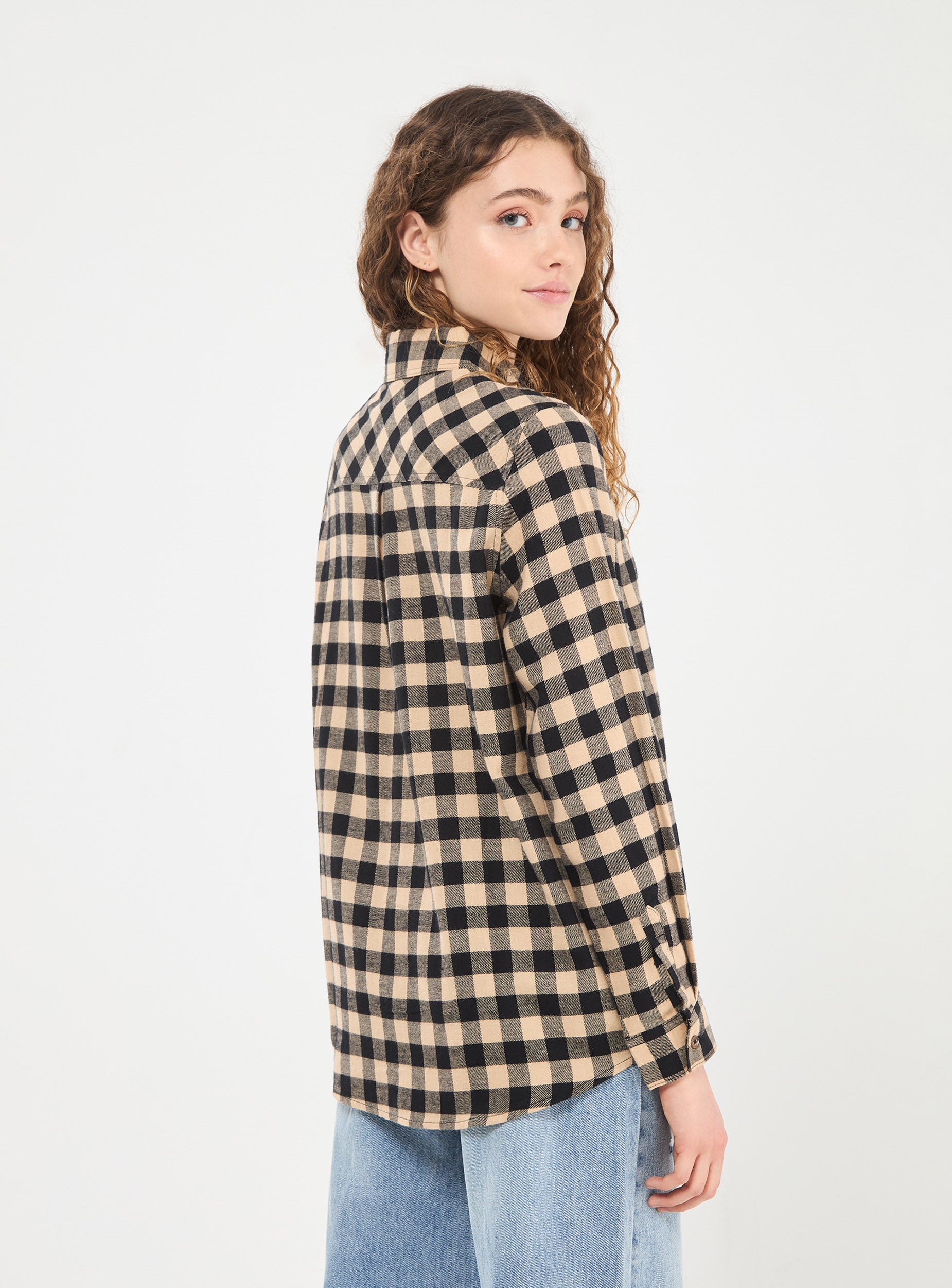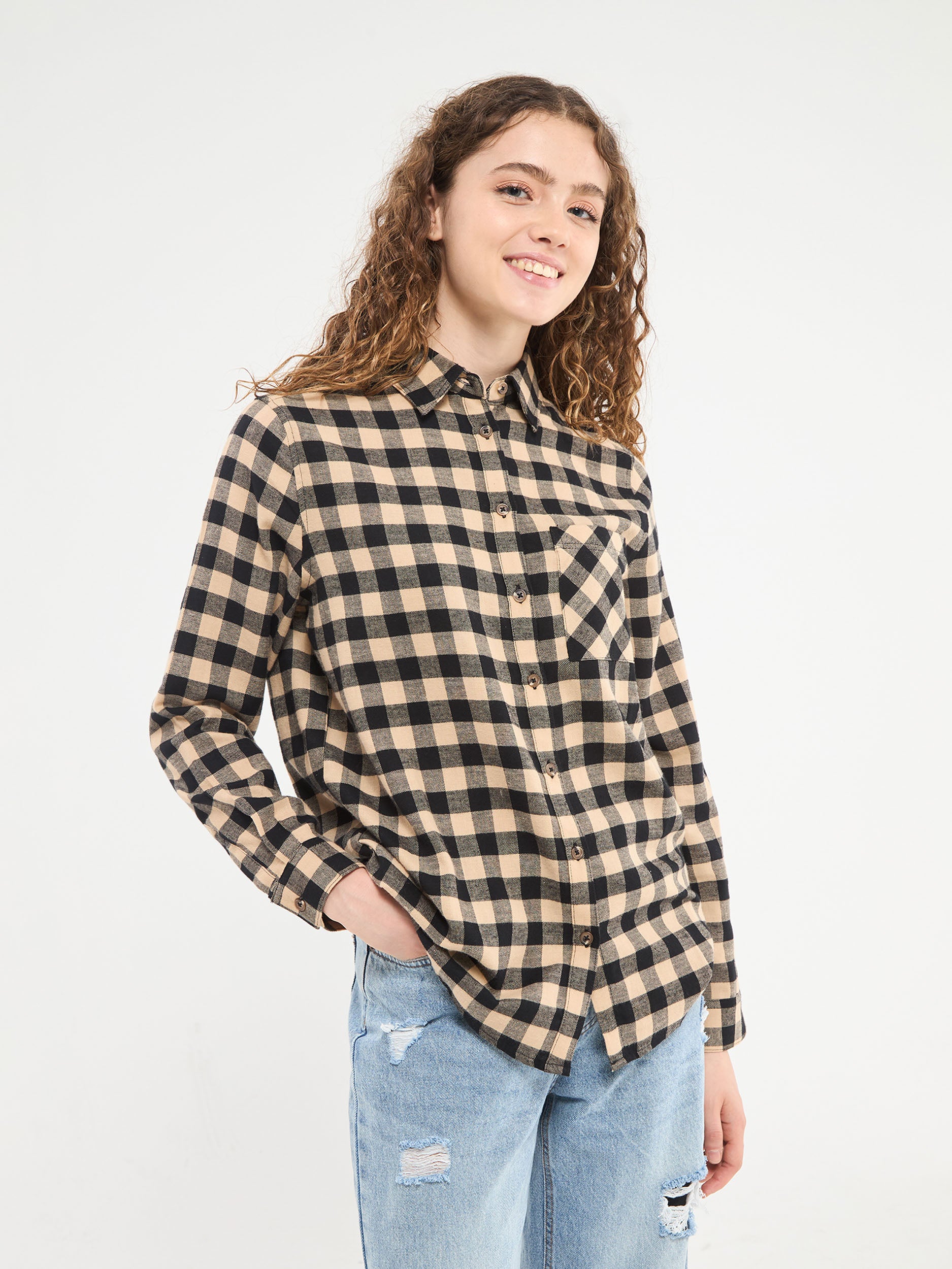Camicia da donna a maniche lunghe. Fantasia a quadri, tessuto flanella.