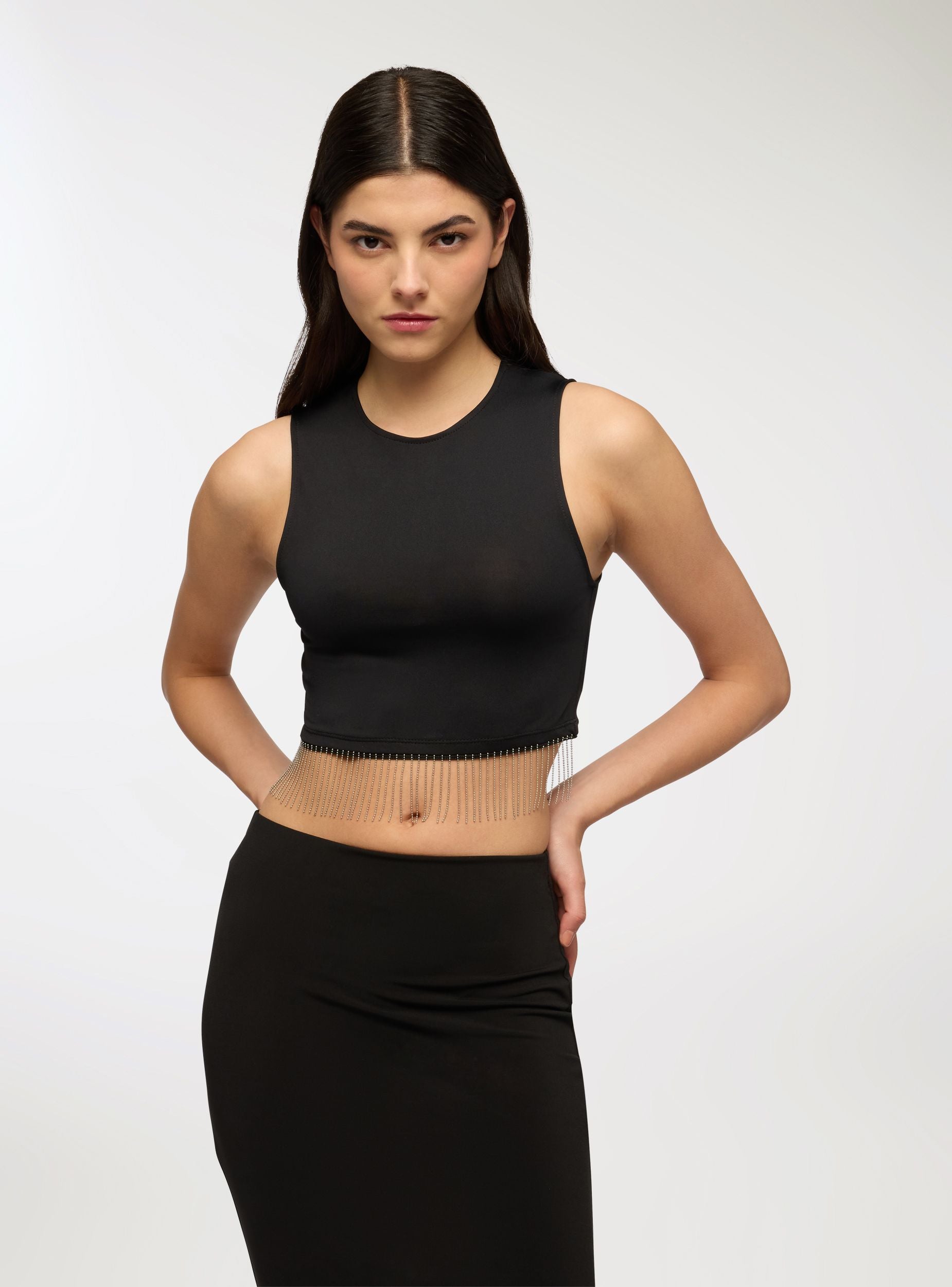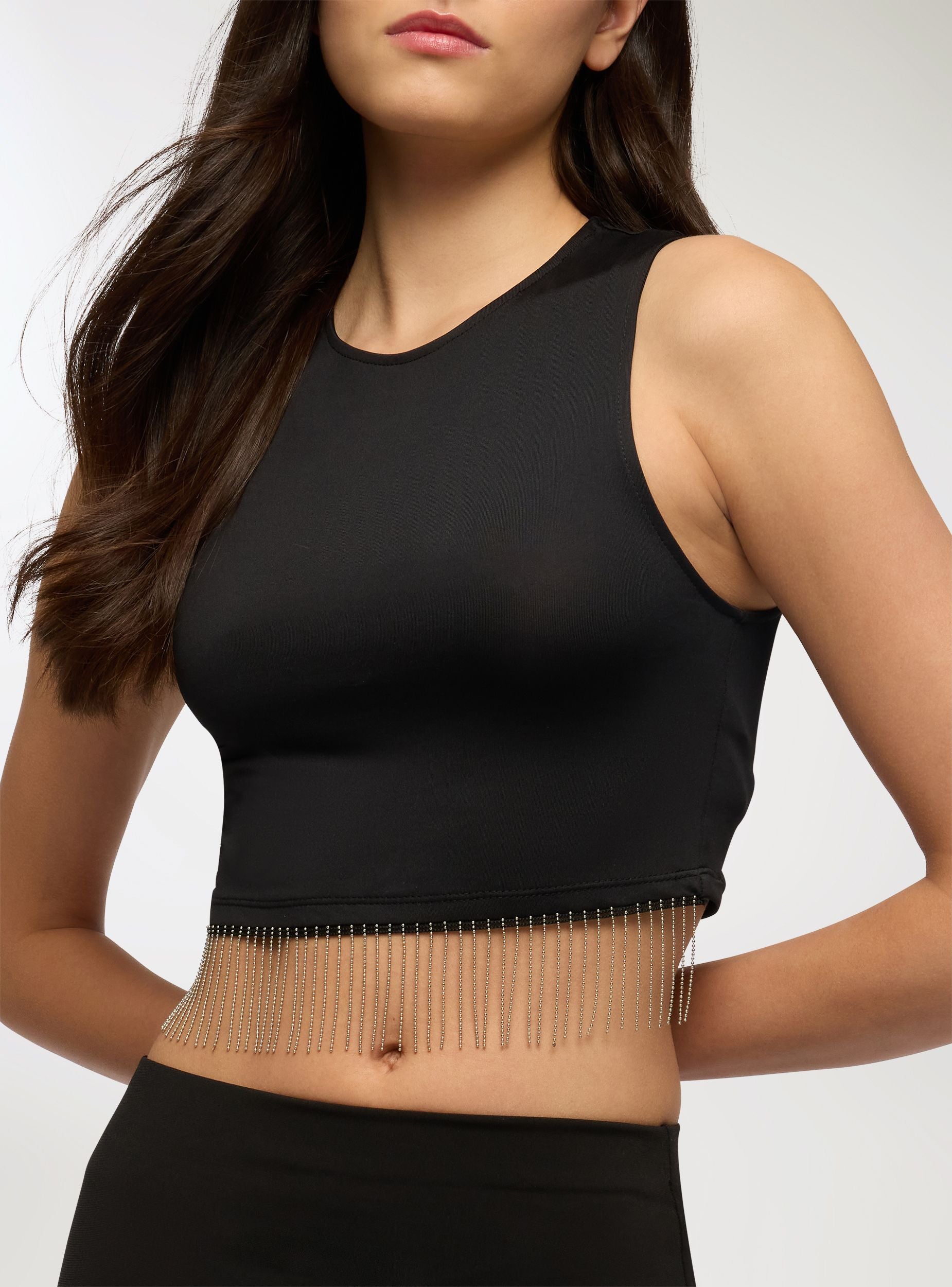 Dámsky top s crop dizajnom a dekoratívnymi strapcami. Ideálny na špeciálne príležitosti, tento kúsok vyniká svojím moderným a príťažlivým štýlom. Perfektný na kombinovanie so sukňami alebo nohavicami s vysokým pásom pre elegantný a sofistikovaný vzhľad. Crop strih zvýrazňuje siluetu, zatiaľ čo strapce pridávajú nádych originality.