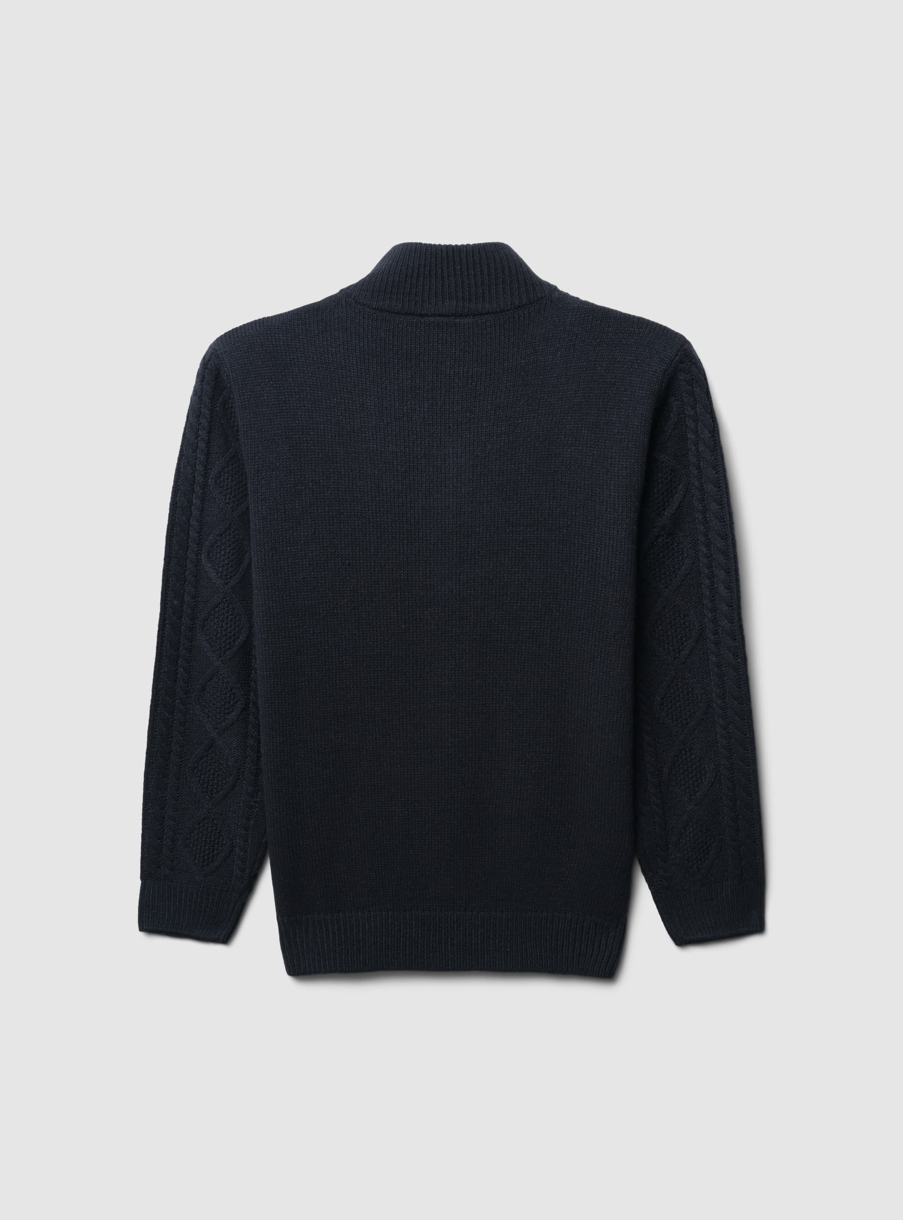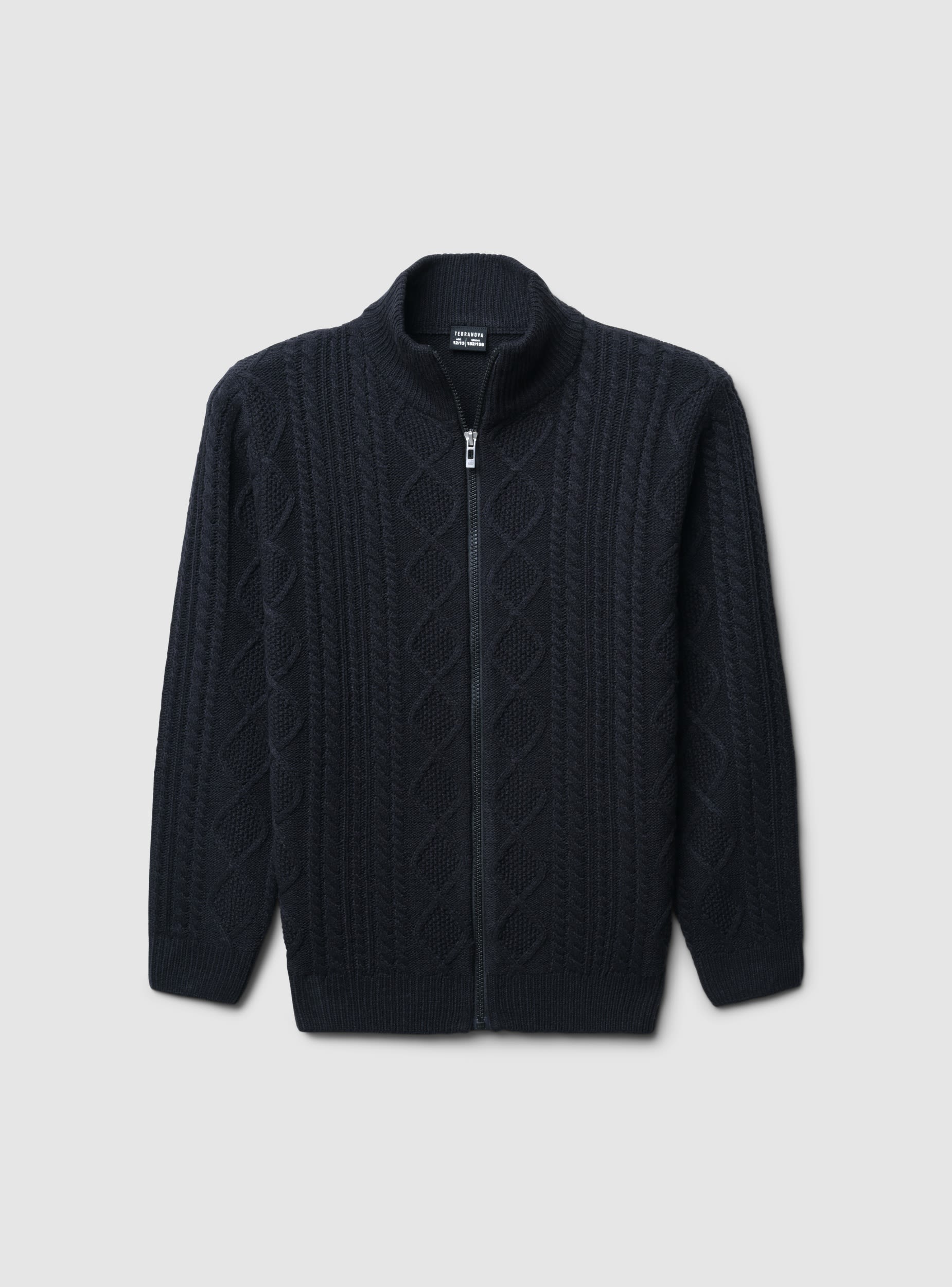 Chlapčenský kardigán so zipsom, ideálny pre ležérny a pohodlný vzhľad. Má dizajn s vrkočmi, ktorý pridáva odevu štýlový nádych. Pohodlný strih a vysoký golier zaručujú ochranu a teplo, vďaka čomu je perfektný na chladnejšie dni. Ľahko sa kombinuje s džínsami alebo nohavicami pre všestranný a praktický outfit.