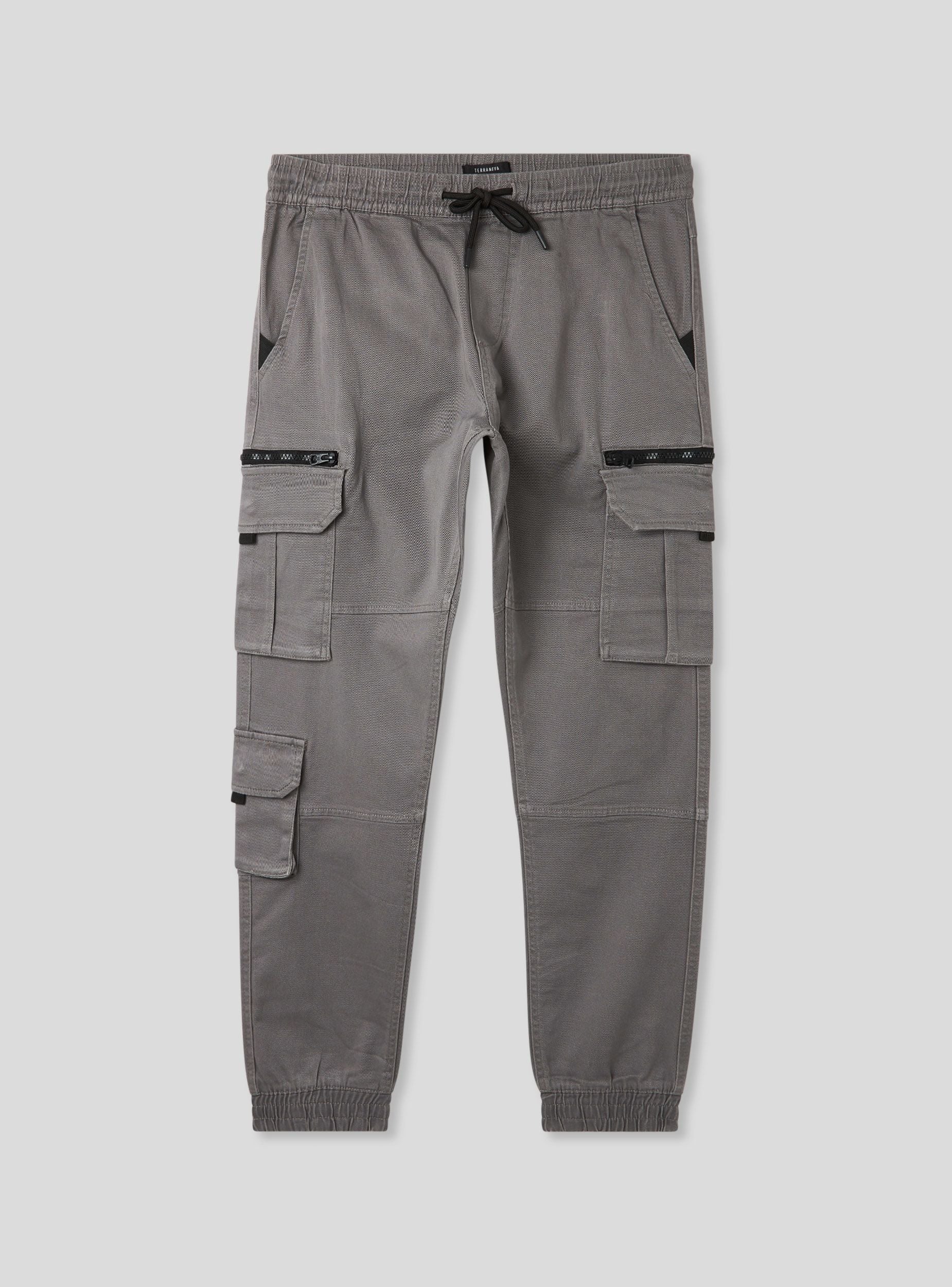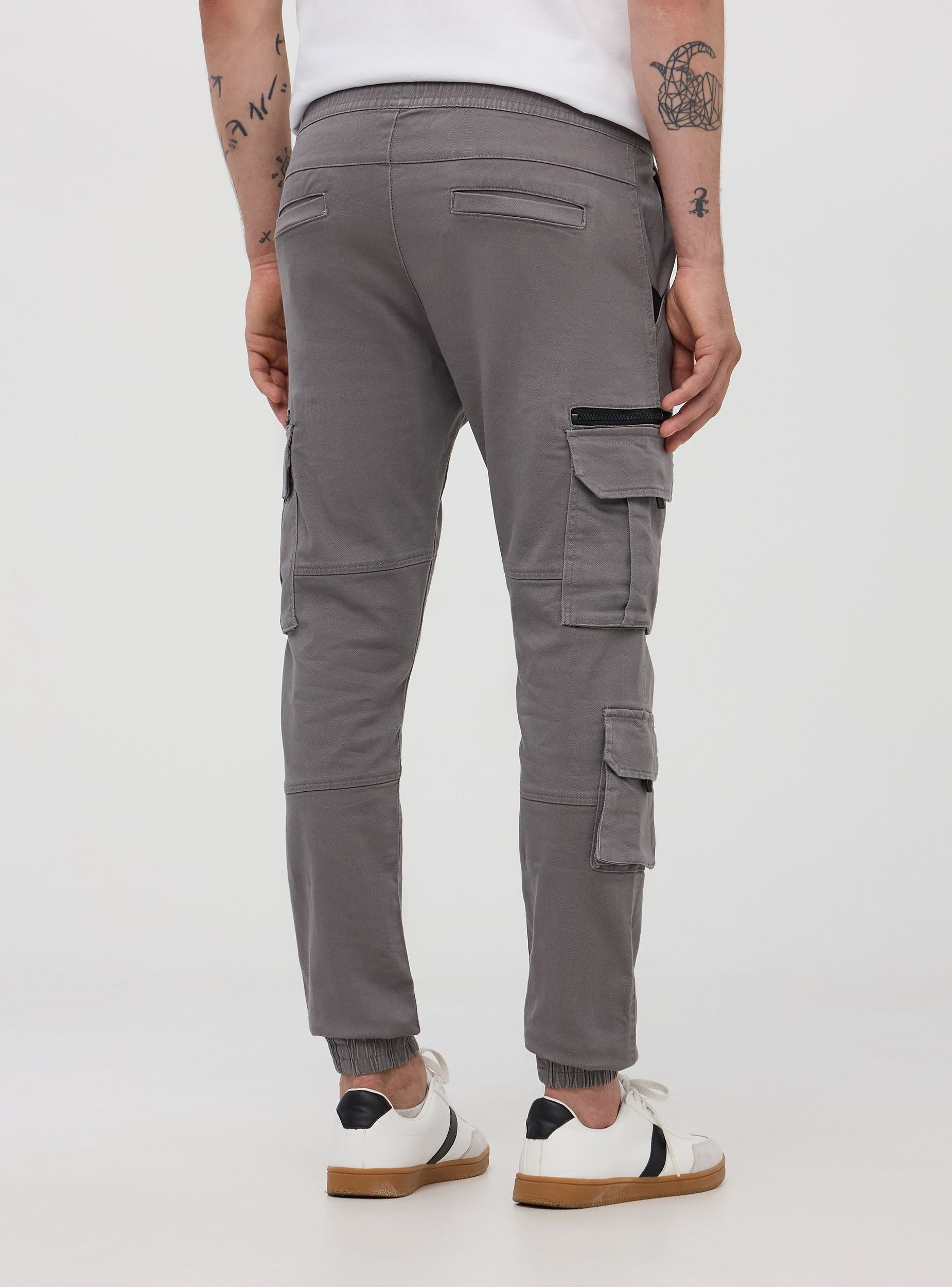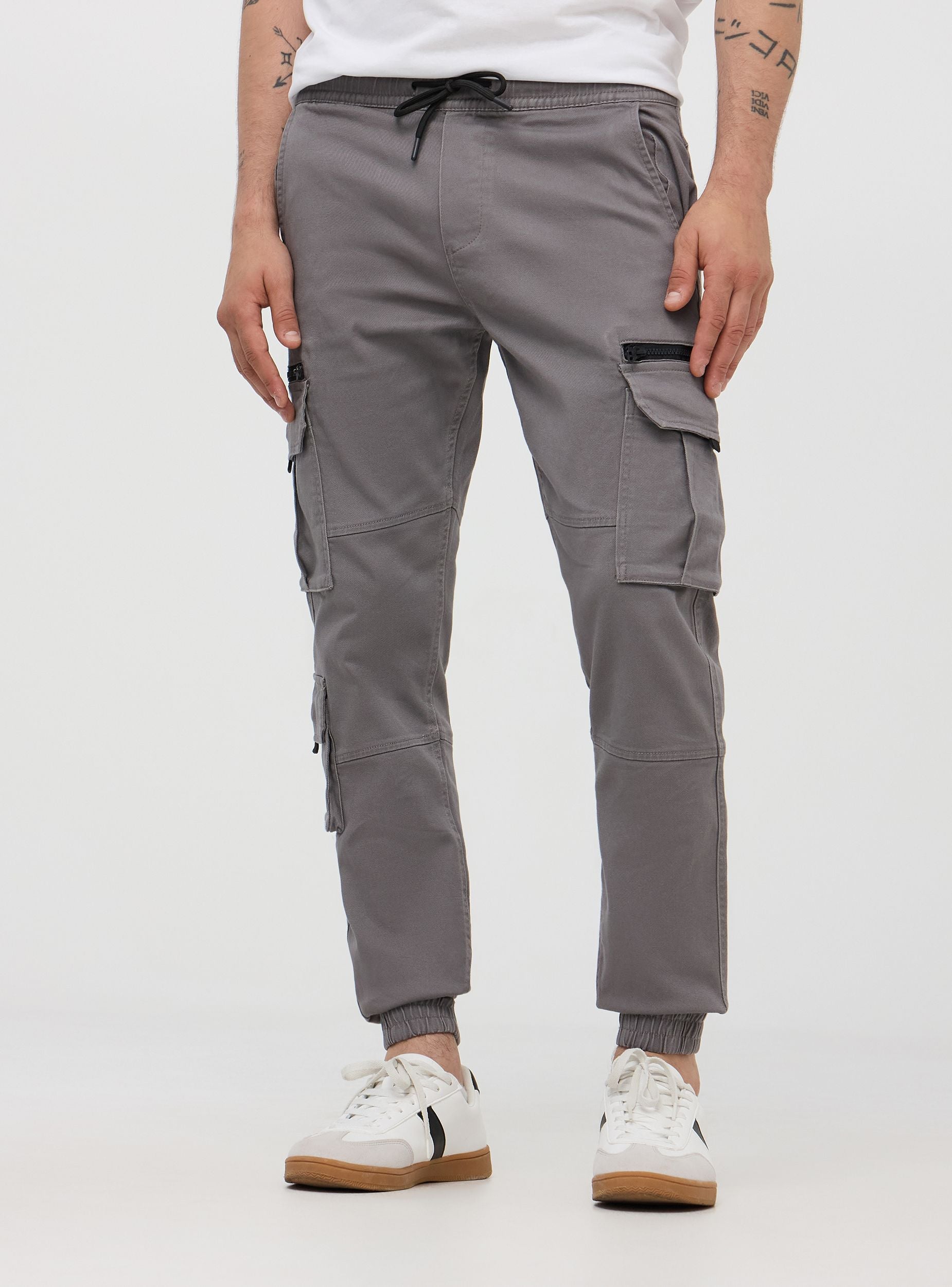 Tento model pánskych jogger nohavíc cargo je vyrobený z elastického bavlneného materiálu a ponúka pohodlné nosenie. Jednofarebná tkanina ich robí všestrannými pre každú neformálnu príležitosť. Majú elastický pás s nastaviteľnou šnúrkou a viaceré vrecká: dve predné s kontrastným elastickým detailom, tri cargo s klopou a zapínaním na patentku, z ktorých dve majú kontrastný zips a dve zadné. Robustné švy a funkčné detaily pre neformálny a všestranný vzhľad.