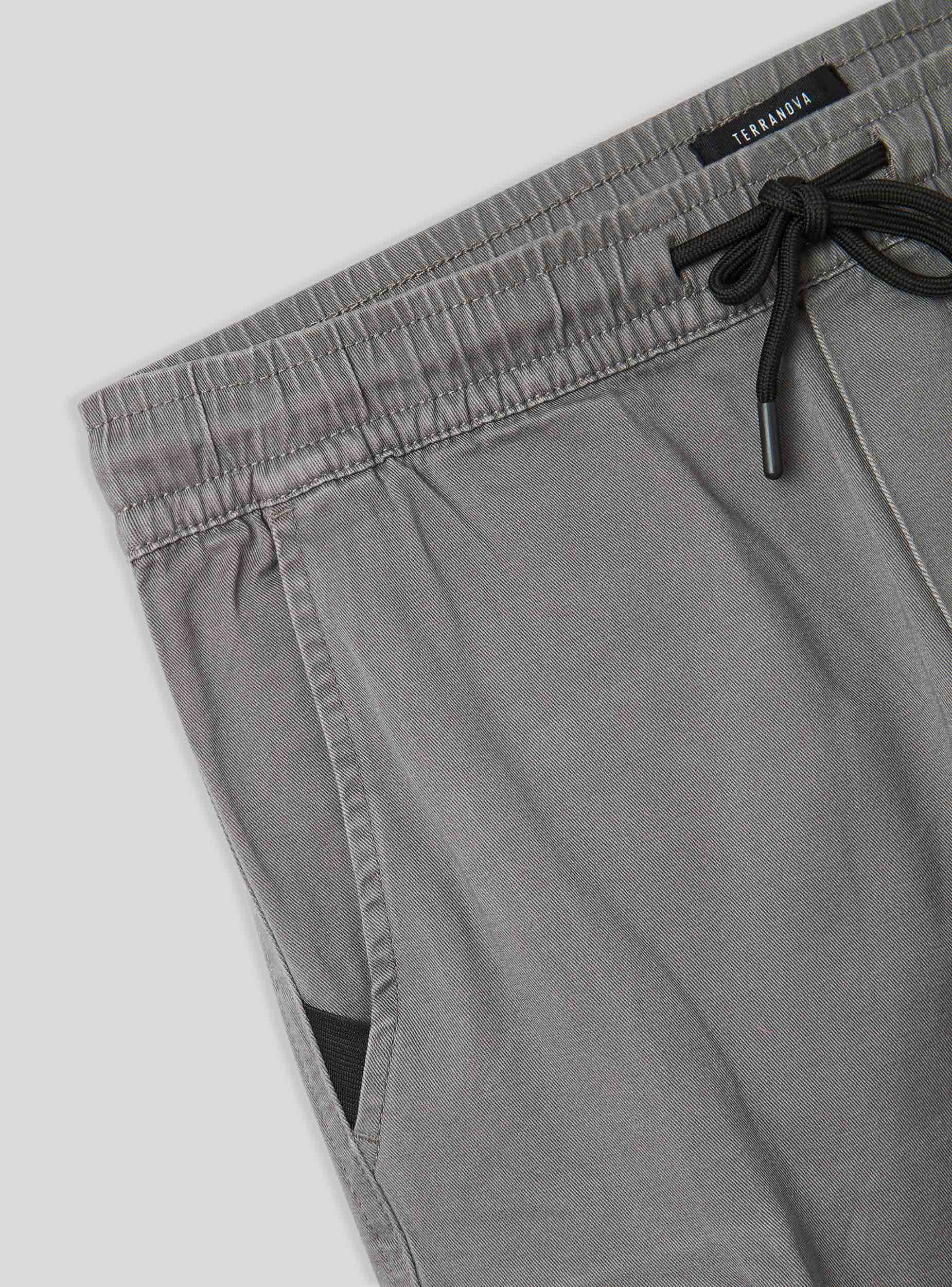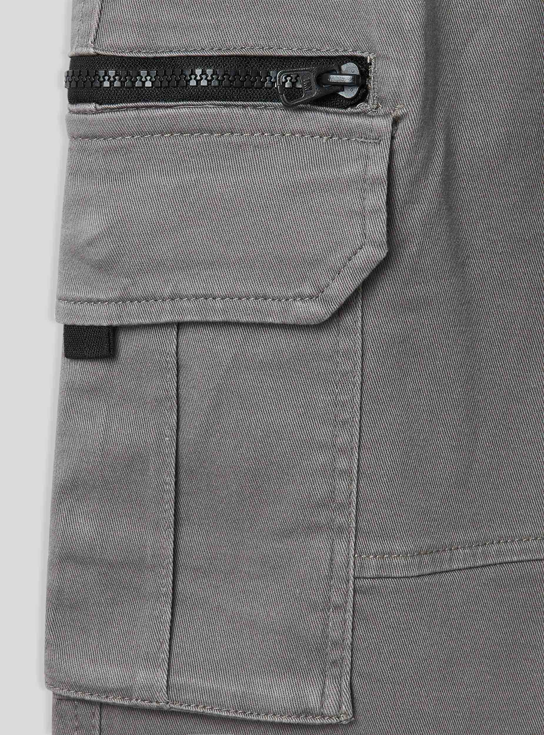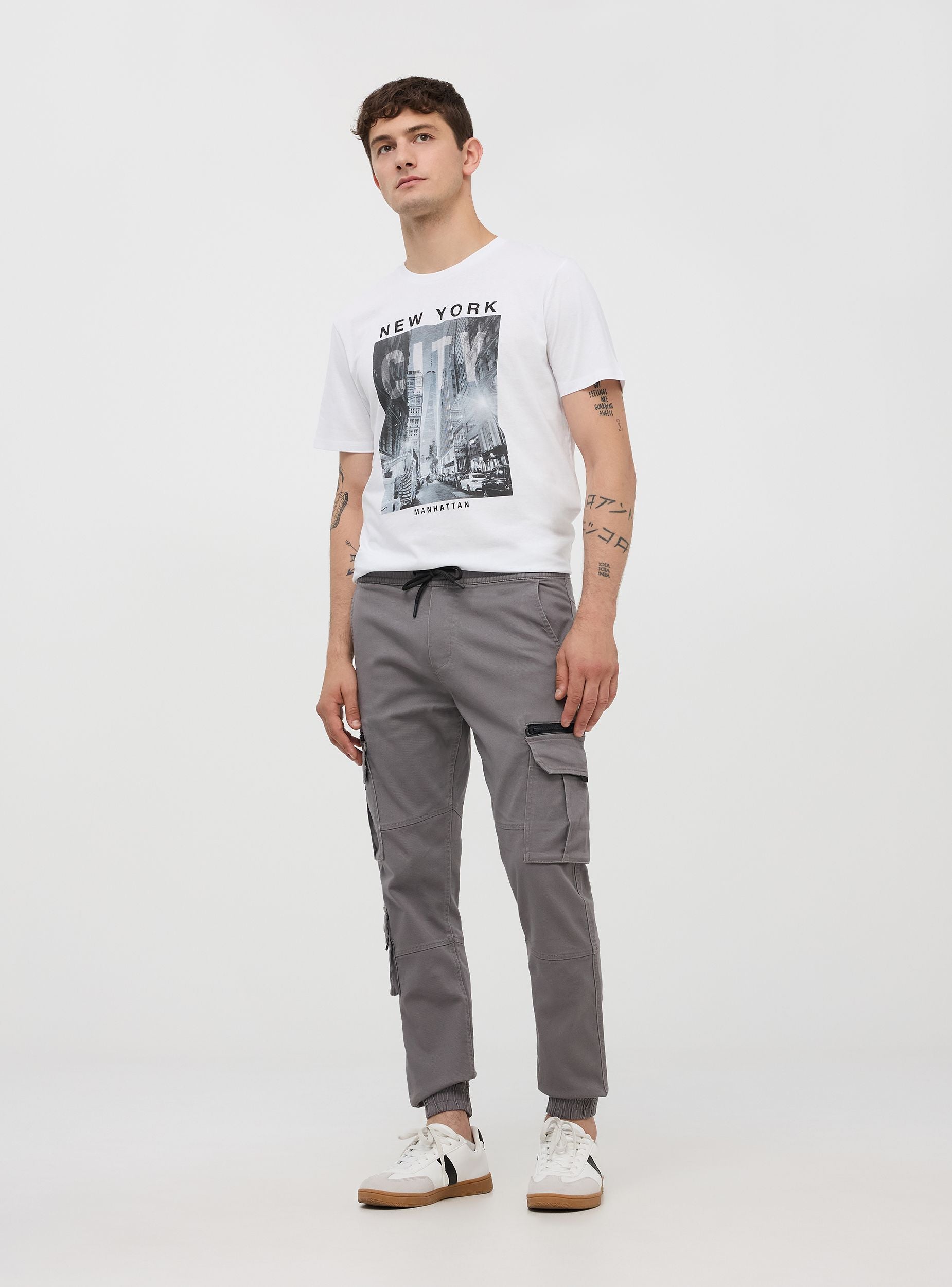 Tento model pánskych jogger nohavíc cargo je vyrobený z elastického bavlneného materiálu a ponúka pohodlné nosenie. Jednofarebná tkanina ich robí všestrannými pre každú neformálnu príležitosť. Majú elastický pás s nastaviteľnou šnúrkou a viaceré vrecká: dve predné s kontrastným elastickým detailom, tri cargo s klopou a zapínaním na patentku, z ktorých dve majú kontrastný zips a dve zadné. Robustné švy a funkčné detaily pre neformálny a všestranný vzhľad.