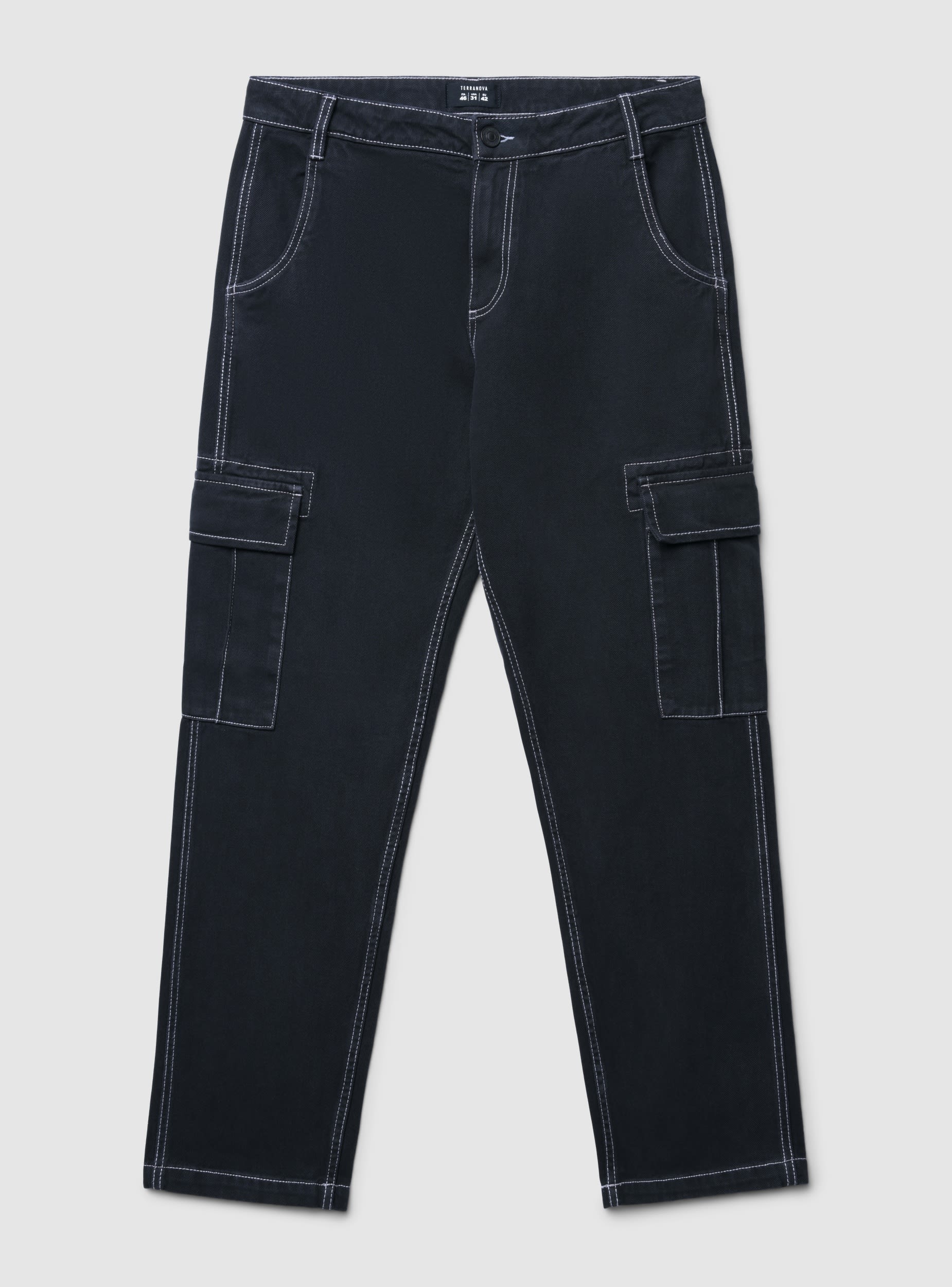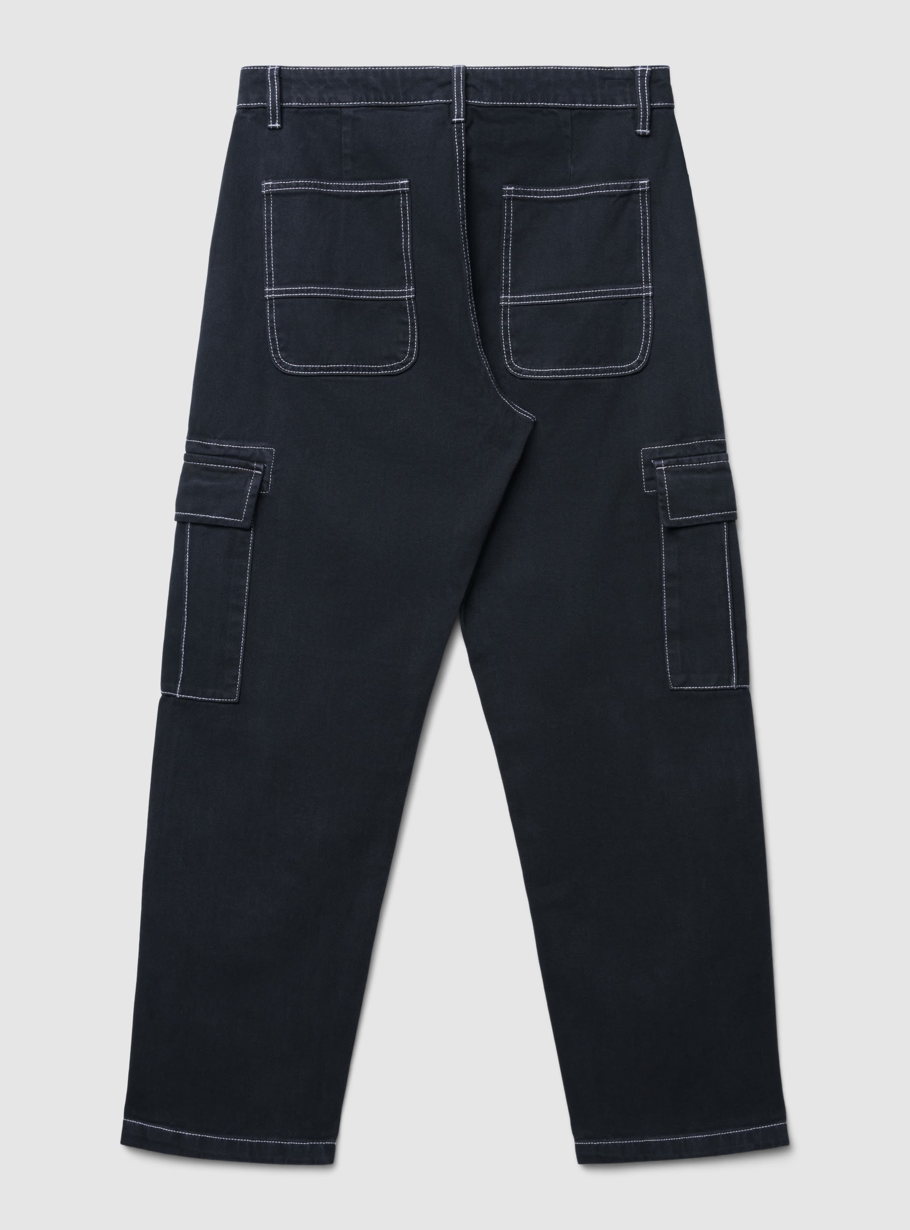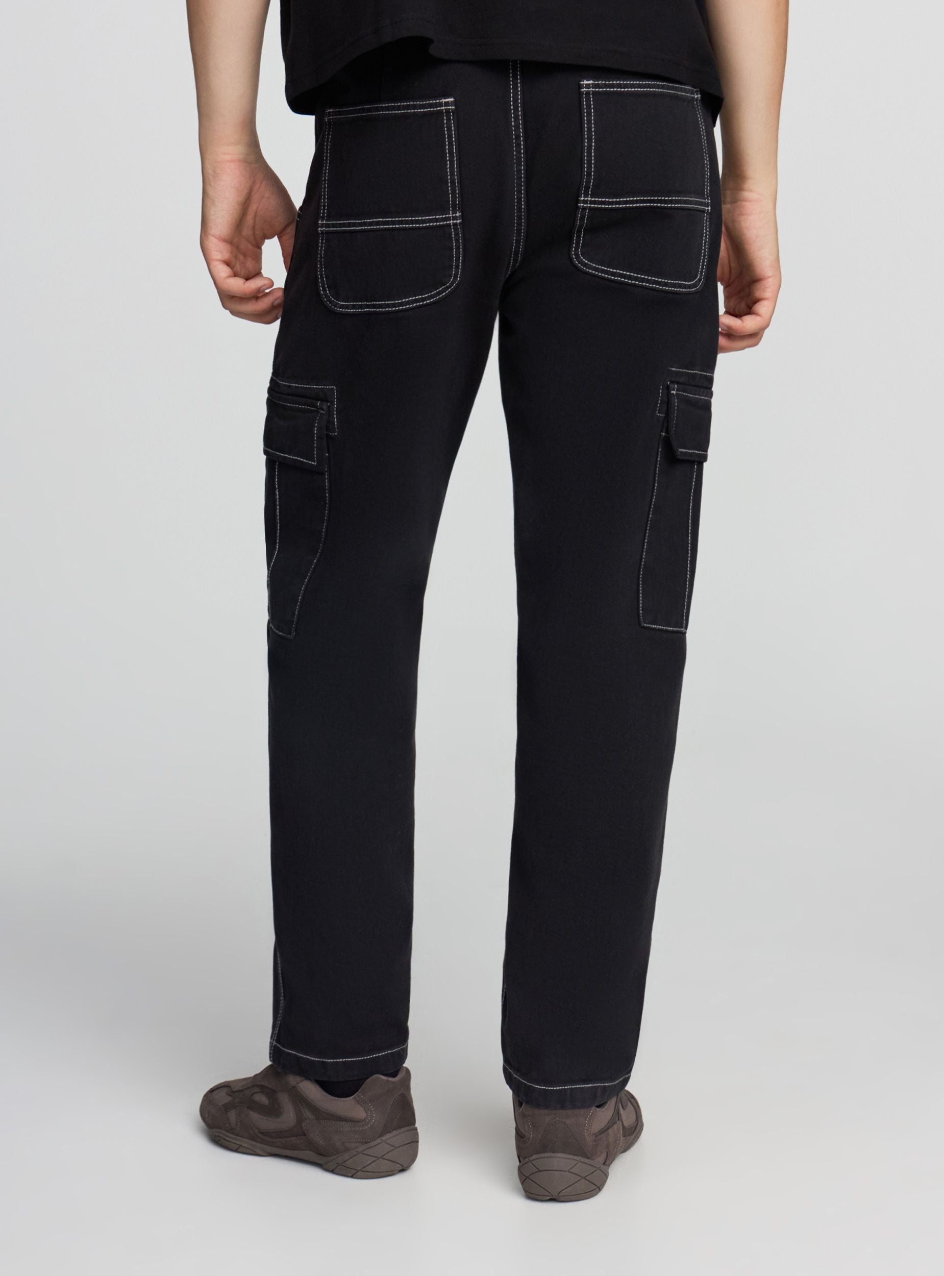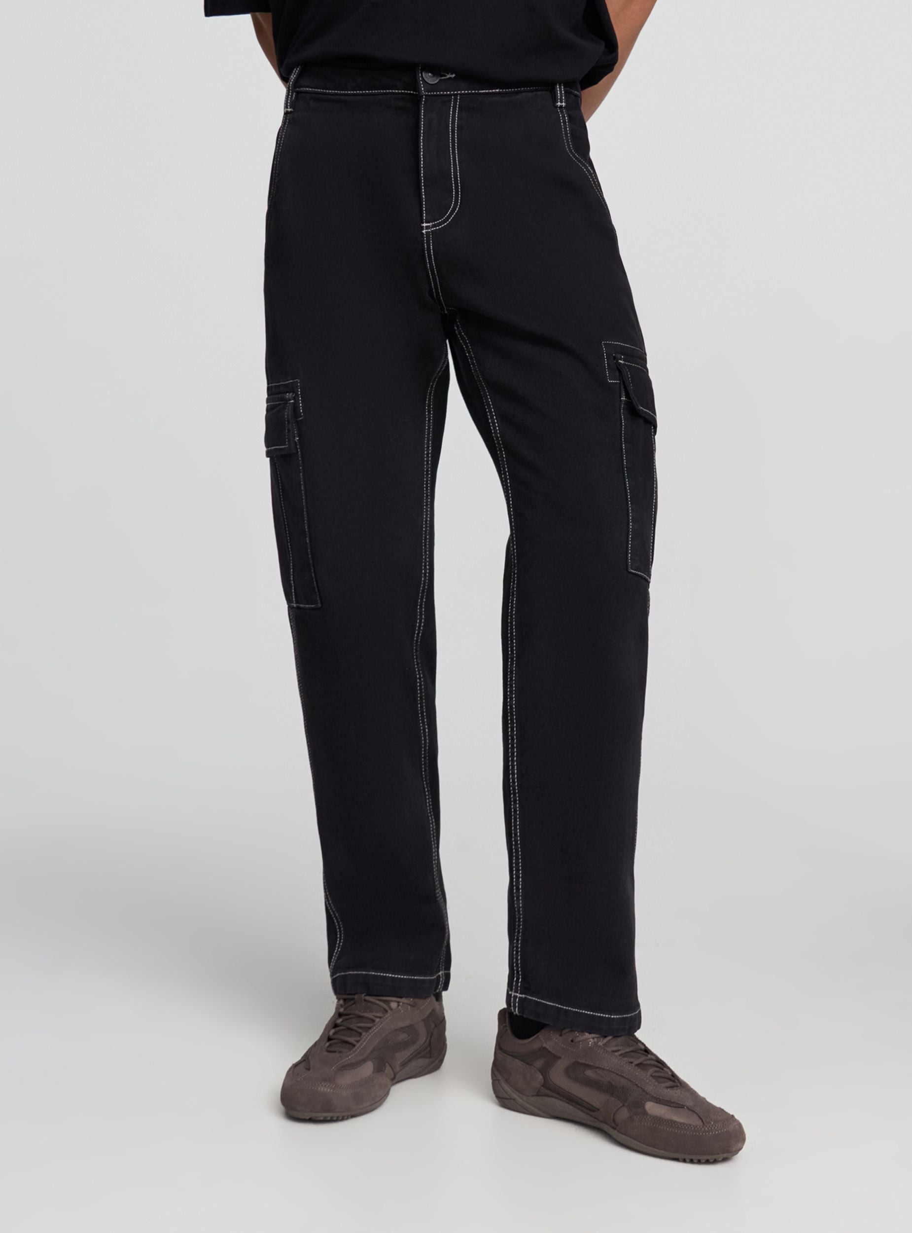 Pánske nohavice cargo s jednofarebným dizajnom a kontrastným prešívaním. Majú bočné a zadné nášivkové vrecká. Voľný strih a rovný rez poskytujú pohodlie a praktickosť, vďaka čomu sú ideálne pre ležérny mestský vzhľad. Ľahko sa kombinujú s tričkami a teniskami pre moderný a funkčný outfit.Detaily