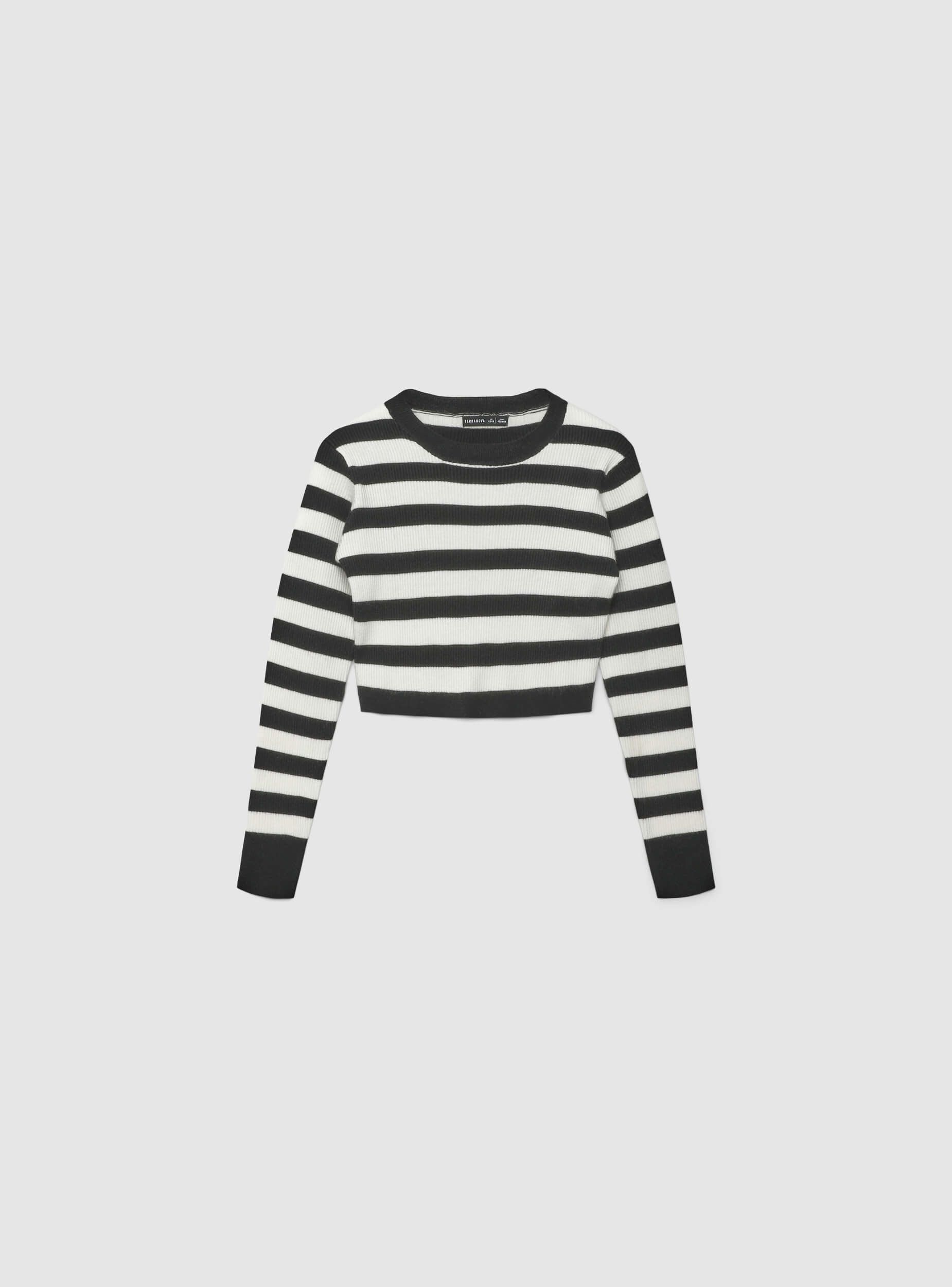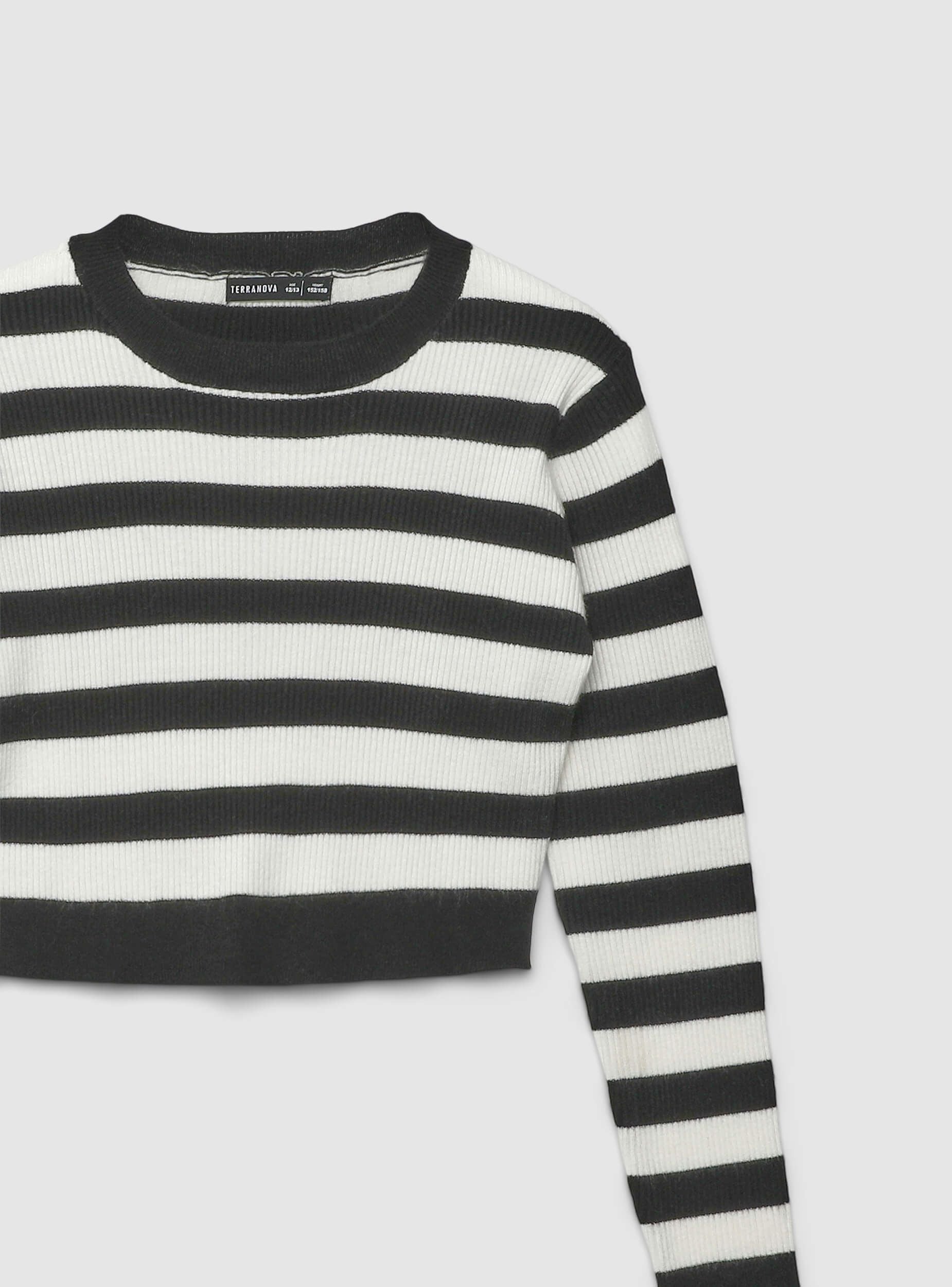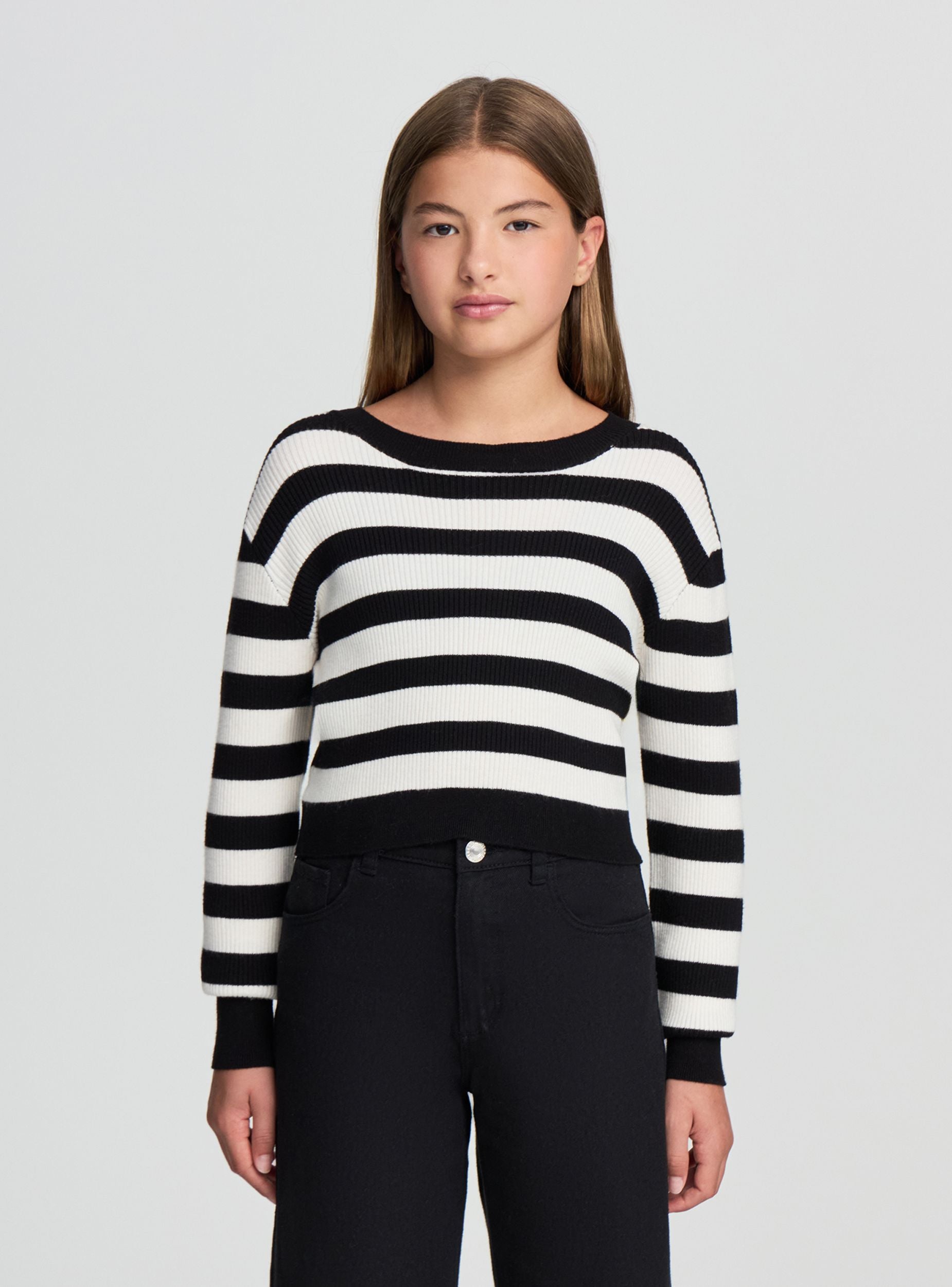 Detský sveter s dlhými rukávmi, ideálny pre neformálne a všestranné looky. Krátky strih zvýrazňuje moderné outfity, ideálne na kombinovanie s džínsami alebo sukňami s vysokým pásom. Okrúhly výstrih a rebrovaná textúra ponúkajú pohodlie a priliehavé nosenie. Pruhovaný vzor pridáva dynamický nádych, čo robí tento sveter vhodným ako do školy, tak na voľný čas.Detaily