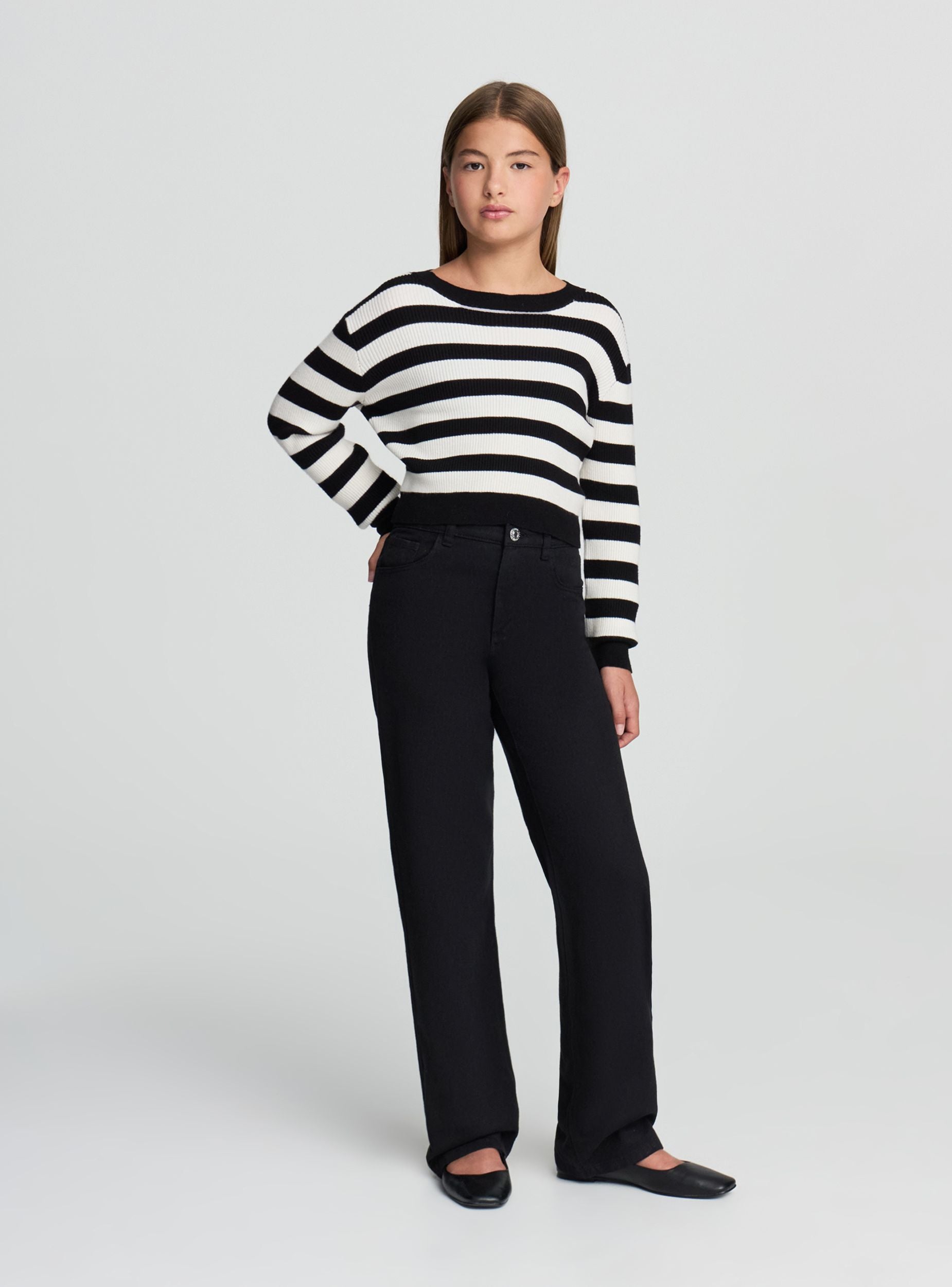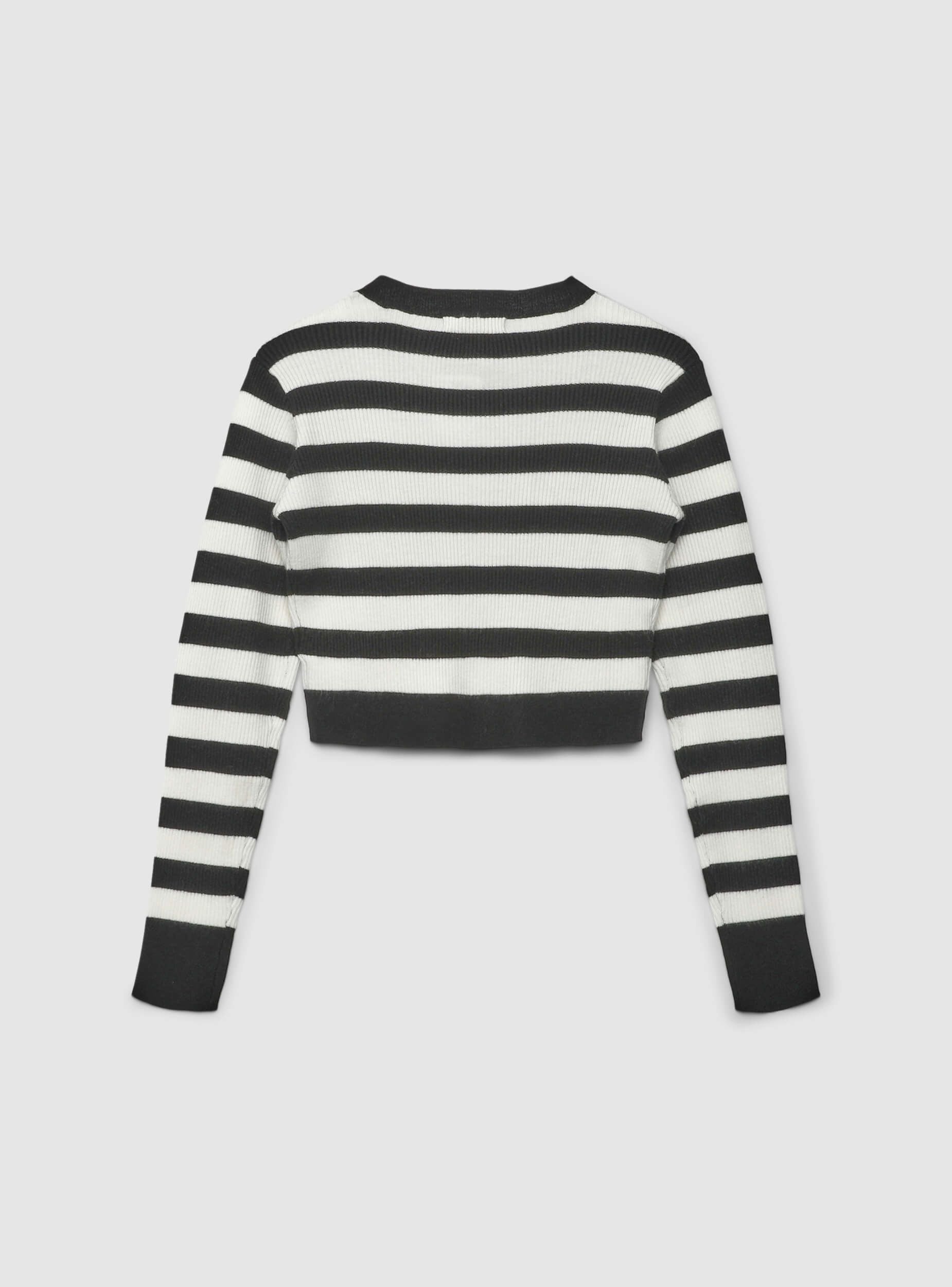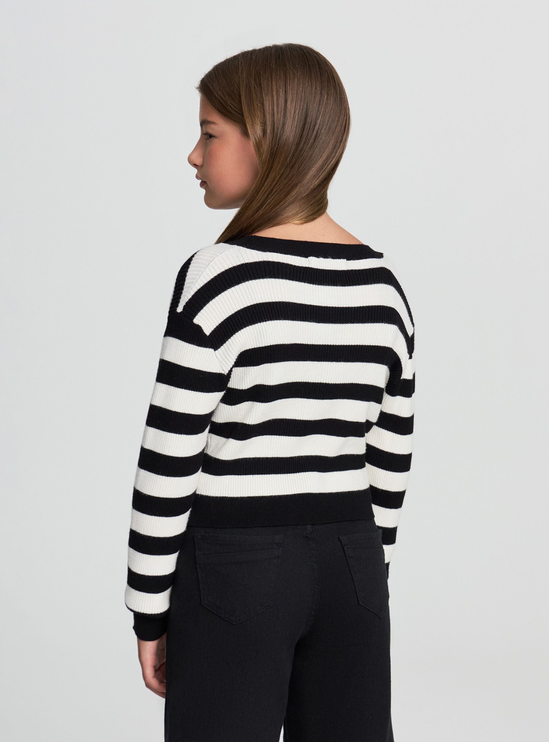 Detský sveter s dlhými rukávmi, ideálny pre neformálne a všestranné looky. Krátky strih zvýrazňuje moderné outfity, ideálne na kombinovanie s džínsami alebo sukňami s vysokým pásom. Okrúhly výstrih a rebrovaná textúra ponúkajú pohodlie a priliehavé nosenie. Pruhovaný vzor pridáva dynamický nádych, čo robí tento sveter vhodným ako do školy, tak na voľný čas.Detaily