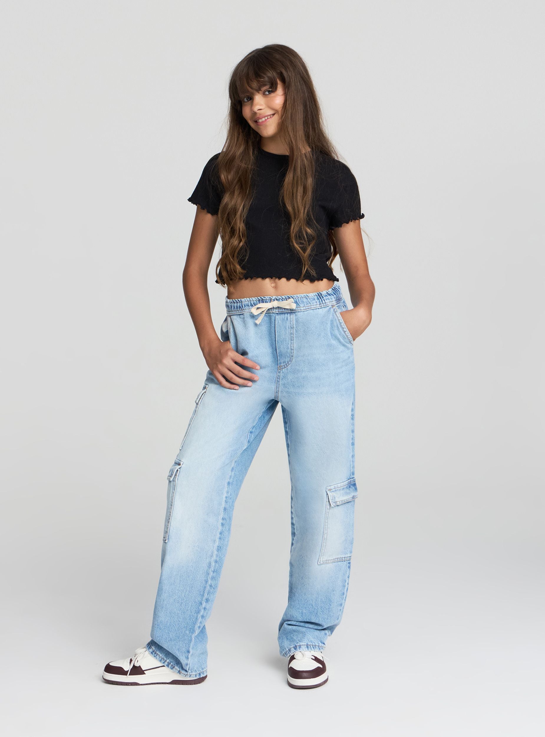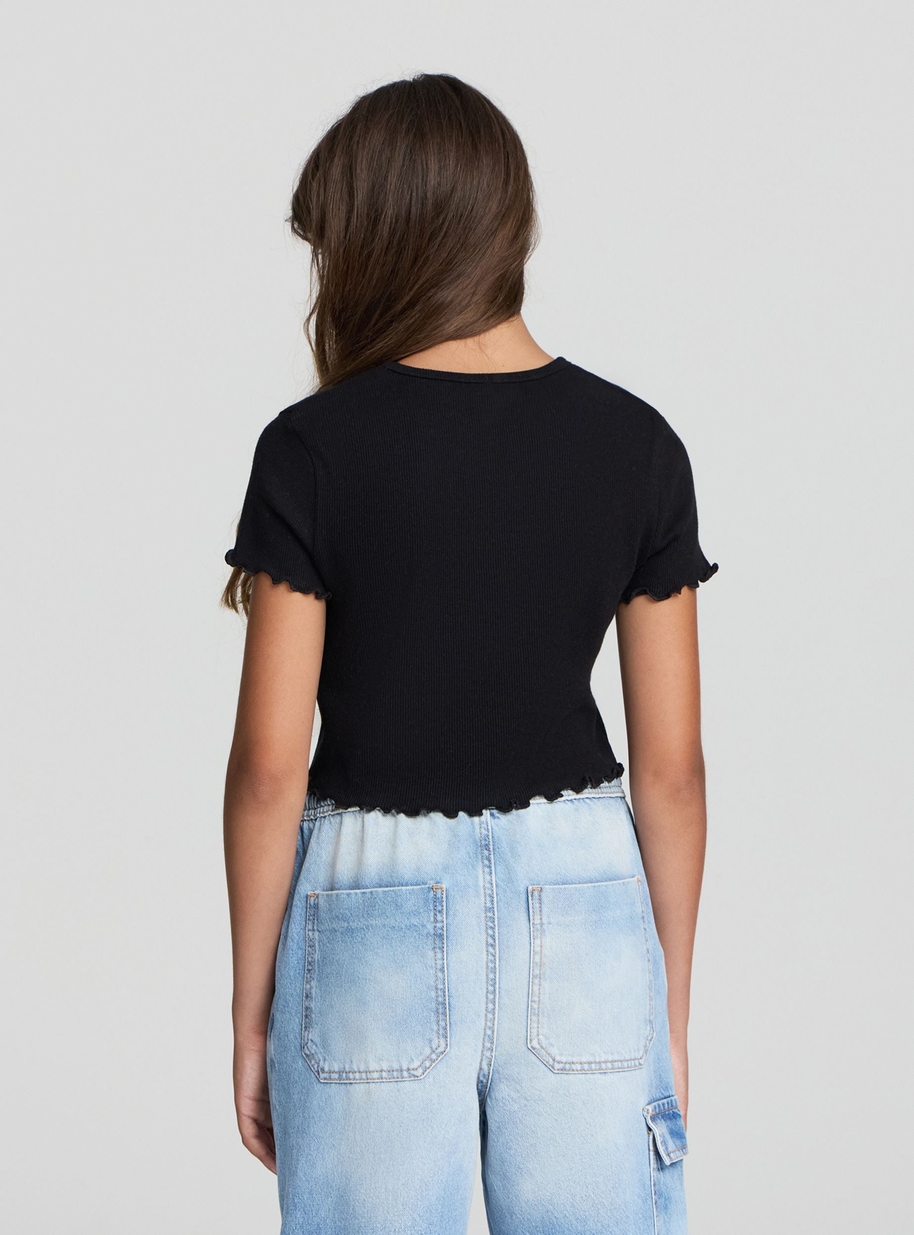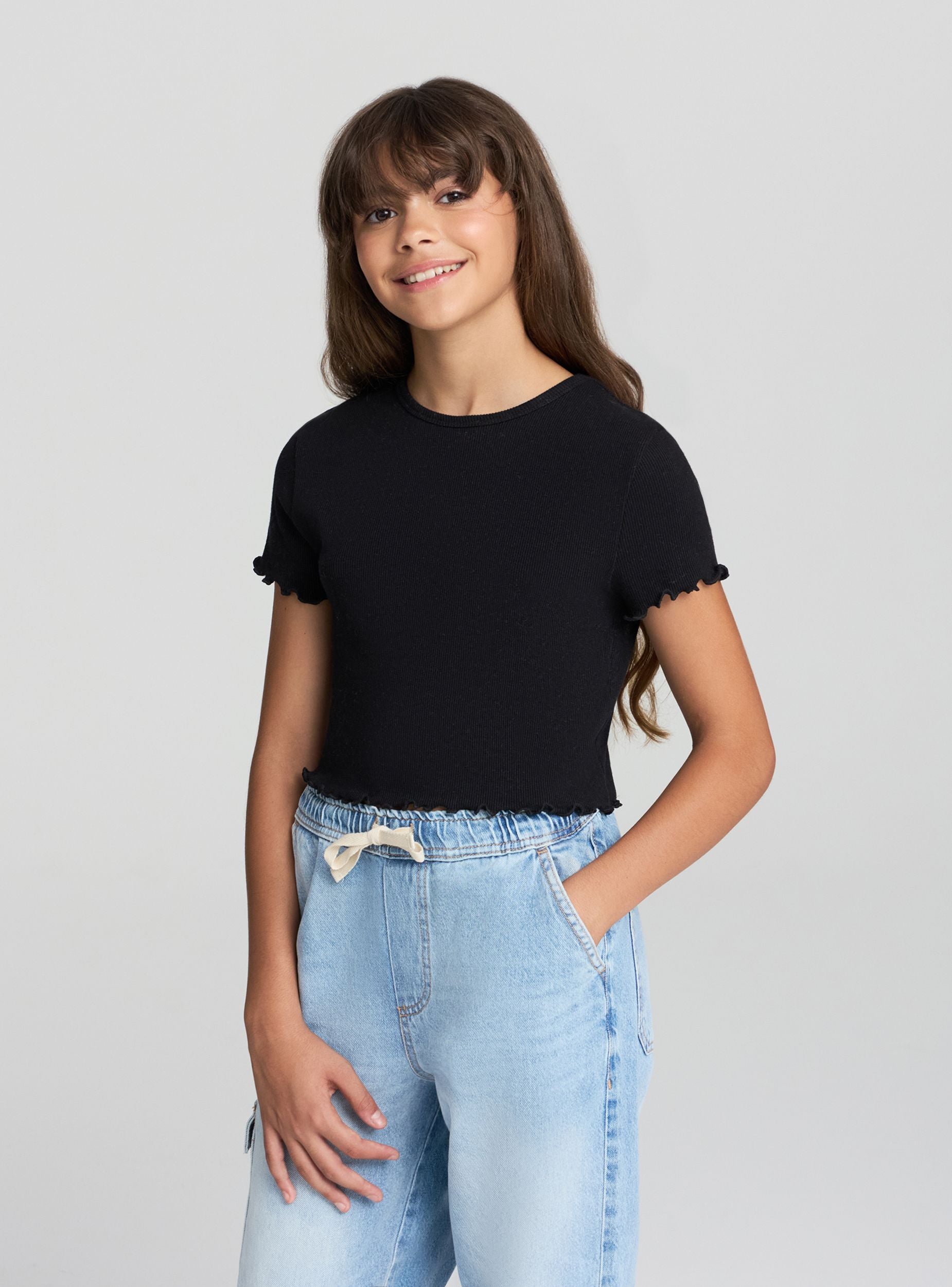 Dievčenské tričko s crop strihom, ideálne pre ležérny a moderný vzhľad. Perfektné na kombinovanie s džínsami alebo šortkami pre svieži a mladistvý outfit. Tričko má jednoduchý a všestranný dizajn s jednofarebnými rebrovanými detailmi, vhodné na rôzne neformálne príležitosti. Vďaka svojmu jednoduchému strihu je vhodné nosiť samostatne alebo pod ľahkou bundou.Detaily