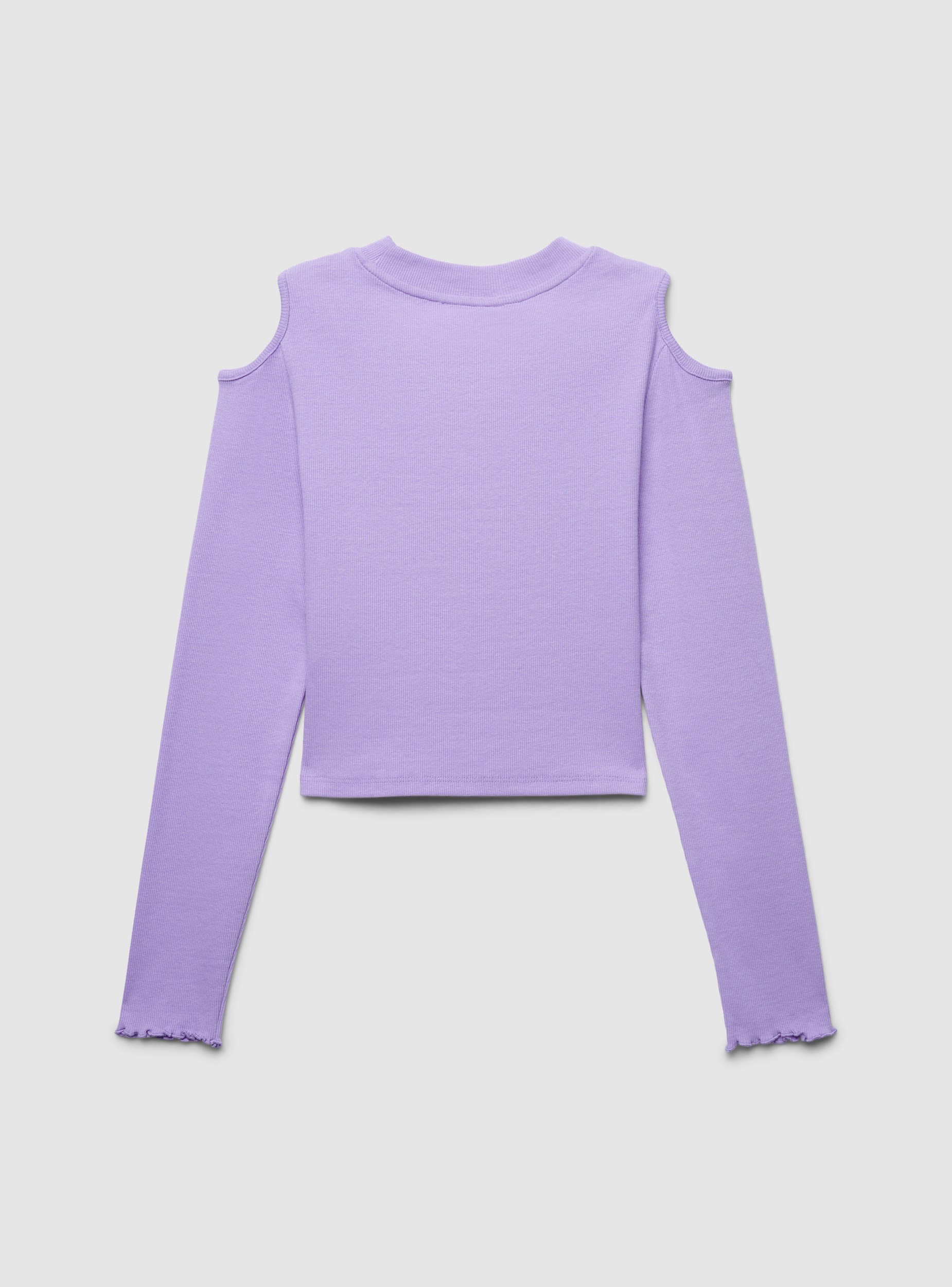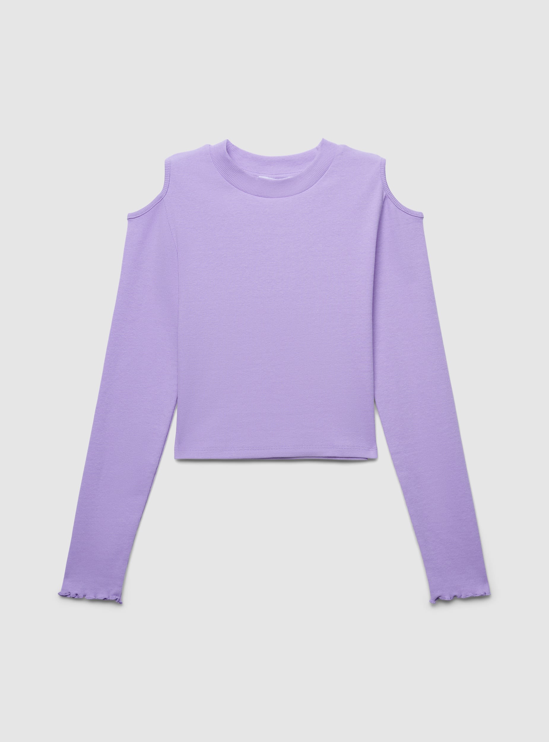 Dievčenské tričko s dlhými rukávmi a moderným dizajnom. Má detail s výrezom, ktorý odhaľuje plecia a pridáva jedinečný štýlový prvok. Ideálne pre ležérne a módne outfity, dokonale sa hodí k džínam alebo nohaviciam pre všestranný vzhľad. Crop strih vhodný na rôzne príležitosti. Vyrobené z jednofarebnej rebrovanej látky.
