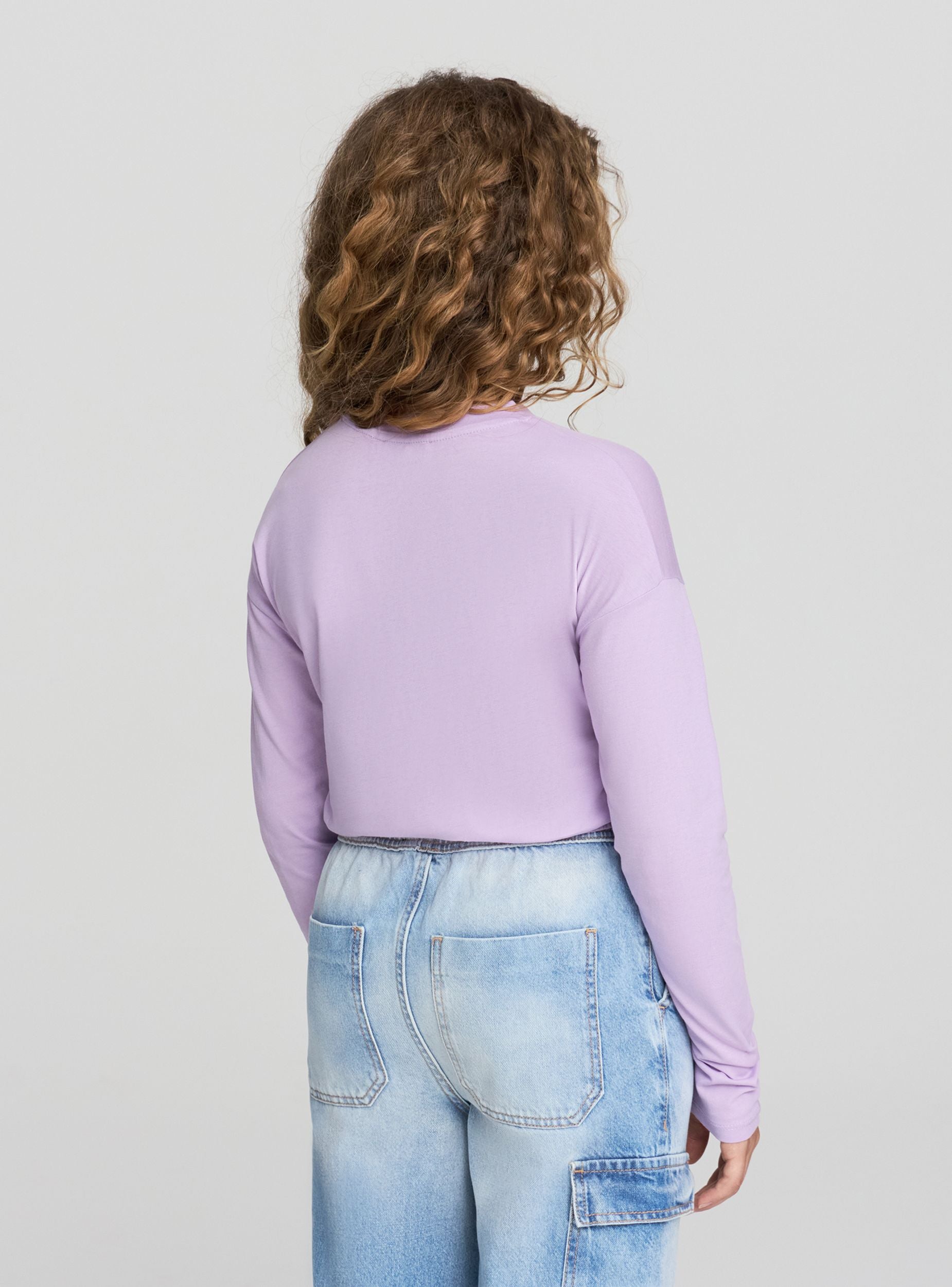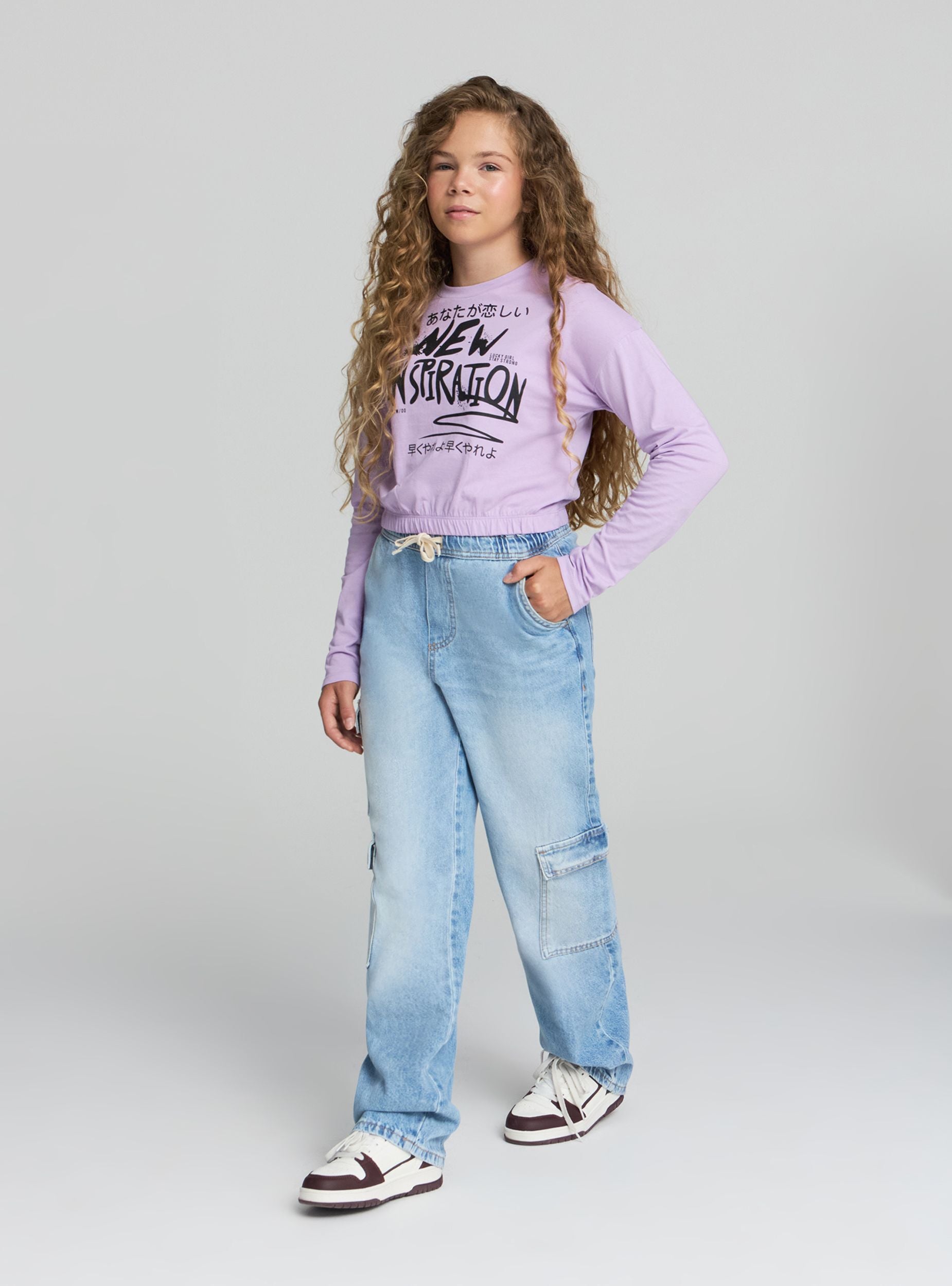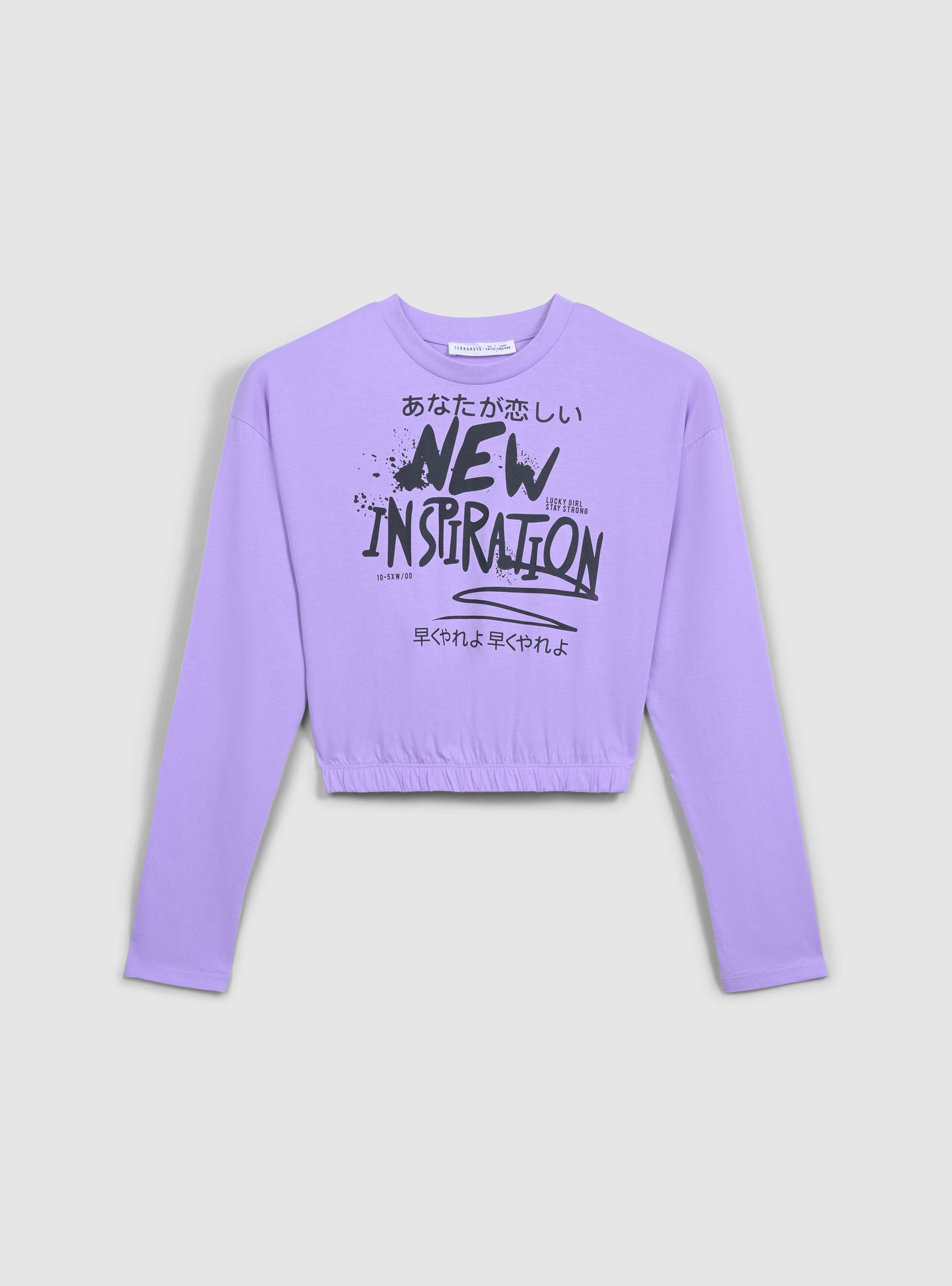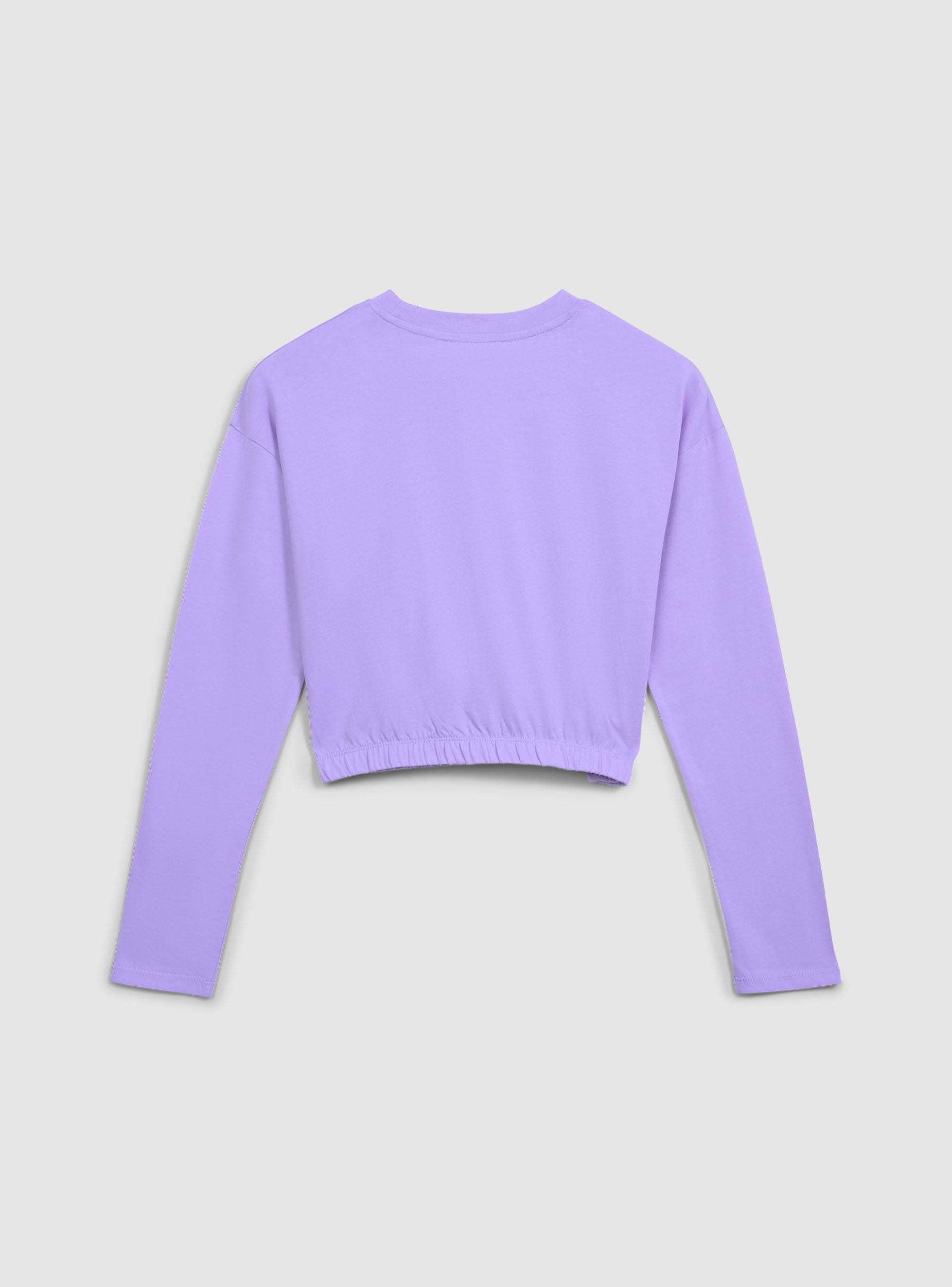Dievčenské tričko s dlhým rukávom a dekoratívnym nápisom v štýle graffiti na prednej strane. Má crop dizajn s elastickým pásom pre moderné a pohodlné nosenie. Ideálne na bežné a módne outfity, dokonale sa hodí k džínsom alebo športovým nohaviciam pre dynamický a mladistvý vzhľad.Detaily