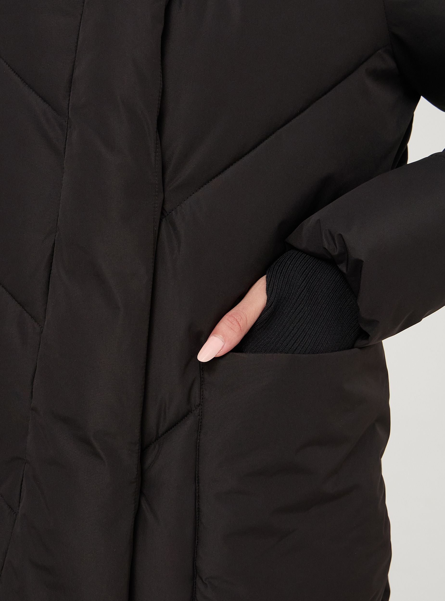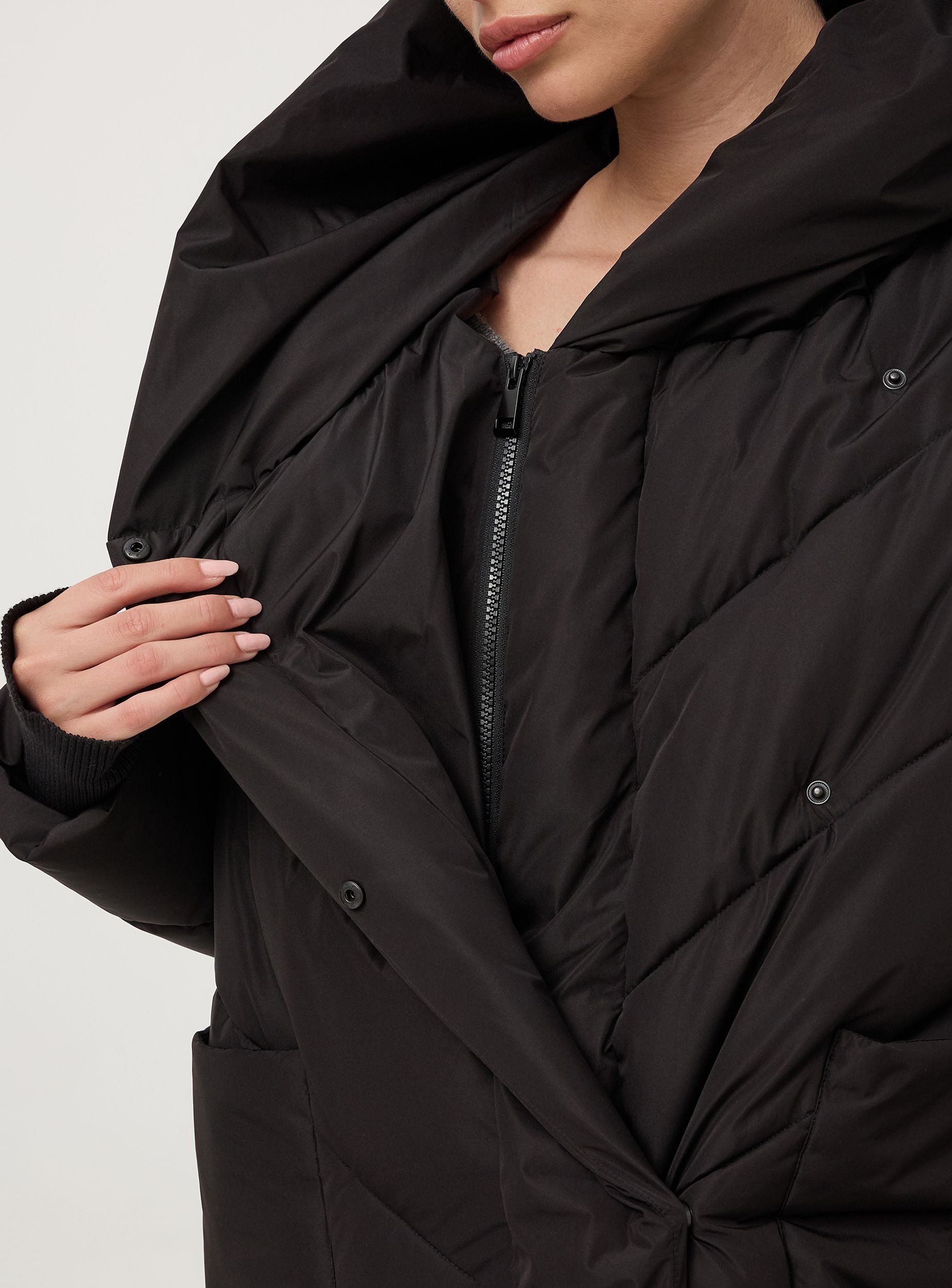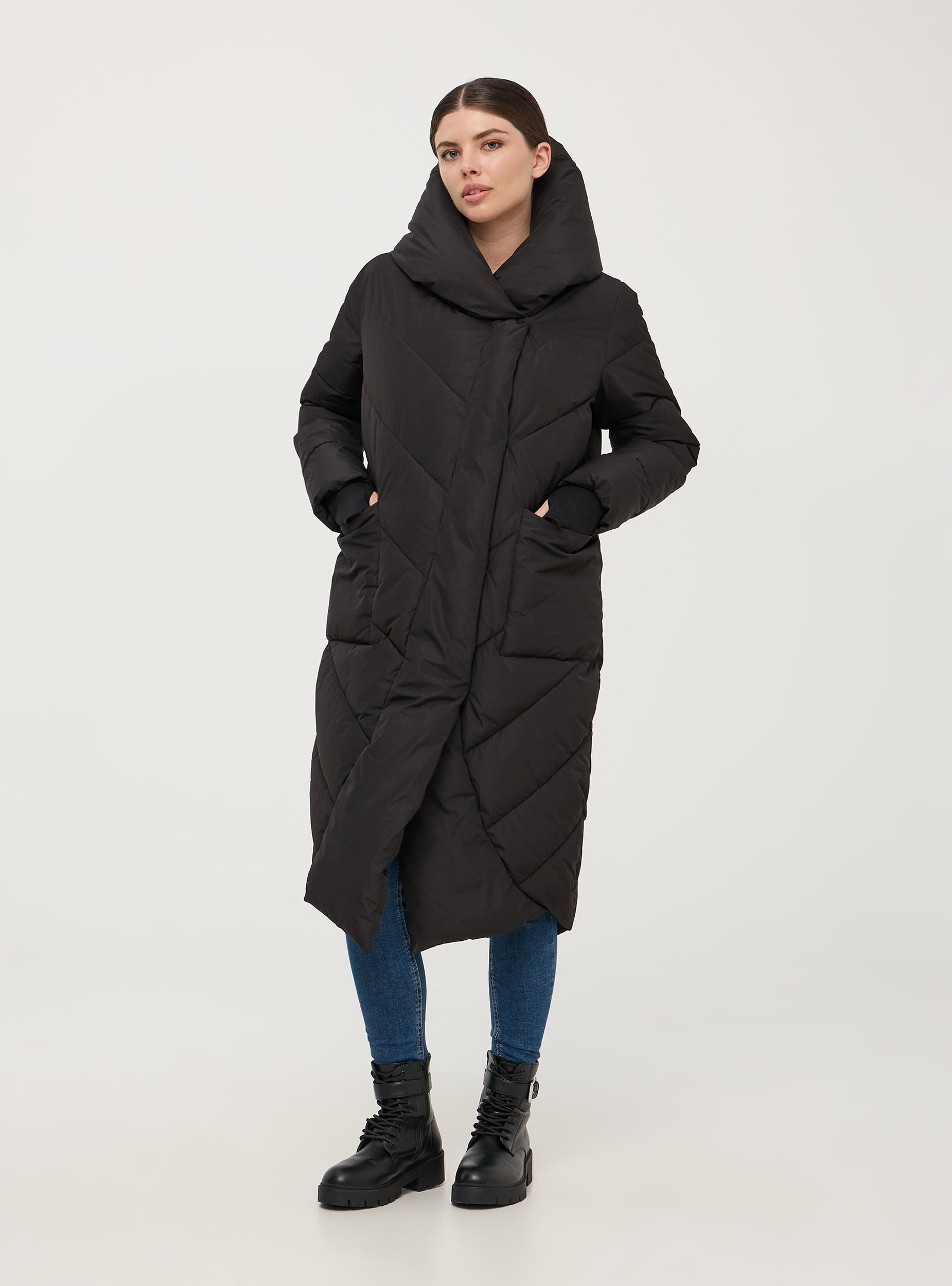 Dlhý dámsky nylonový kabát, charakterizovaný oversize strihom. Vyrobený z vypchávkového materiálu, má prešívaný dizajn s chevronovým vzorom. Veľká kapucňa poskytuje dodatočnú ochranu pred chladom. Dlhé rukávy sú vybavené elastickými manžetami na udržanie tepla. Kabát má dve veľké predné vrecká, praktické na uloženie základných vecí alebo na zahriatie rúk. Ideálny na zimné dni, kombinuje funkčnosť a ležérny štýl. Spodný okraj má špeciálny strih, ktorý dodáva kusu jedinečnosť a originalitu.