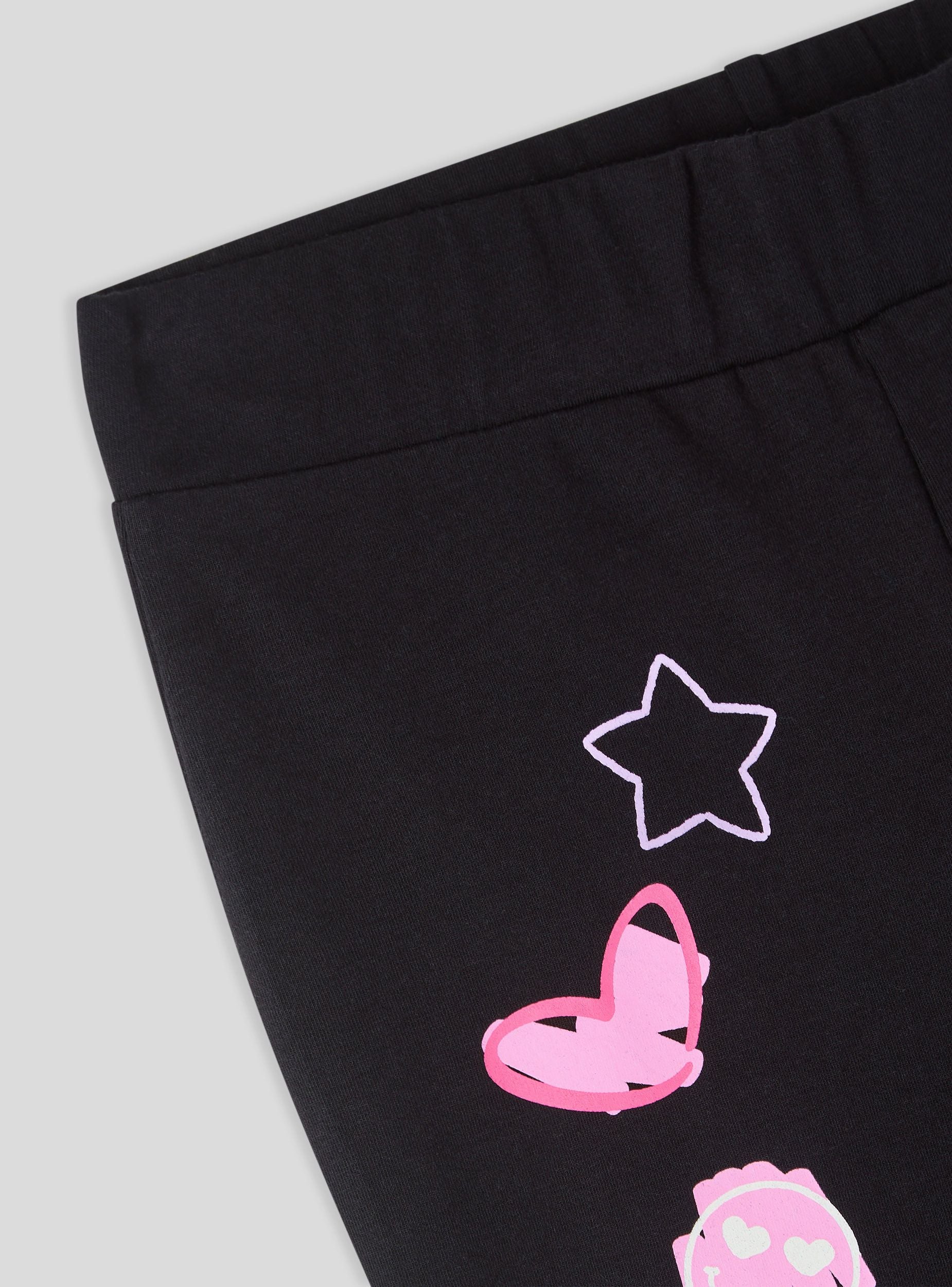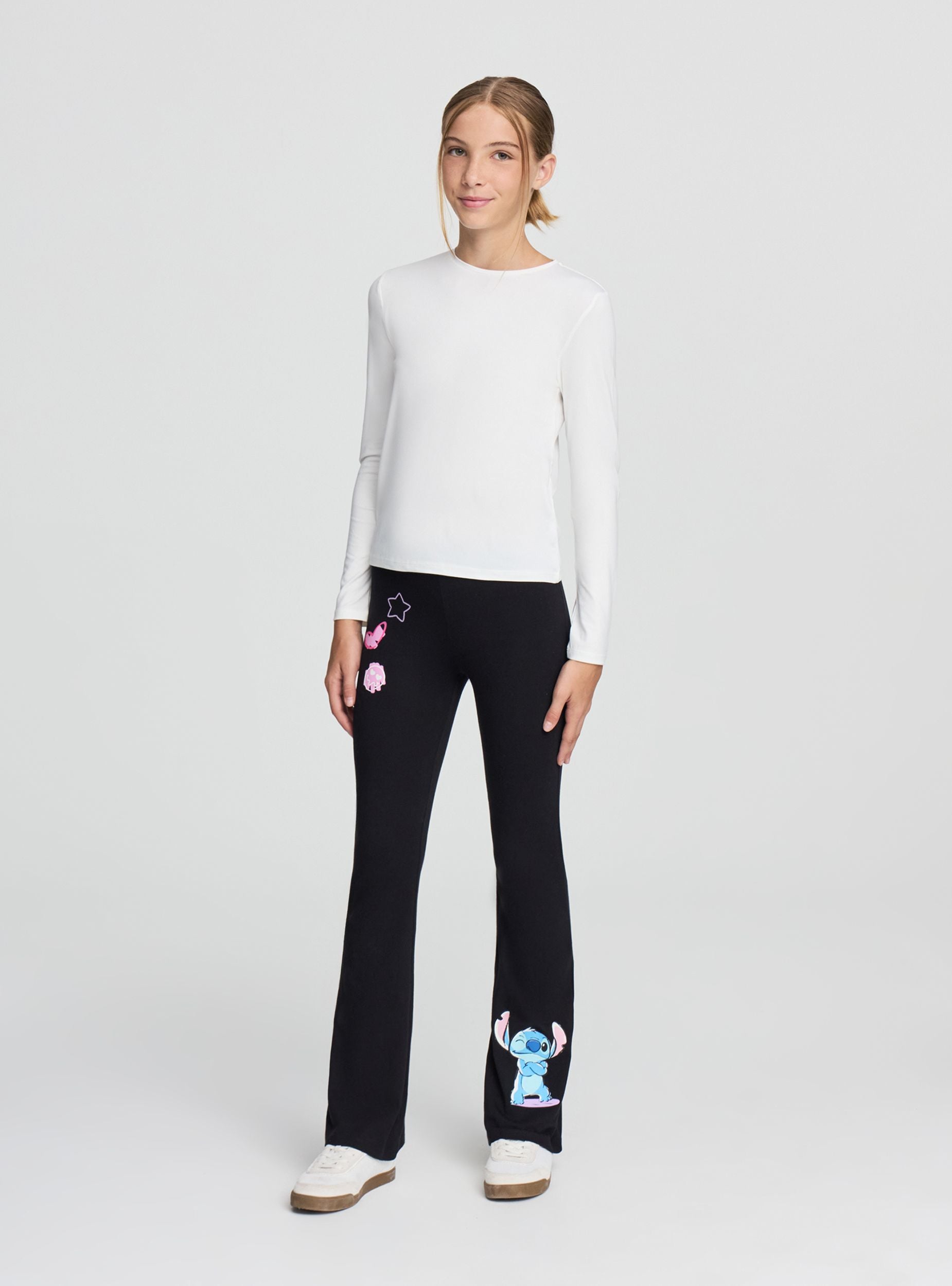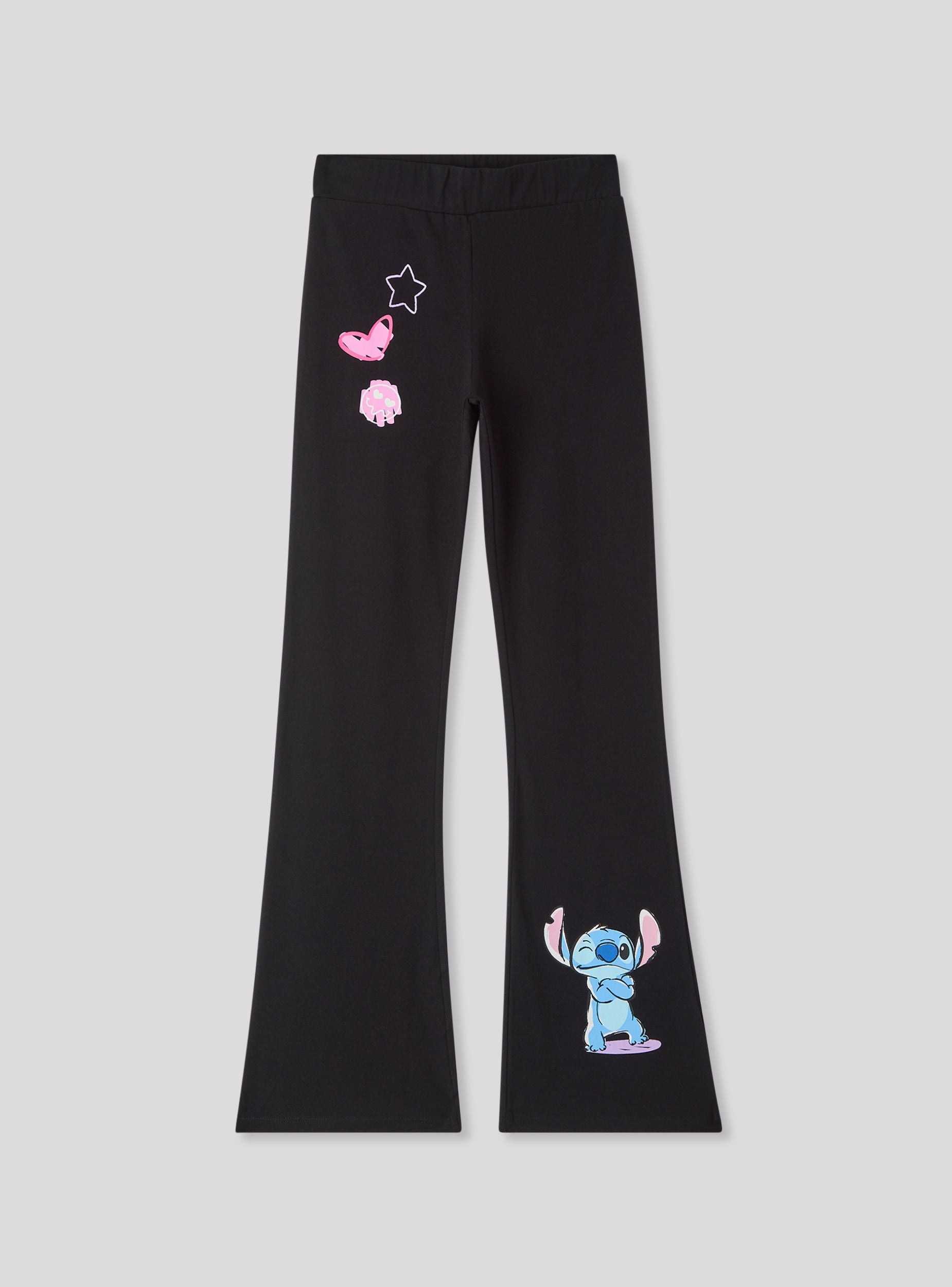 Legíny pre dievčatá ideálne na ležérne a dynamické vzhľady, perfektné do školy alebo na voľný čas. Model má pravidelný strih s nohavicami do zvonu, obohatený o farebné potlače a Stitch®. Ľahko sa kombinujú s mikinami alebo tričkami, ponúkajú pohodlie a slobodu pohybu pre každú každodennú príležitosť.Detaily