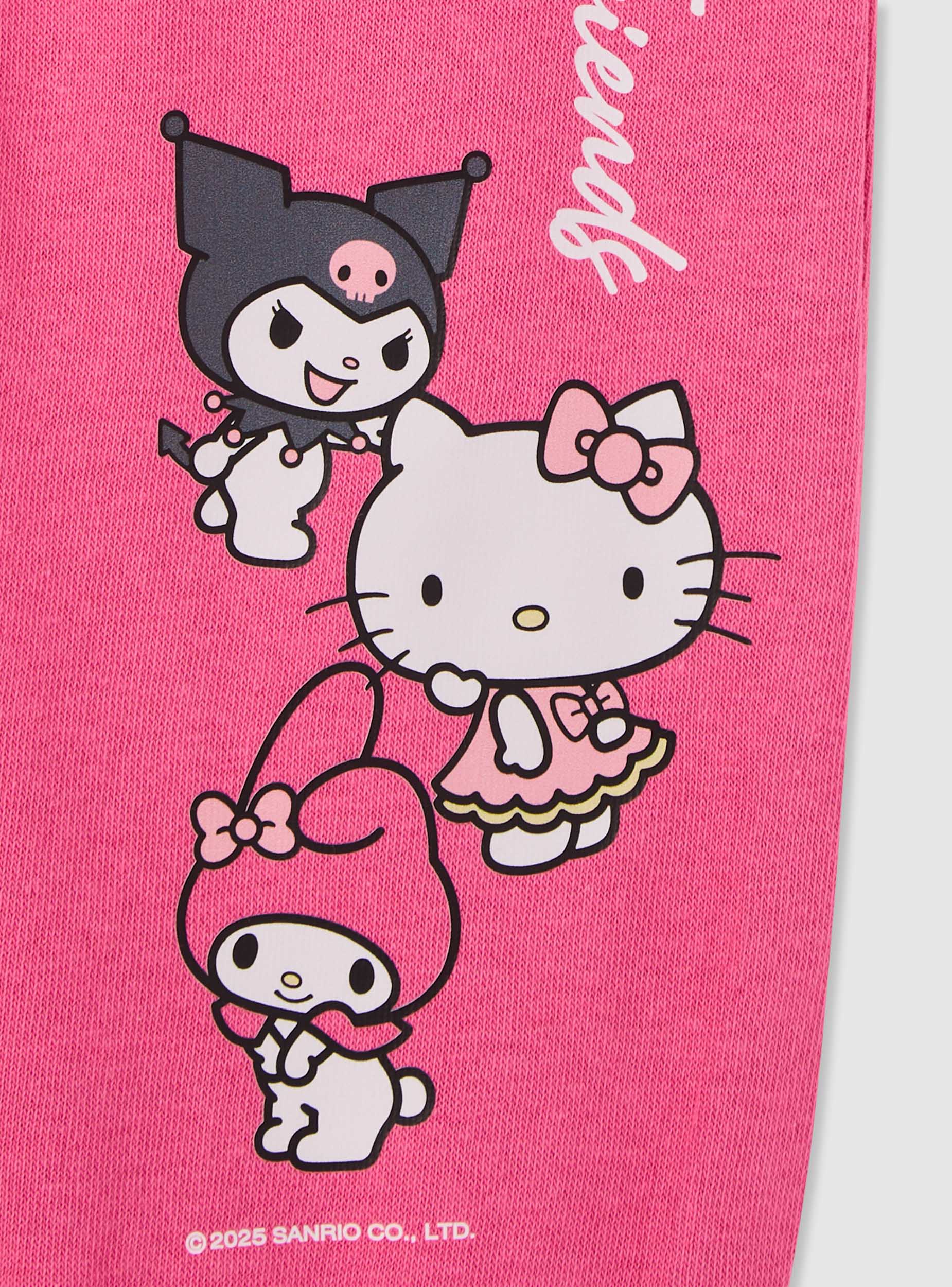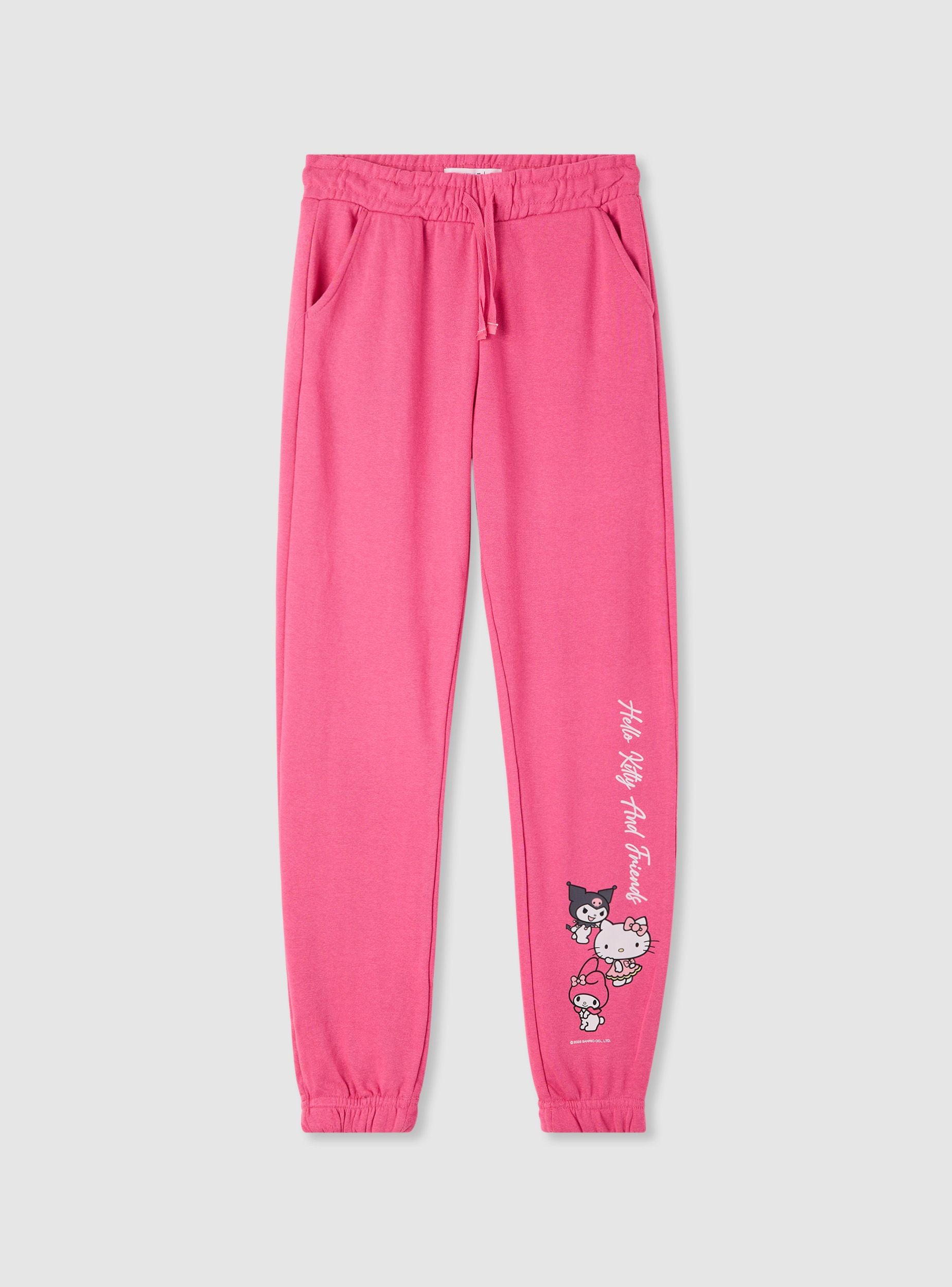 Dievčenské teplákové nohavice v jednofarebnom prevedení s potlačou Hello Kitty® na nohe. Dlhý model s nastaviteľným pásom na šnúrku a lemami na spodku nohavíc, ideálne do školy, na voľný čas a každodenné aktivity. Praktické šikmé bočné vrecká na malé predmety. Pohodlný regular strih, dokonale sa hodia s mikinou s kapucňou alebo tričkom a teniskami pre športový a zábavný vzhľad.Detaily