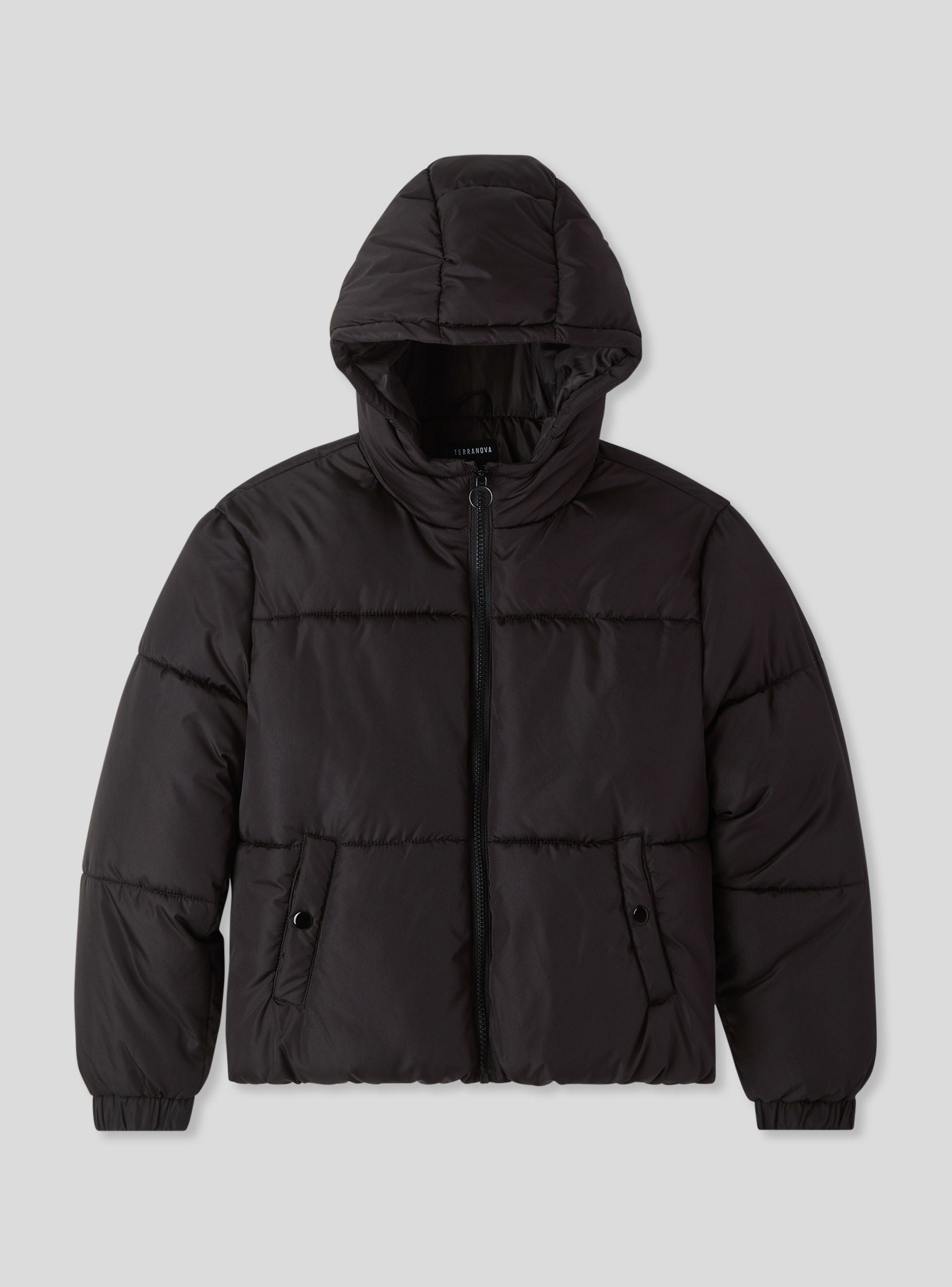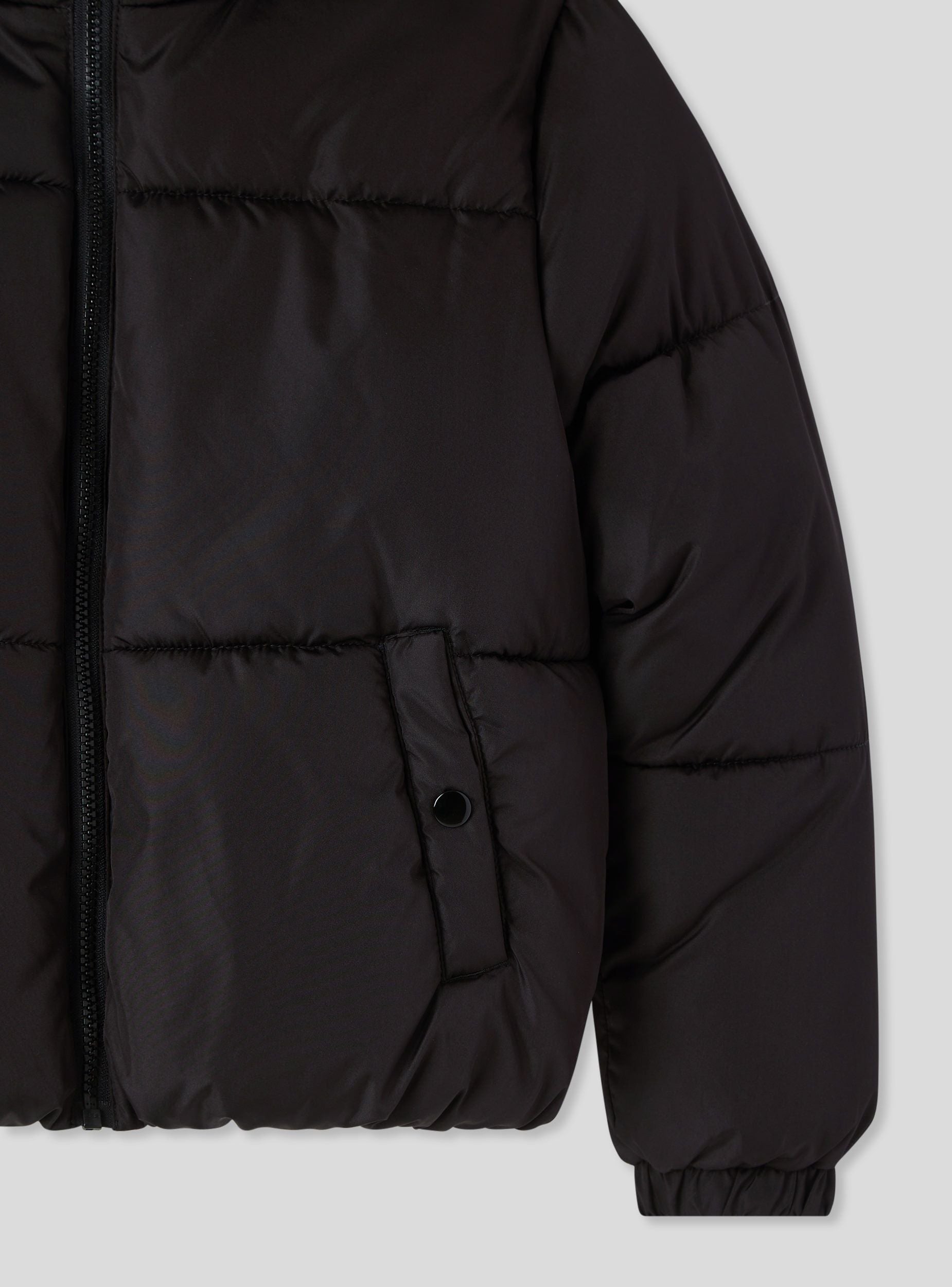 Detská prešívaná bunda, ideálna na chladné dni v meste a na voľný čas. Model s kapucňou, predným zipsom a bočnými vreckami so záklopkou a patentným gombíkom. Jednofarebný dizajn s moderným vzhľadom, ľahko kombinovateľný s džínsami, legínami alebo sukňami pre praktické a teplé outfity.Detaily