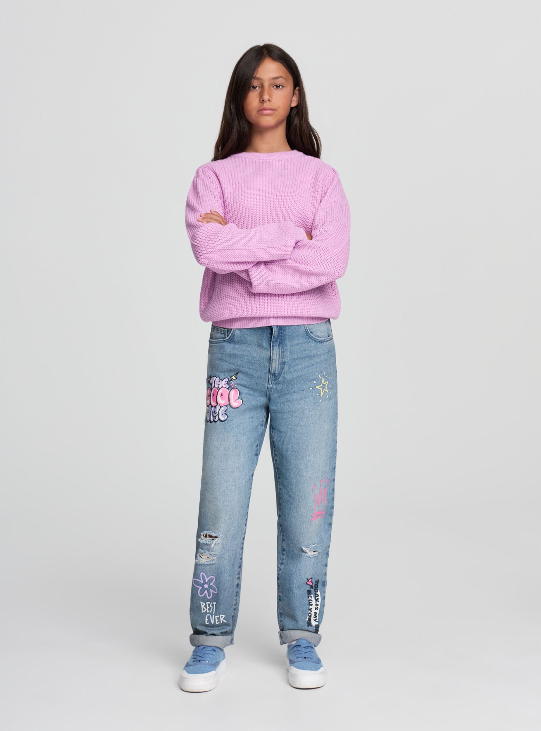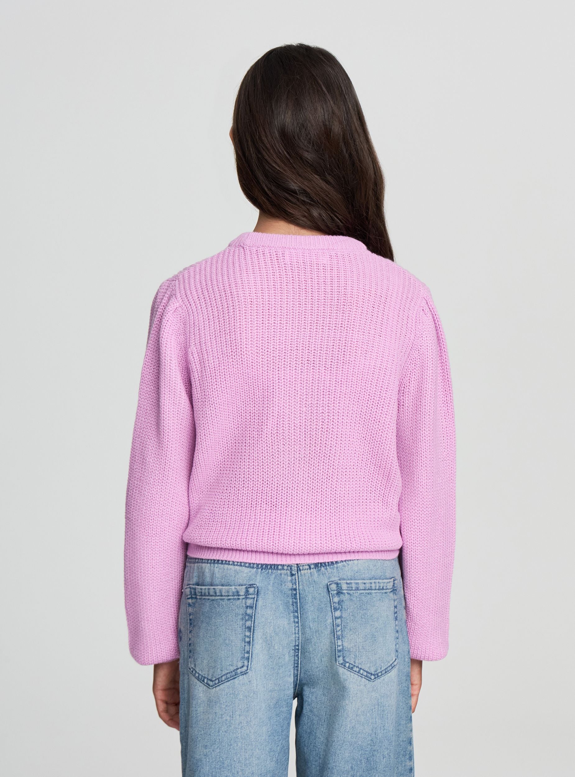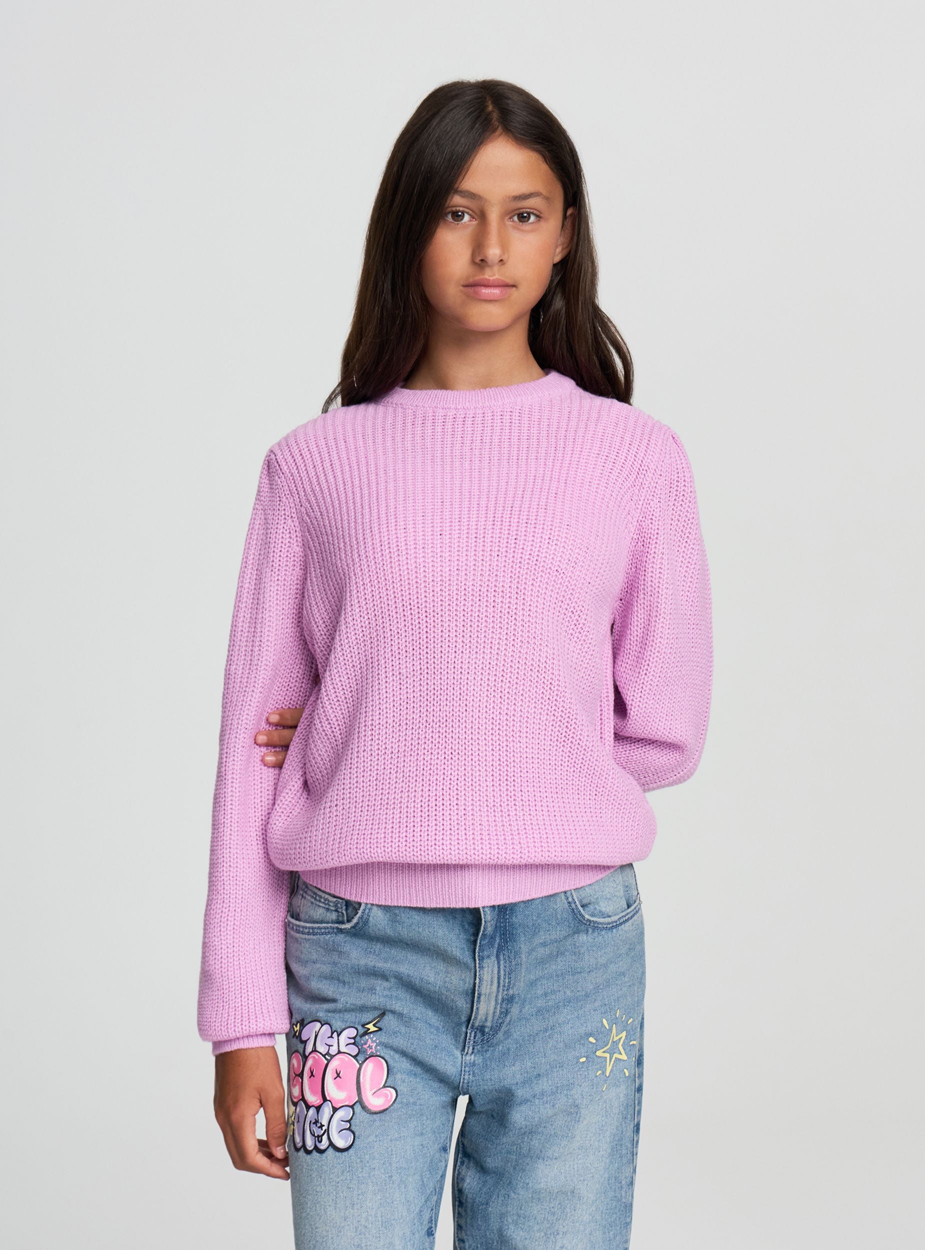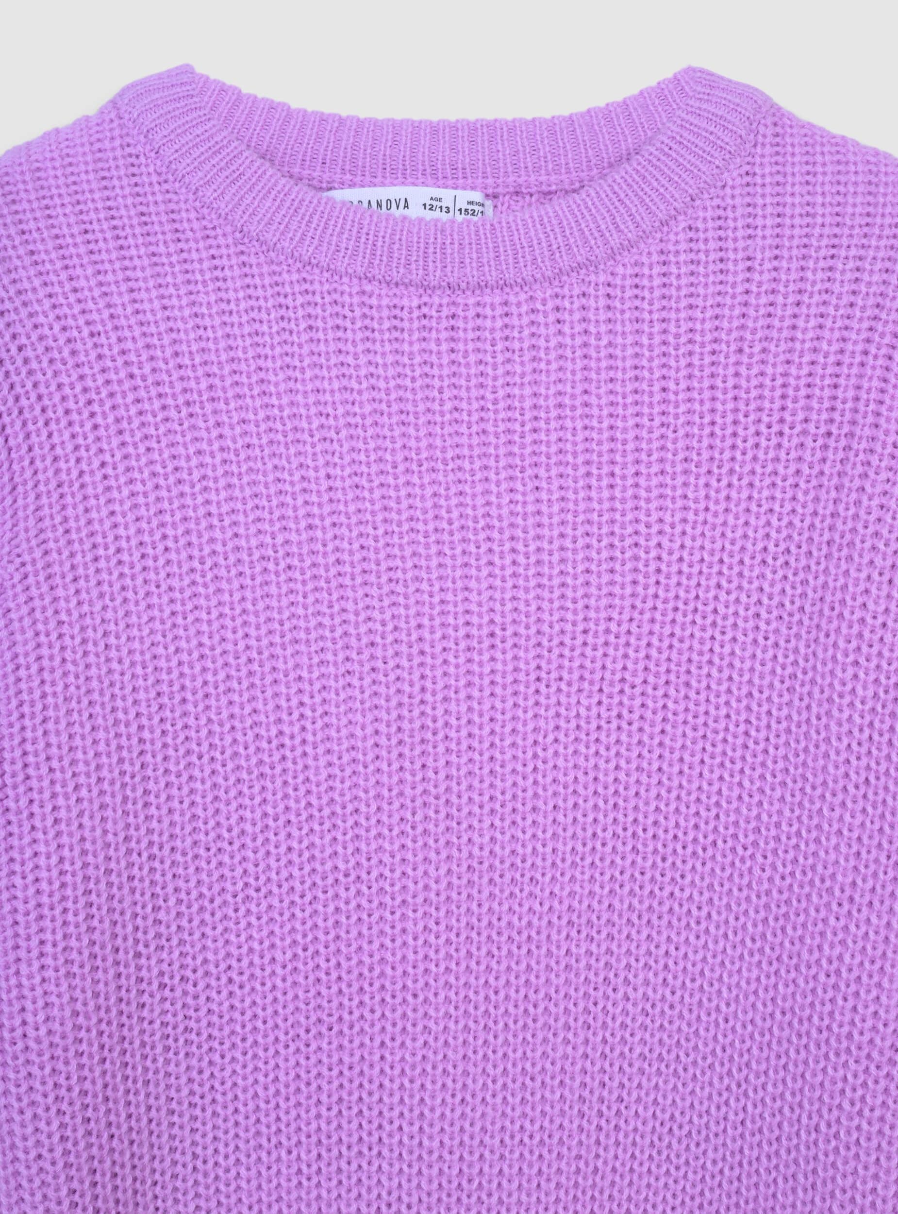 Dievčenský pulóver ideálny na ležérne a všestranné looky. Model má pletenú štruktúru, okrúhly výstrih a dlhé rukávy s rebrovanými manžetami. Regular fit ho robí dokonalým na nosenie do školy aj vo voľnom čase, v kombinácii s džínsami alebo sukňami. Jednoduchý dizajn v jednofarebnej variante zvýrazňuje každý outfit, pričom ponúka pohodlie a praktickosť pri každej príležitosti.