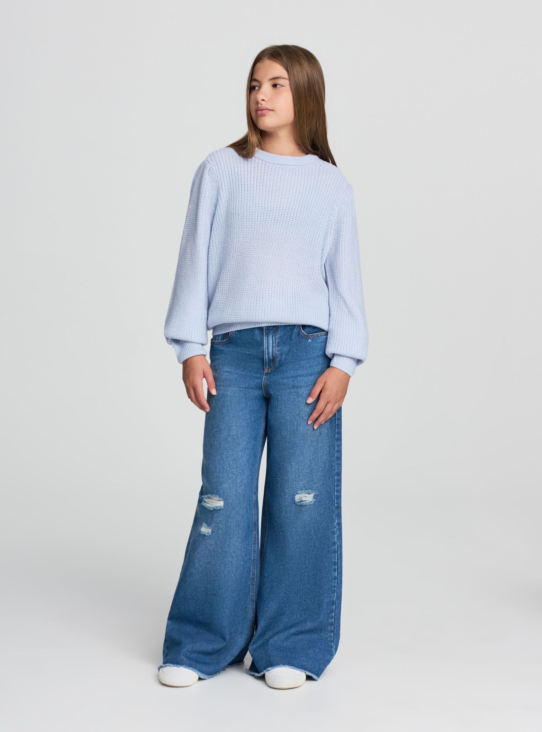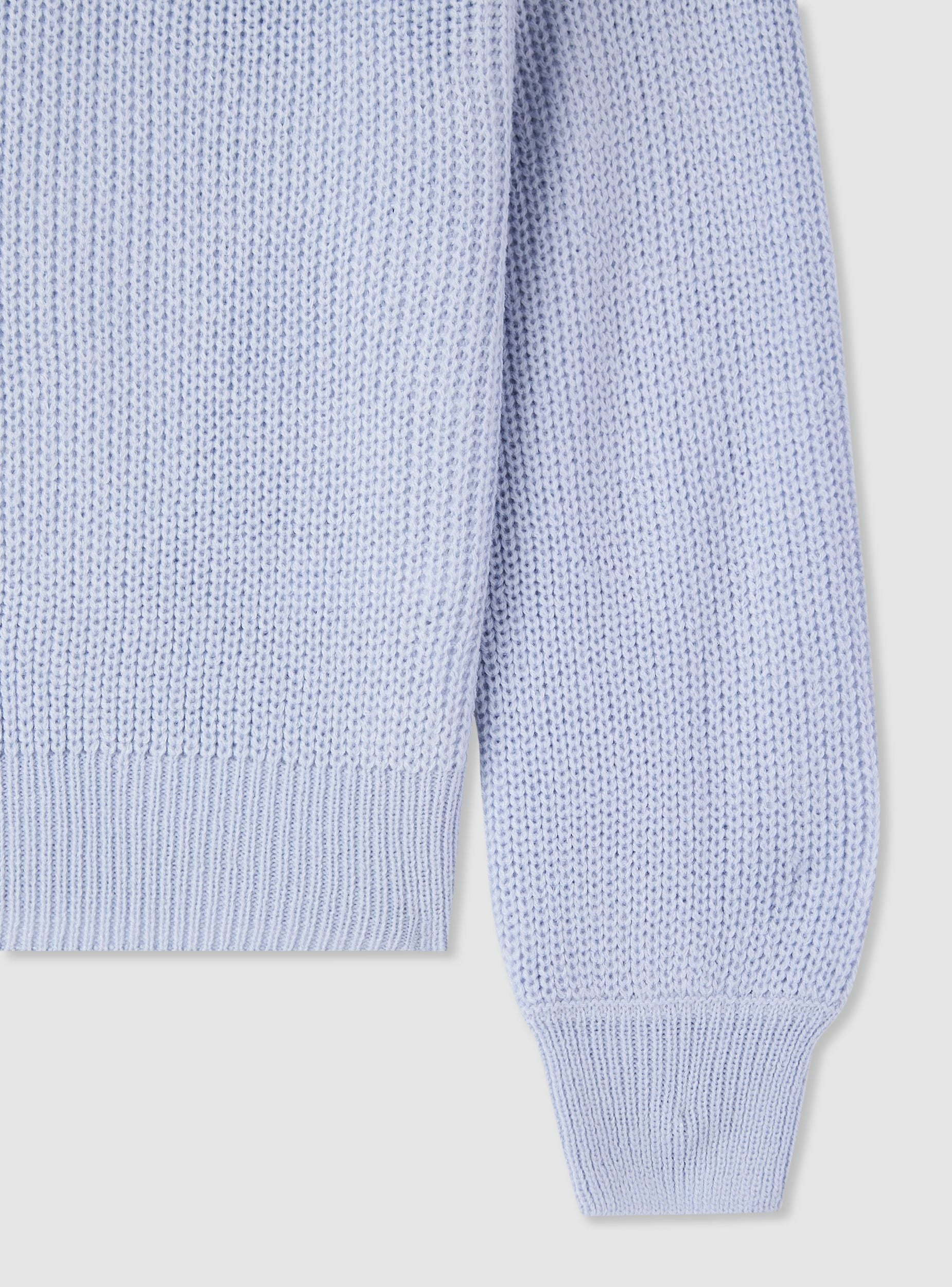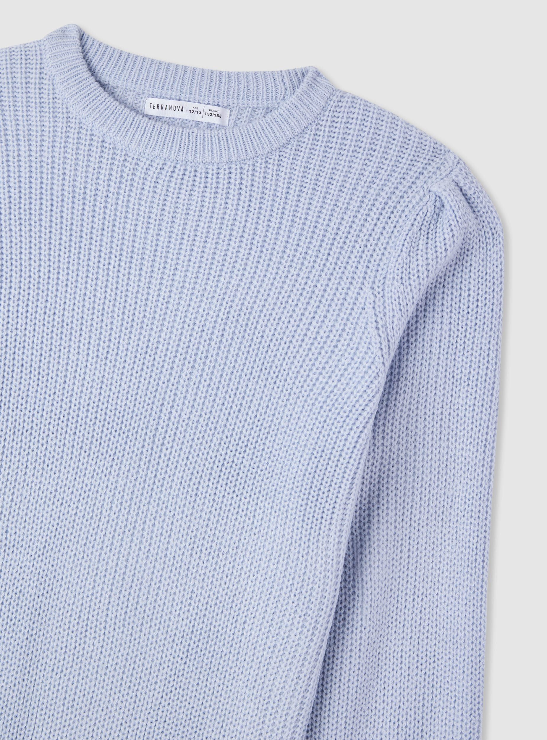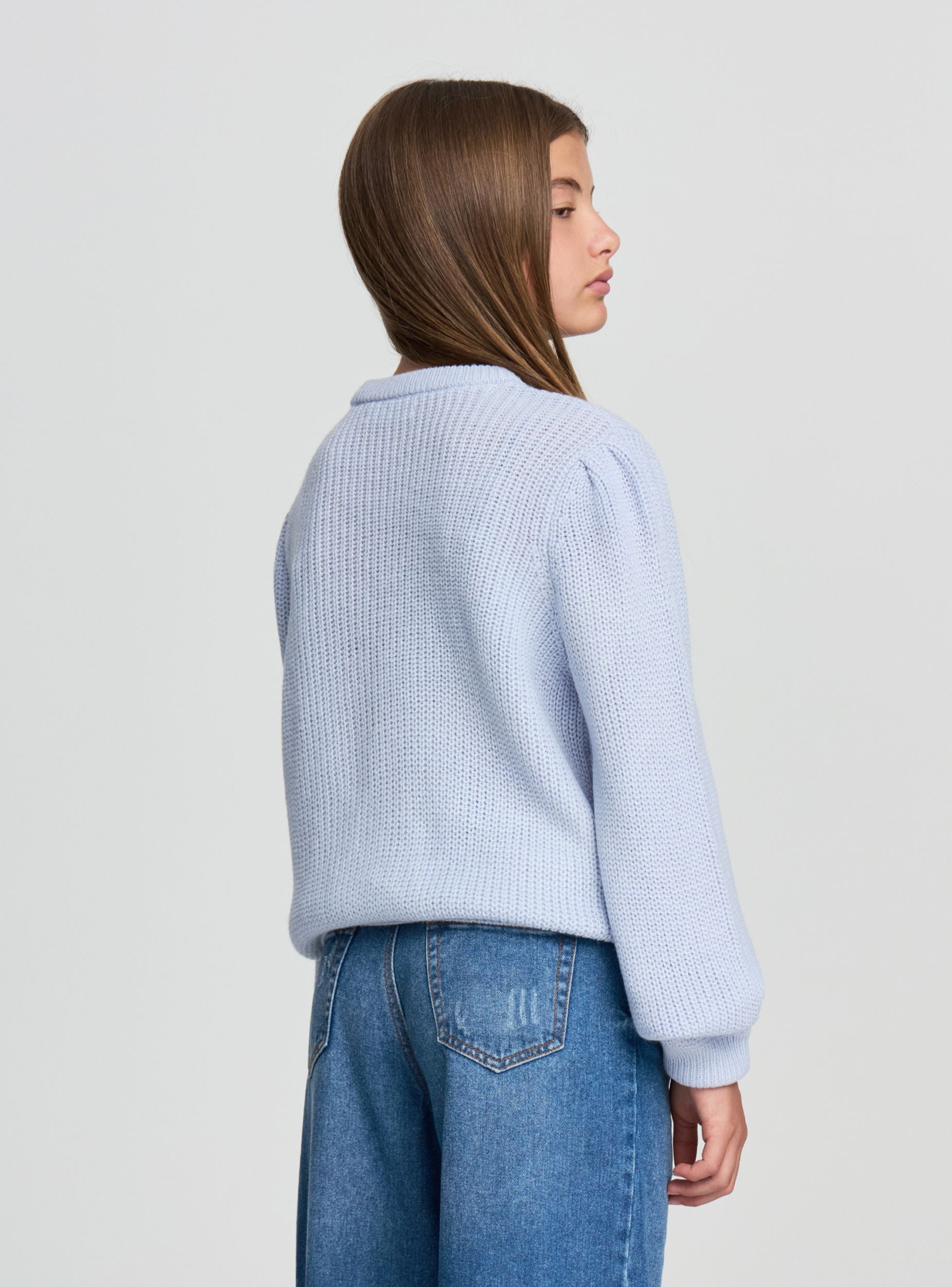 Detský sveter ideálny na neformálne a všestranné outfity. Model má pletenú štruktúru, okrúhly výstrih a dlhé rukávy s rebrovanými manžetami. Regular fit ho robí dokonalým na nosenie do školy aj vo voľnom čase, v kombinácii s džínami alebo sukňami. Jednoduchý dizajn v jednofarebnom prevedení zvýrazňuje každý outfit, poskytujúc pohodlie a praktickosť pri každej príležitosti.Detaily