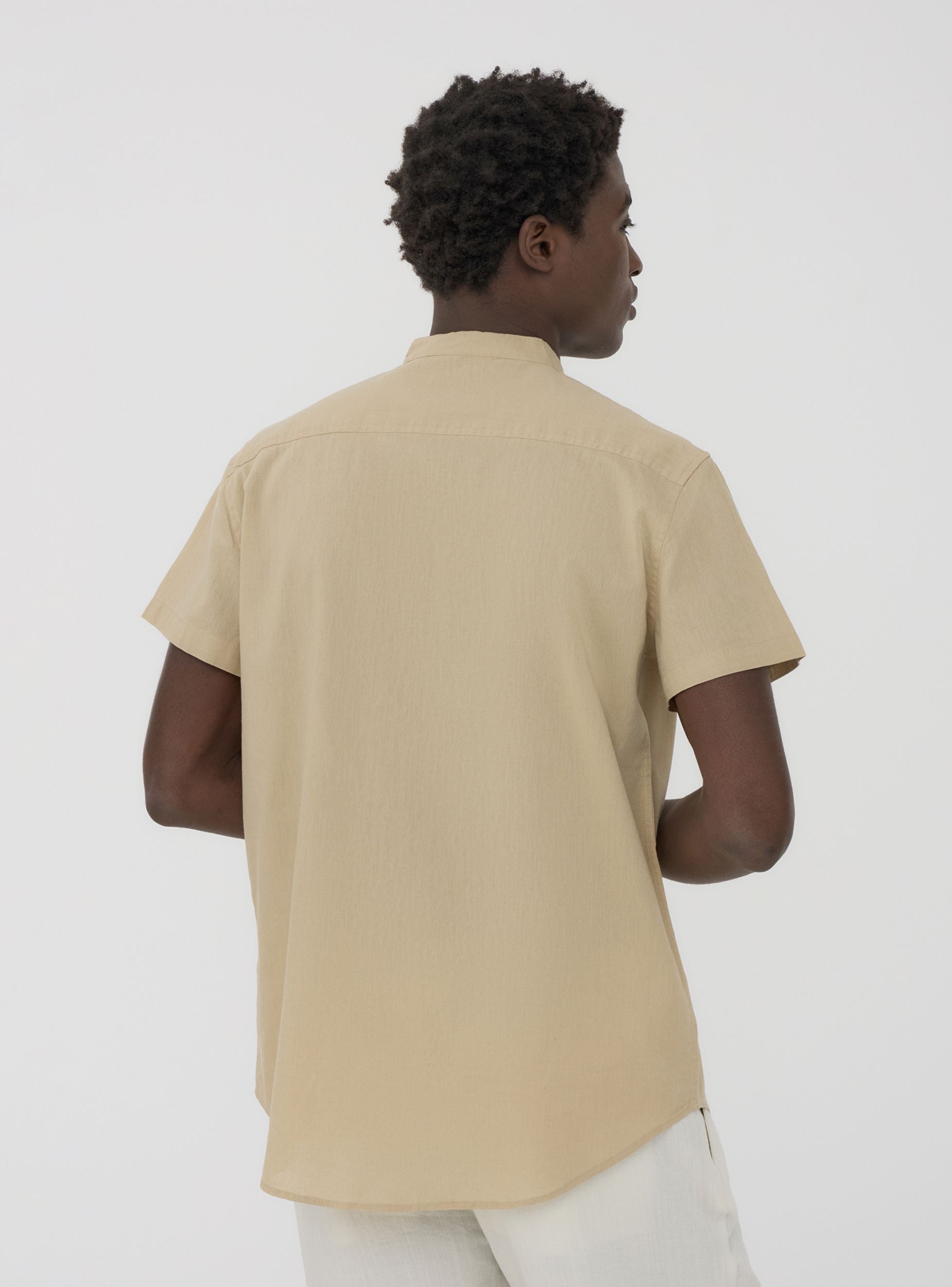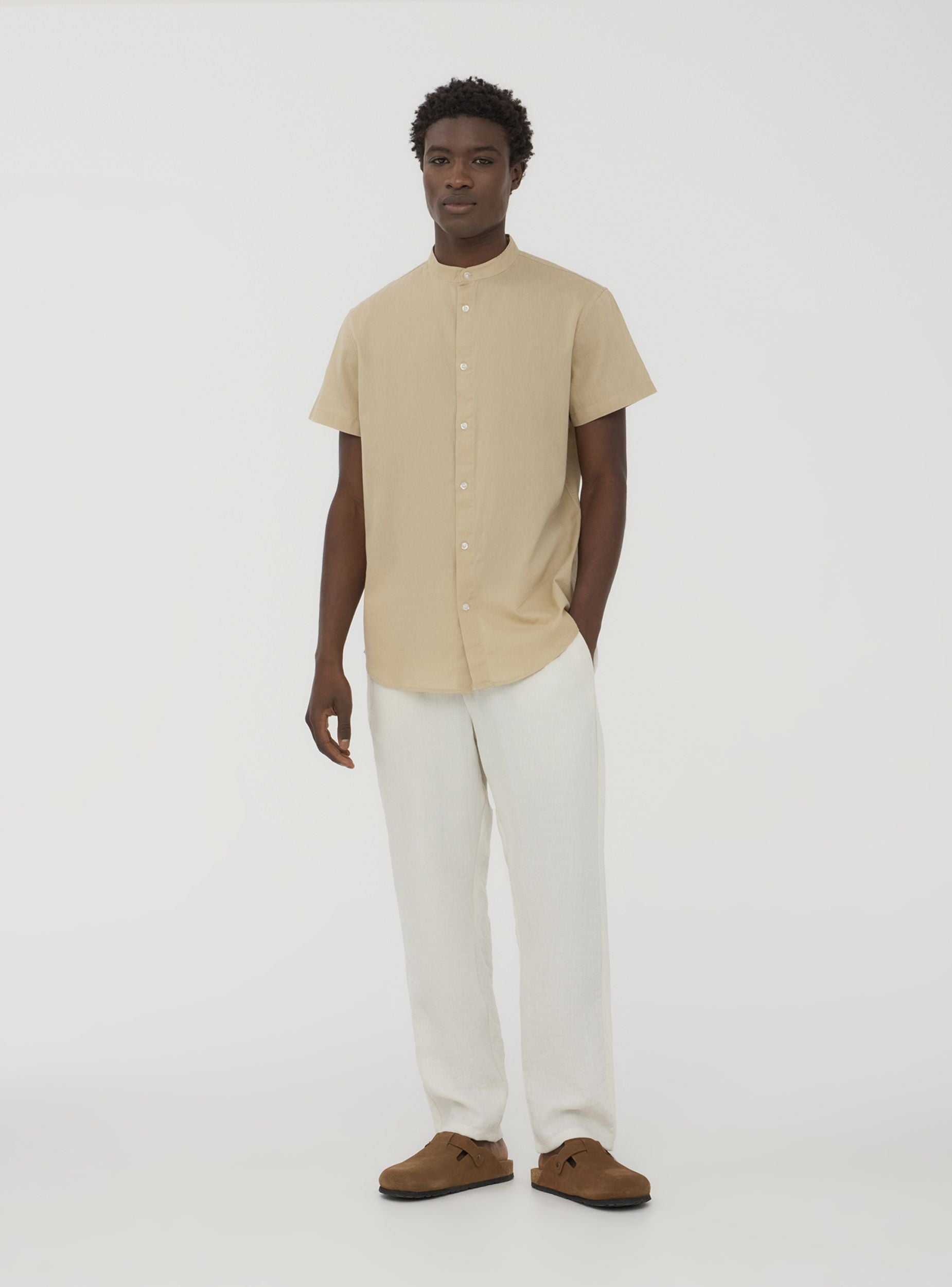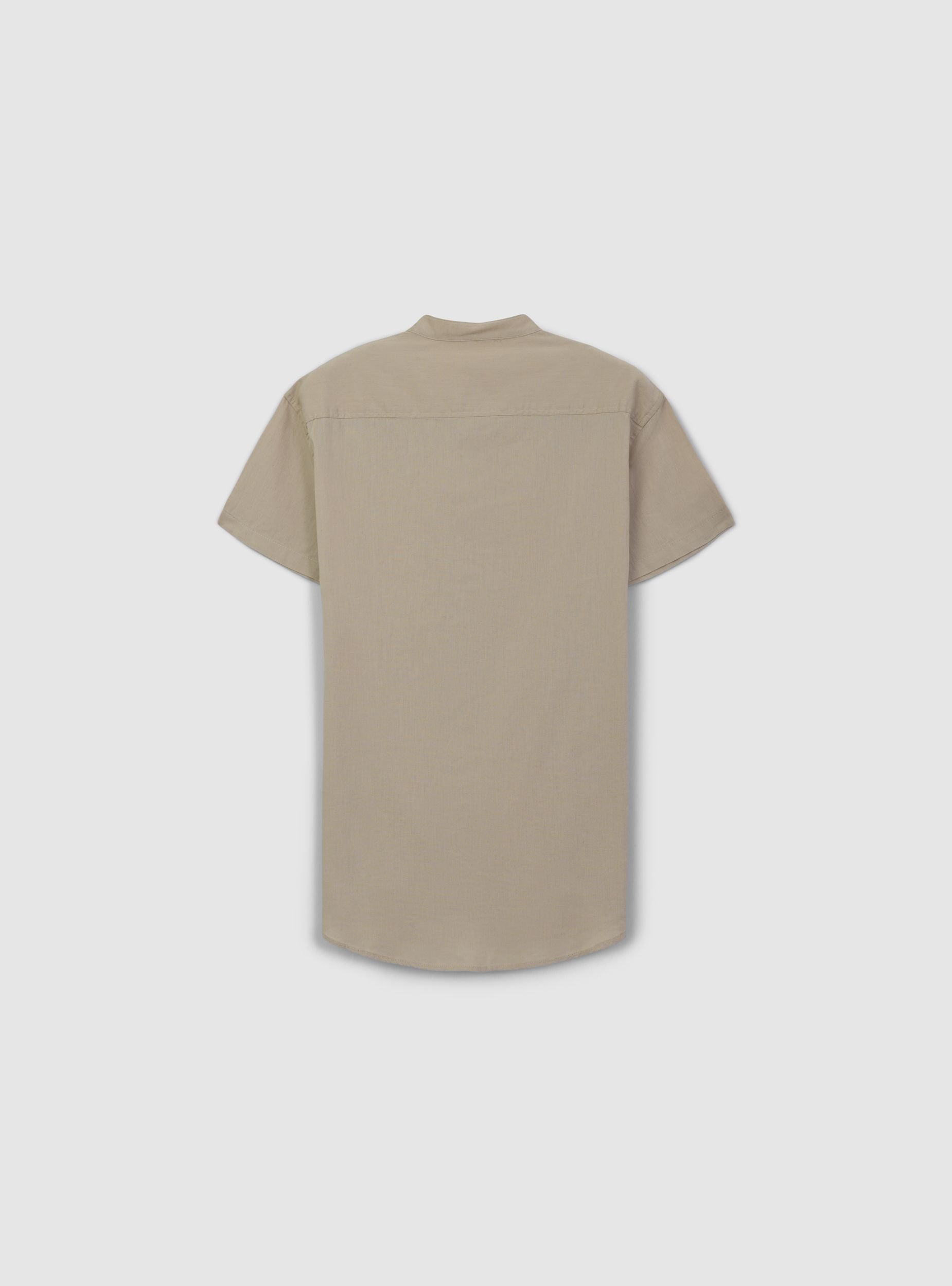 Pánska košeľa z kombinácie ľanu v jednofarebnom prevedení, ideálna pre svieži a rafinovaný vzhľad. Dizajn s kórejským golierom pridáva moderný a základný dotyk, zatiaľ čo predné zapínanie na gombíky zvyšuje praktickosť a štýl. Krátke rukávy ju robia ideálnou na teplejšie obdobie, zabezpečujúc pohodlie a ľahkosť. Univerzálny kúsok, vhodný na rôzne príležitosti, od ležérneho po viac elegantný.Detaily
