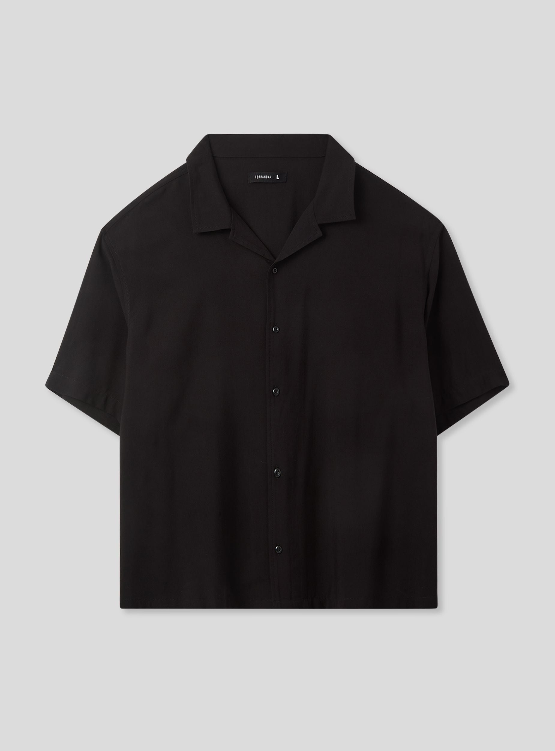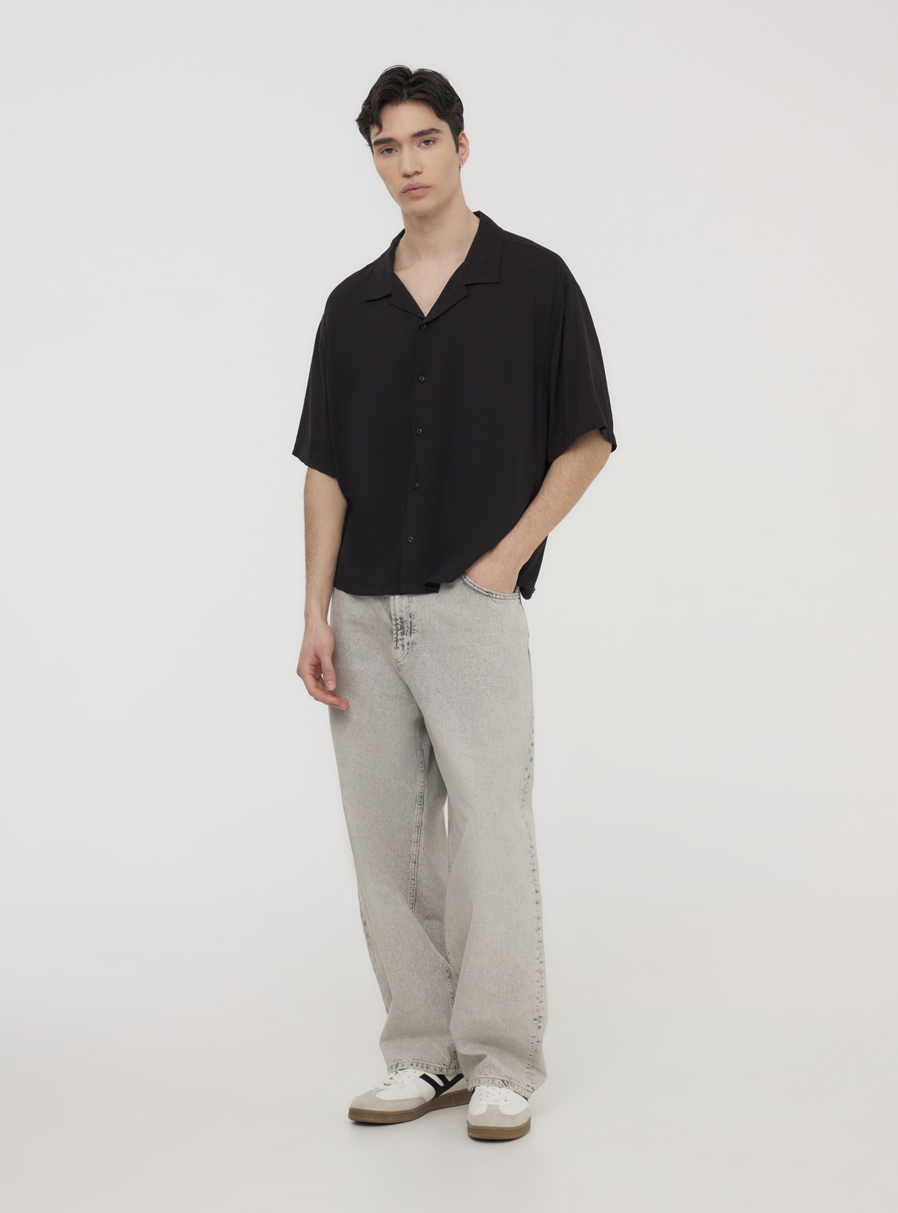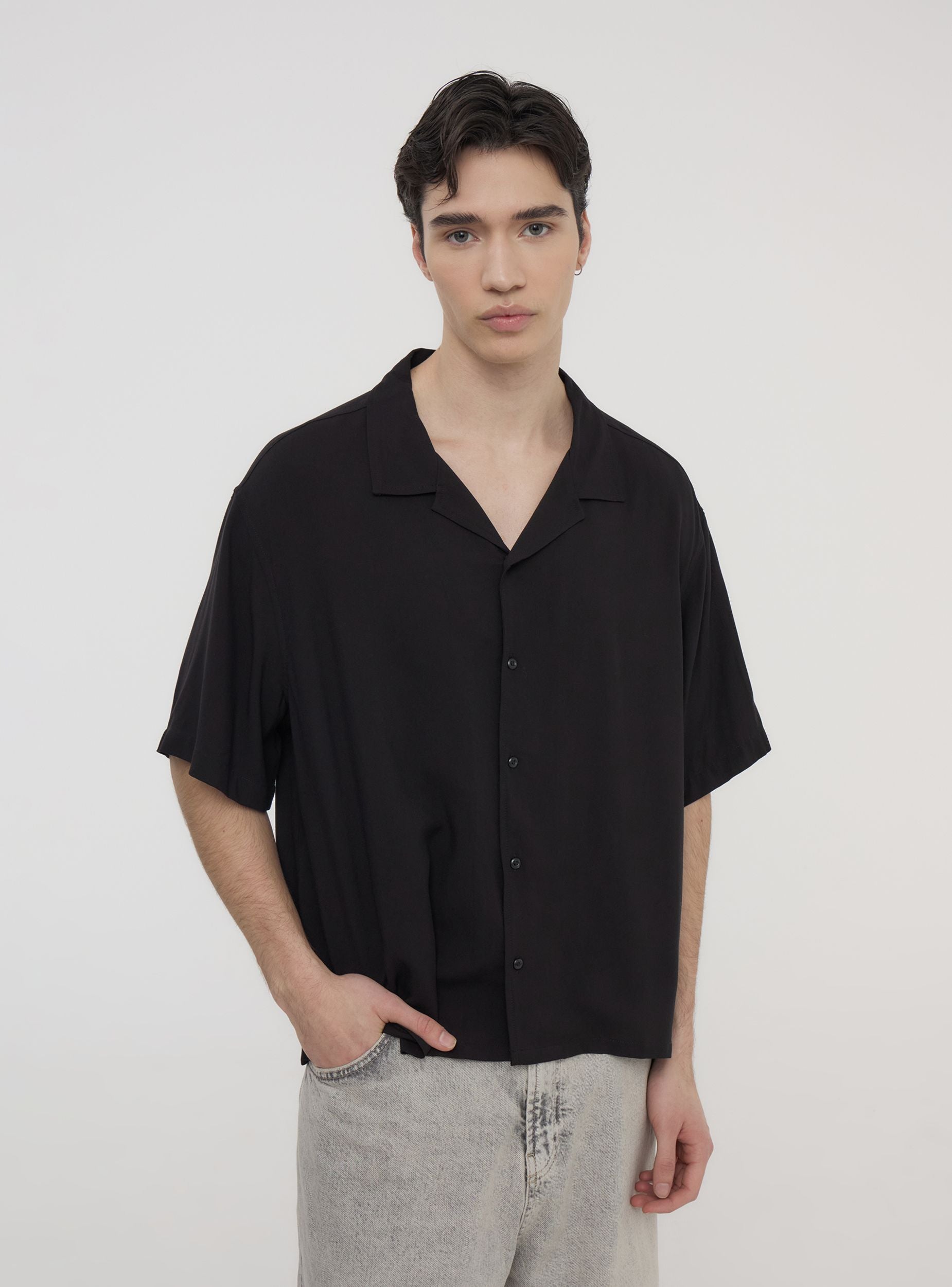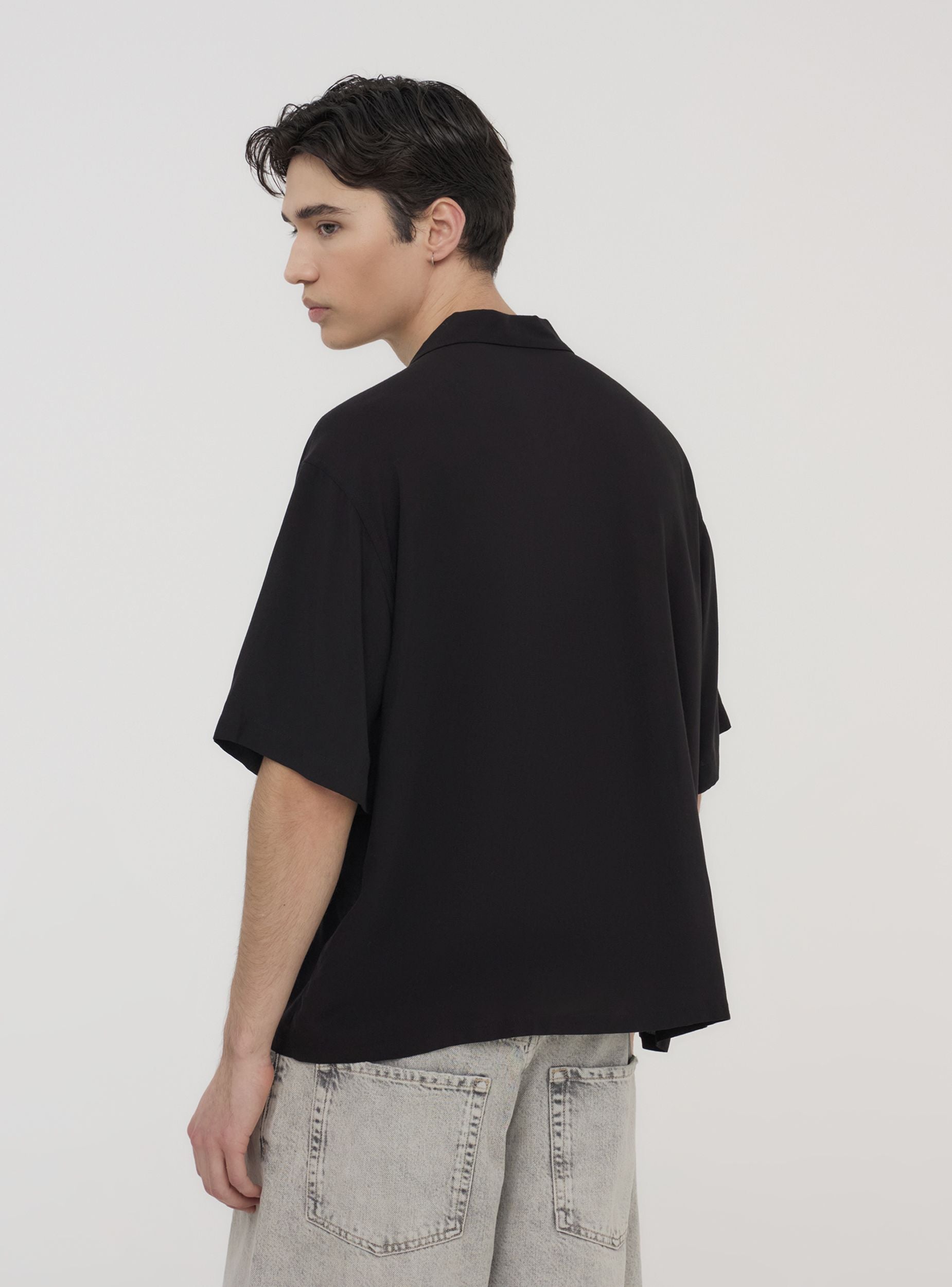 Pánska bowlingová košeľa s moderným a uvoľneným vzhľadom. Krátky strih ponúka moderné nosenie, ideálne pre tých, ktorí majú radi ľahký a neformálny štýl. Vyrobená z viskózy, zaručuje plynulosť a pohodlie, zatiaľ čo jednoliaty dizajn ju robí ľahko kombinovateľnou. Reverzový golier pridáva osobitný nádych, doplnený o zapínanie na gombíky a krátke rukávy pre všestrannú a trendy estetiku.Detaily