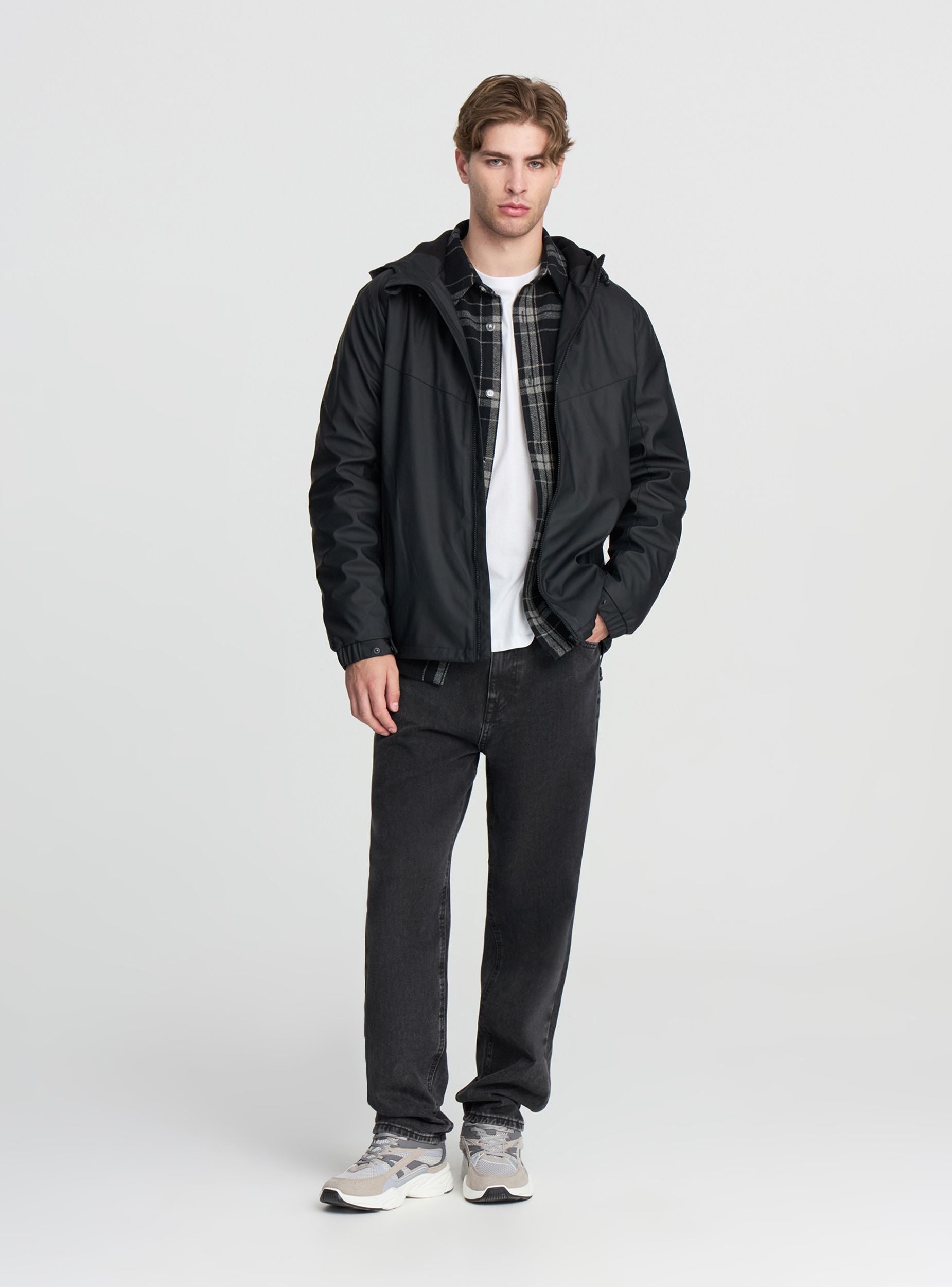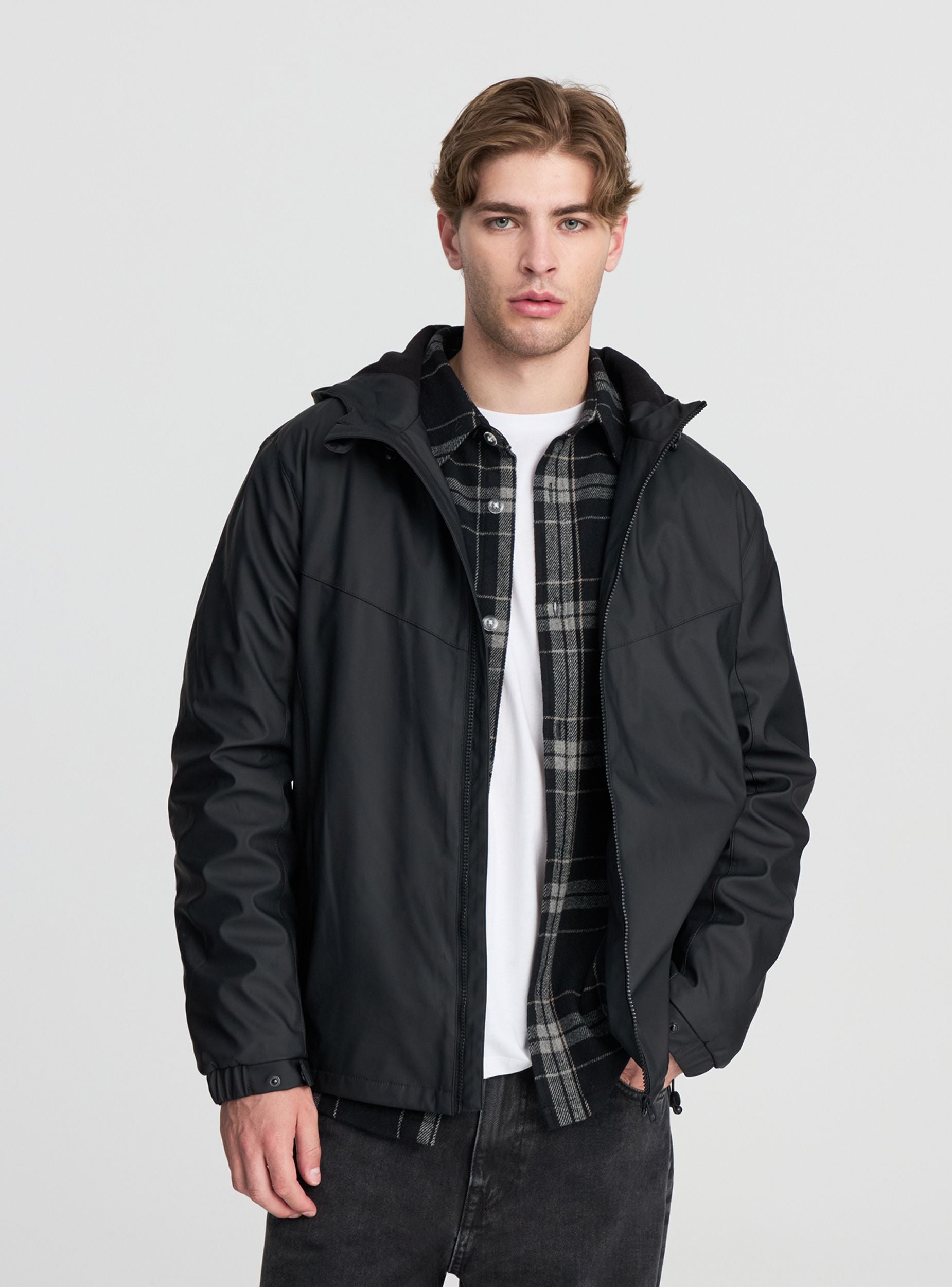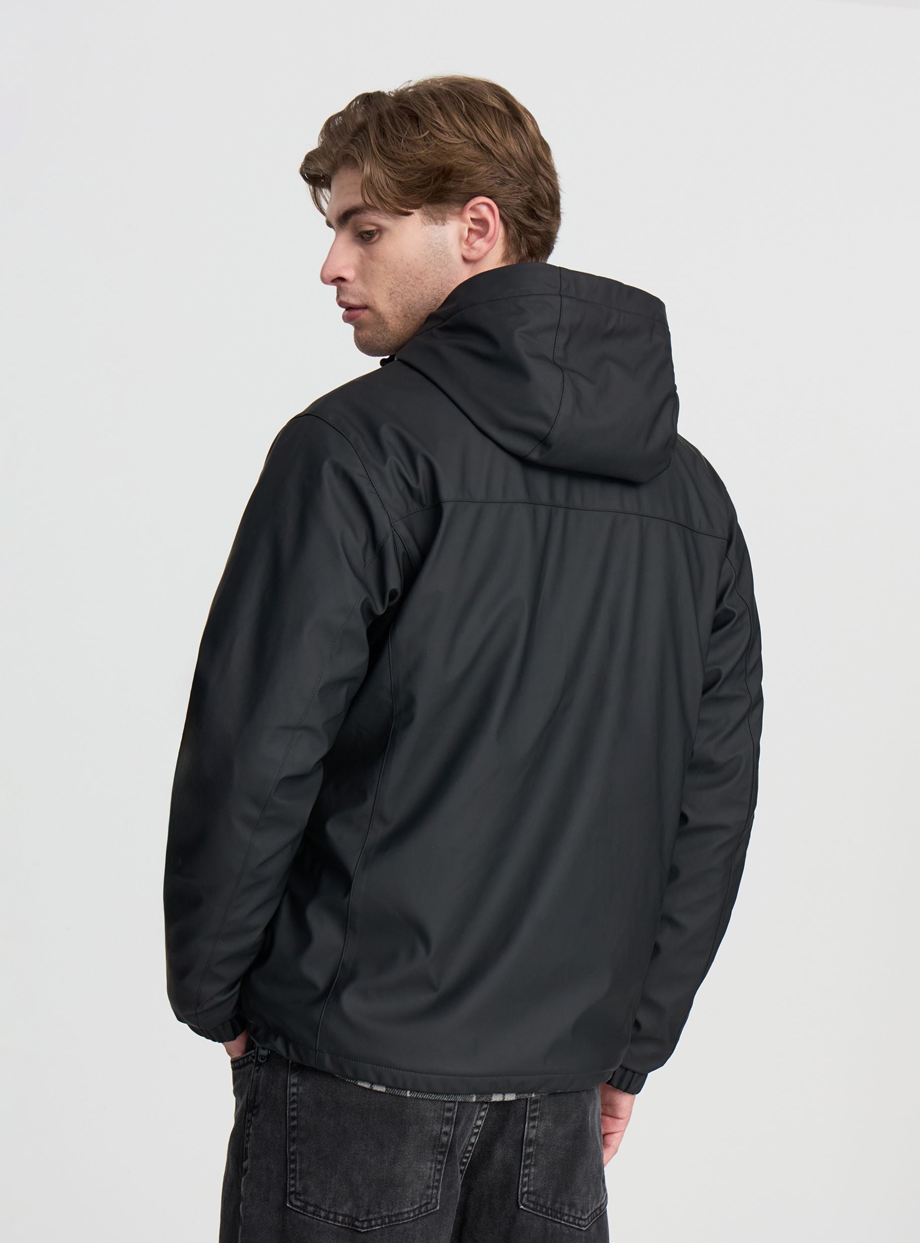 Ľahká technická bunda pre mužov, ideálna na prechodné obdobie, perfektná na zvládanie daždivých alebo veterných dní vďaka nastaviteľnej kapucni a zipsovému uzáveru. Dlhé rukávy a pravidelný strih zabezpečujú pohodlie a voľnosť pohybu. Vybavená zarážkami na krku a na spodnej časti, bočnými vreckami so zipsom, sa ľahko kombinuje s neformálnymi alebo športovými outfitmi, čím je všestranná pre voľný čas a každodenné aktivity. Vyrobená z vodoodolnej látky v jednofarebnom prevedení.Detaily