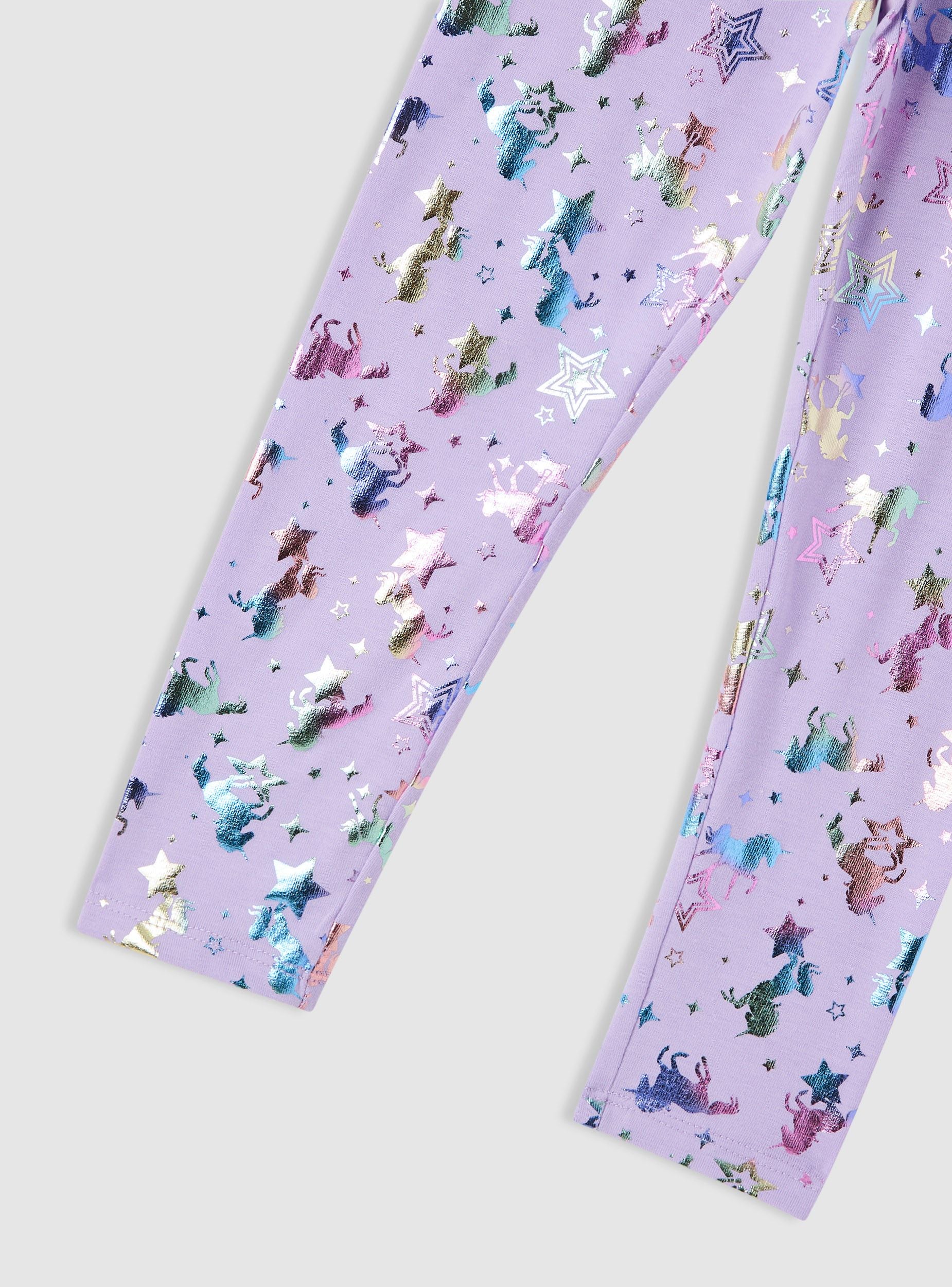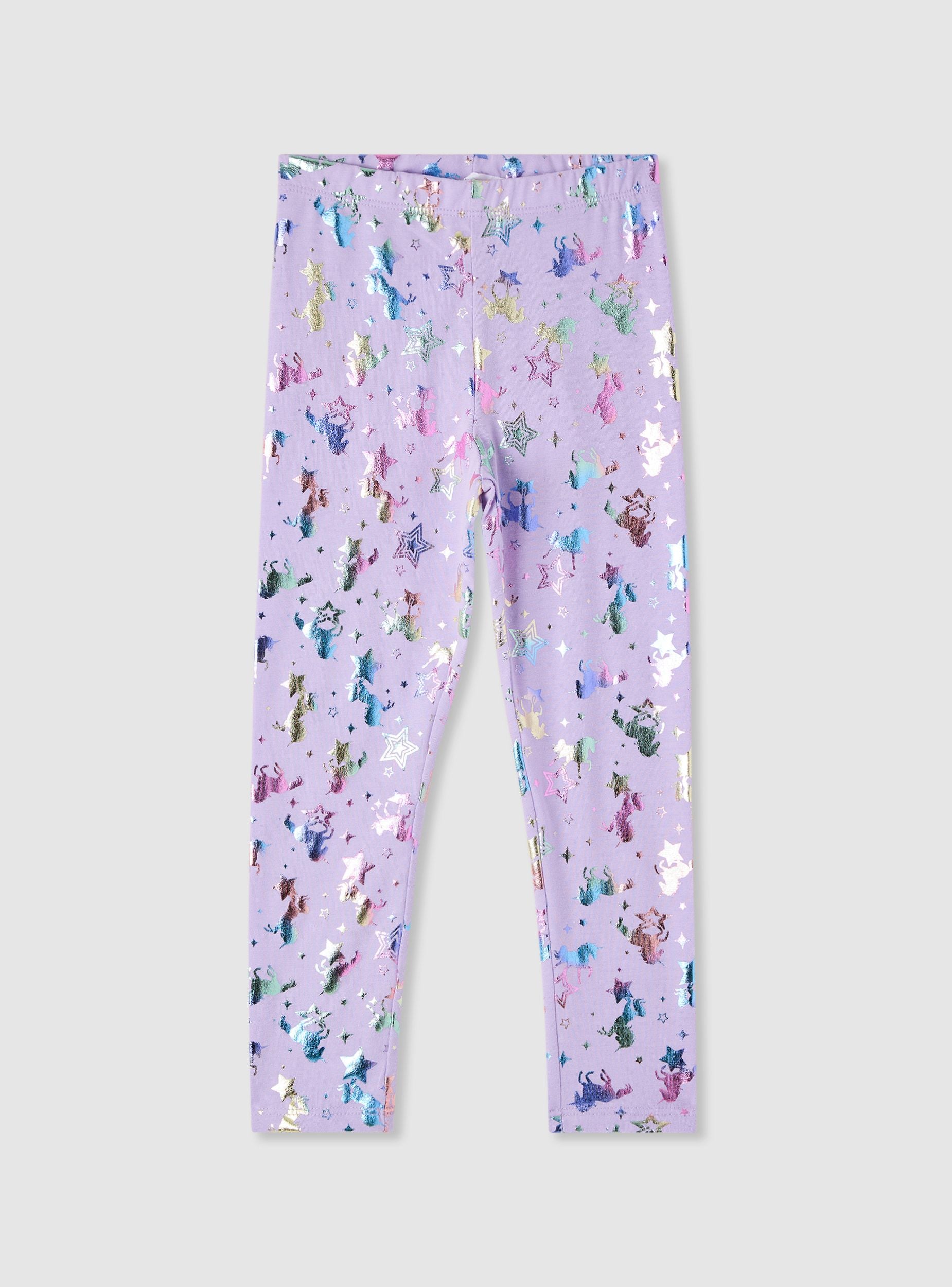 Dievčenské legíny s laminovanou potlačou jednorožcov a hviezd. Ideálne na voľný čas a tvorbu veselých a farebných outfitov. Majú priliehavý strih, ktorý zaručuje pohodlie a slobodu pohybu. Perfektné na kombinovanie s tričkami alebo mikinami pre neformálny a hravý vzhľad.
