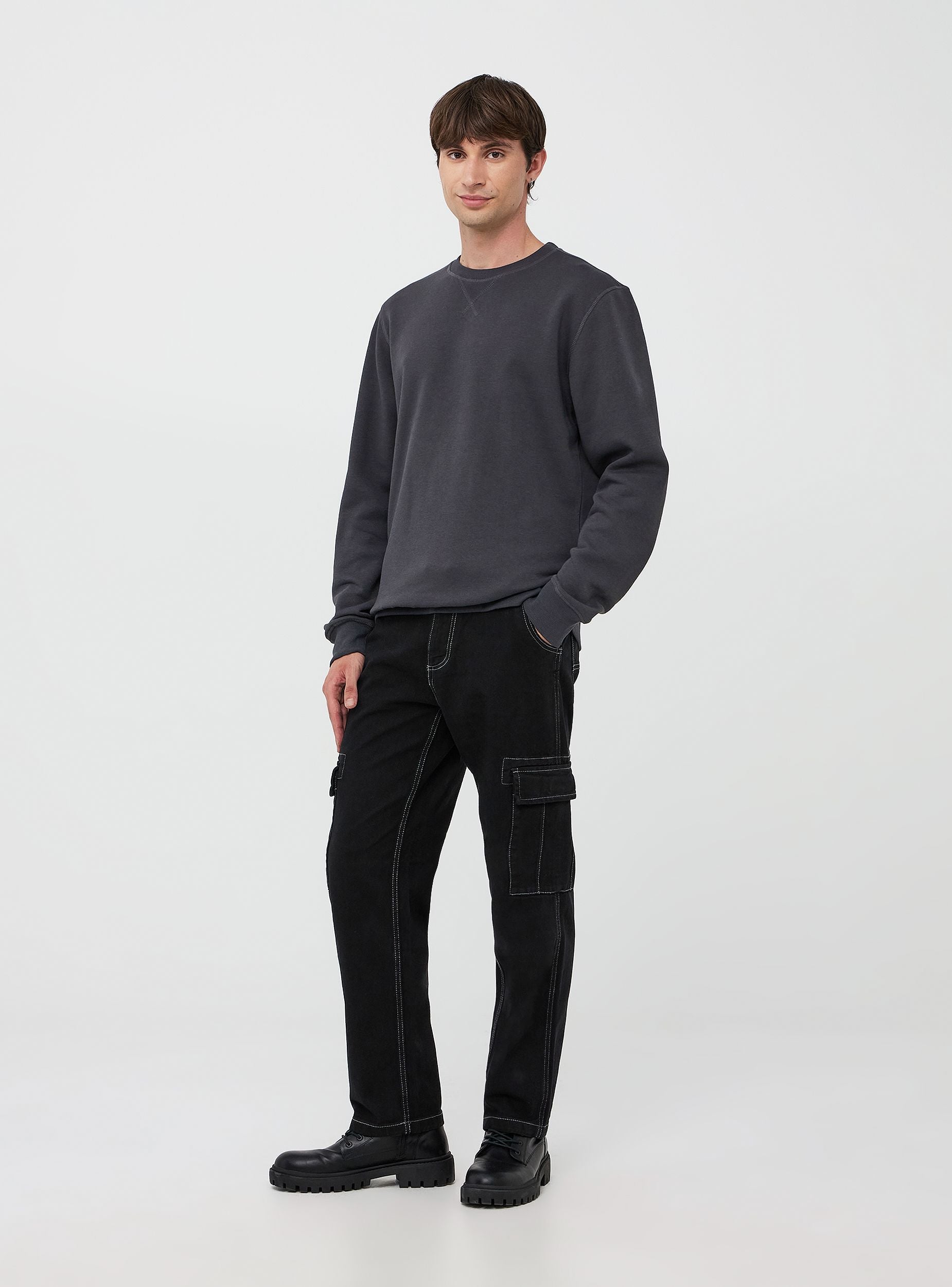 Pánska mikina bez kapucne, vyrobená z ťažkého mäkkého jednofarebného materiálu. Má manžety, lem a golier s rebrovaním pre pohodlné nosenie. Jednoduchý a čistý dizajn, ideálny pre základný, esenciálny a všestranný vzhľad. Perfektná na každodenné nosenie, či už doma alebo vonku. Táto mikina sa ľahko kombinuje s džínsami alebo športovými nohavicami, čo ju robí vhodnou na voľný čas, neformálne aktivity alebo prechádzky. Základný kúsok pre praktický a pohodlný vzhľad. Regular fit.